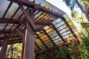 Задача была интересная: сооружение должно быть легким, современным по стилю и никак не напоминать кургузые дачные летние кухни с крышей домиком. Этого удалось добиться при помощи комбинации нескольких конструктивных приемов, таких как использование стоек и стропил из спаренных досок, стянутых в нескольких местах проставками, тросовой затяжки, высоких опорных башмаков и пропускающей свет крыши из сотового поликарбоната коричневого оттенка.
