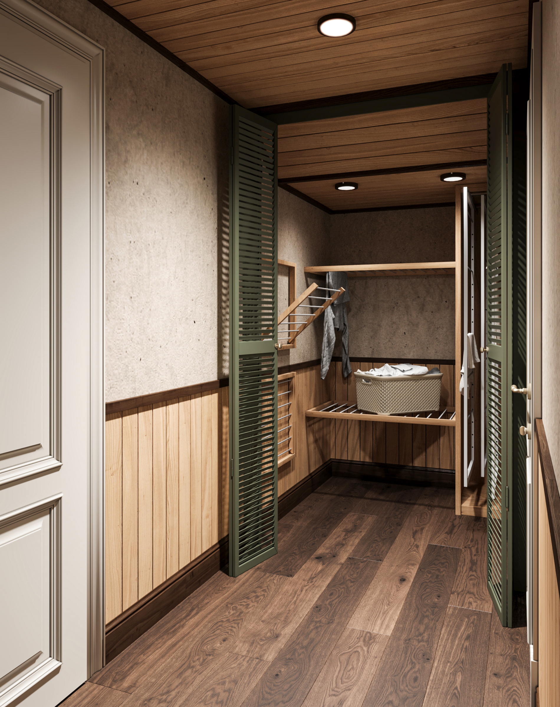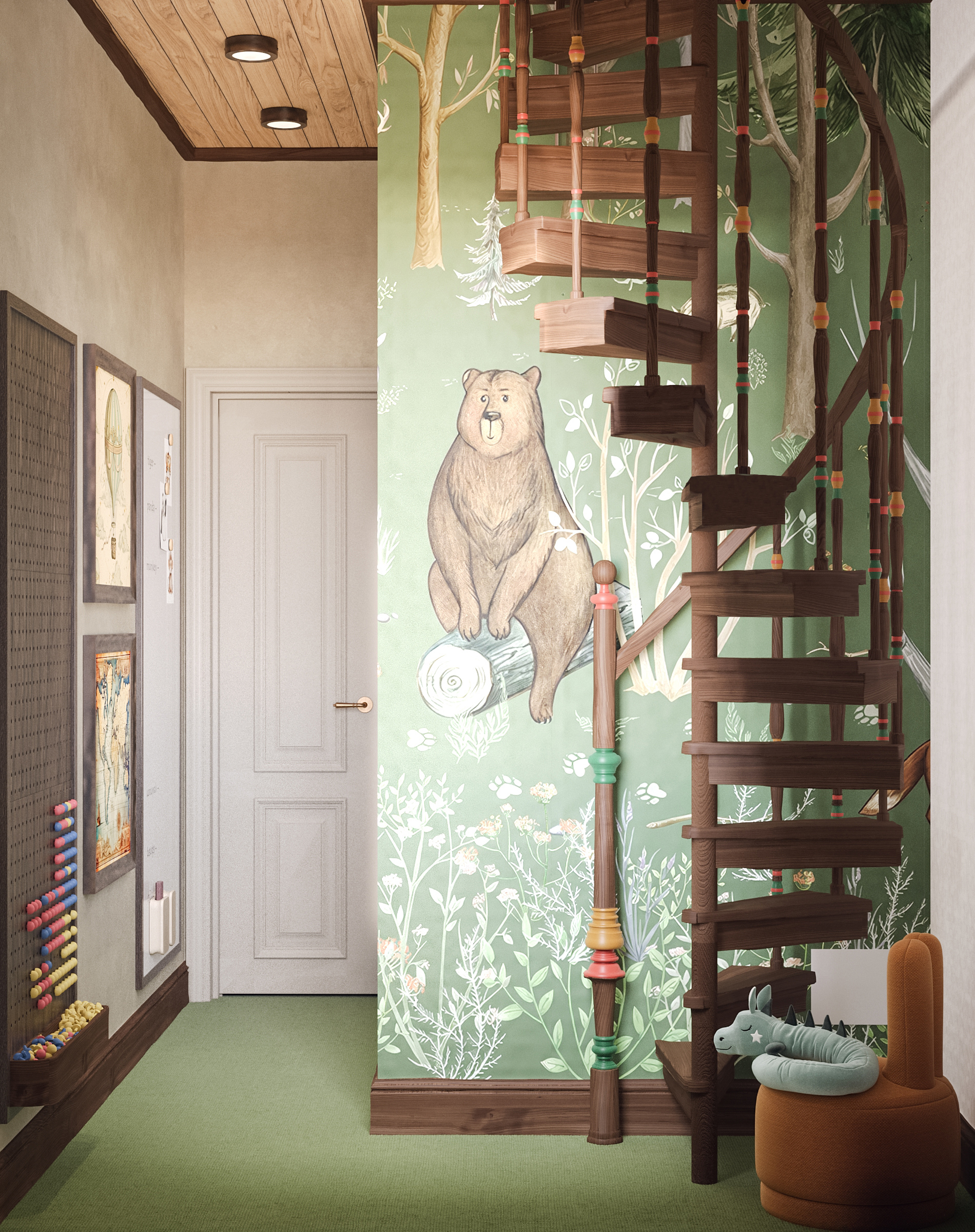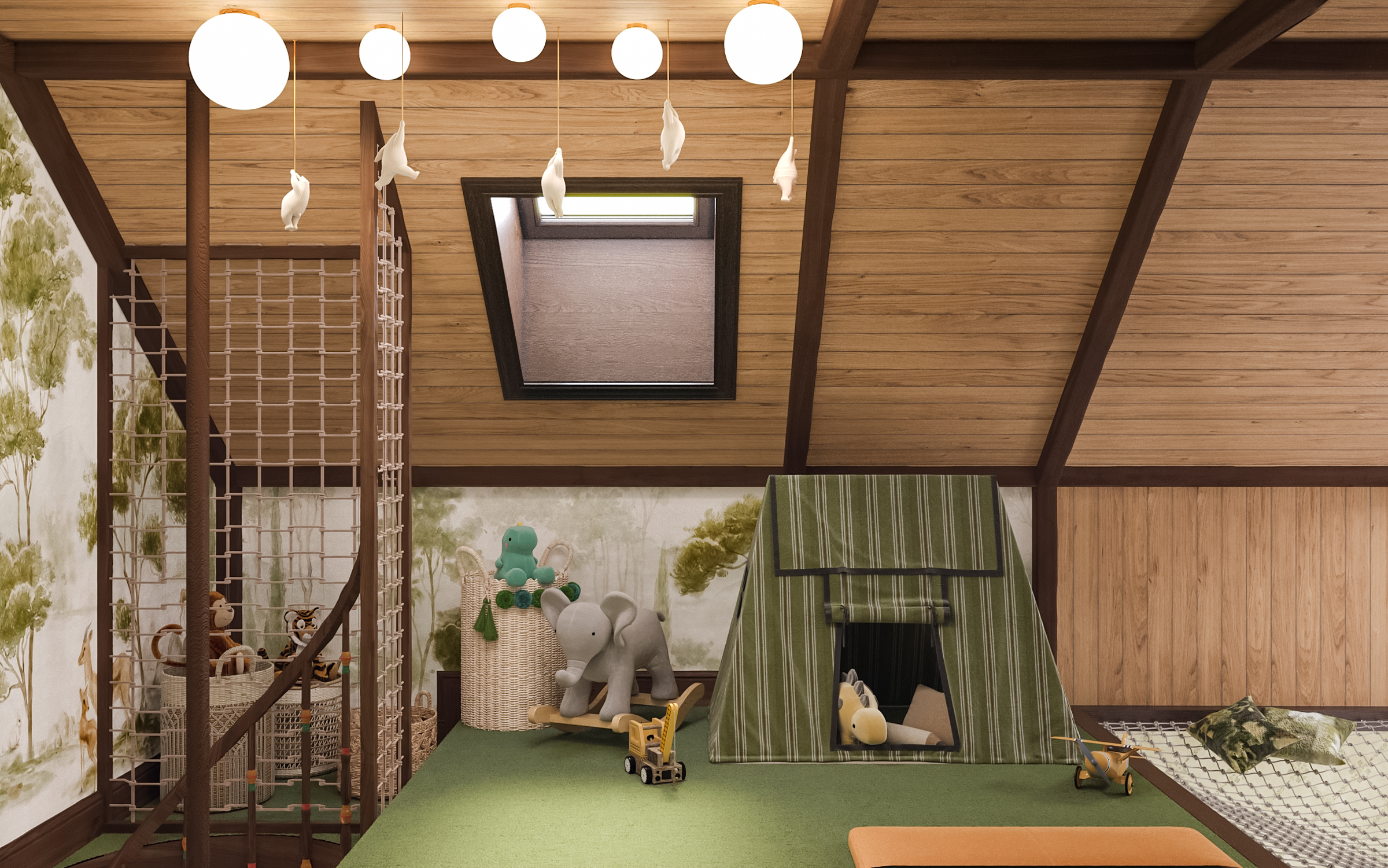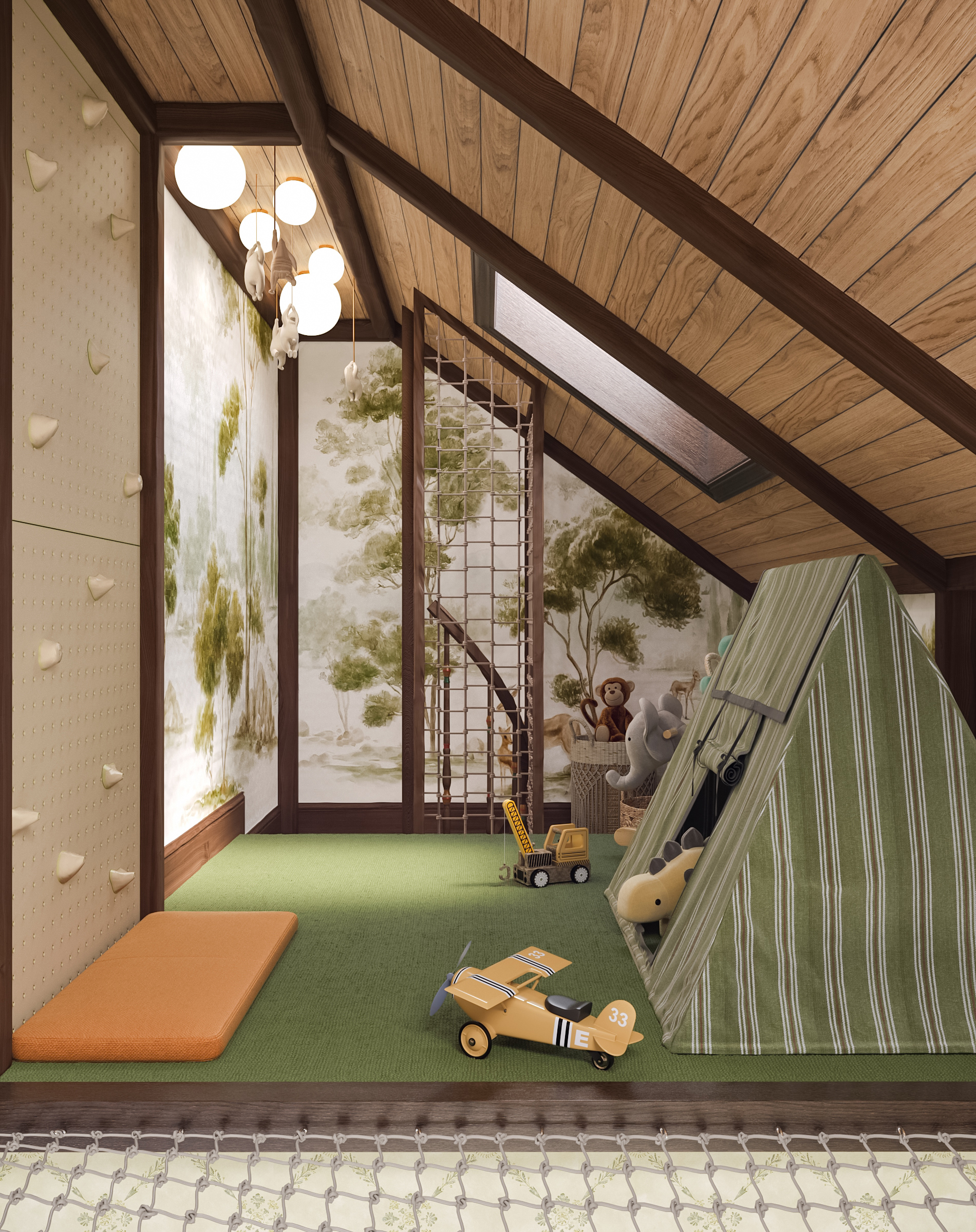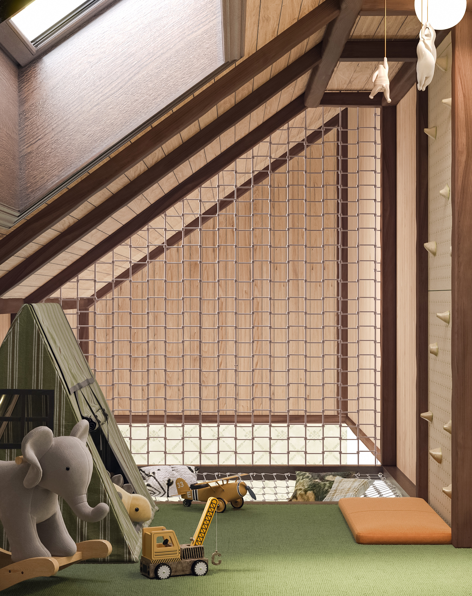 Верхний уровень выполнен как сочетание приватности и вдохновения. Здесь расположена гостевая спальня, а также кабинет, оформленный для работы в уединении. Дополняют этаж гардеробная, санузел и кладовая. Особым акцентом является зимний сад, наполненный светом и зеленью, а также чердачная игровая зона с гамаком и шалашом — настоящее пространство для детей. Потолки высотой до +2,89 м и винтовая лестница добавляют архитектурную выразительность и уют.
