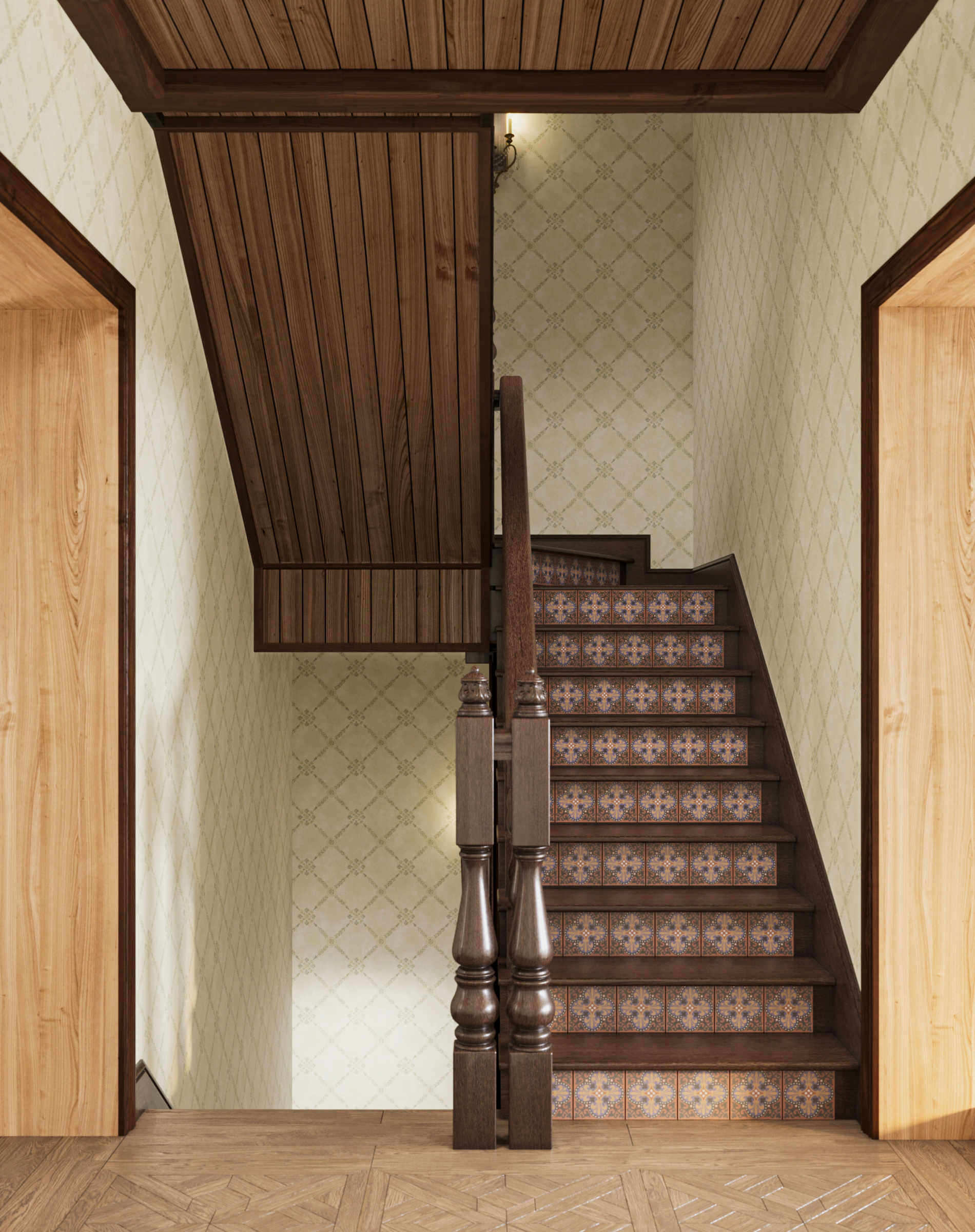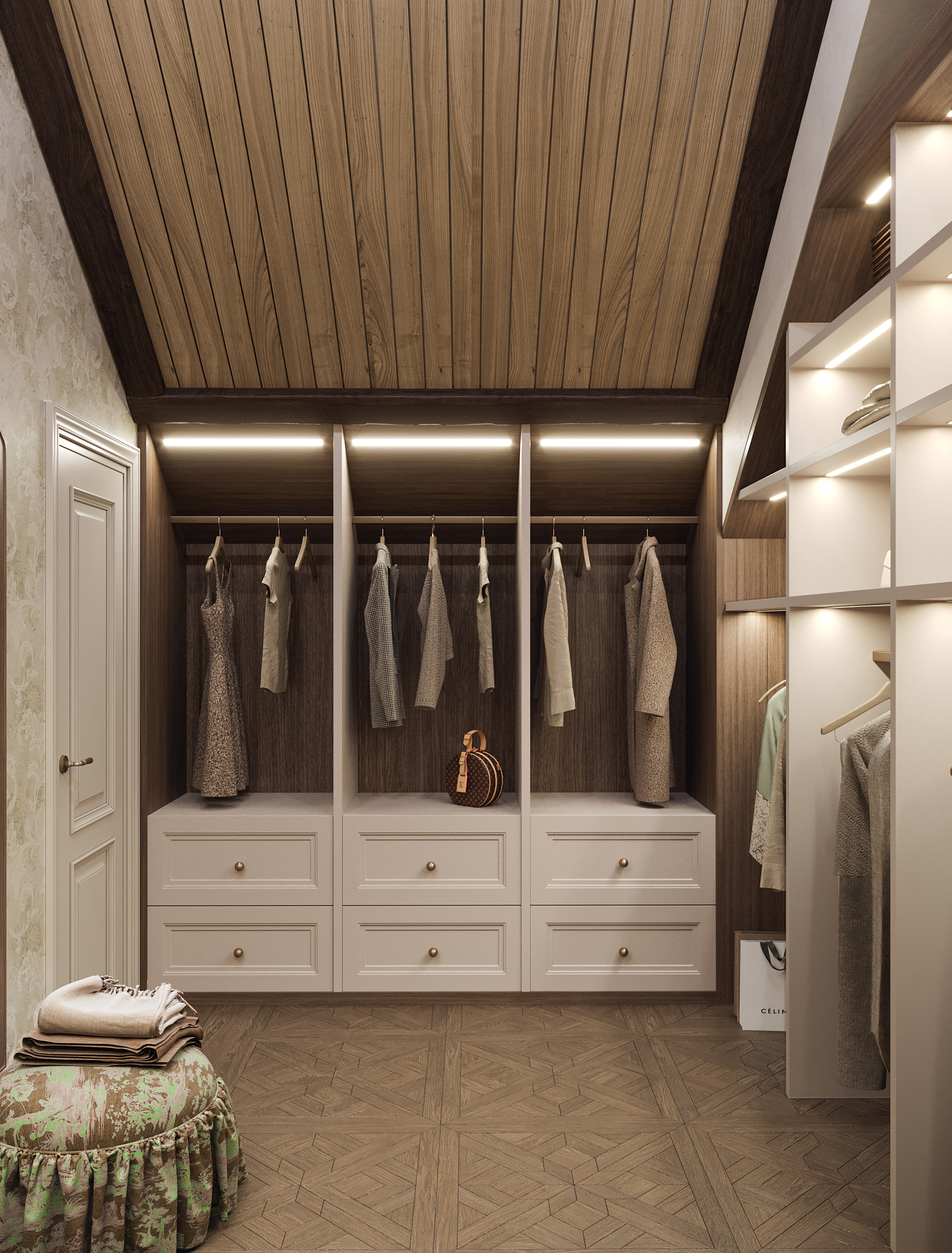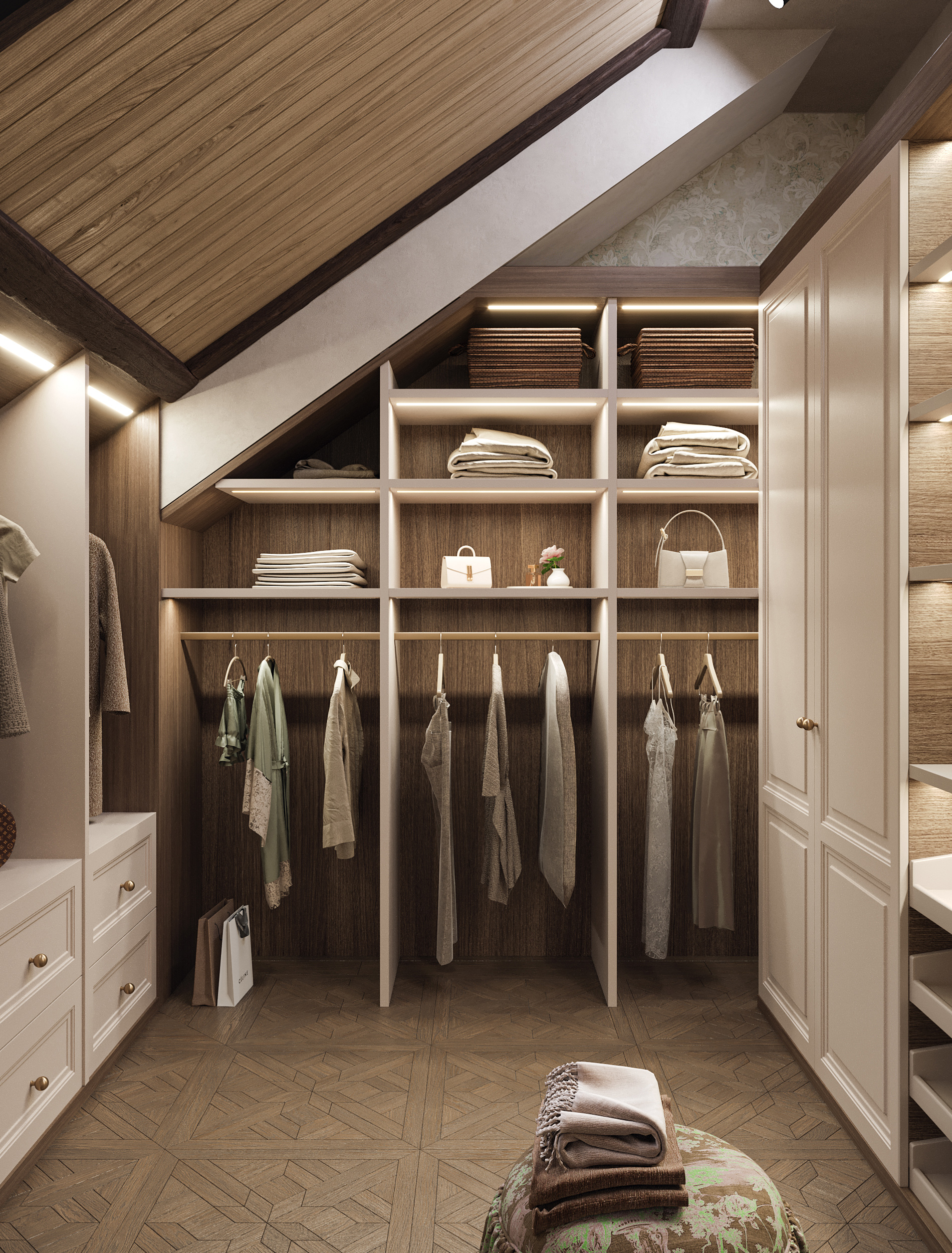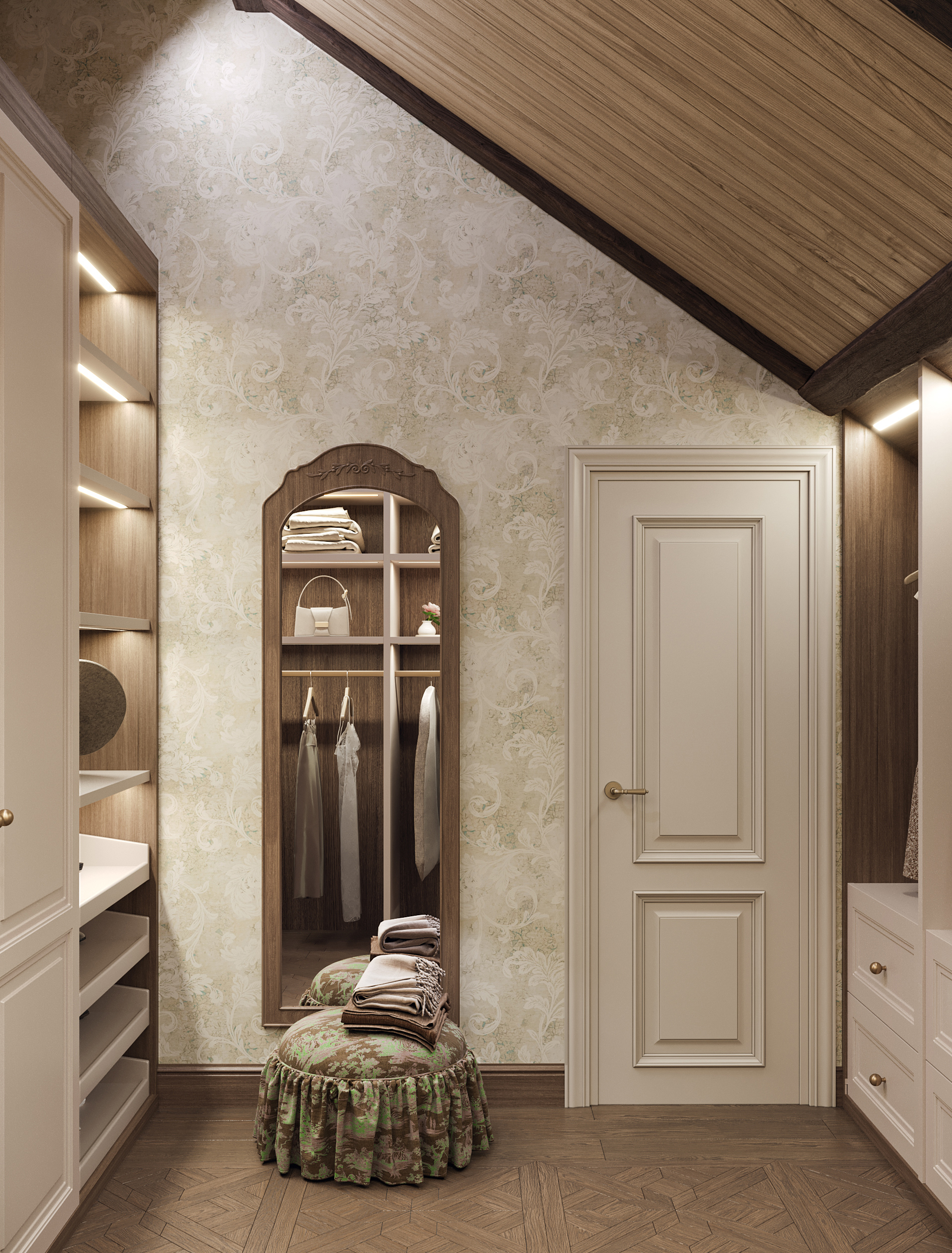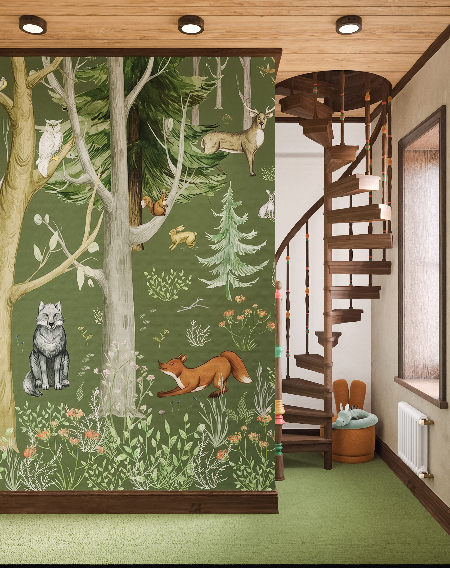 Верхний уровень выполнен как сочетание приватности и вдохновения. Здесь расположена гостевая спальня, а также кабинет, оформленный для работы в уединении. Дополняют этаж гардеробная, санузел и кладовая. Особым акцентом является зимний сад, наполненный светом и зеленью, а также чердачная игровая зона с гамаком и шалашом — настоящее пространство для детей. Потолки высотой до +2,89 м и винтовая лестница добавляют архитектурную выразительность и уют.