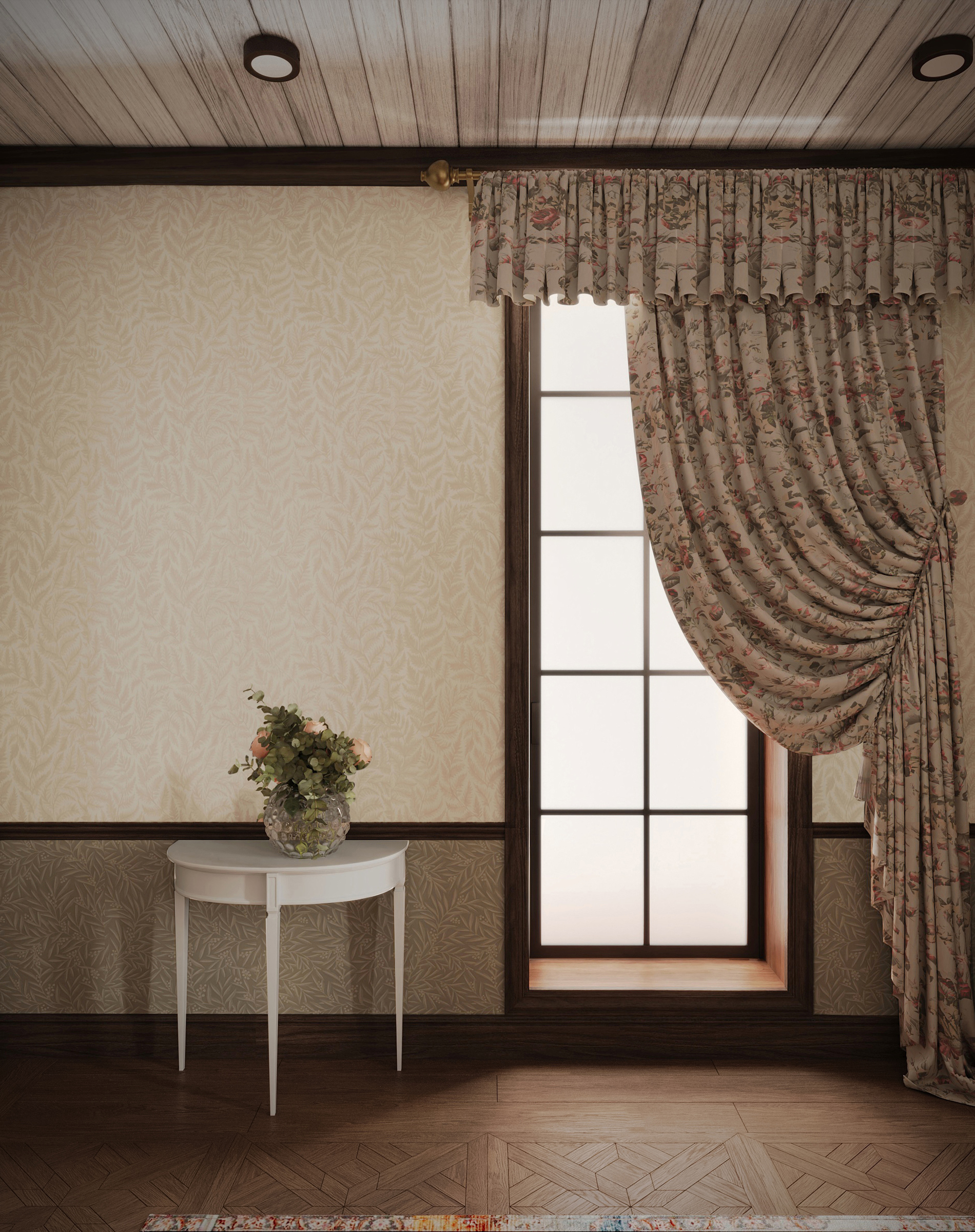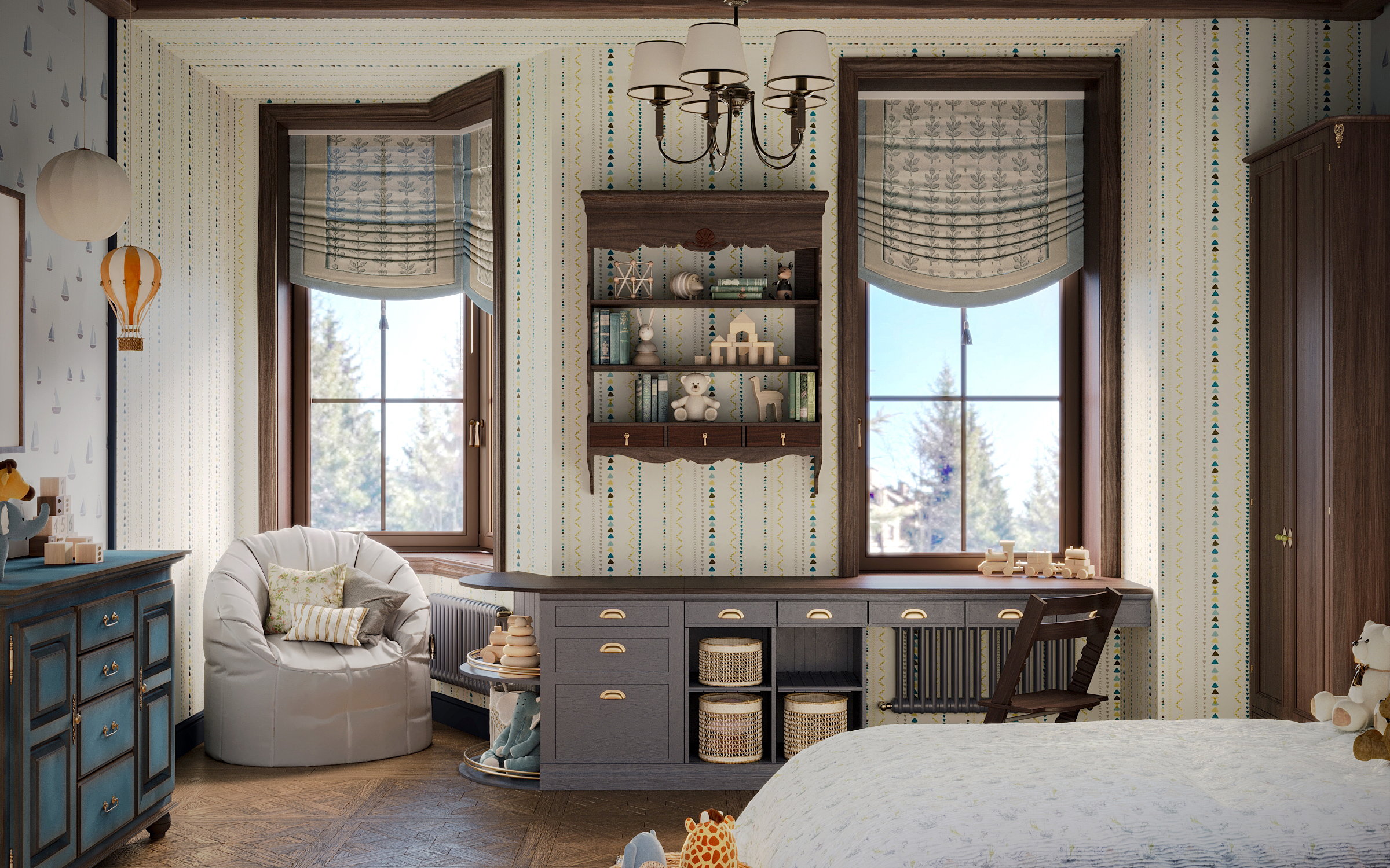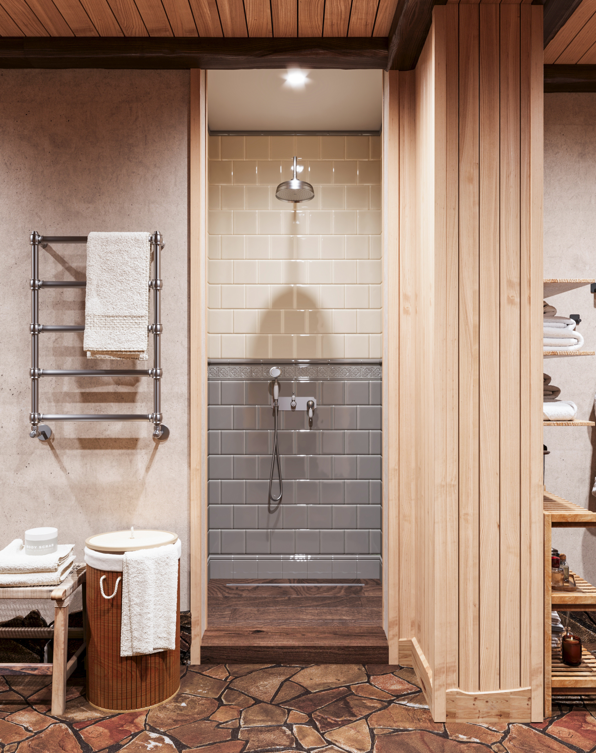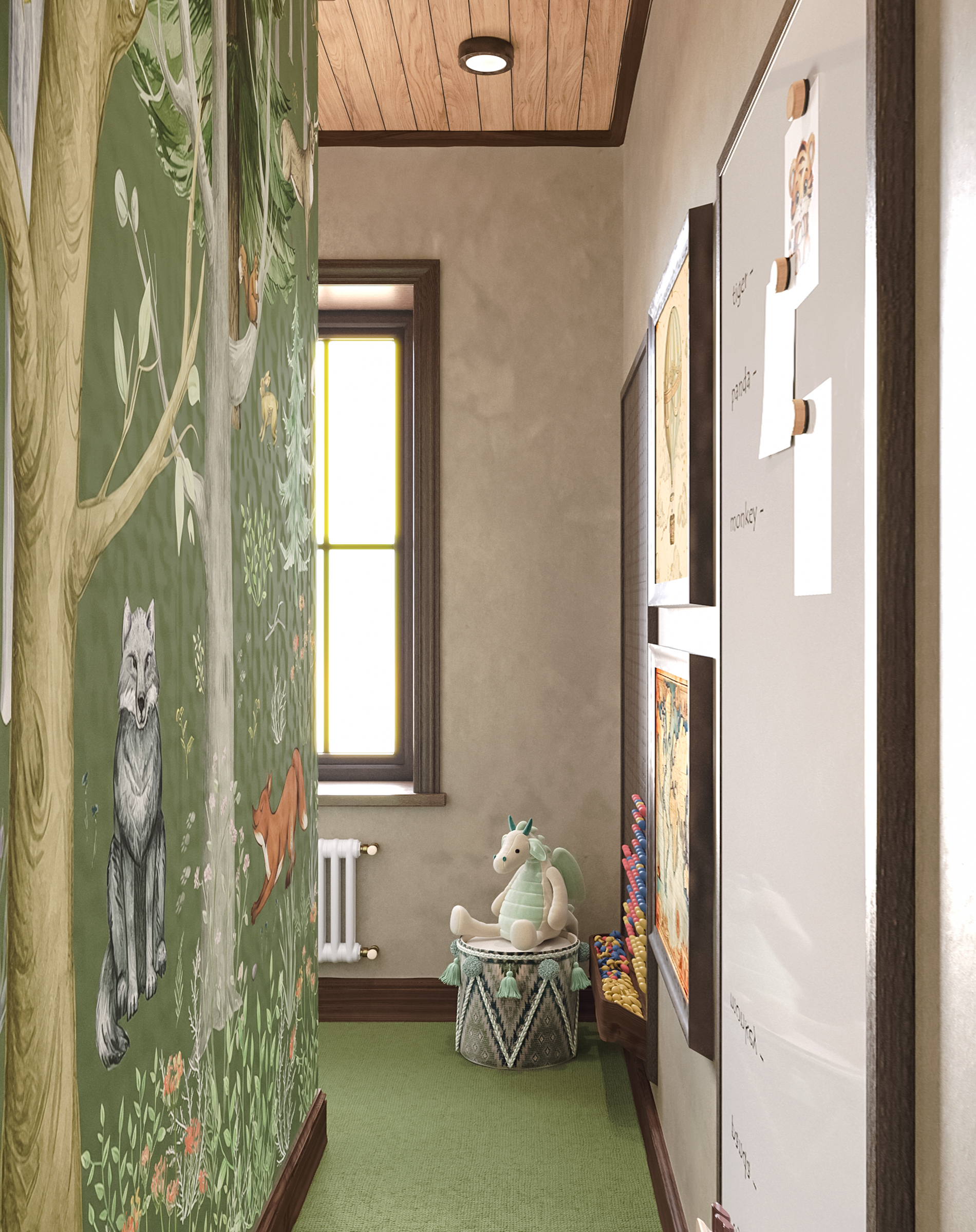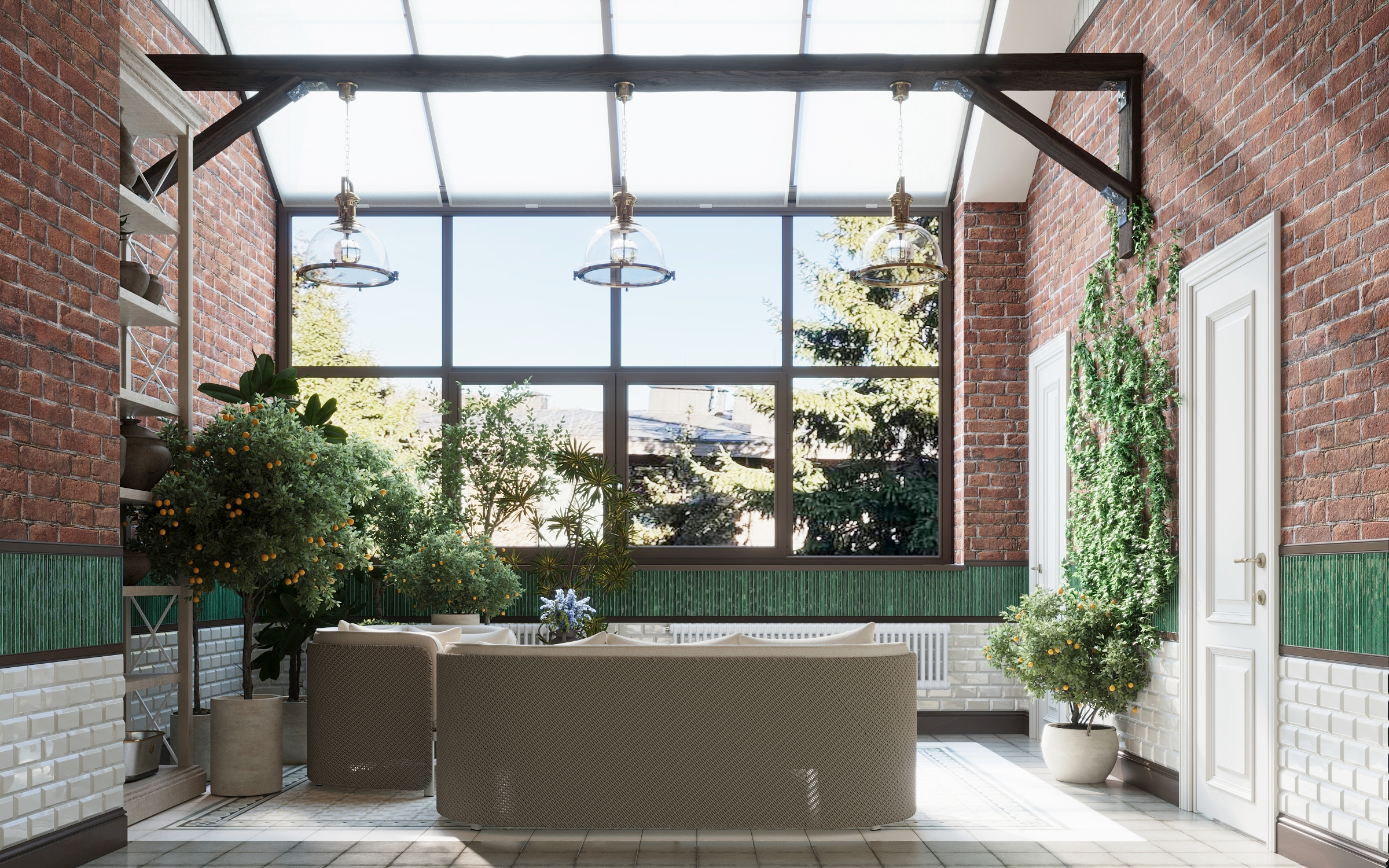 Верхний уровень выполнен как сочетание приватности и вдохновения. Здесь расположена гостевая спальня, а также кабинет, оформленный для работы в уединении. Дополняют этаж гардеробная, санузел и кладовая. Особым акцентом является зимний сад, наполненный светом и зеленью, а также чердачная игровая зона с гамаком и шалашом — настоящее пространство для детей. Потолки высотой до +2,89 м и винтовая лестница добавляют архитектурную выразительность и уют.