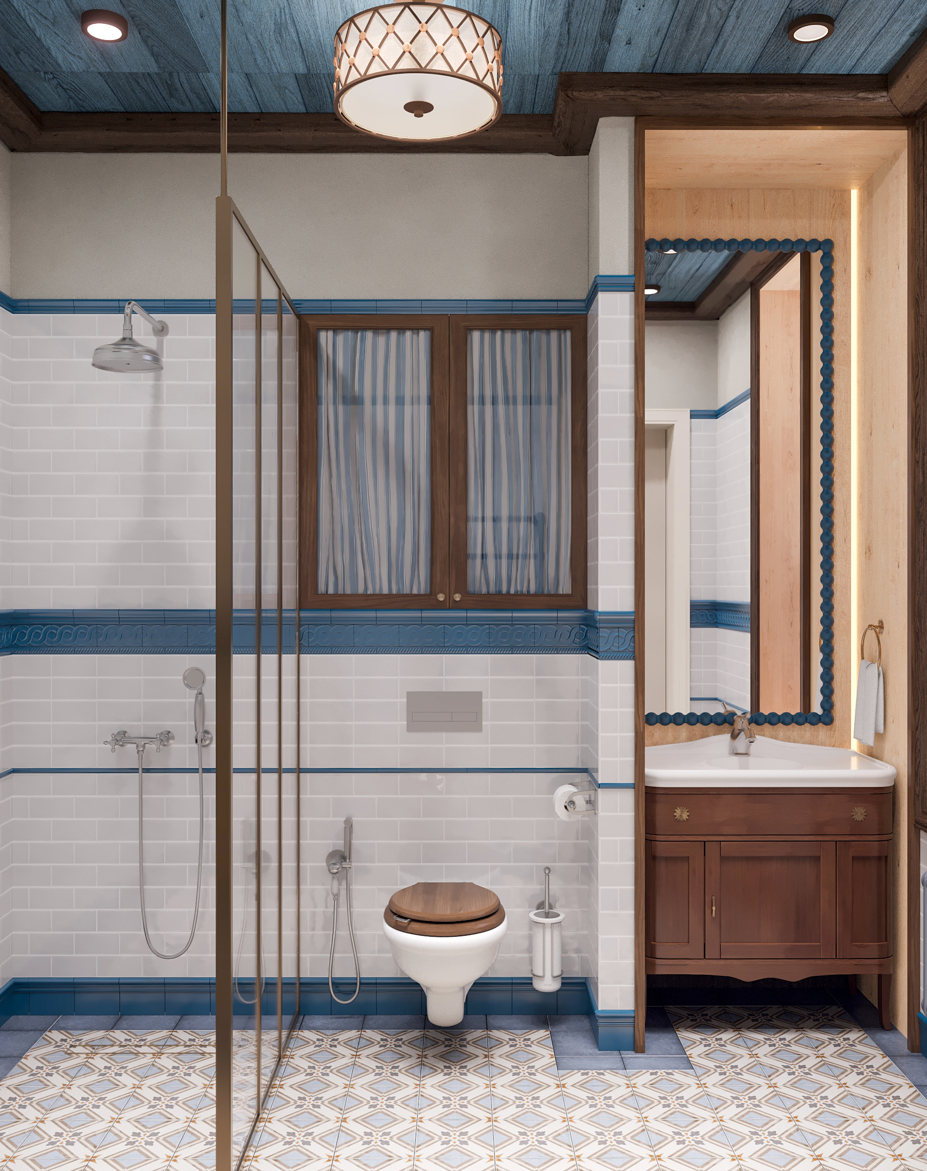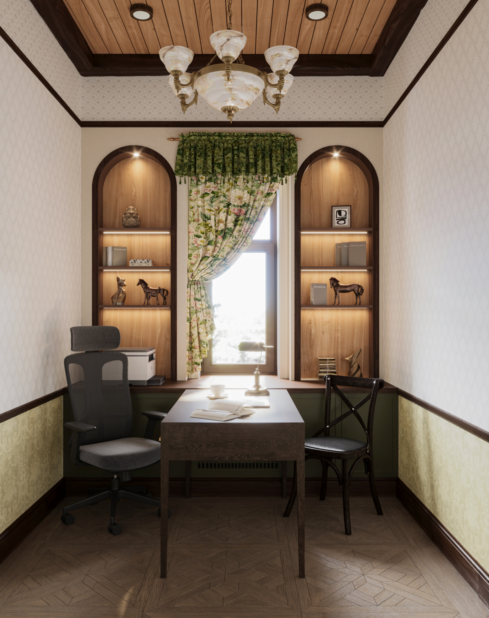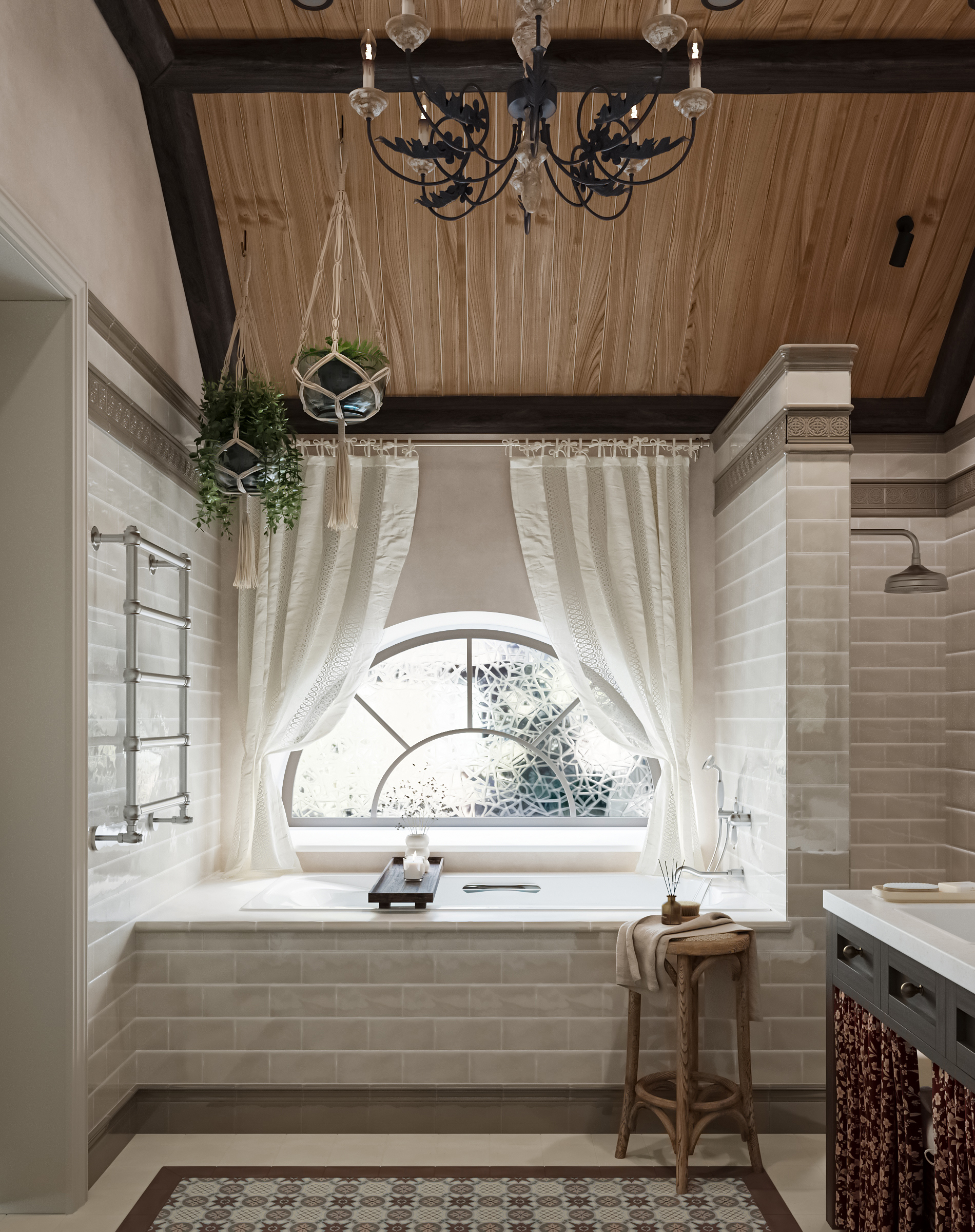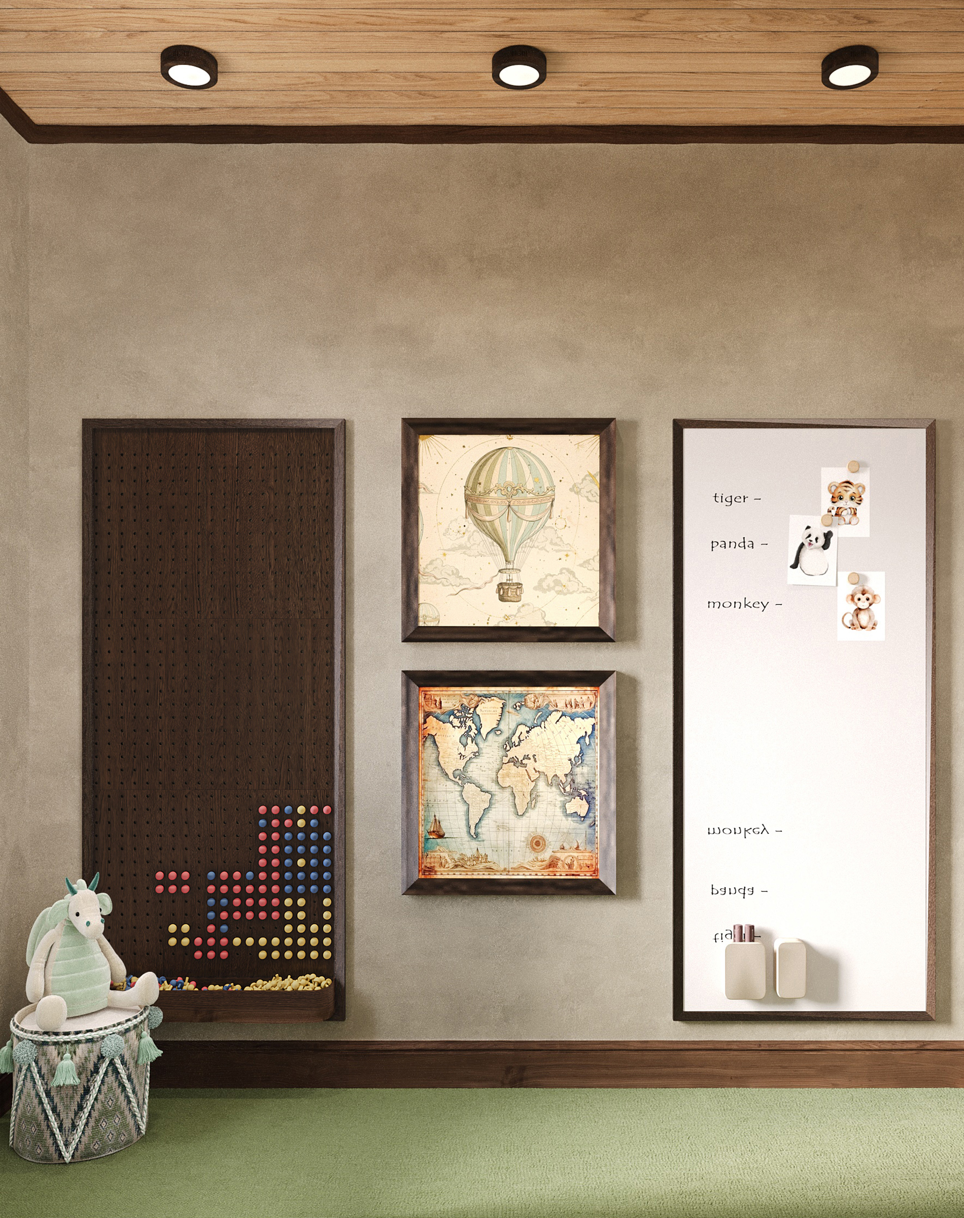 Верхний уровень выполнен как сочетание приватности и вдохновения. Здесь расположена гостевая спальня, а также кабинет, оформленный для работы в уединении. Дополняют этаж гардеробная, санузел и кладовая. Особым акцентом является зимний сад, наполненный светом и зеленью, а также чердачная игровая зона с гамаком и шалашом — настоящее пространство для детей. Потолки высотой до +2,89 м и винтовая лестница добавляют архитектурную выразительность и уют.