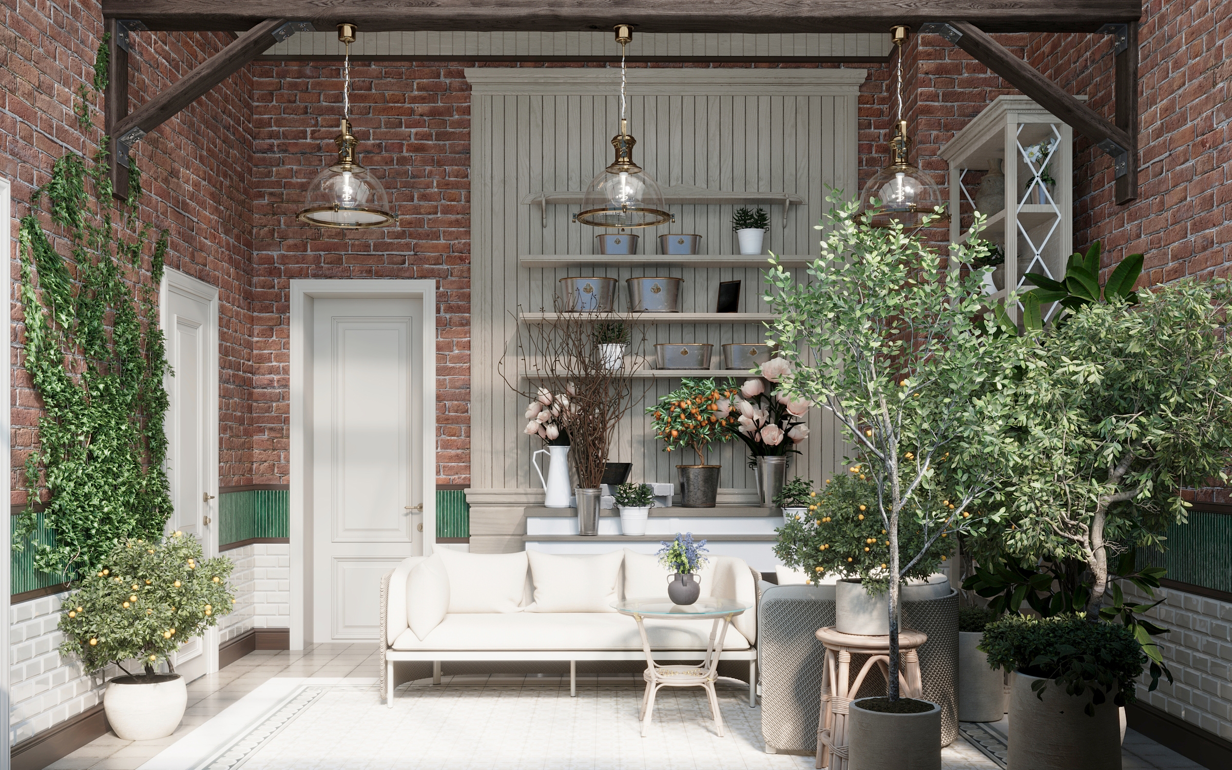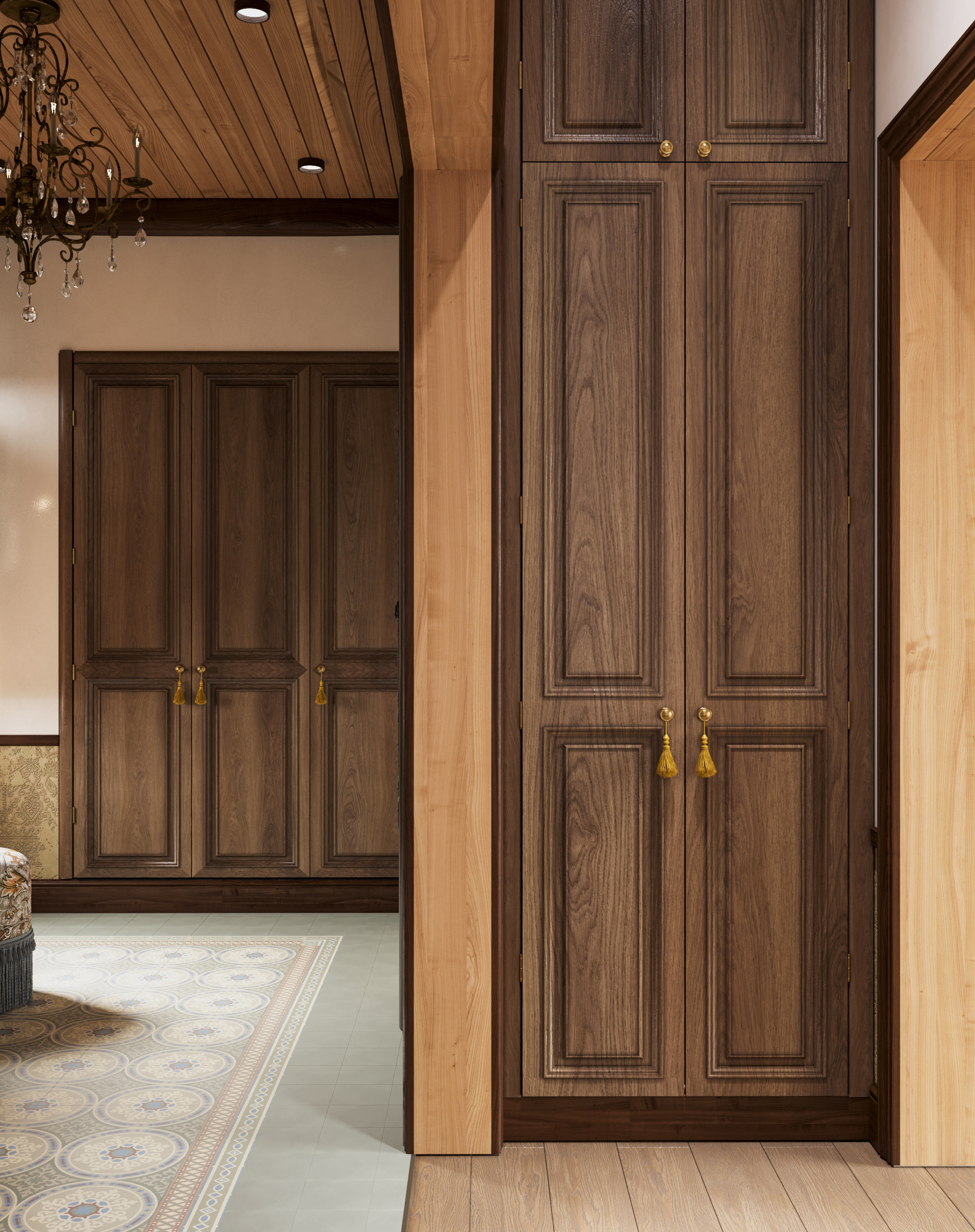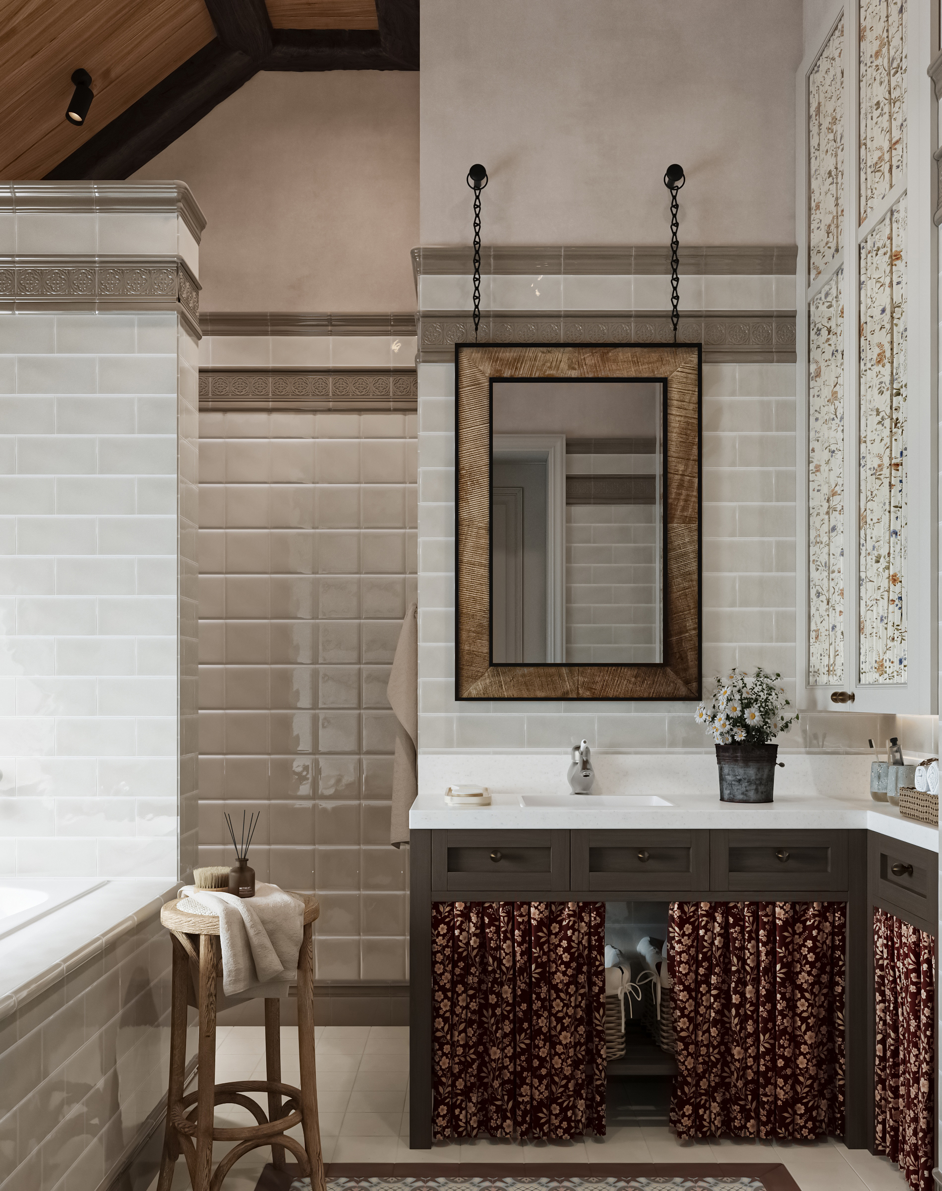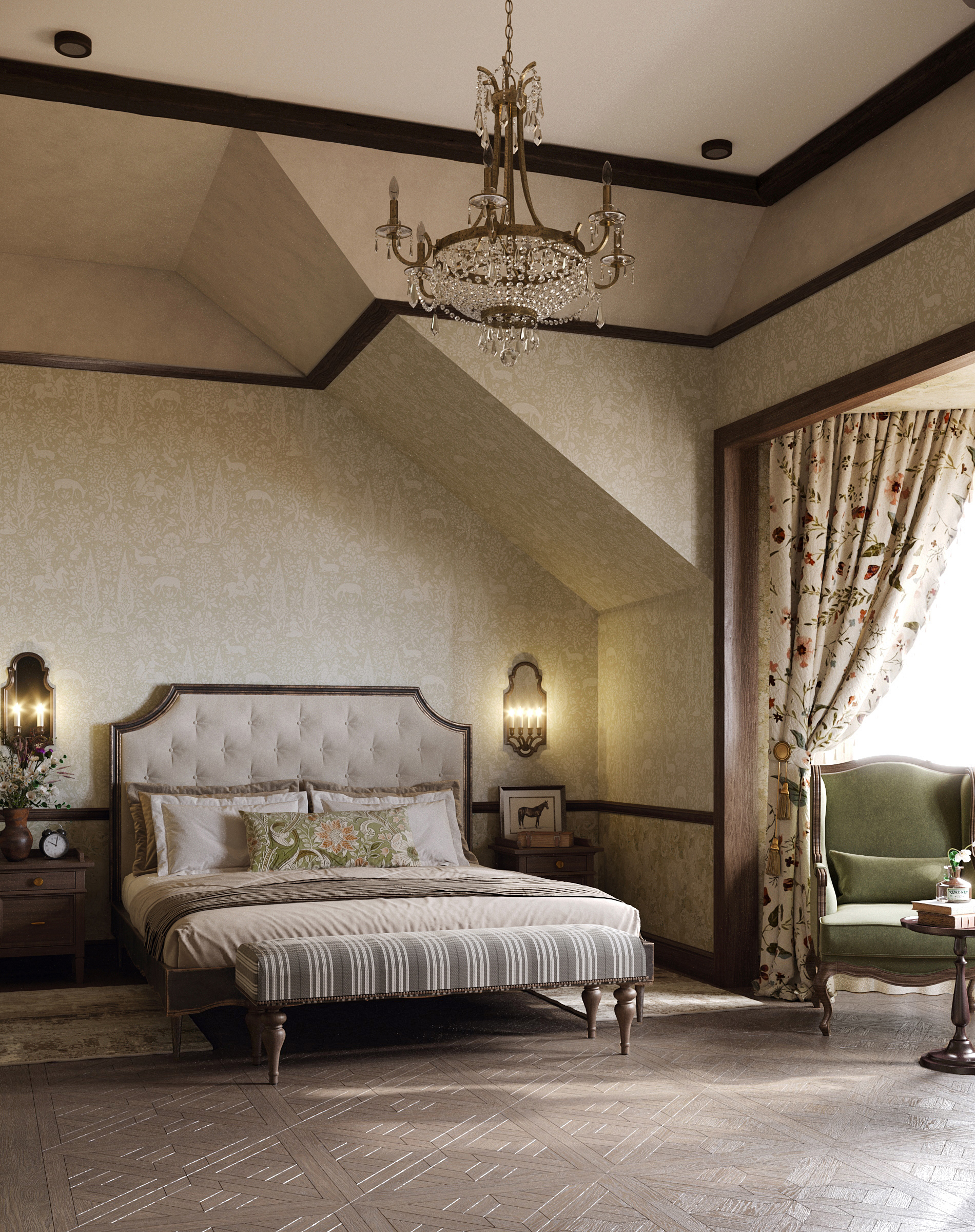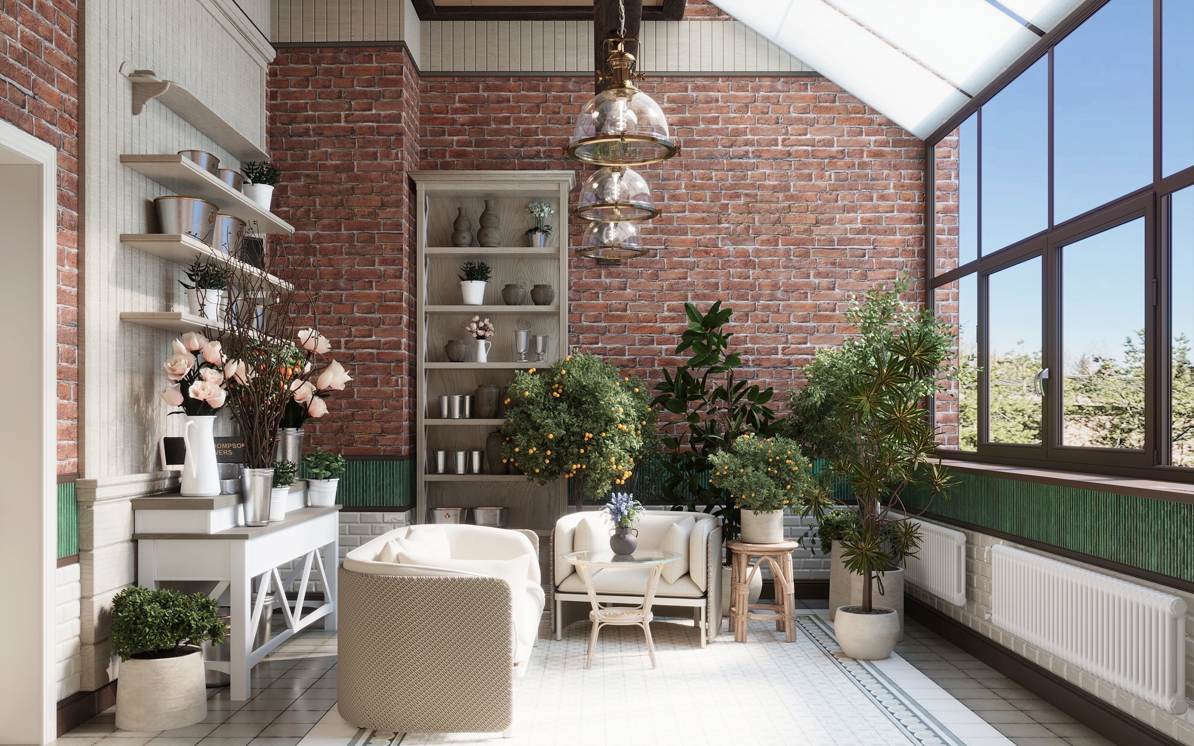 Верхний уровень выполнен как сочетание приватности и вдохновения. Здесь расположена гостевая спальня, а также кабинет, оформленный для работы в уединении. Дополняют этаж гардеробная, санузел и кладовая. Особым акцентом является зимний сад, наполненный светом и зеленью, а также чердачная игровая зона с гамаком и шалашом — настоящее пространство для детей. Потолки высотой до +2,89 м и винтовая лестница добавляют архитектурную выразительность и уют.