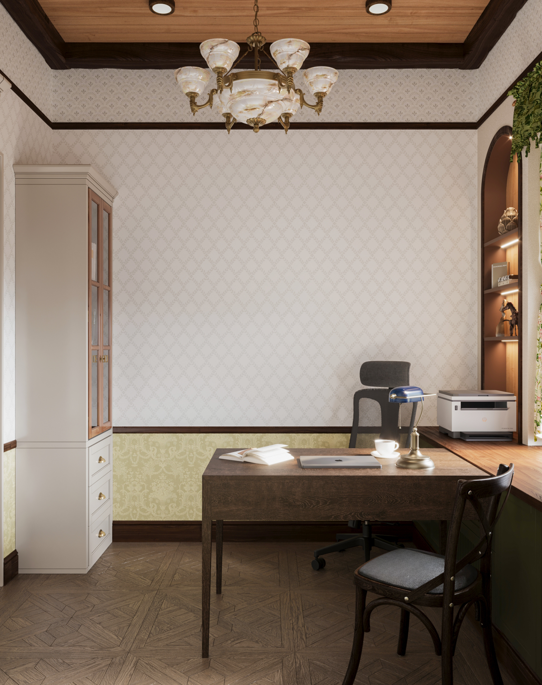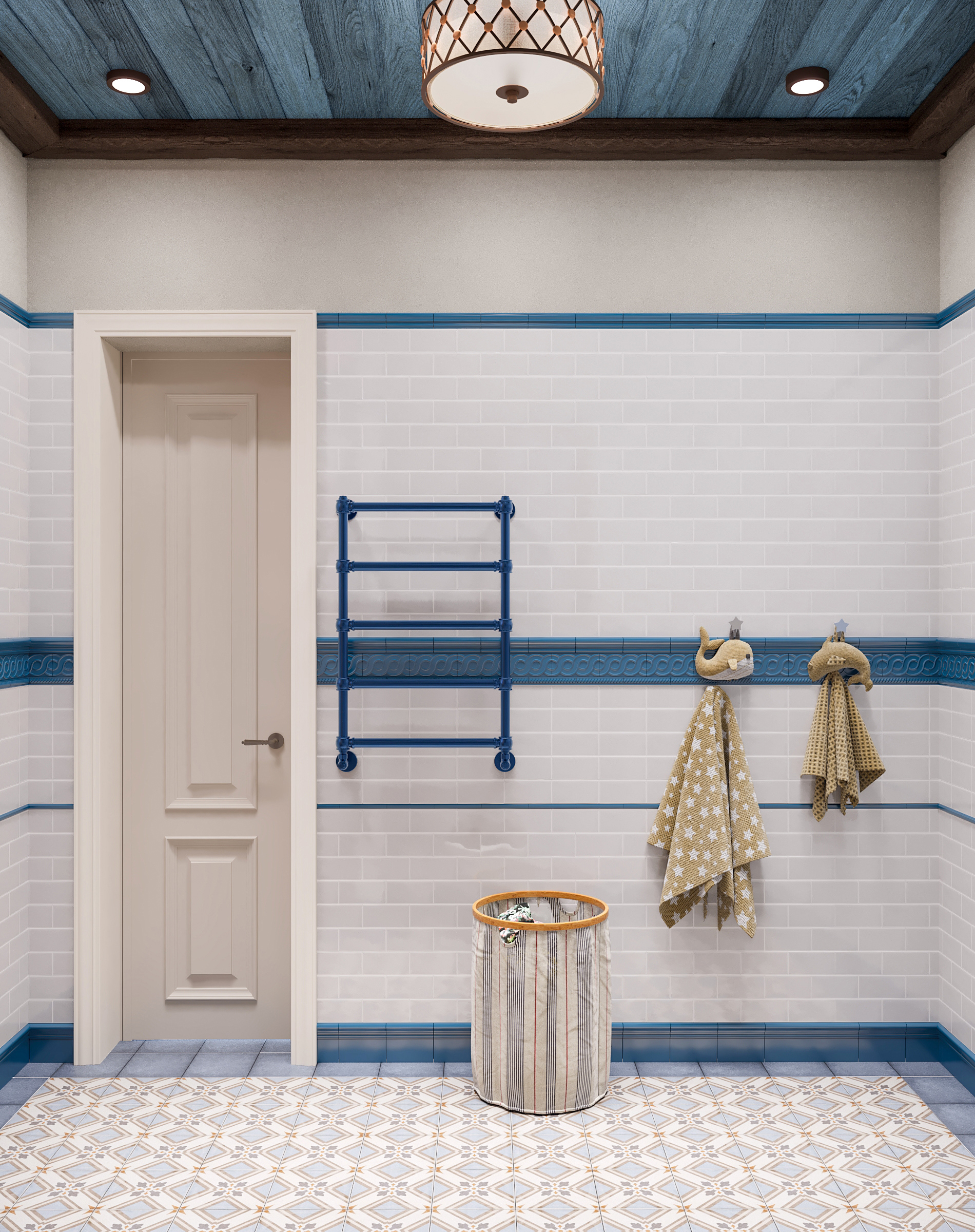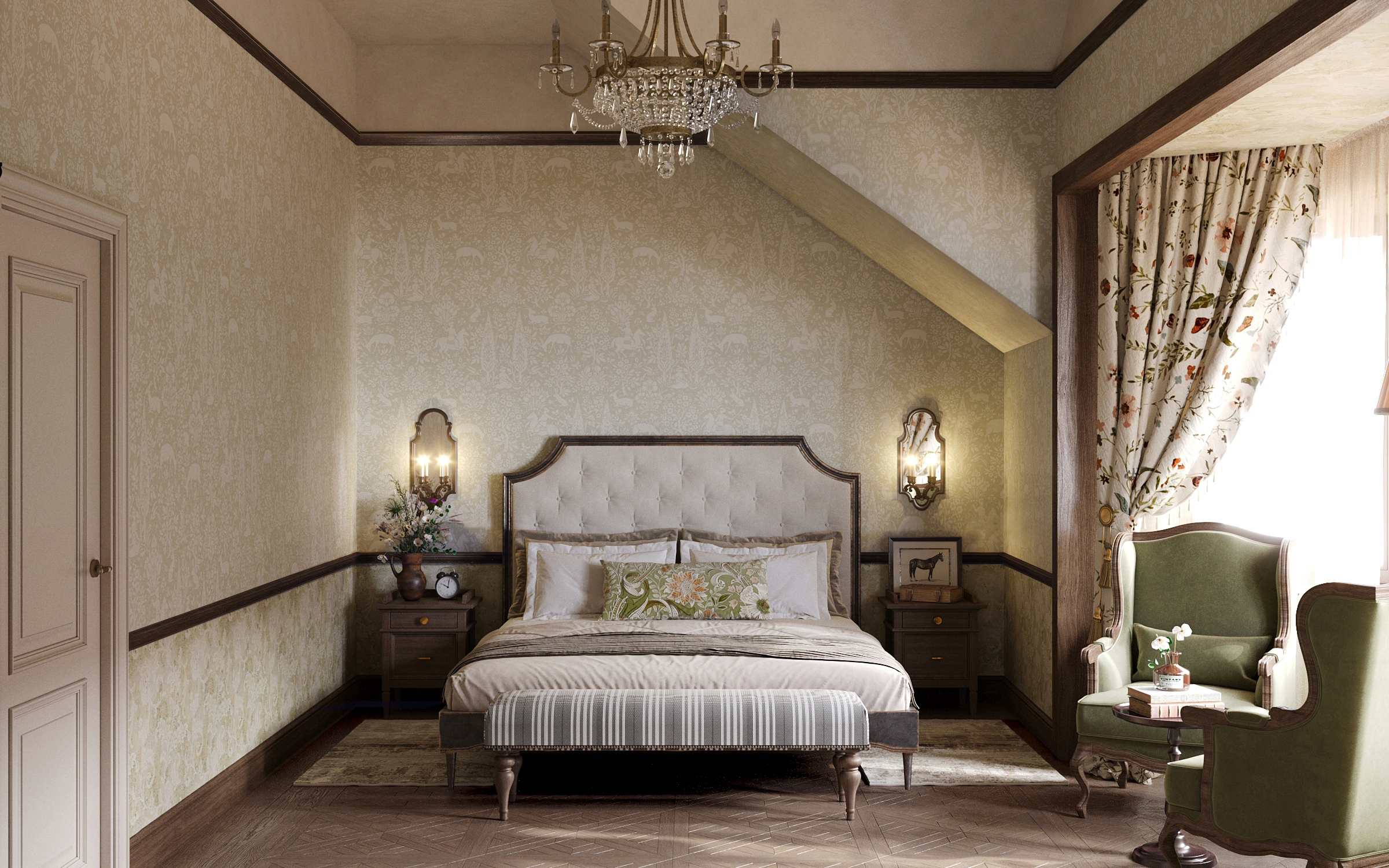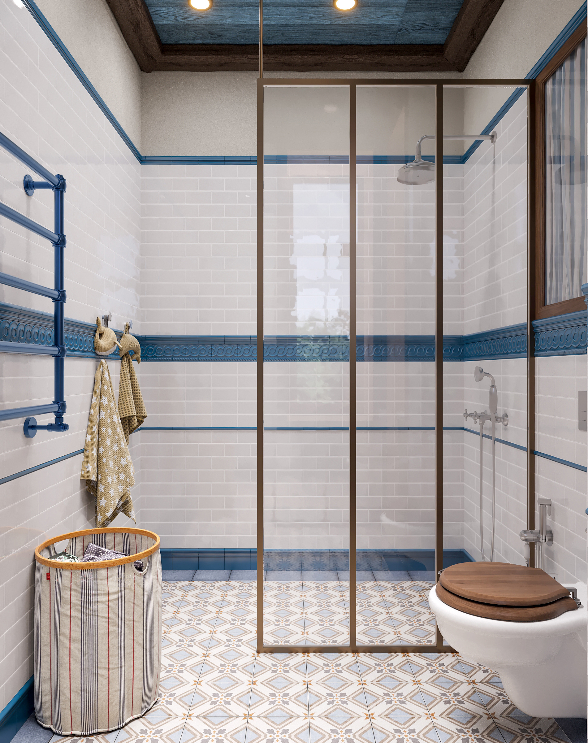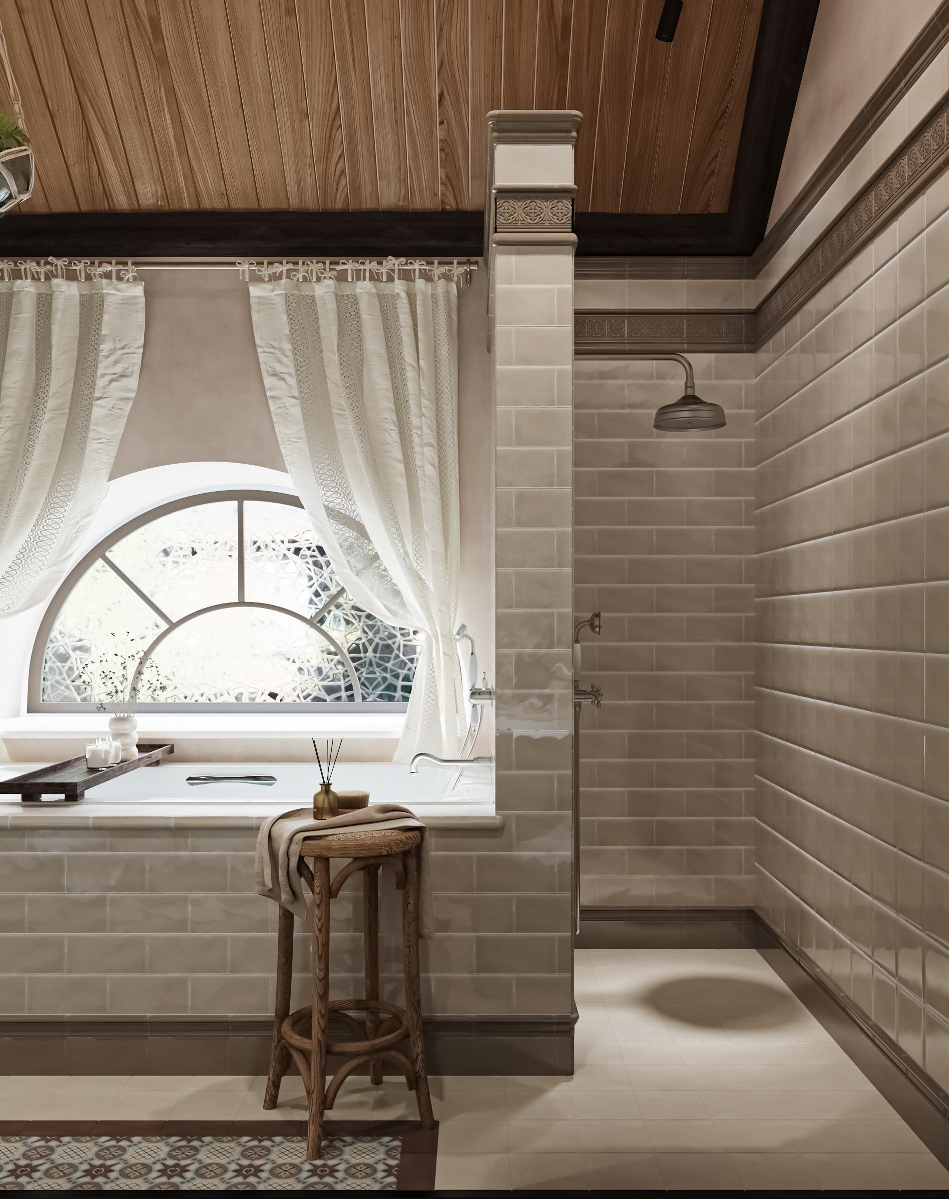 Верхний уровень выполнен как сочетание приватности и вдохновения. Здесь расположена гостевая спальня, а также кабинет, оформленный для работы в уединении. Дополняют этаж гардеробная, санузел и кладовая. Особым акцентом является зимний сад, наполненный светом и зеленью, а также чердачная игровая зона с гамаком и шалашом — настоящее пространство для детей. Потолки высотой до +2,89 м и винтовая лестница добавляют архитектурную выразительность и уют.