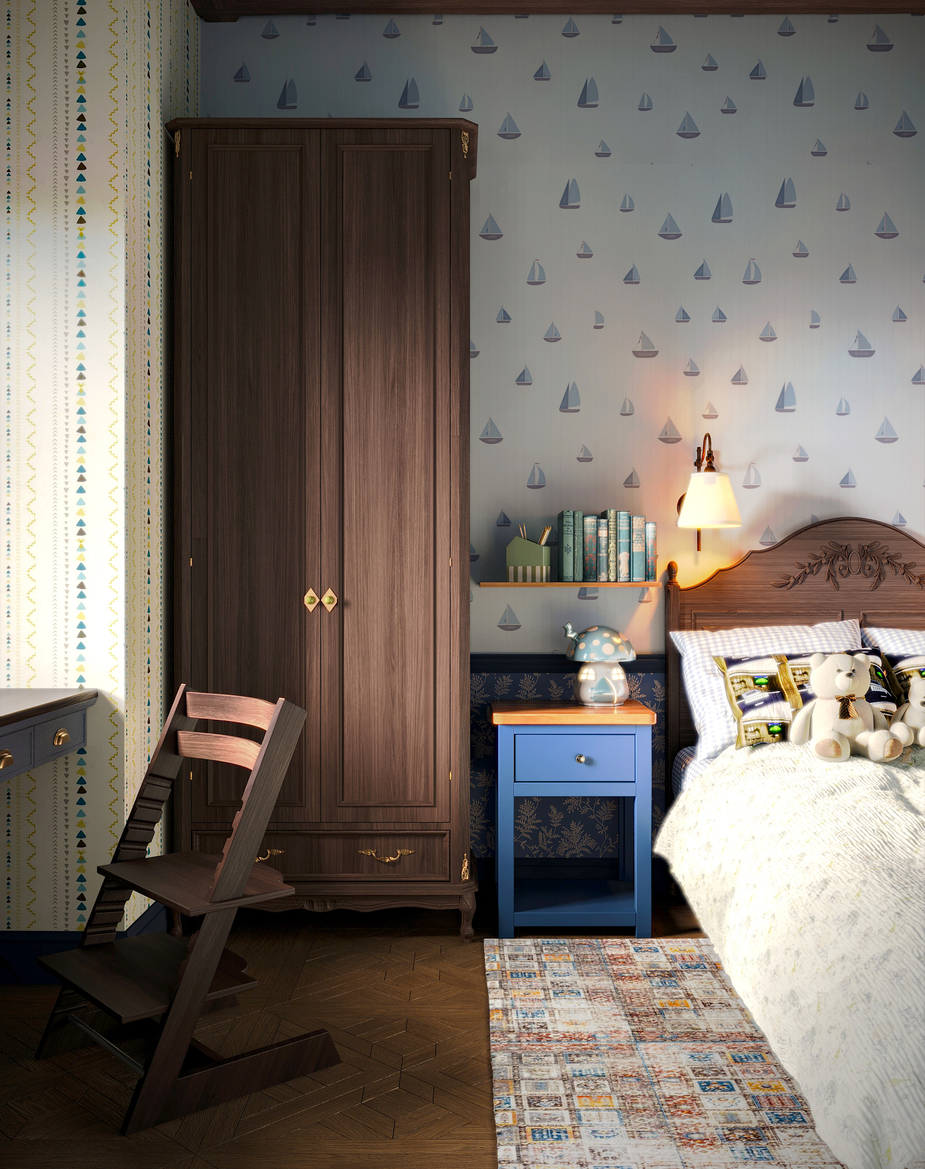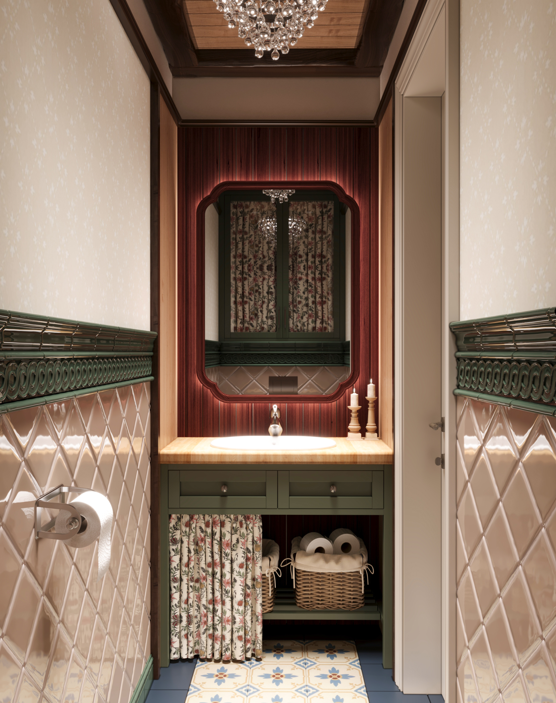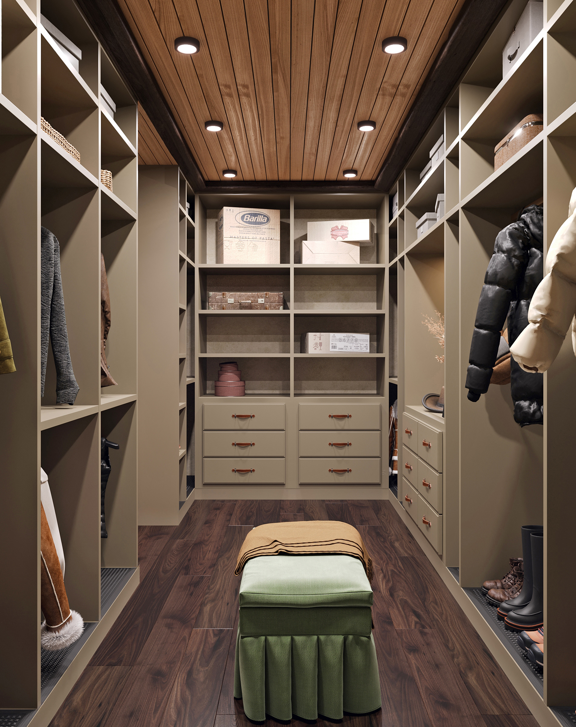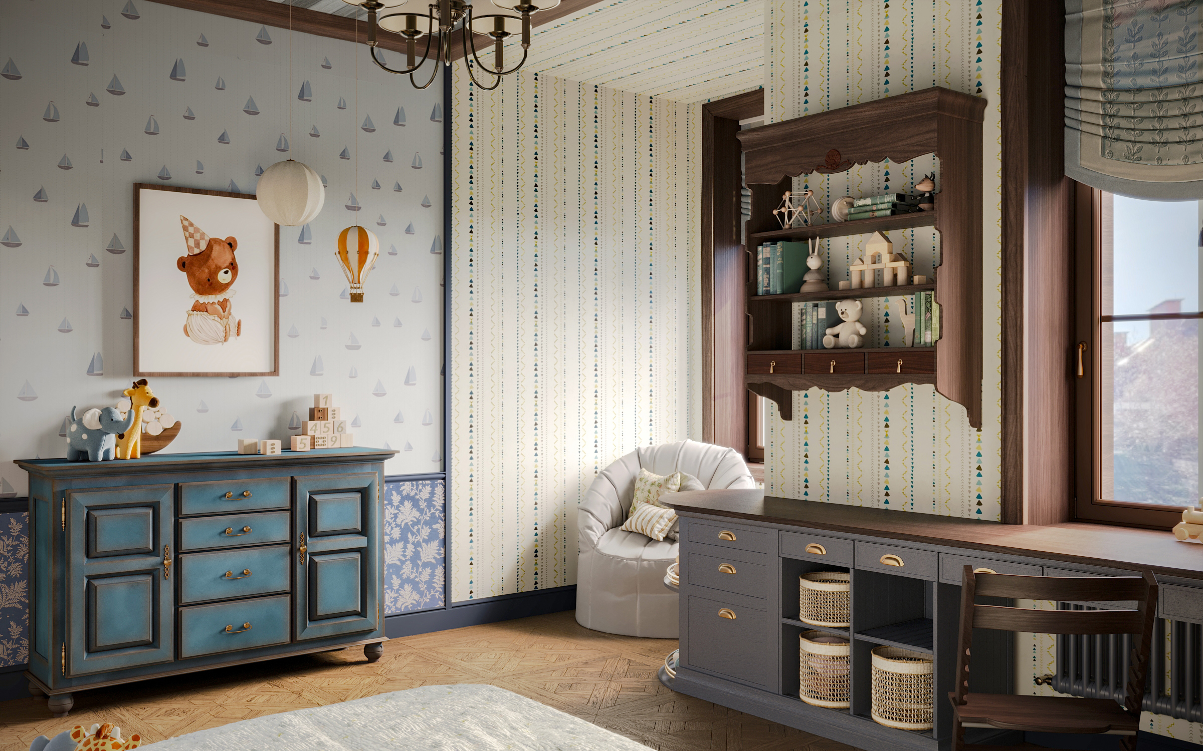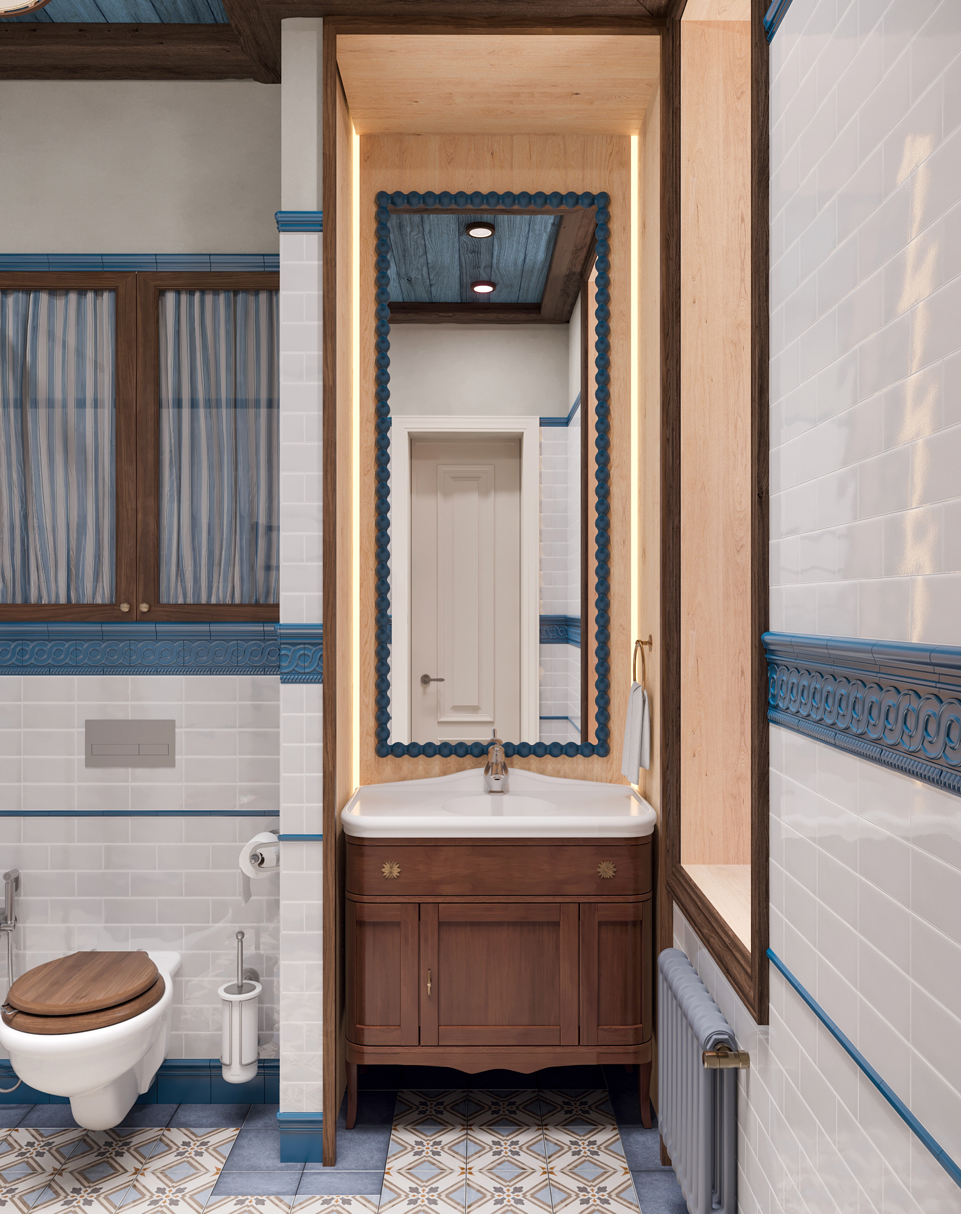 Верхний уровень выполнен как сочетание приватности и вдохновения. Здесь расположена гостевая спальня, а также кабинет, оформленный для работы в уединении. Дополняют этаж гардеробная, санузел и кладовая. Особым акцентом является зимний сад, наполненный светом и зеленью, а также чердачная игровая зона с гамаком и шалашом — настоящее пространство для детей. Потолки высотой до +2,89 м и винтовая лестница добавляют архитектурную выразительность и уют.