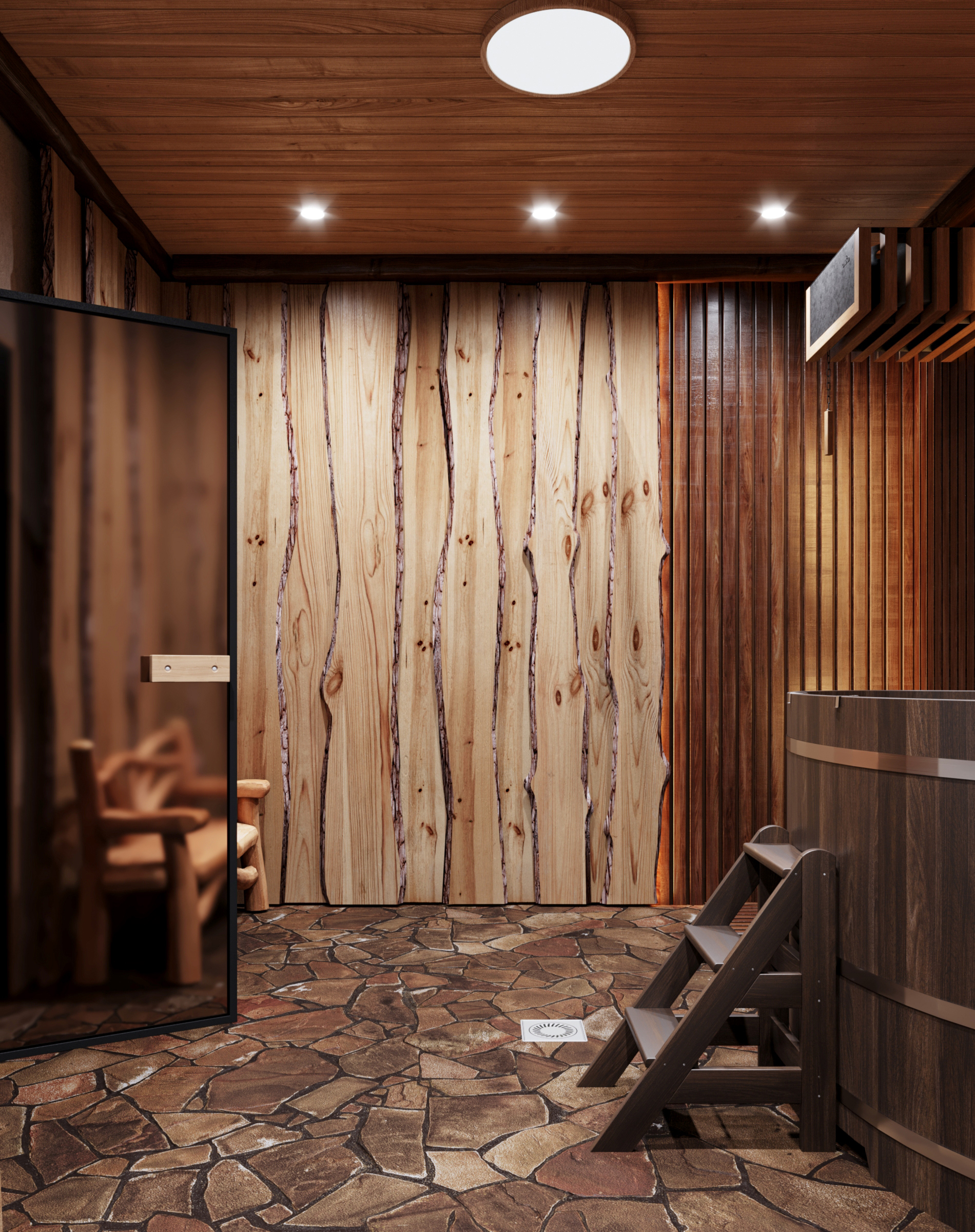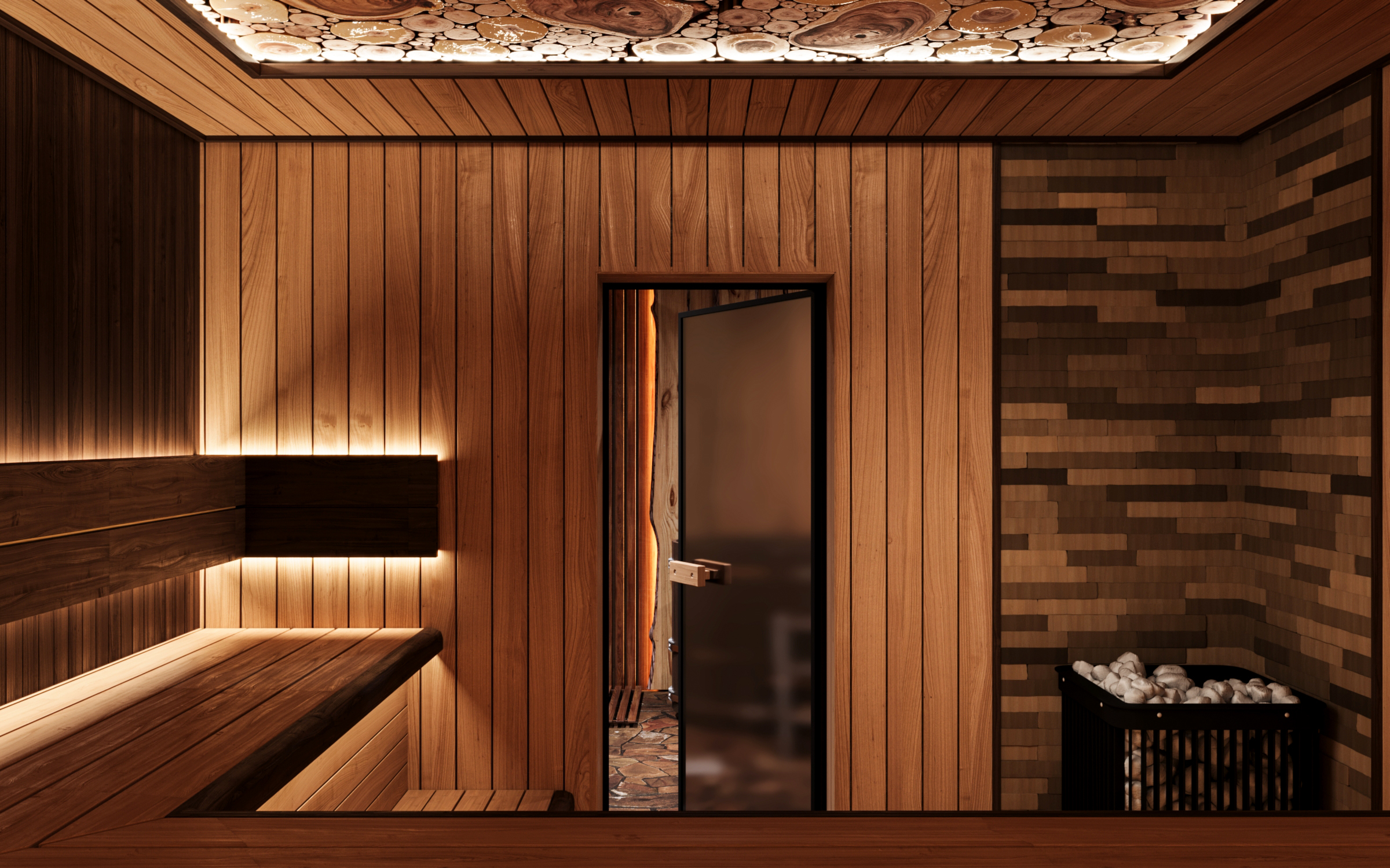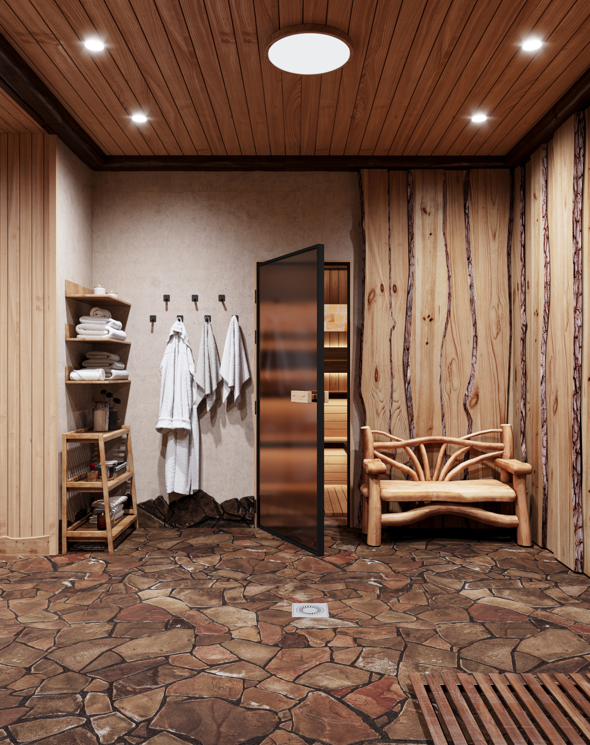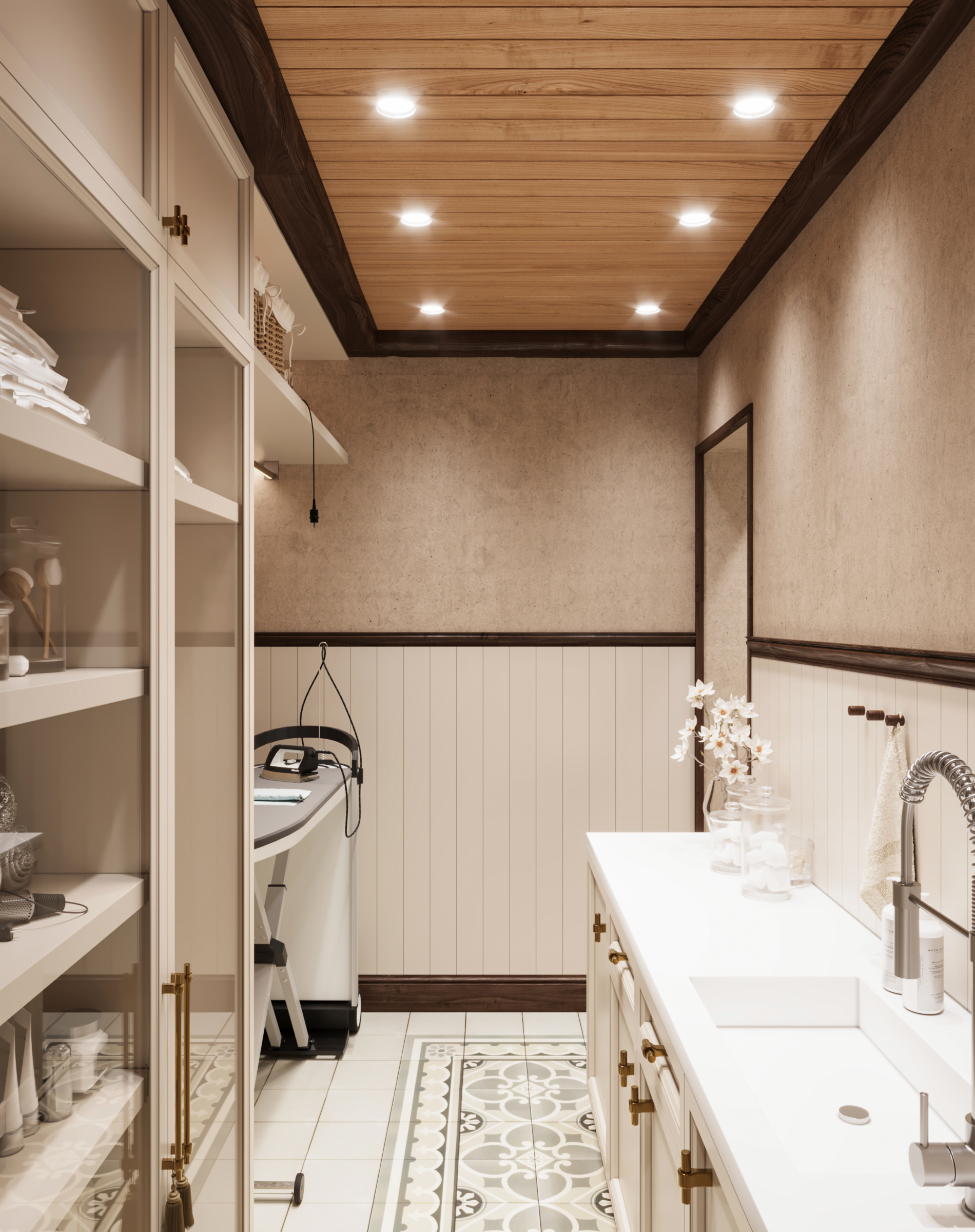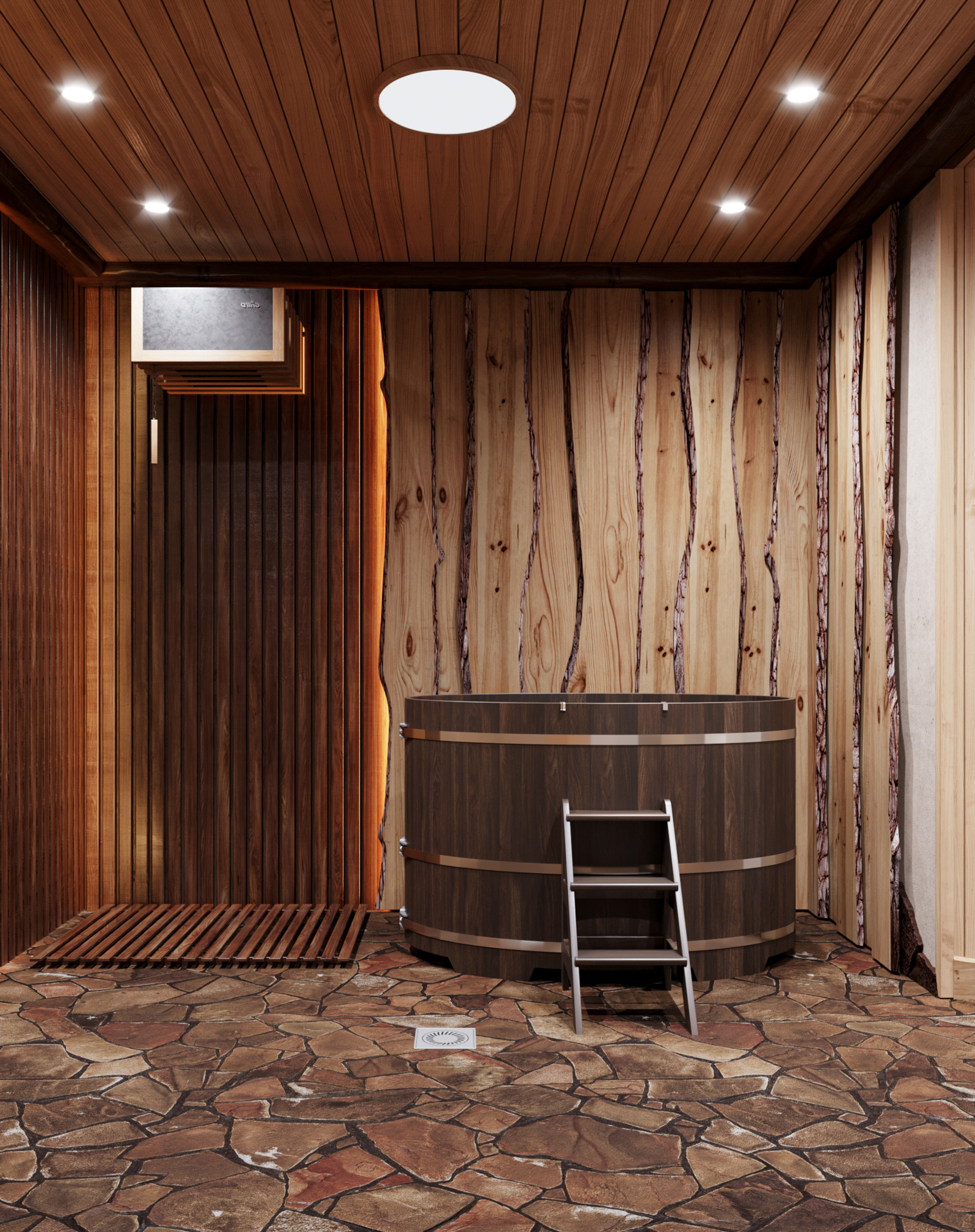 Цокольный этаж решён как пространство отдыха и уюта. Здесь располагается целая банная зона — сауна, купель с душевой и предбанник, создающие атмосферу загородного уединения. Продумана комната отдыха с раскладным диваном и ТВ-зоной, где можно расслабиться после парной. Для функциональности предусмотрены постирочная, гардеробная, а также котельная и зоны хранения (в том числе под лестницей).