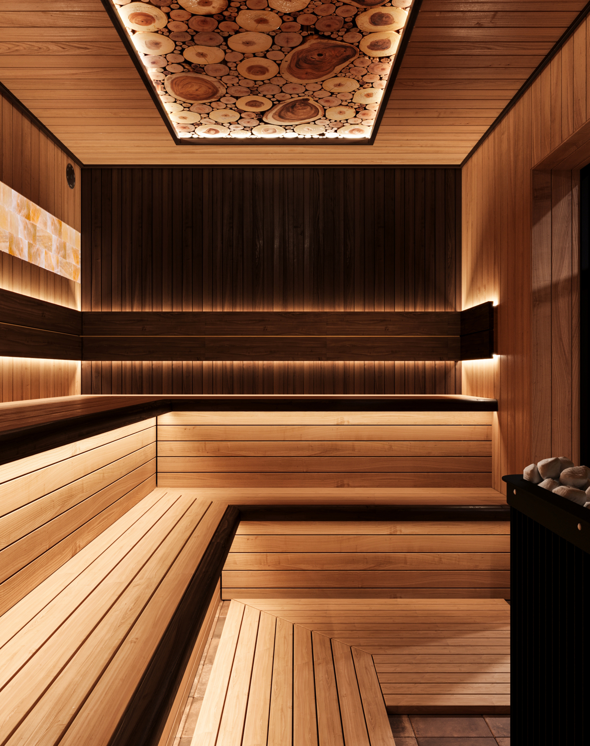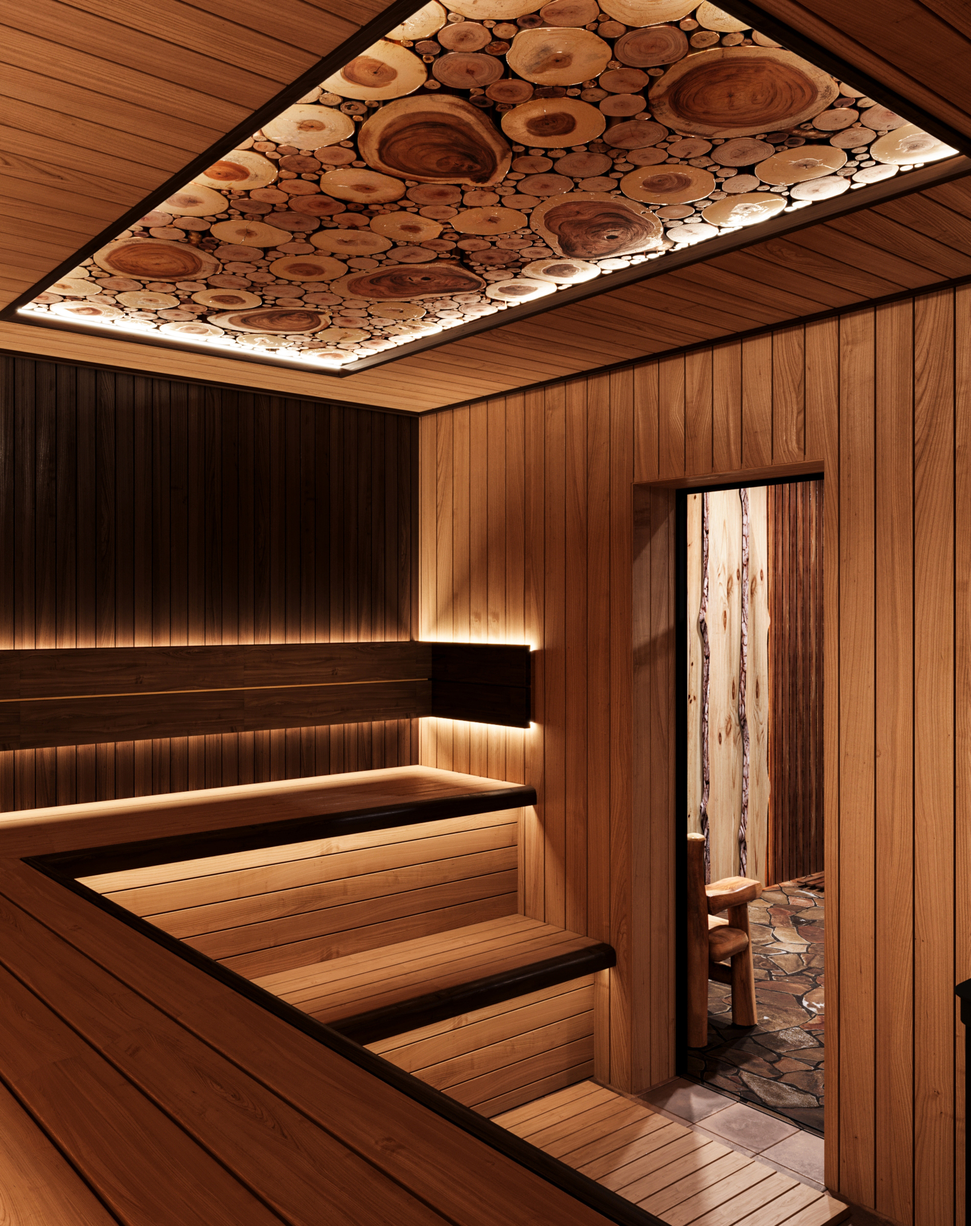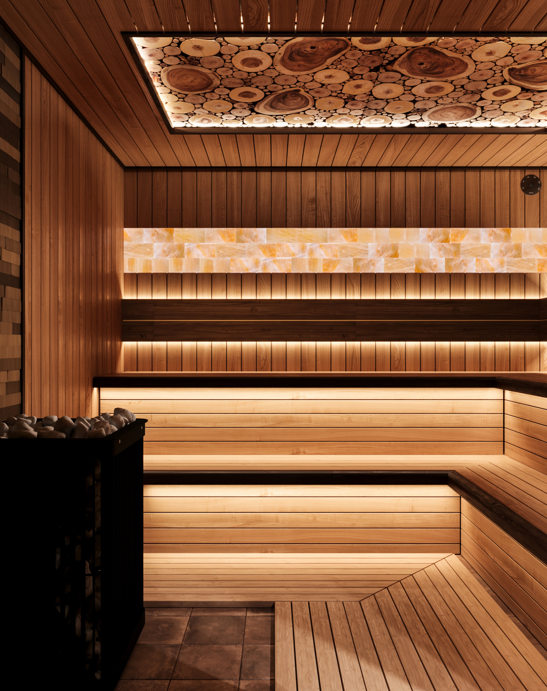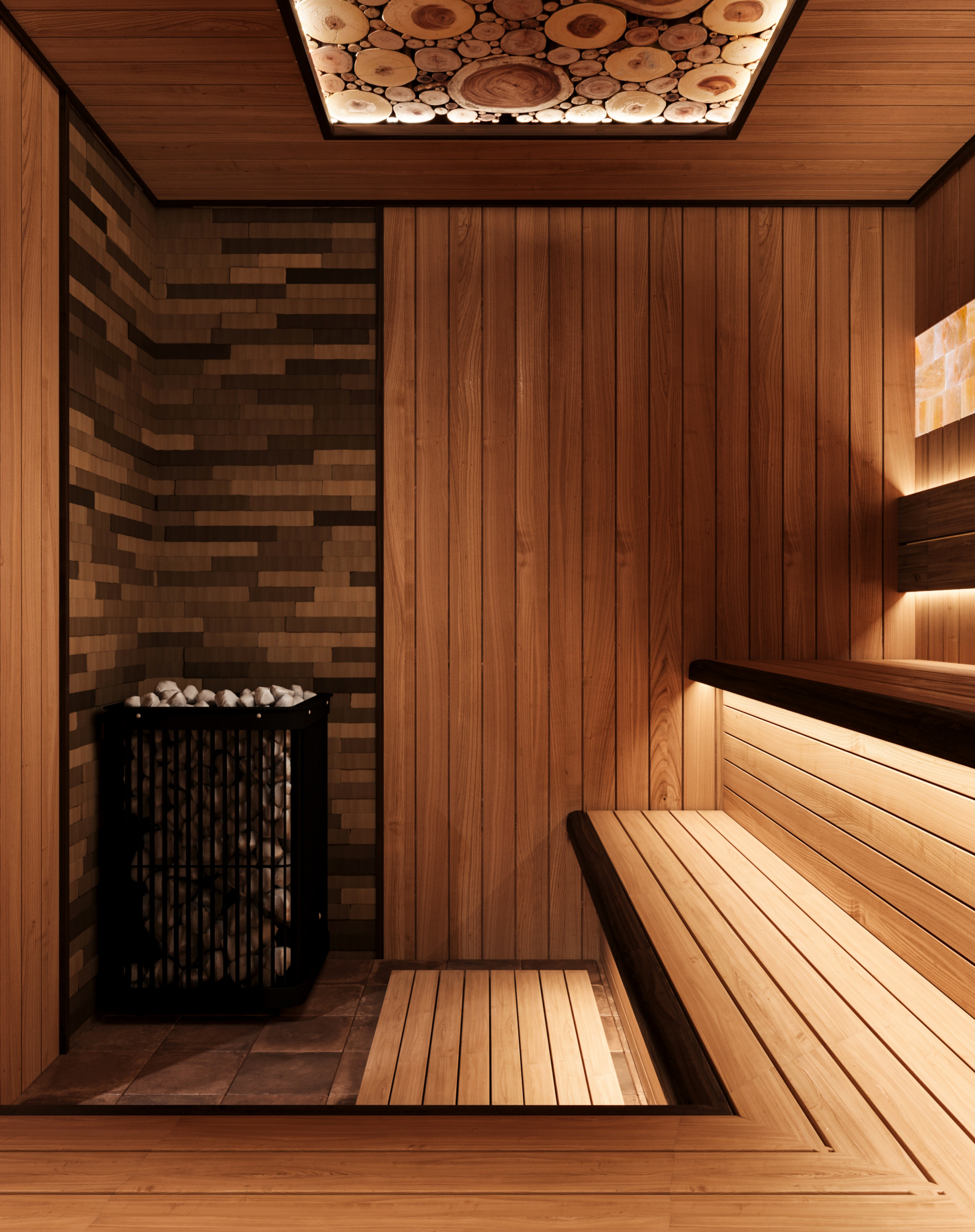 Цокольный этаж решён как пространство отдыха и уюта. Здесь располагается целая банная зона — сауна, купель с душевой и предбанник, создающие атмосферу загородного уединения. Продумана комната отдыха с раскладным диваном и ТВ-зоной, где можно расслабиться после парной. Для функциональности предусмотрены постирочная, гардеробная, а также котельная и зоны хранения (в том числе под лестницей).