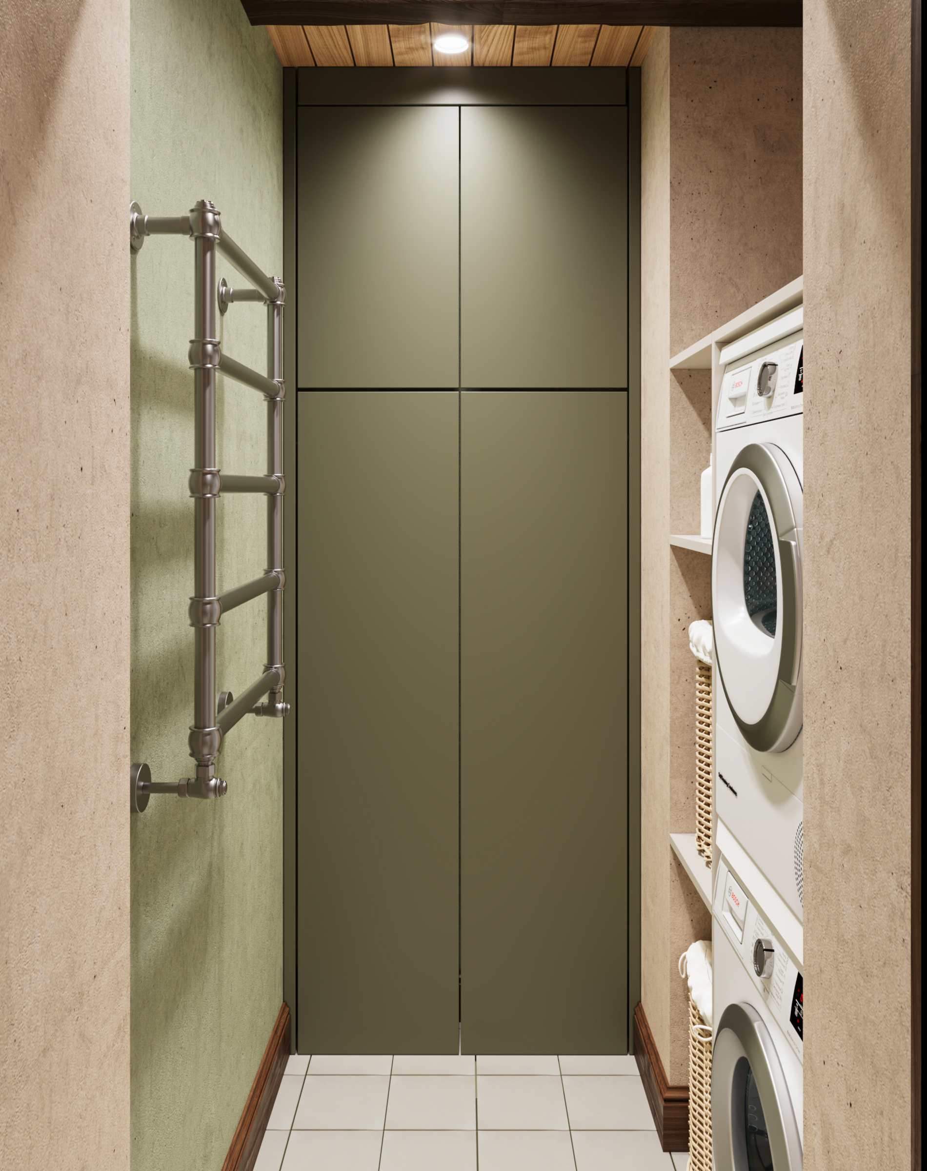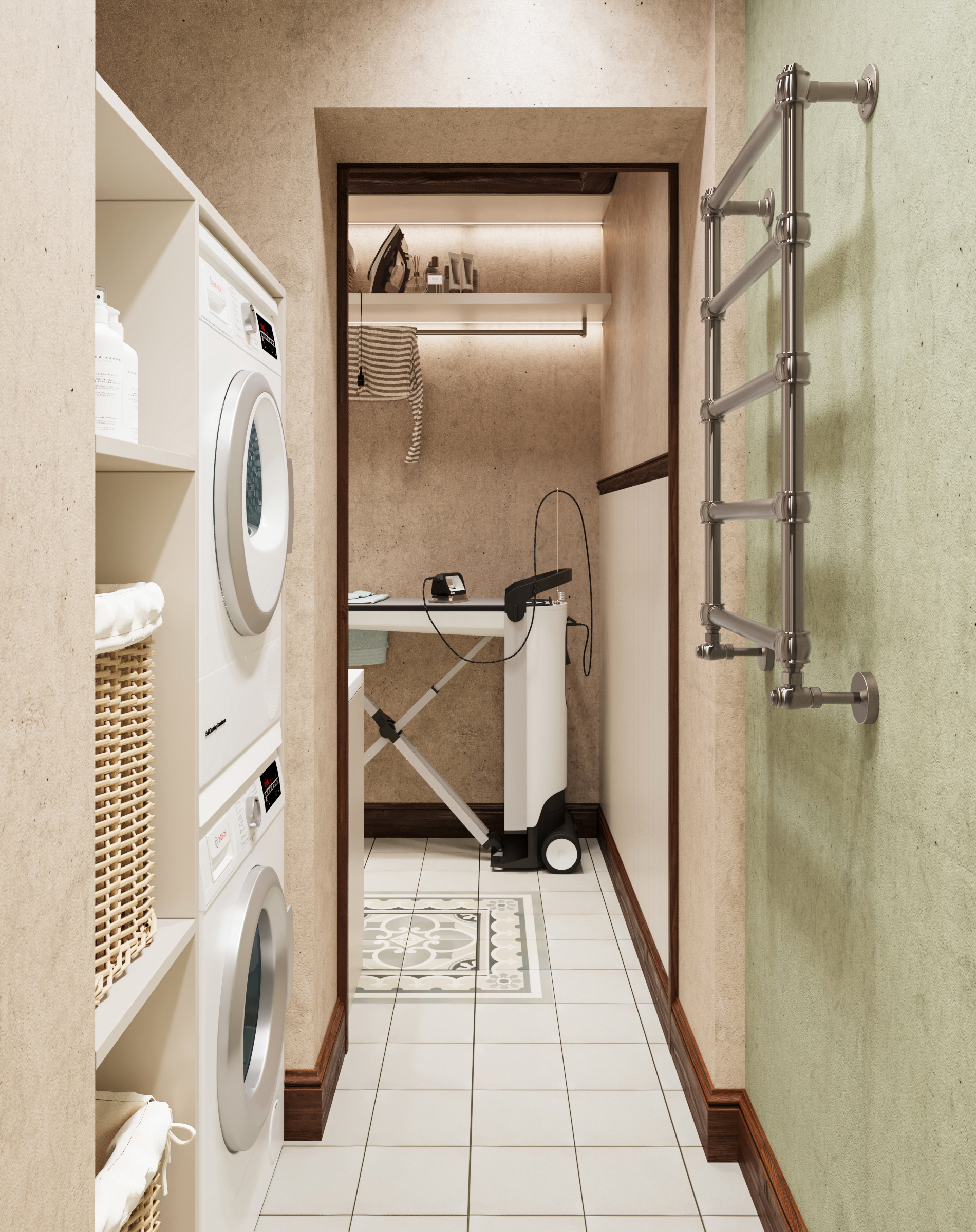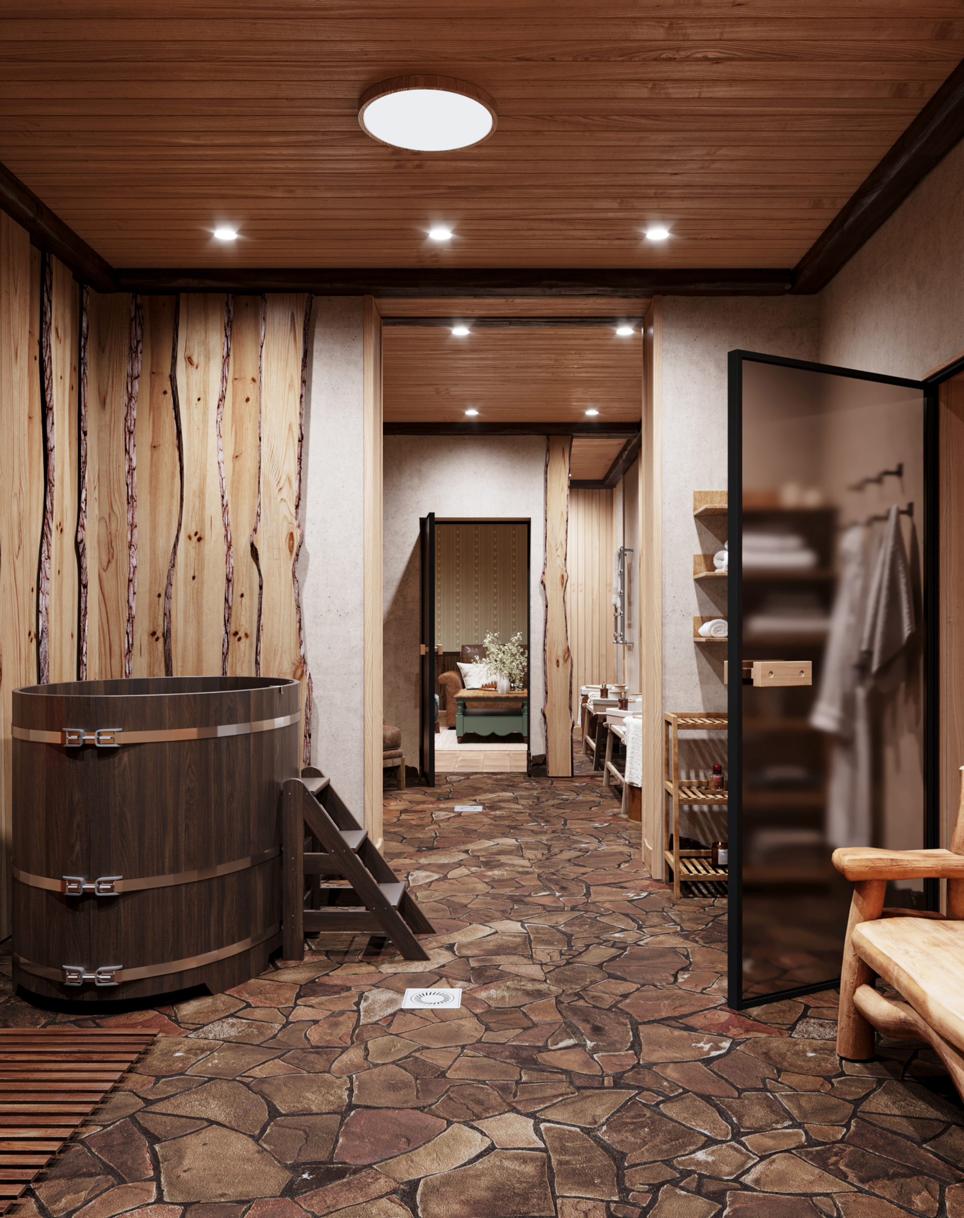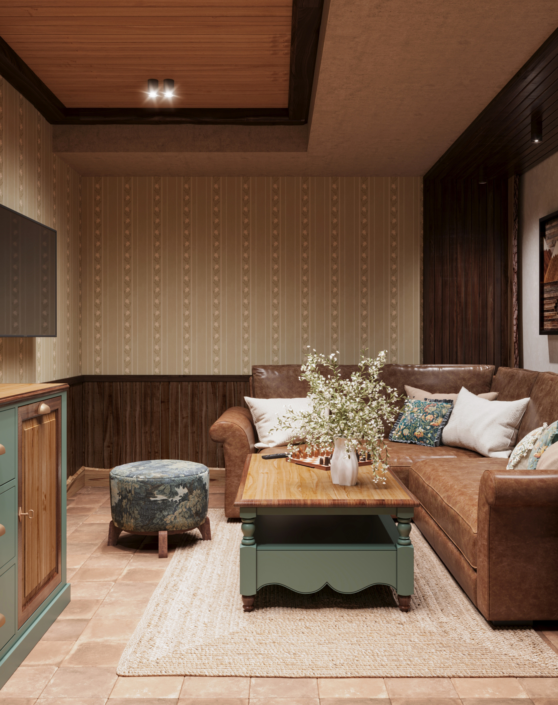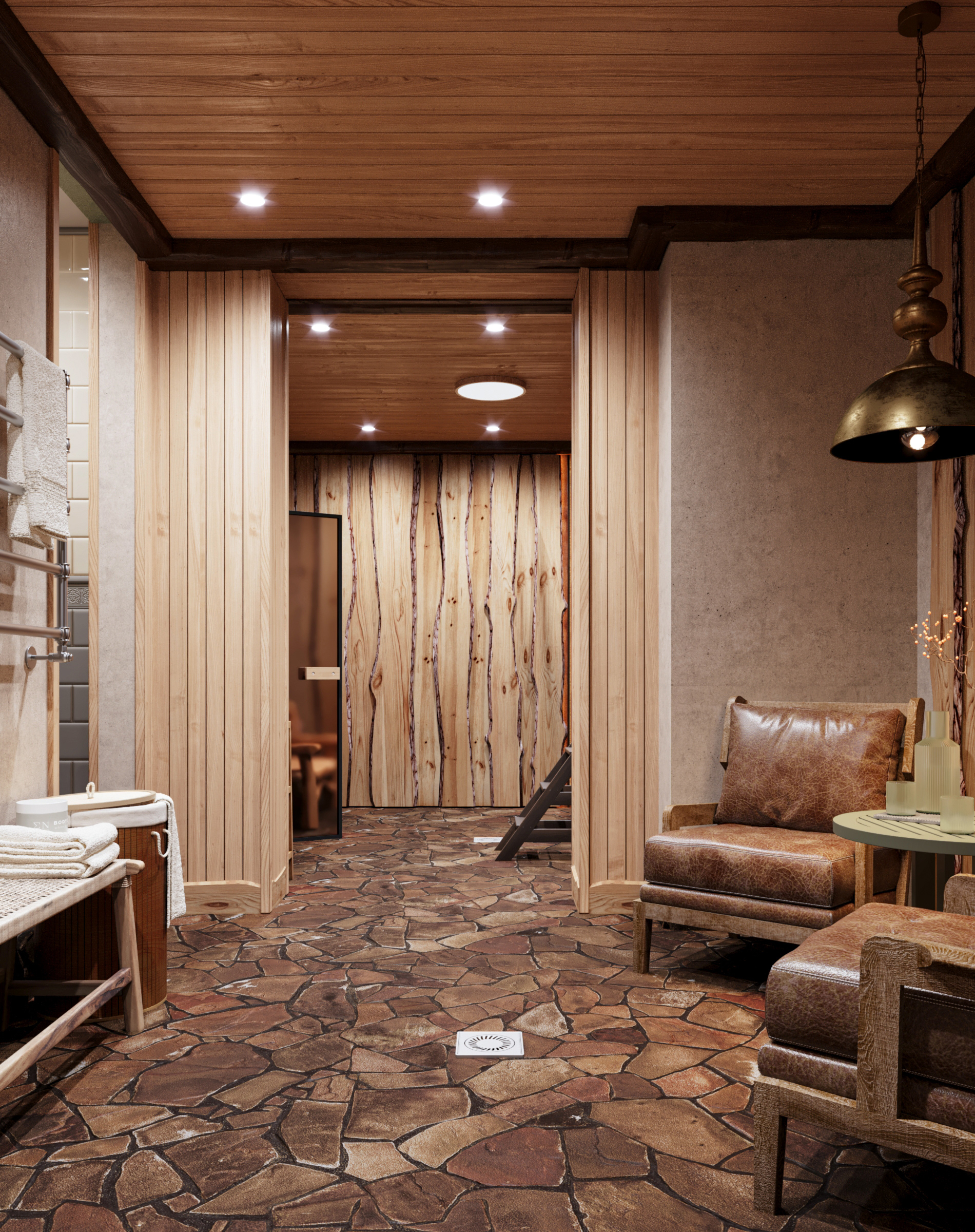 Цокольный этаж решён как пространство отдыха и уюта. Здесь располагается целая банная зона — сауна, купель с душевой и предбанник, создающие атмосферу загородного уединения. Продумана комната отдыха с раскладным диваном и ТВ-зоной, где можно расслабиться после парной. Для функциональности предусмотрены постирочная, гардеробная, а также котельная и зоны хранения (в том числе под лестницей).