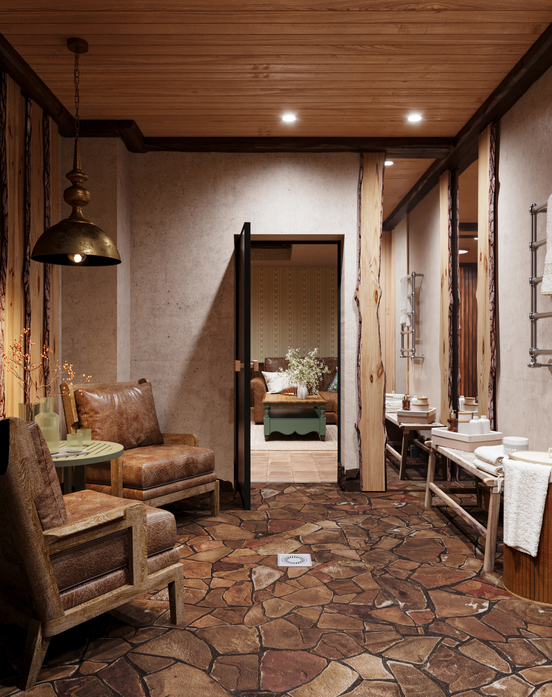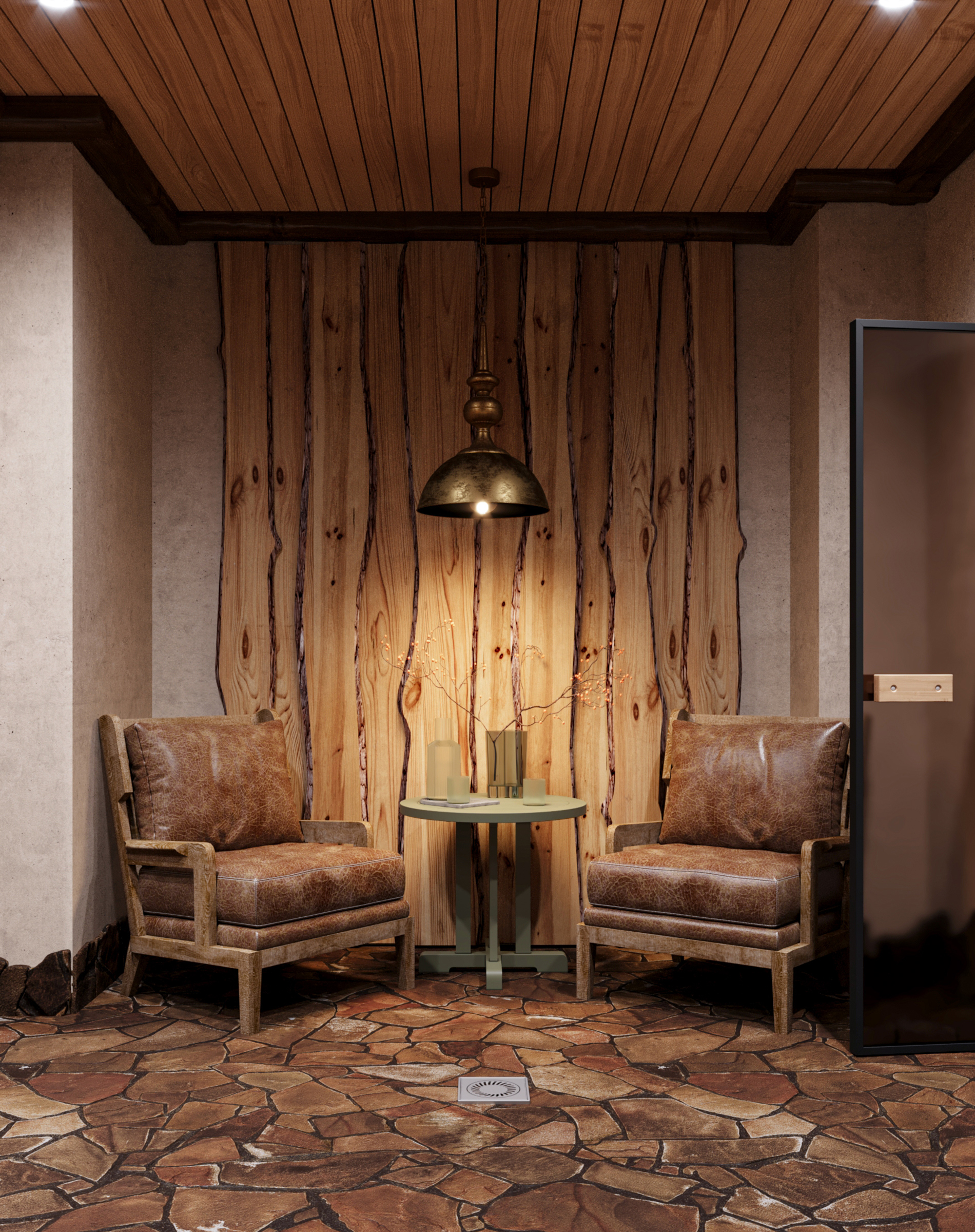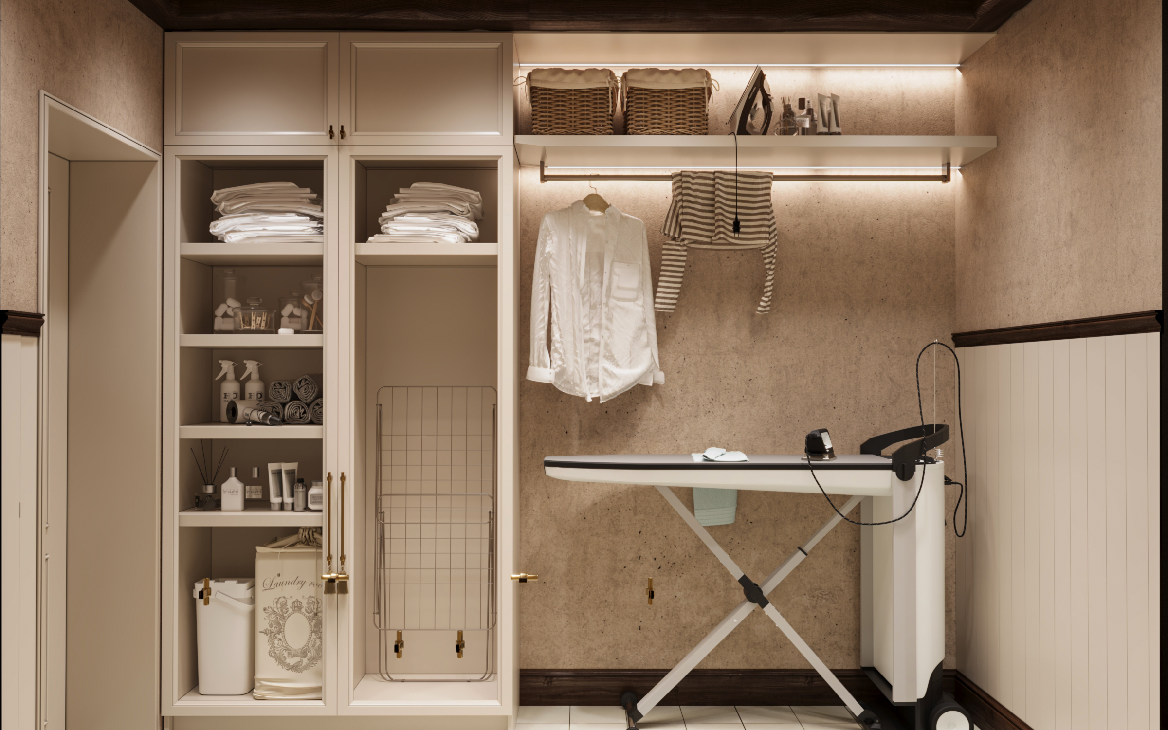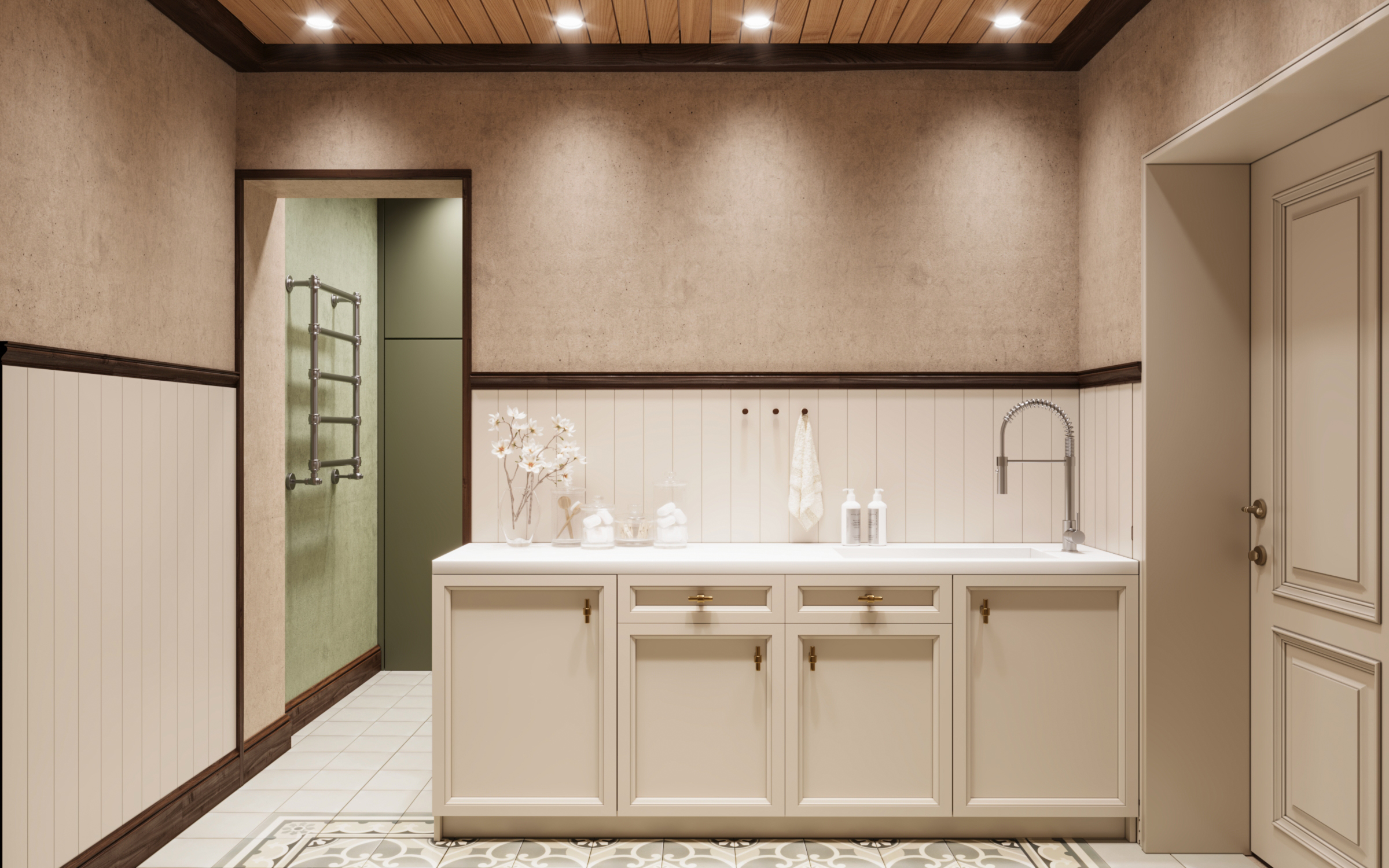 Цокольный этаж решён как пространство отдыха и уюта. Здесь располагается целая банная зона — сауна, купель с душевой и предбанник, создающие атмосферу загородного уединения. Продумана комната отдыха с раскладным диваном и ТВ-зоной, где можно расслабиться после парной. Для функциональности предусмотрены постирочная, гардеробная, а также котельная и зоны хранения (в том числе под лестницей).