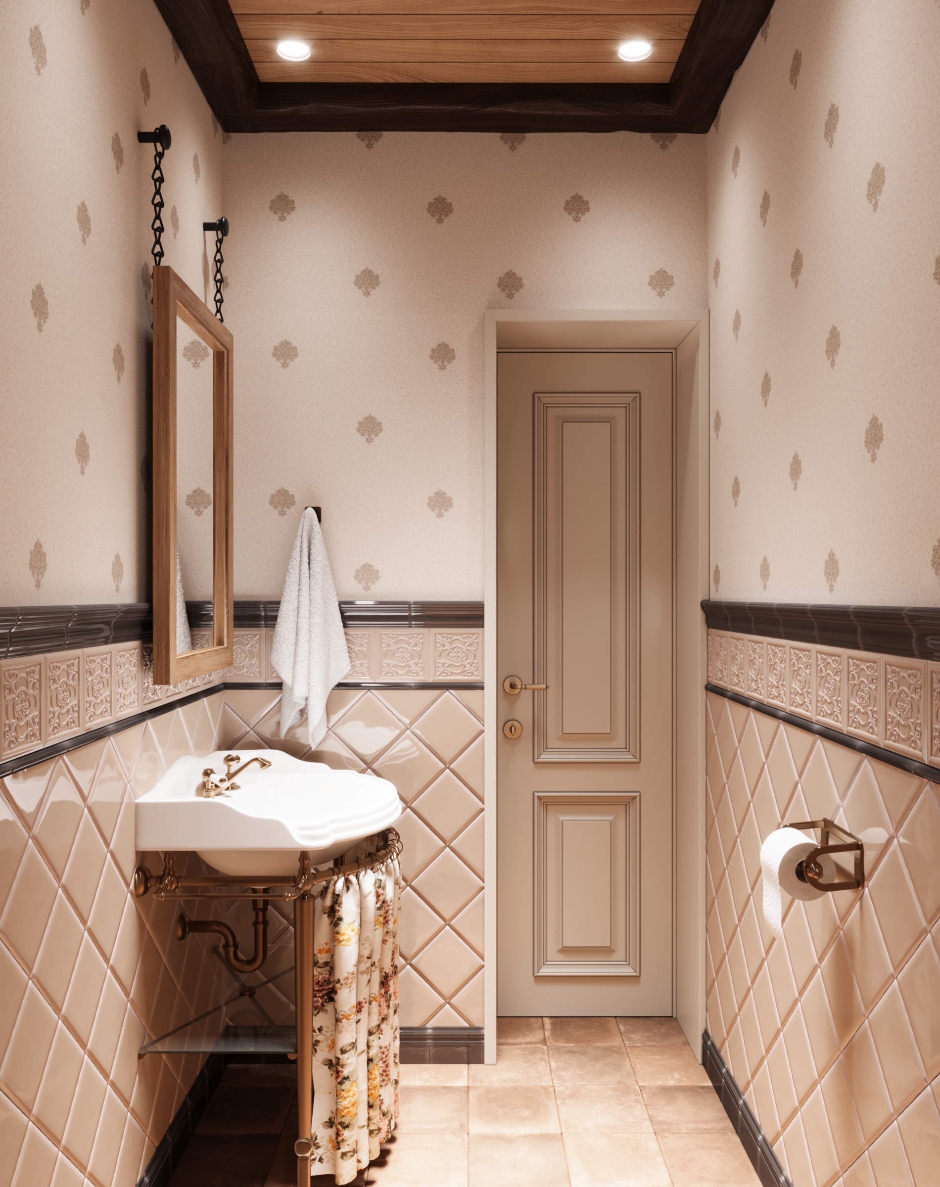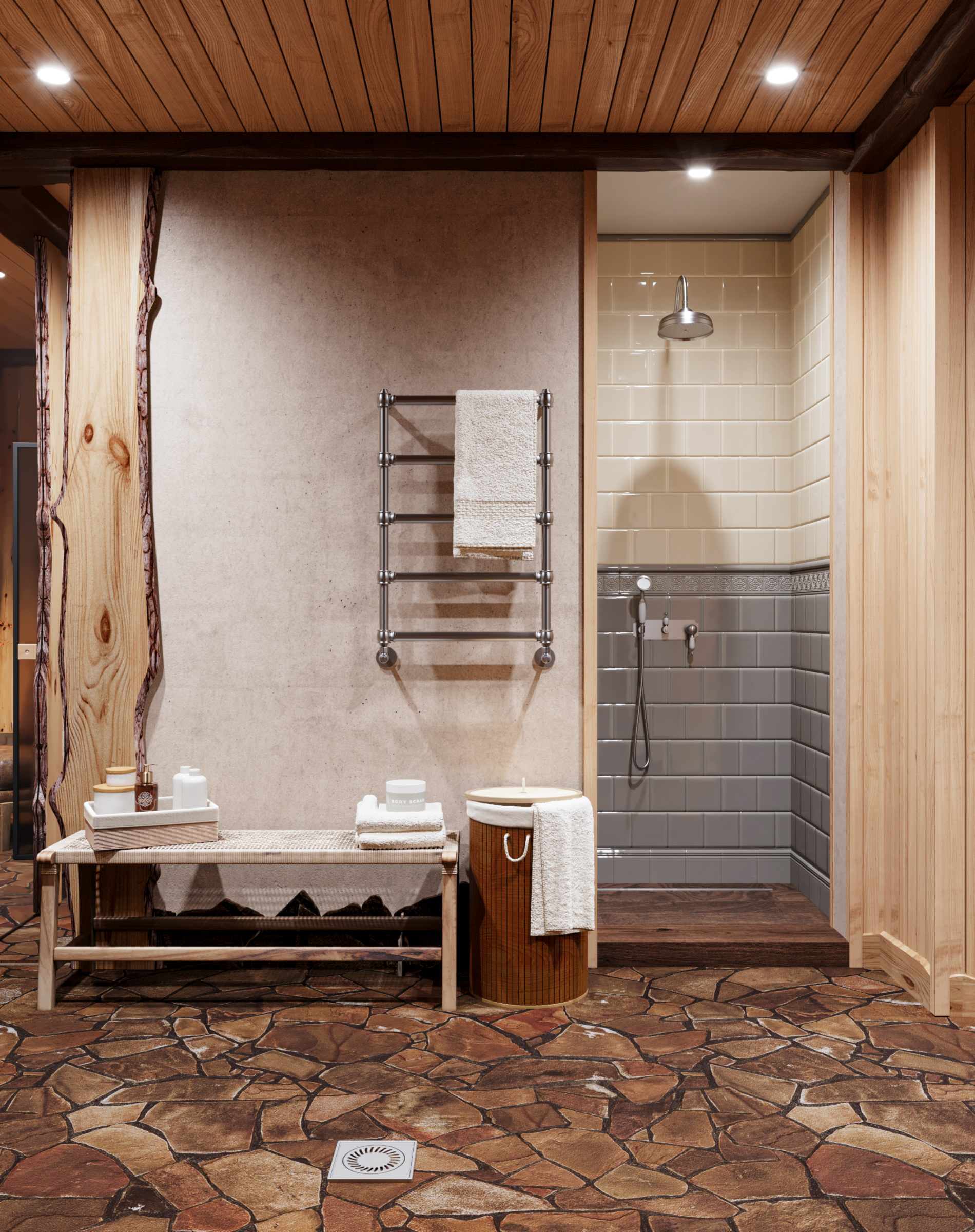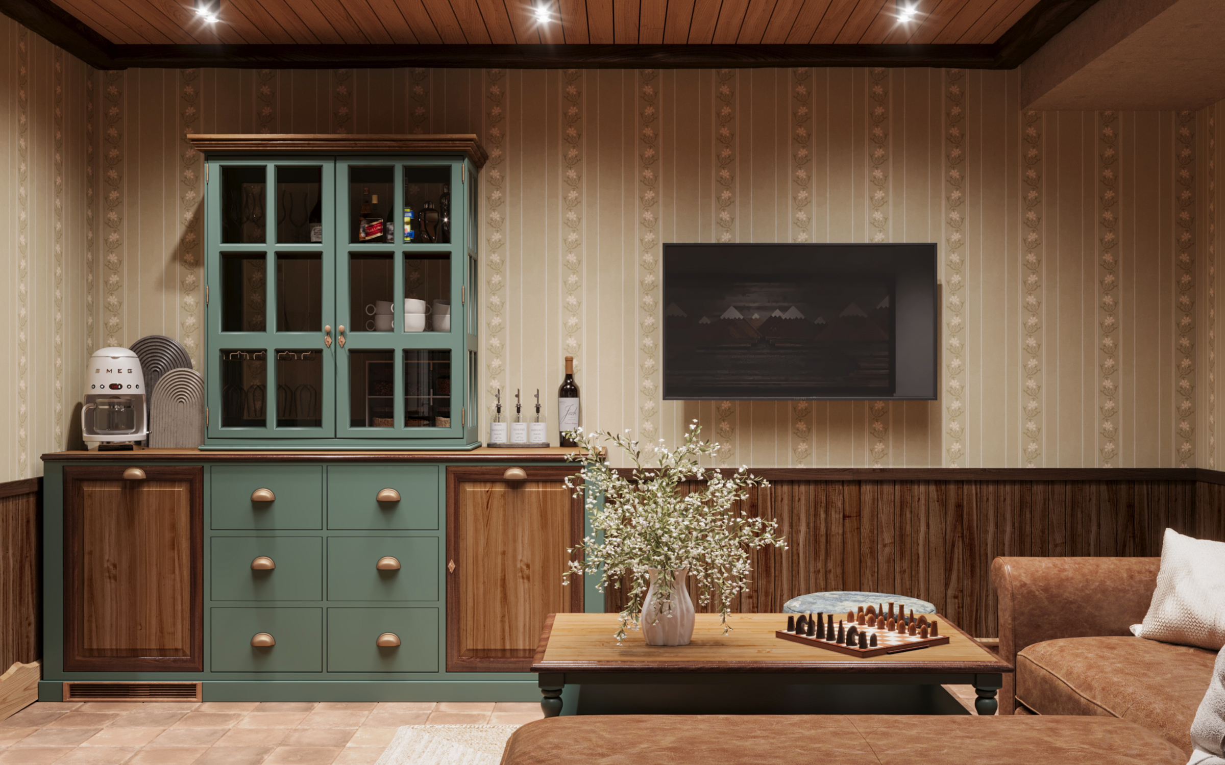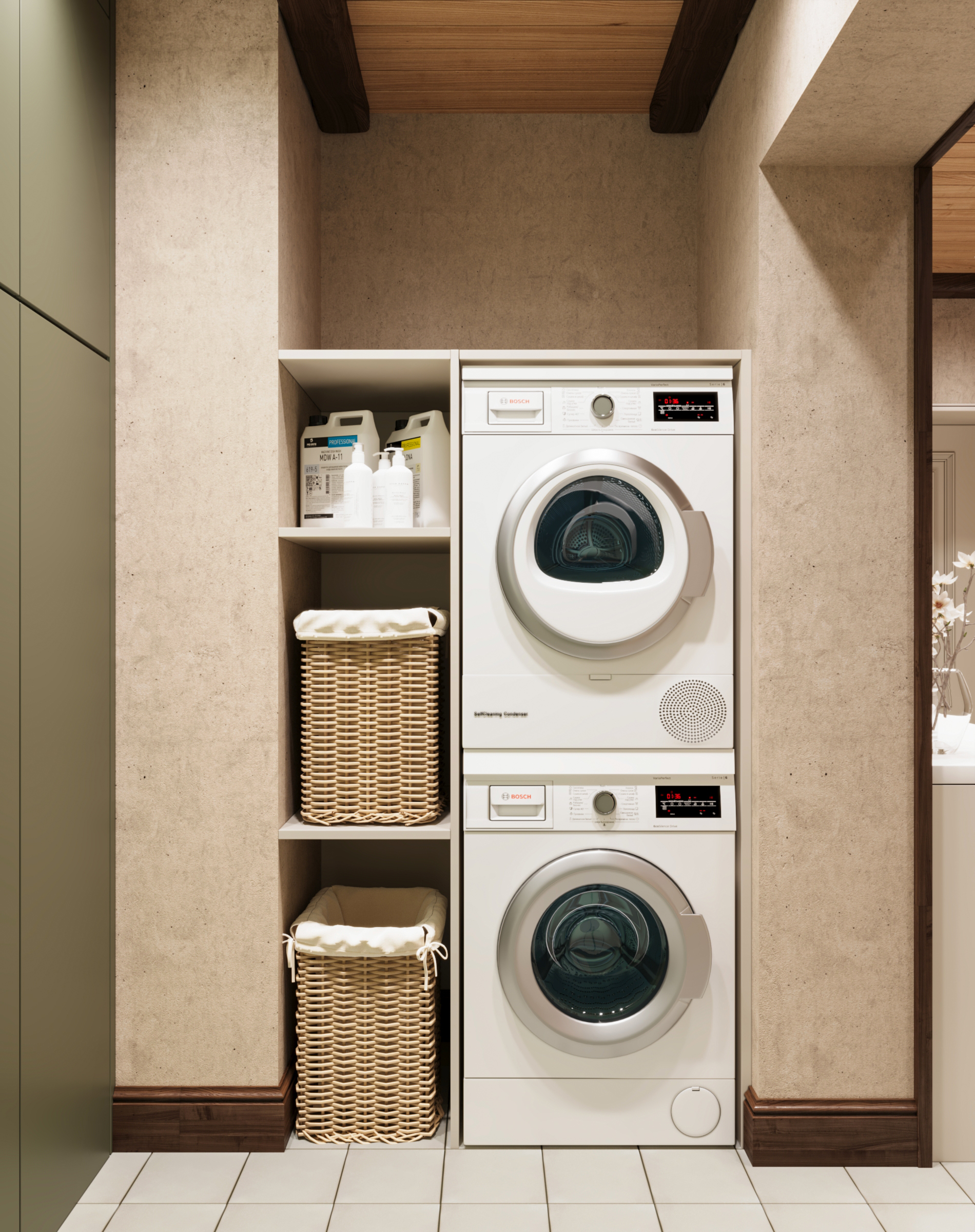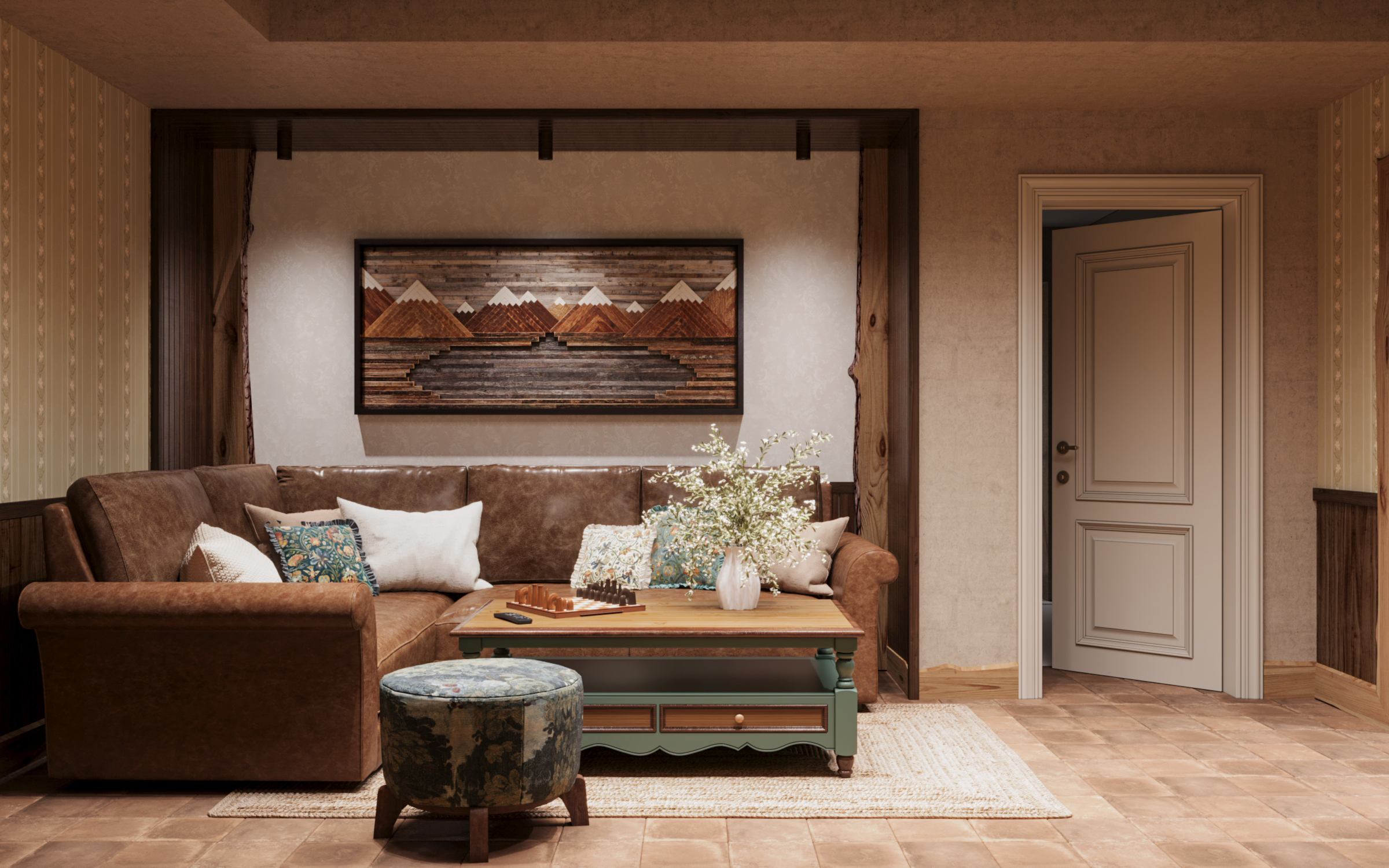 Цокольный этаж решён как пространство отдыха и уюта. Здесь располагается целая банная зона — сауна, купель с душевой и предбанник, создающие атмосферу загородного уединения. Продумана комната отдыха с раскладным диваном и ТВ-зоной, где можно расслабиться после парной. Для функциональности предусмотрены постирочная, гардеробная, а также котельная и зоны хранения (в том числе под лестницей).