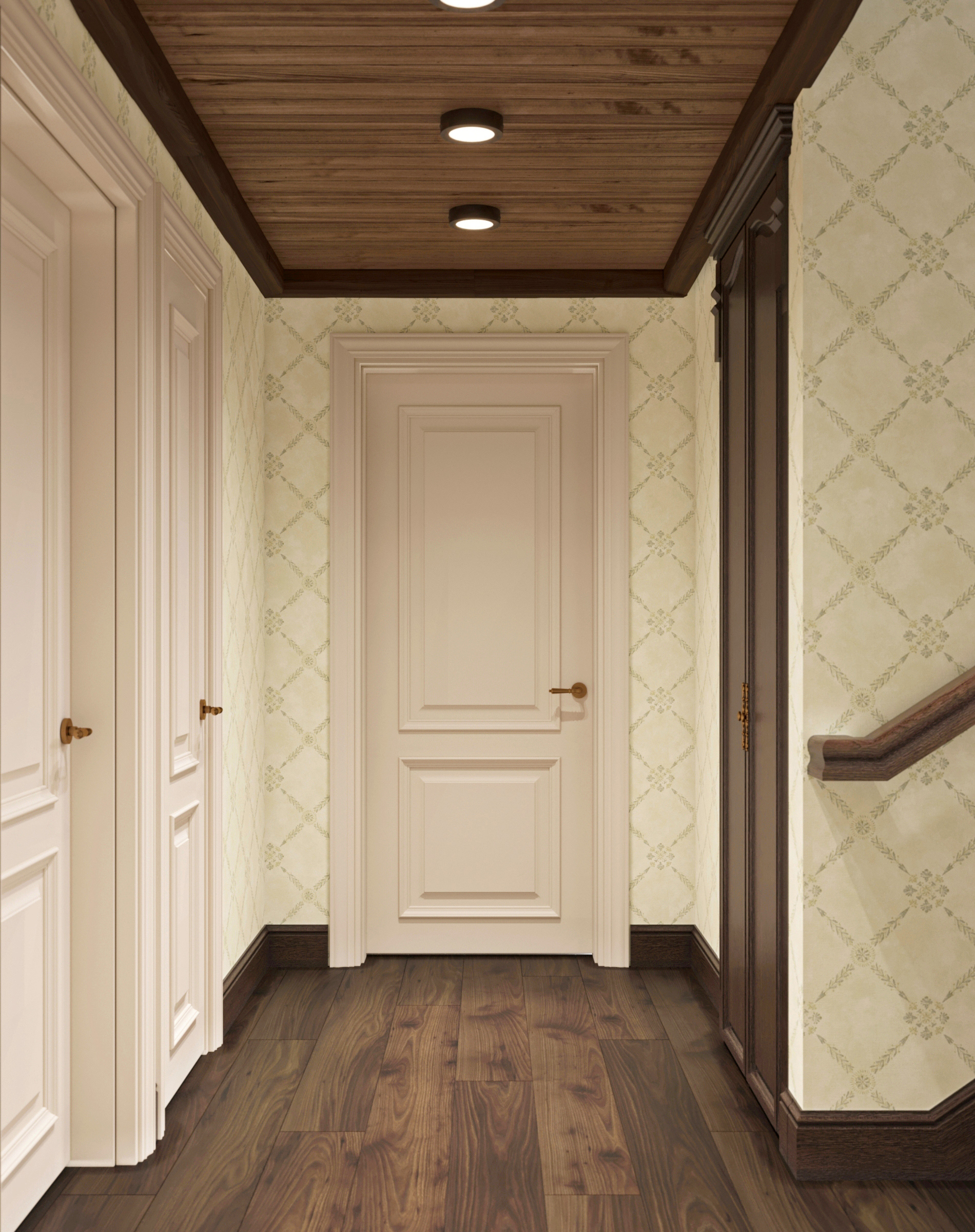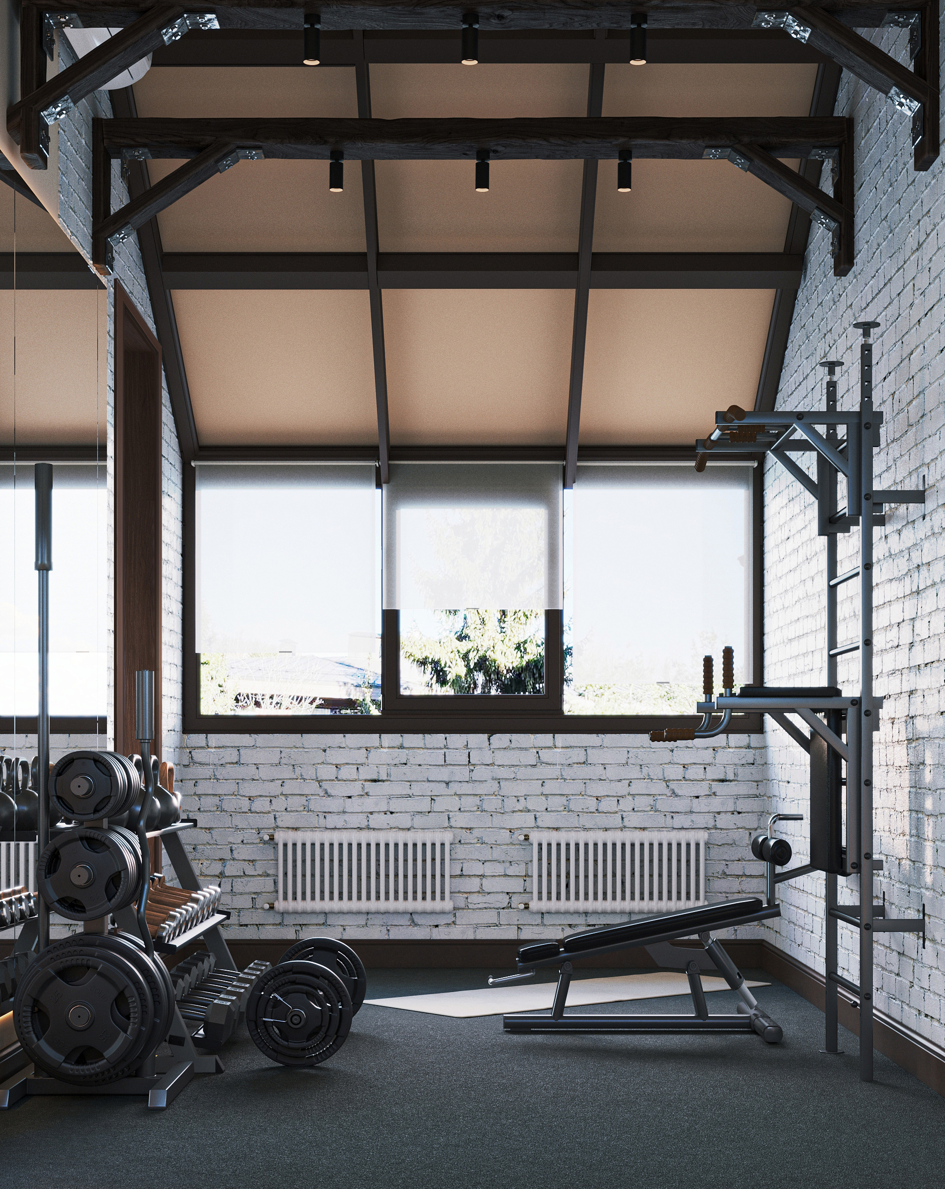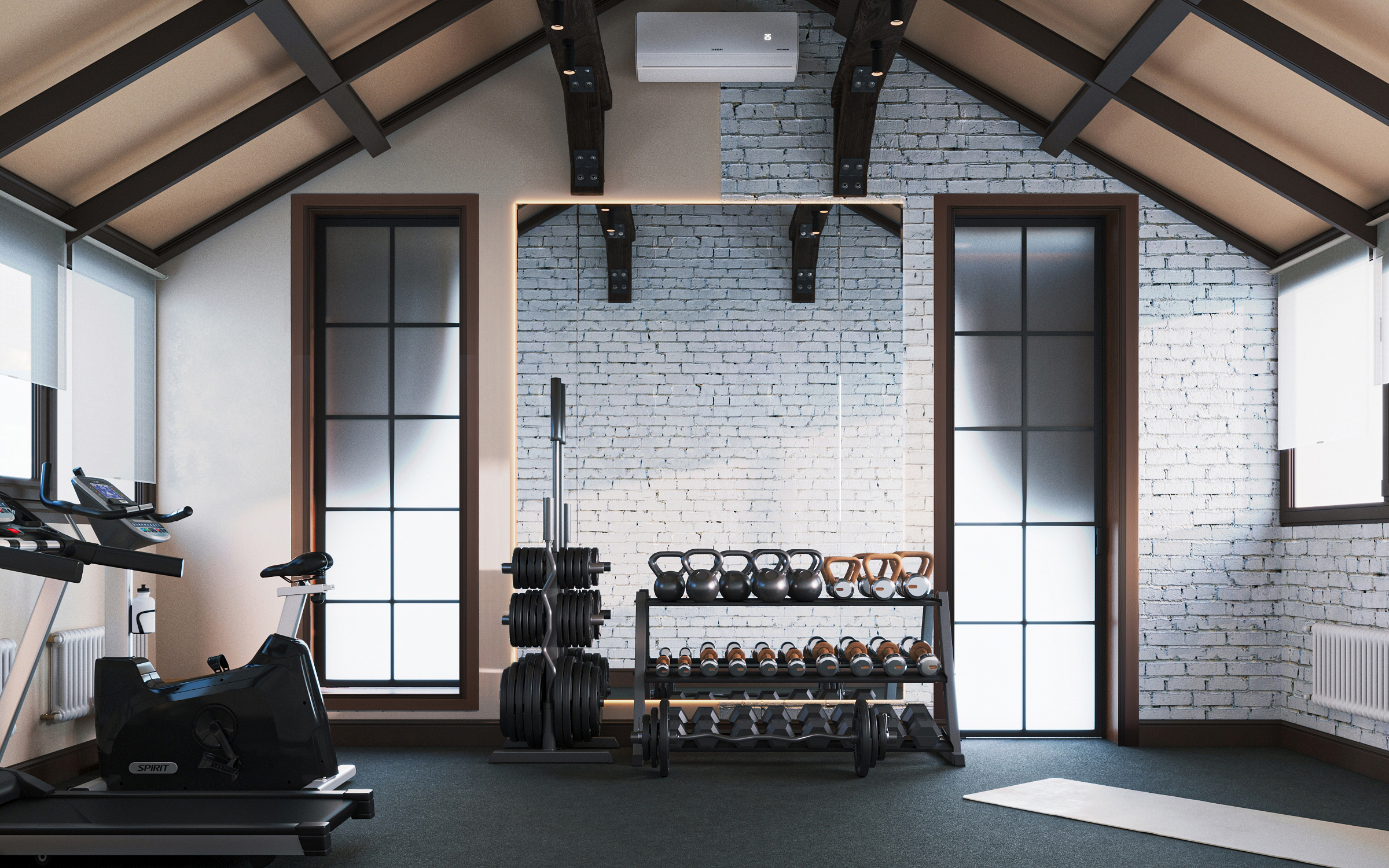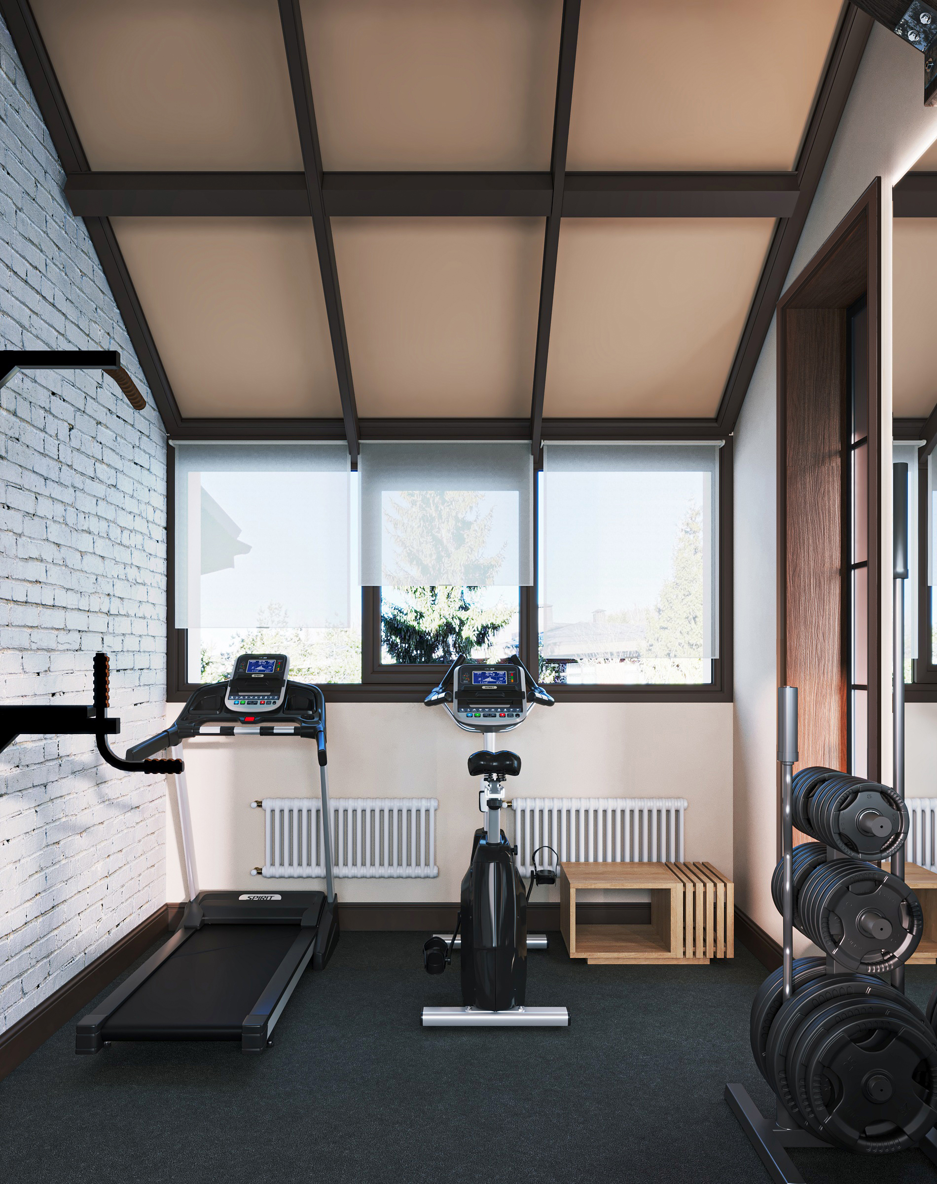 Второй этаж полностью отдан приватным пространствам. Здесь находится мастер-спальня с собственным санузлом, просторная детская комната и отдельный детский санузел. Создана комната отдыха/няни, а для здоровья — полноценный домашний спортзал с тренажёрами и зеркалами. Все помещения объединены удобным коридором и лестничным холлом, высота потолков здесь достигает +3,05 м, что придаёт лёгкость и элегантность планировке.