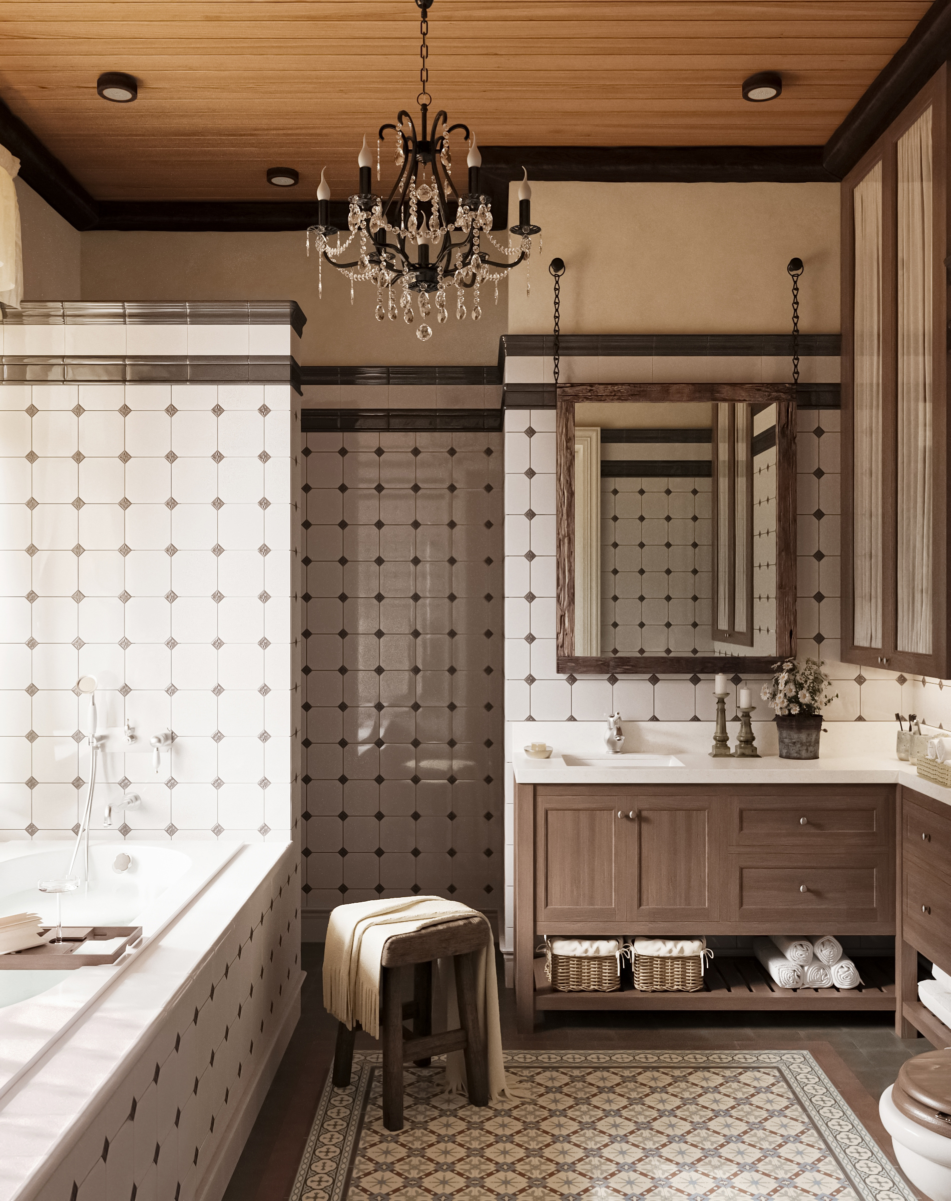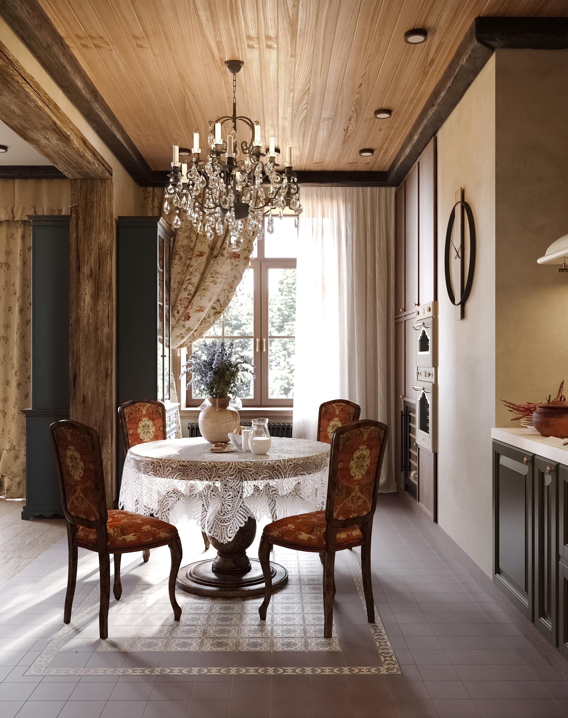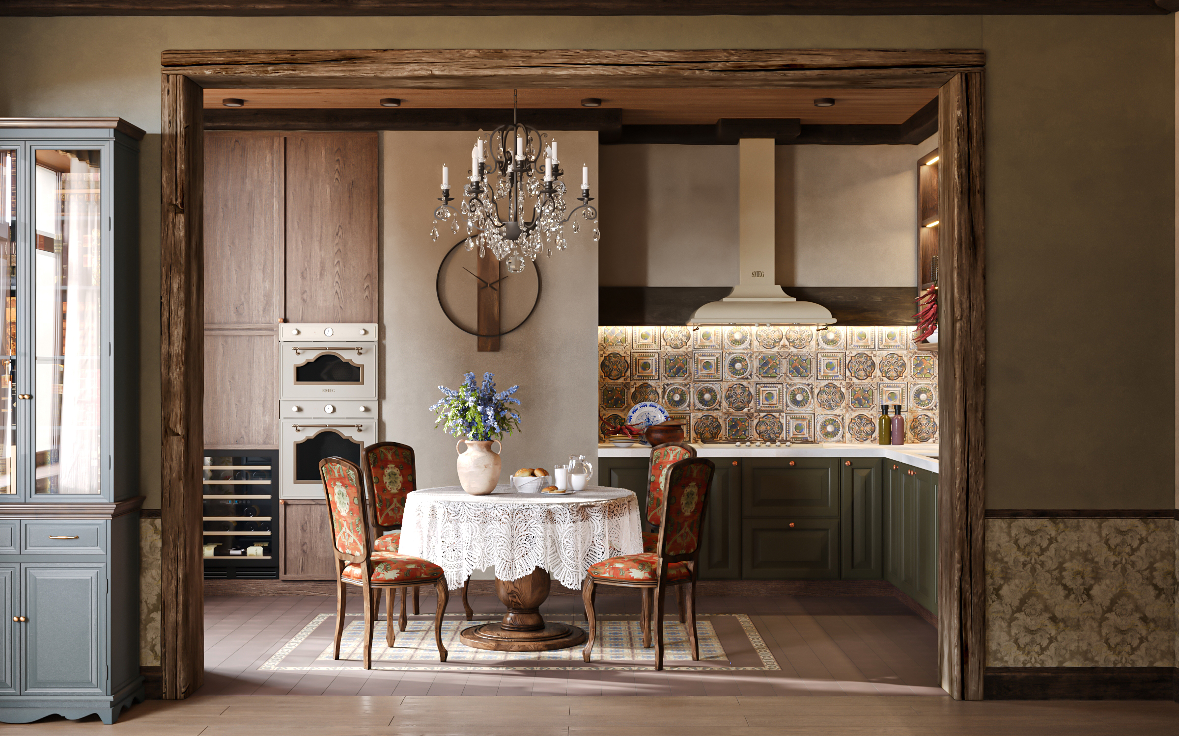 На первом этаже находится парадная часть дома. Вход через просторную прихожую ведёт в гостевую зону. Кухня и гостиная объединены в единое пространство, где предусмотрен камин, угловой диван, большой обеденный стол и современная кухня с винным шкафом и всей встроенной техникой. Здесь же расположен гостевой санузел.