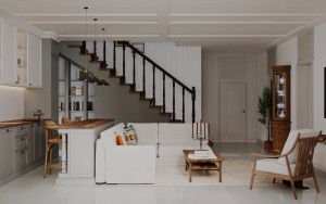Проект выполнен в светлых оттенках, с добавлением натуральных материалов для того, чтобы придать интерьеру легкость, воздушность и сохранить дух загородного дома.