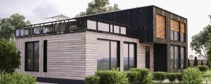 Предложенный вариант состоит из двух кубических объемов: небольшого светлого, в котором расположена приватная зона (спальни, кабинет, ванная), и двухэтажного темного, в котором находится большая кухня-гостиная и небольшой второй этаж с гостевой и детской игровой зоной, откуда есть выход на крышу. Фасады будут отделаны светлой лиственницей и специальной "жженой" доской, окна и цоколь также планируются черными. Особенность здания - декоративные решетки на окнах второго этажа из кортеновской стали с перфорацией - они уменьшат яркость солнечных лучей внутри гостиной и создадут игру светотени в минималистичном интерьере.
