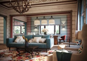 Стол выполнен из цельного слэба карагача. Стулья разные по форме, цвету и стилистике, что создает эффект старины, интерьера, собиравшегося со временем. Зона столовой дополнительно выделена тремя большими подвесными светильниками с льняными абажурами. В гостиной было решено дополнить интерьер ярким ковром с цветочным орнаментом и резной деревянной люстрой. На стенах оленьи рога соседствуют с современными бра. Самобытный, эклектичный интерьер, в котором сочетаются ручная роспись и современная европейская мебель – настоящее сердце этого семейного дома.