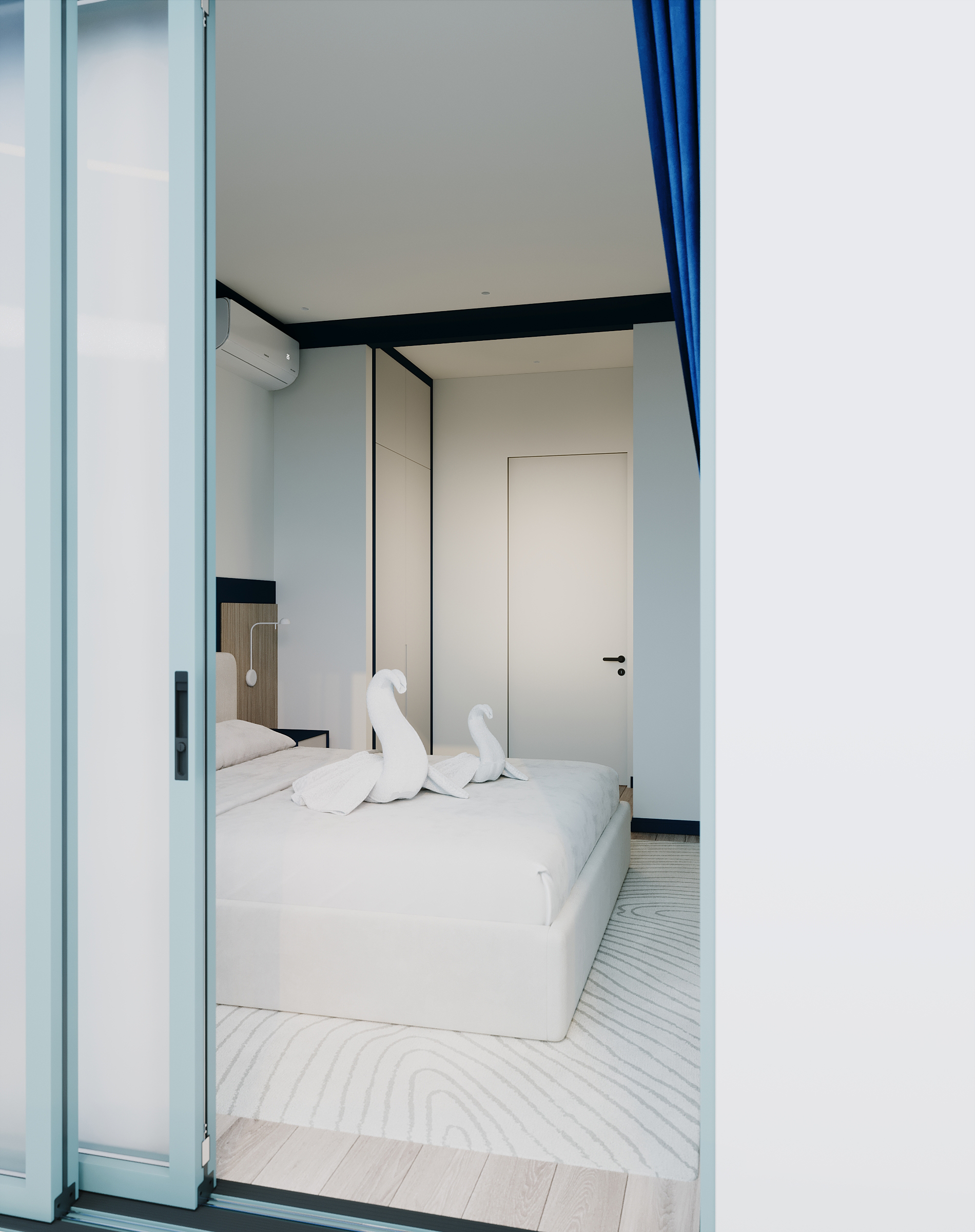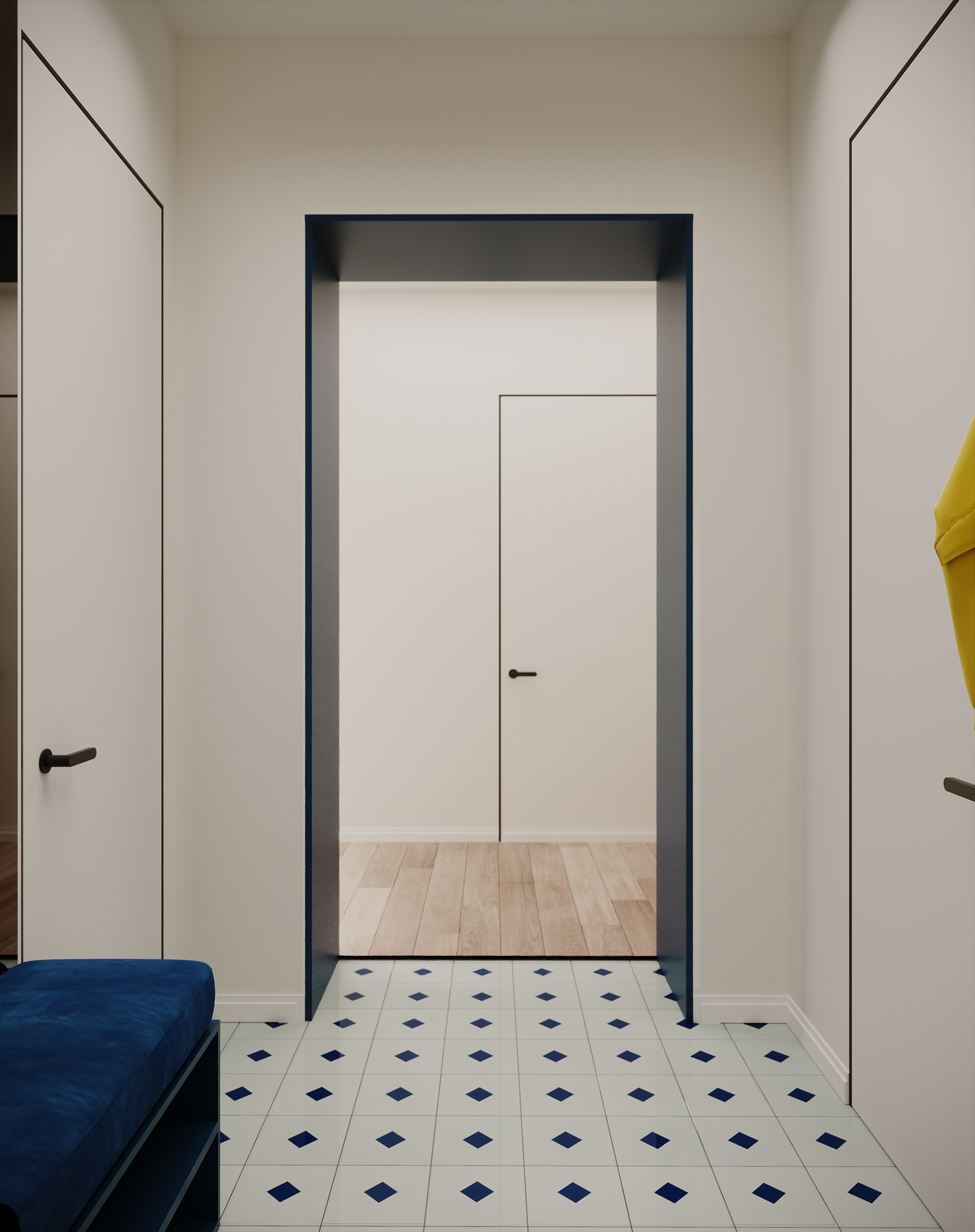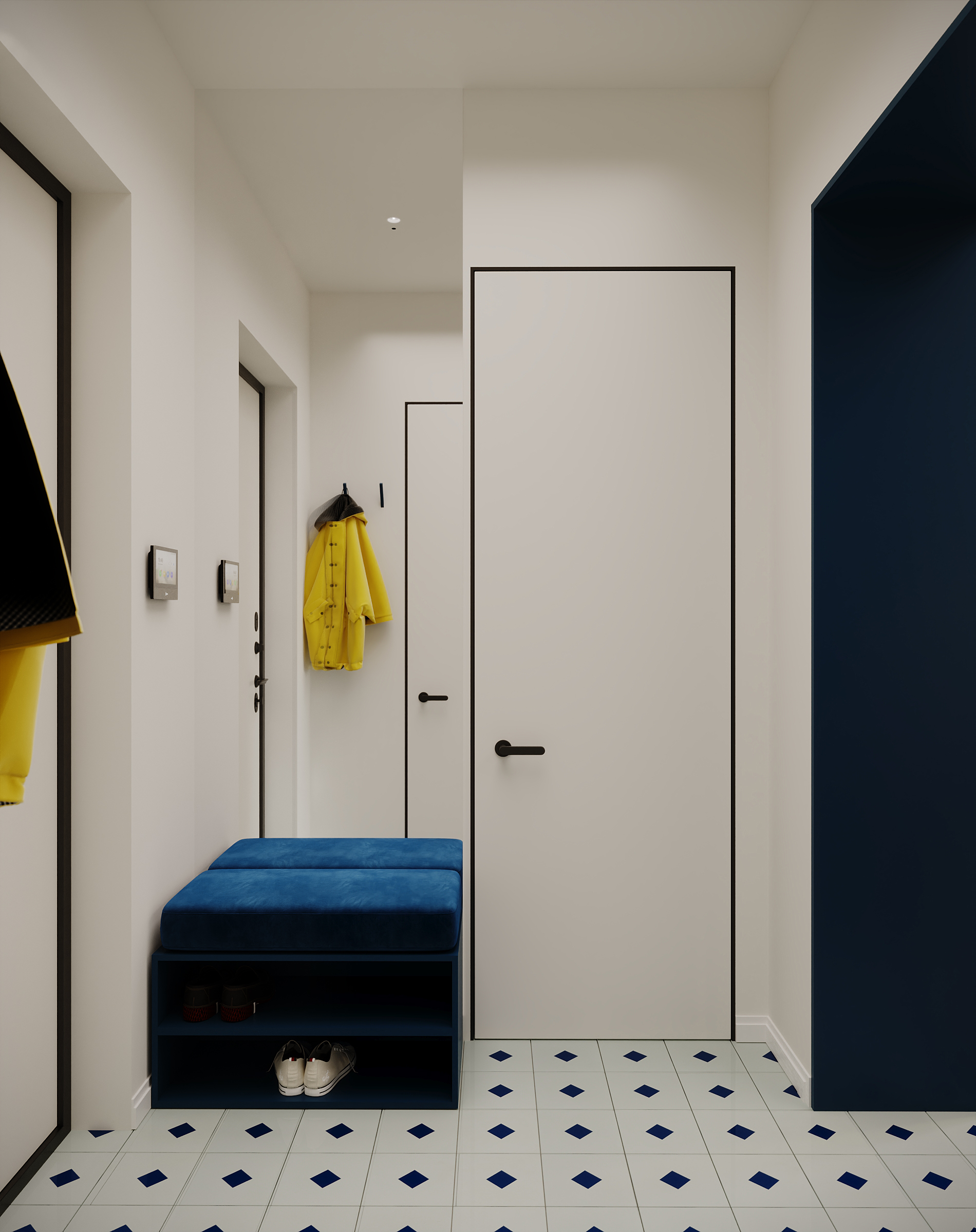 Интерьер квартиры выполнен в светлых оттенках с добавлением темного, глубокого, синего цвета.