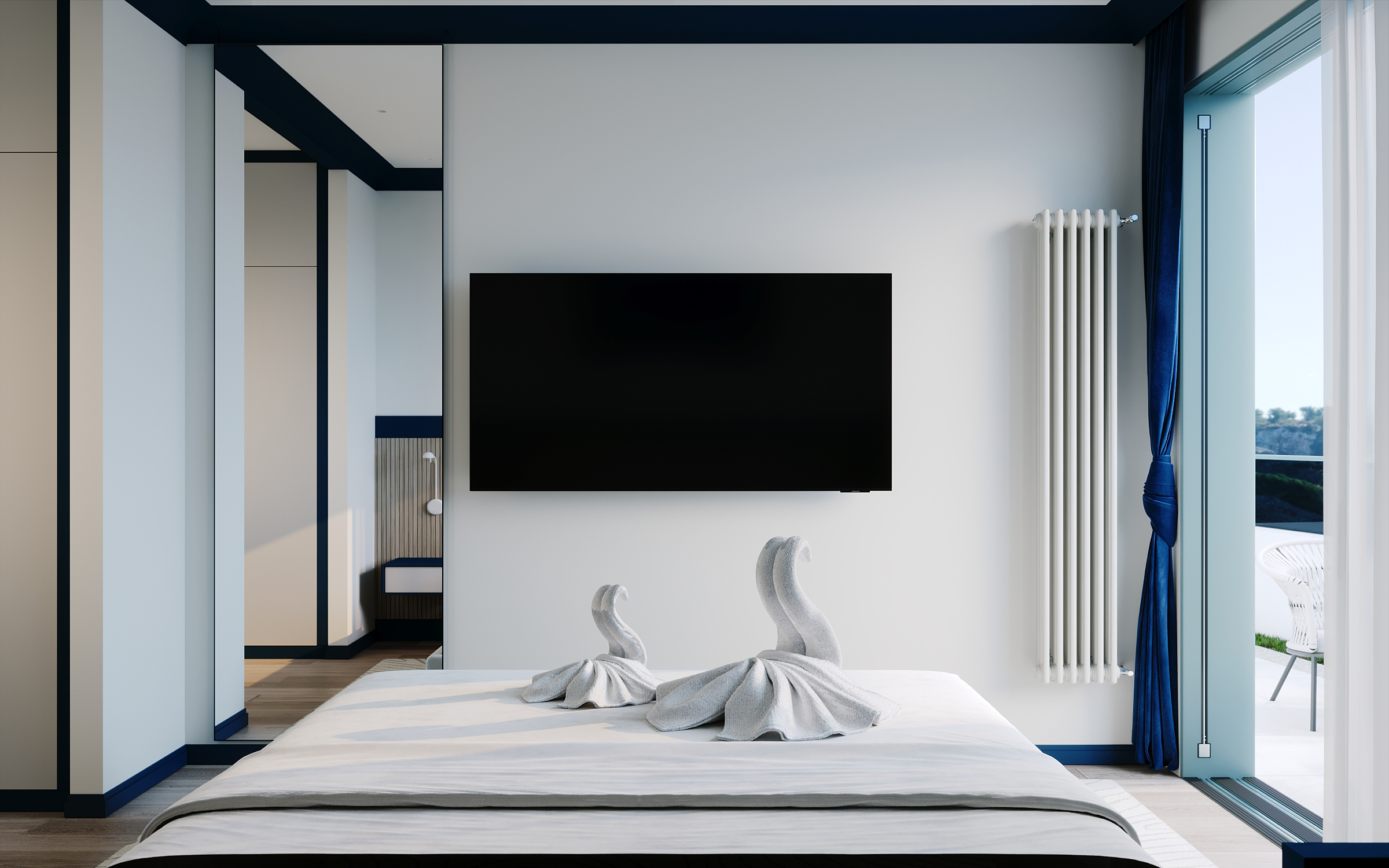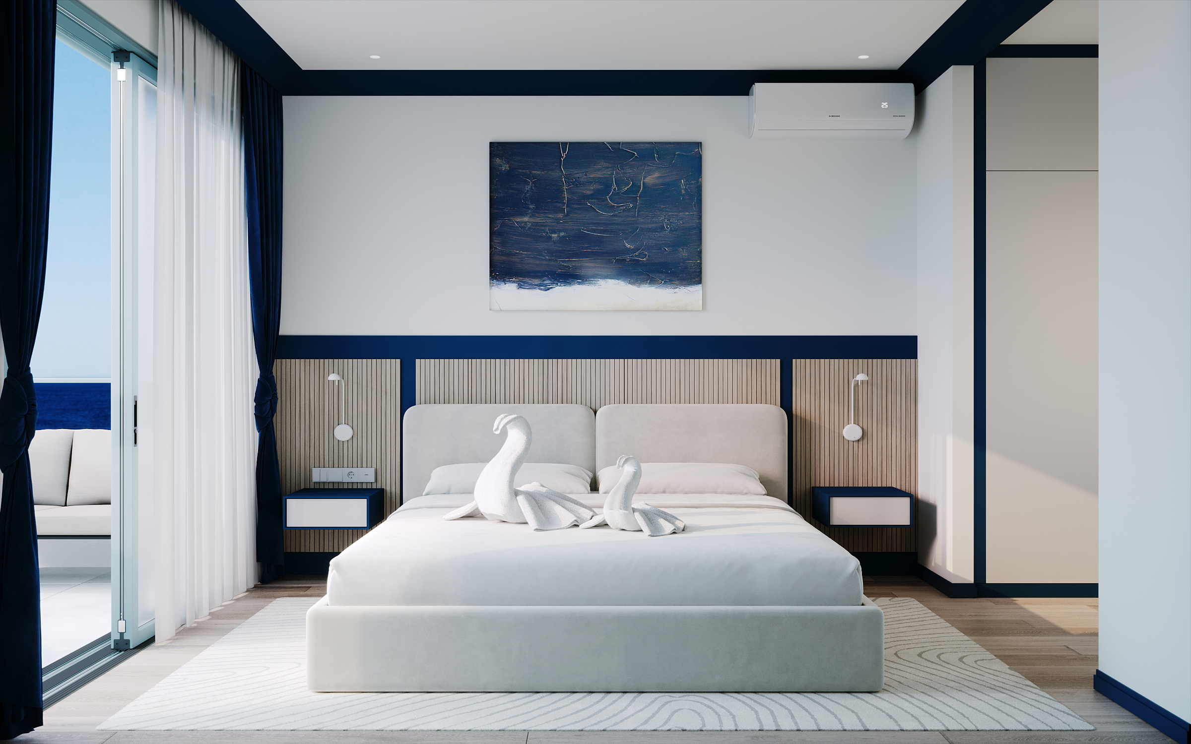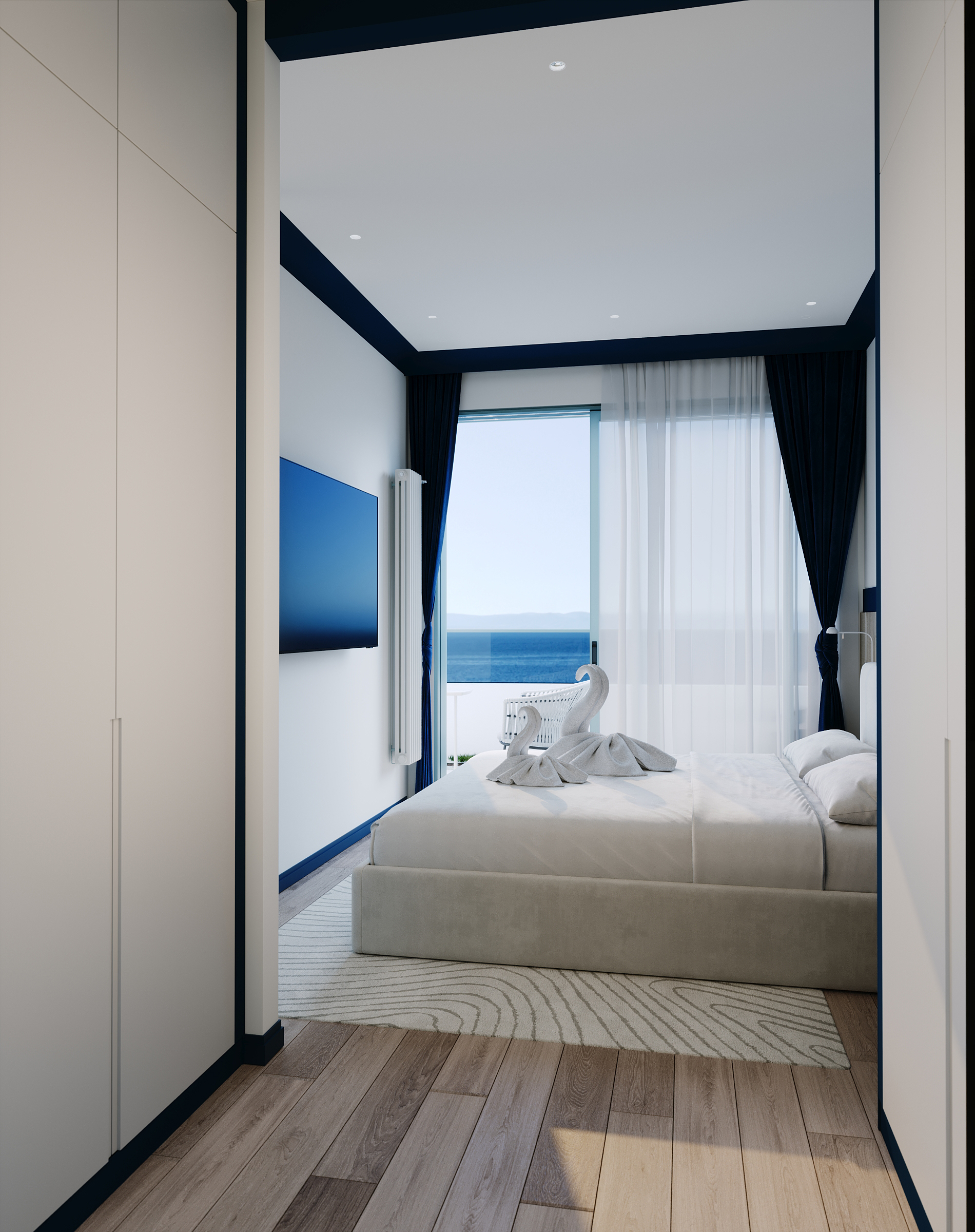 Интерьер квартиры выполнен в светлых оттенках с добавлением темного, глубокого, синего цвета.