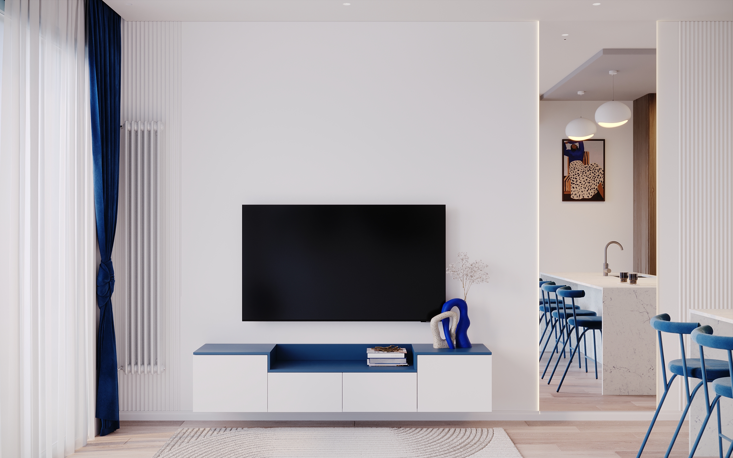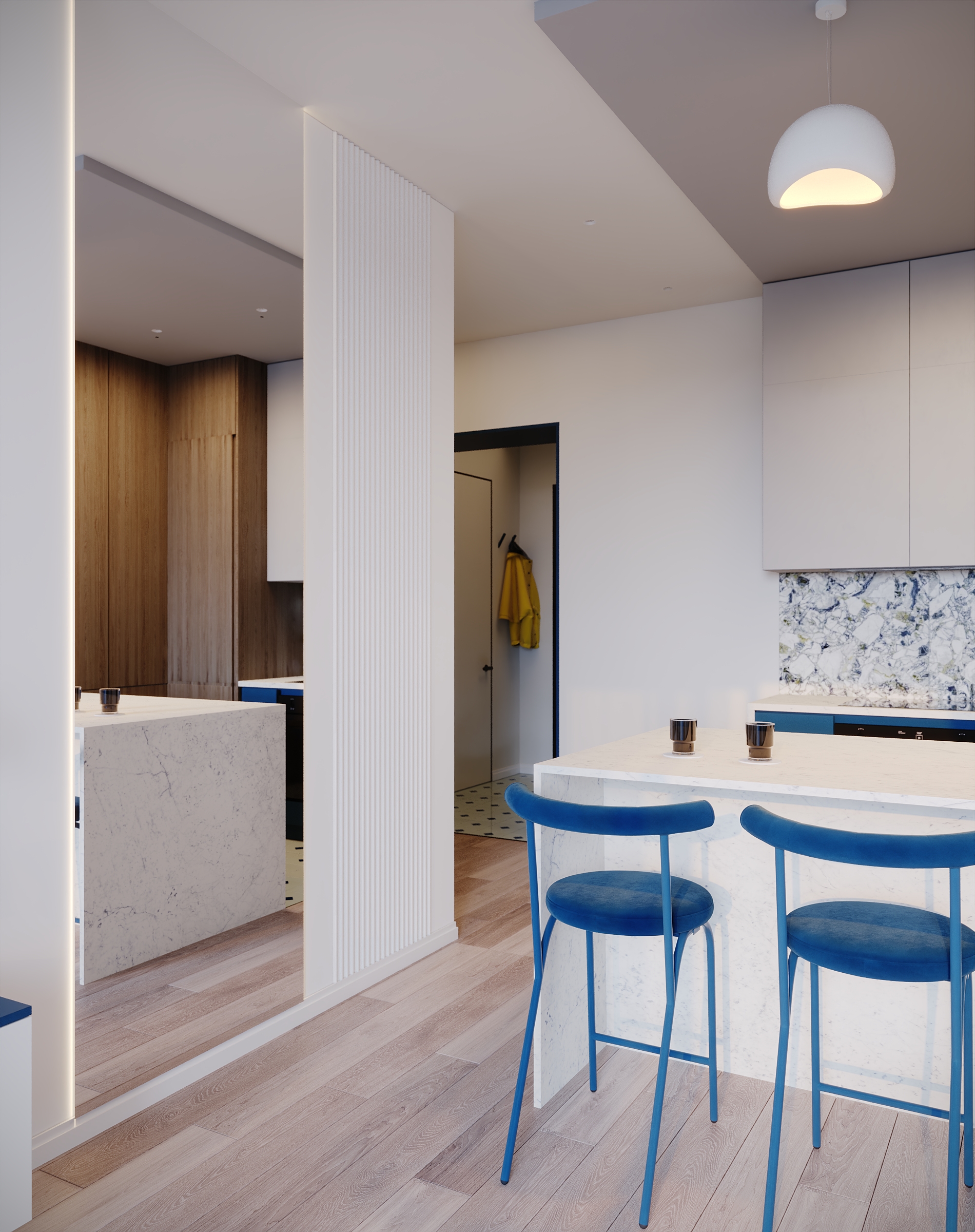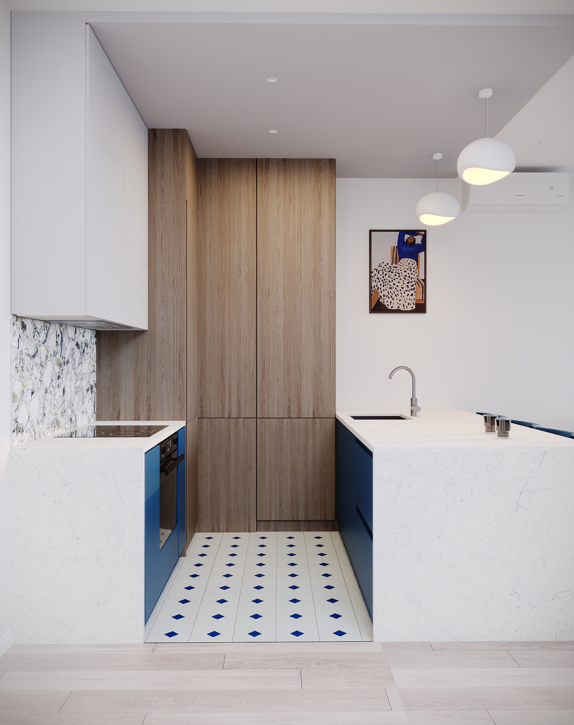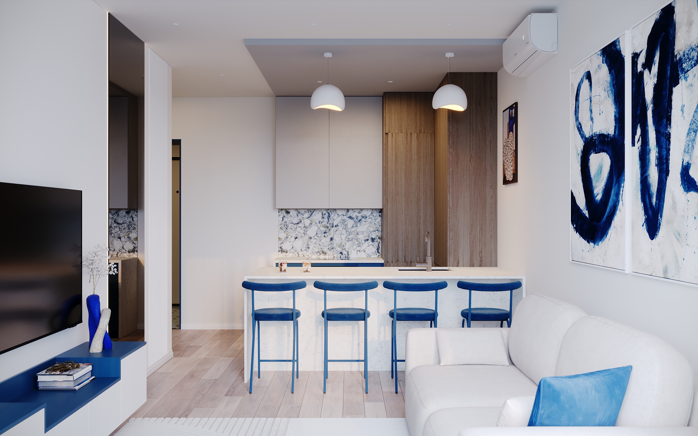 Кухня отделана шпоном светлого дерева и светлой эмалью сверху и синими фасадами снизу, что создает контраст. Светло-серый опуск потолка и мелкоформатная плитка с узором отделяет кухонную зону и зону отдыха. Барная стока и рабочая зона кухни, выполнены в светлом цвете с едва заметной текстурой камня, что отличает их от текстуры фартука, с акцентной фактурой. Центром помещения является мягкий, белый диван современной формы. Над ним расположились пано с современным сюжетом и яркими деталями. Напротив дивана, тумба под ТВ, сочетающая в себе два цвета: темно-синий и белый. Объединяет зоны отдыха, светлый ковер с геометричным рисунком. Так же, интерьер дополняет зеркало в полный рост обрамленное теплой подсветкой. Полубарные синие стулья, разбавляют светлые тона помещения.