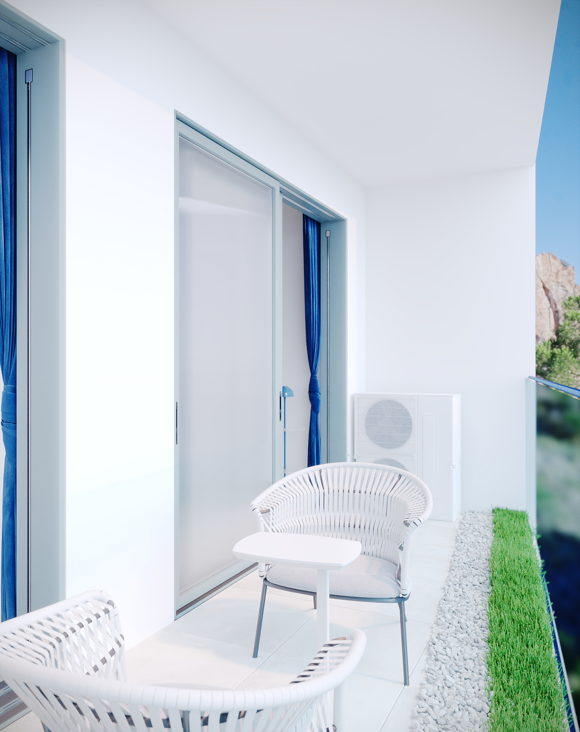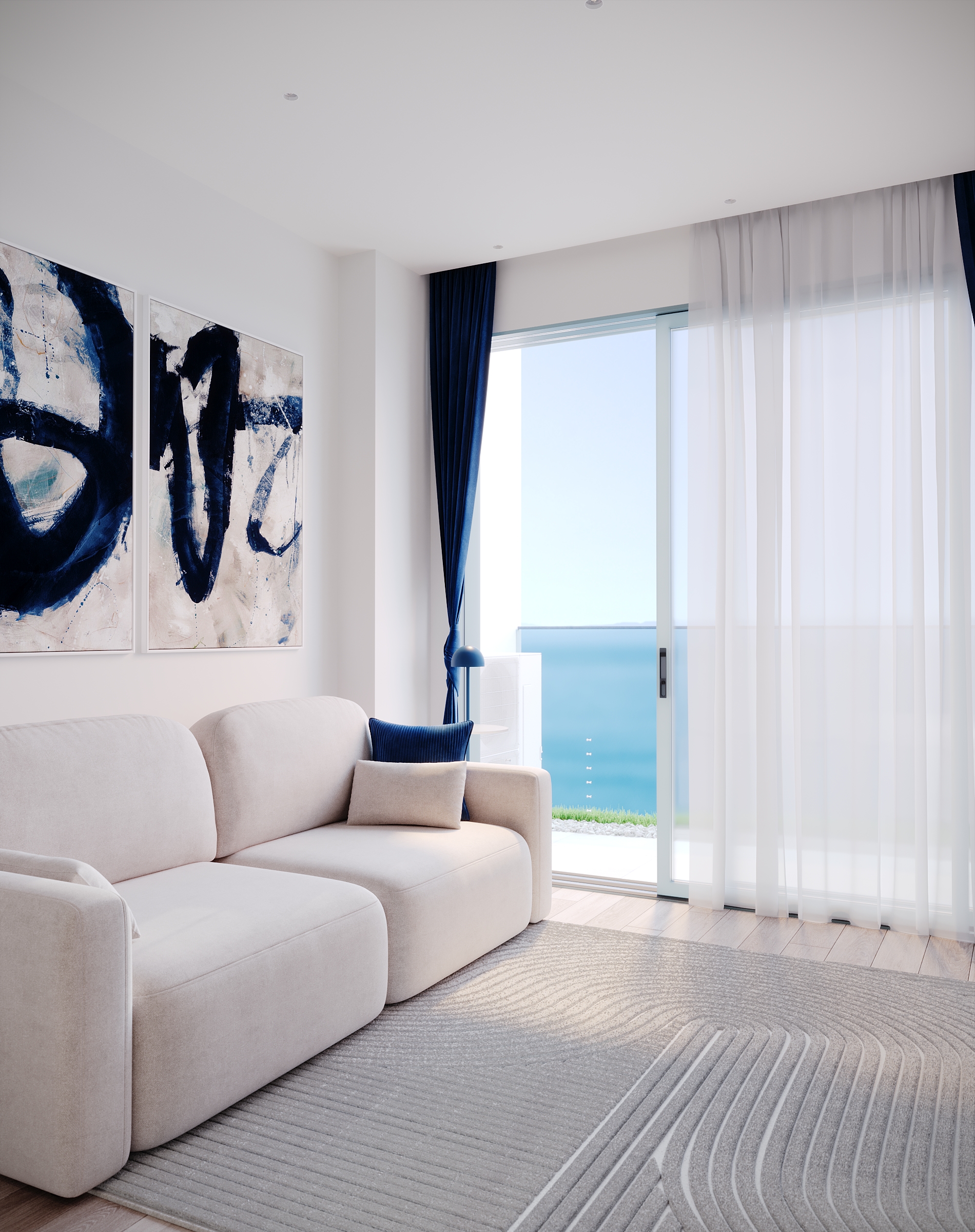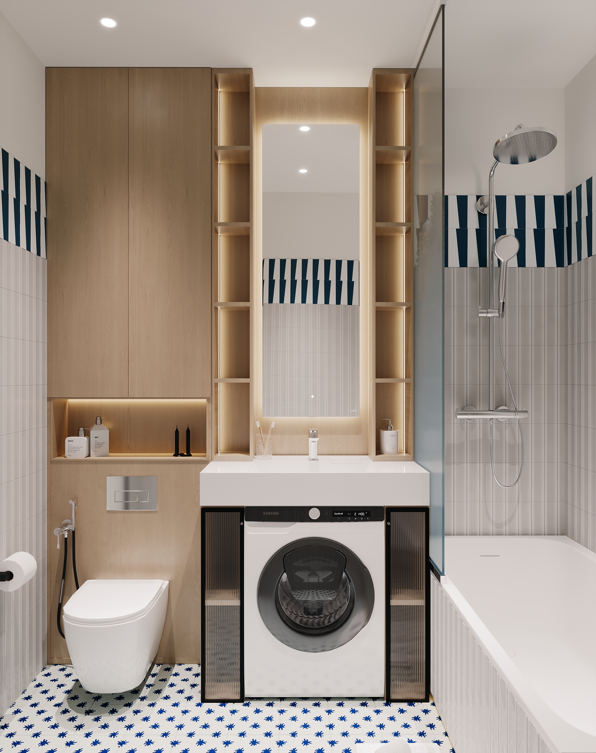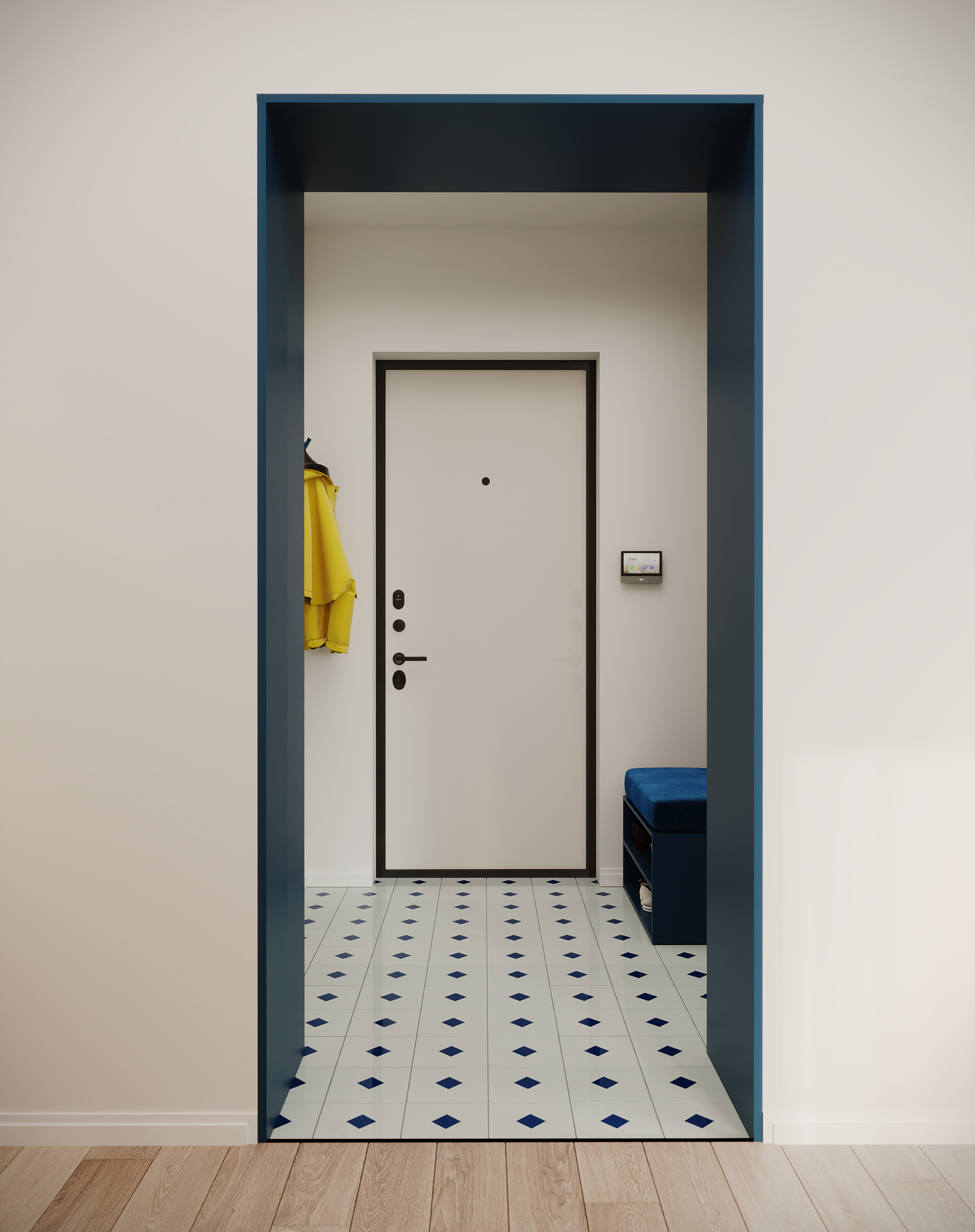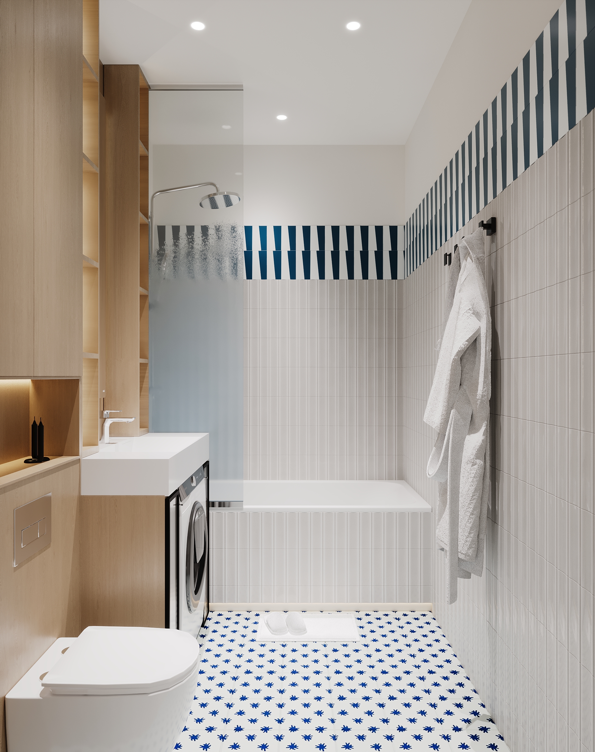 Кухня отделана шпоном светлого дерева и светлой эмалью сверху и синими фасадами снизу, что создает контраст. Светло-серый опуск потолка и мелкоформатная плитка с узором отделяет кухонную зону и зону отдыха. Барная стока и рабочая зона кухни, выполнены в светлом цвете с едва заметной текстурой камня, что отличает их от текстуры фартука, с акцентной фактурой. Центром помещения является мягкий, белый диван современной формы. Над ним расположились пано с современным сюжетом и яркими деталями. Напротив дивана, тумба под ТВ, сочетающая в себе два цвета: темно-синий и белый. Объединяет зоны отдыха, светлый ковер с геометричным рисунком. Так же, интерьер дополняет зеркало в полный рост обрамленное теплой подсветкой. Полубарные синие стулья, разбавляют светлые тона помещения.