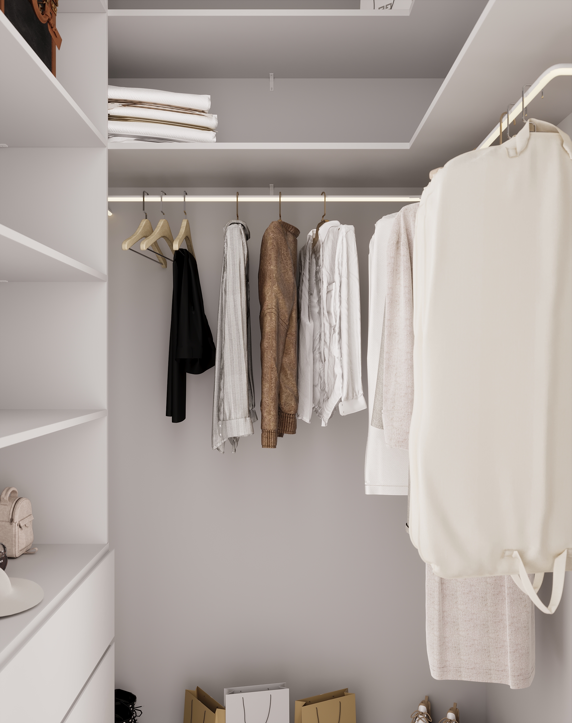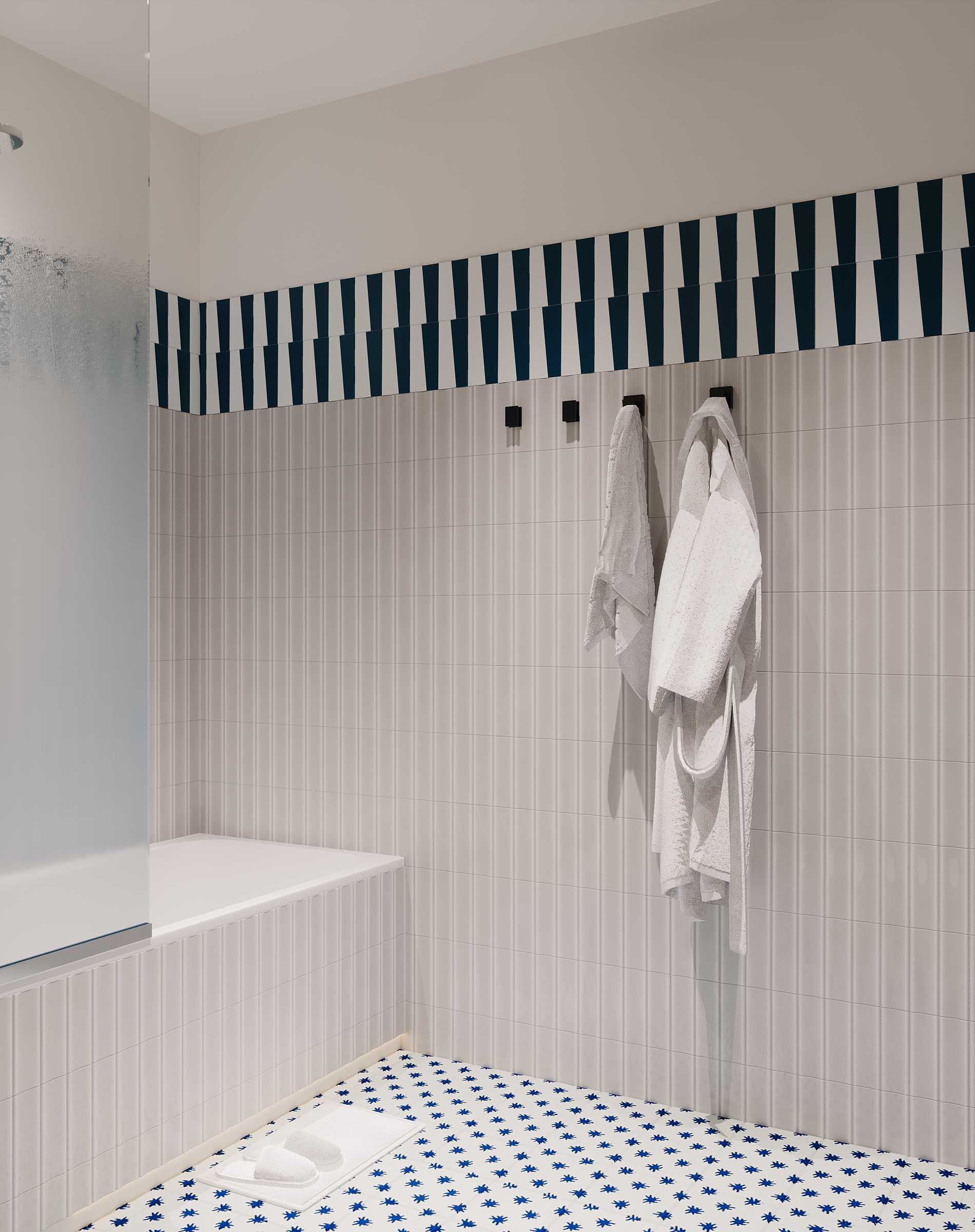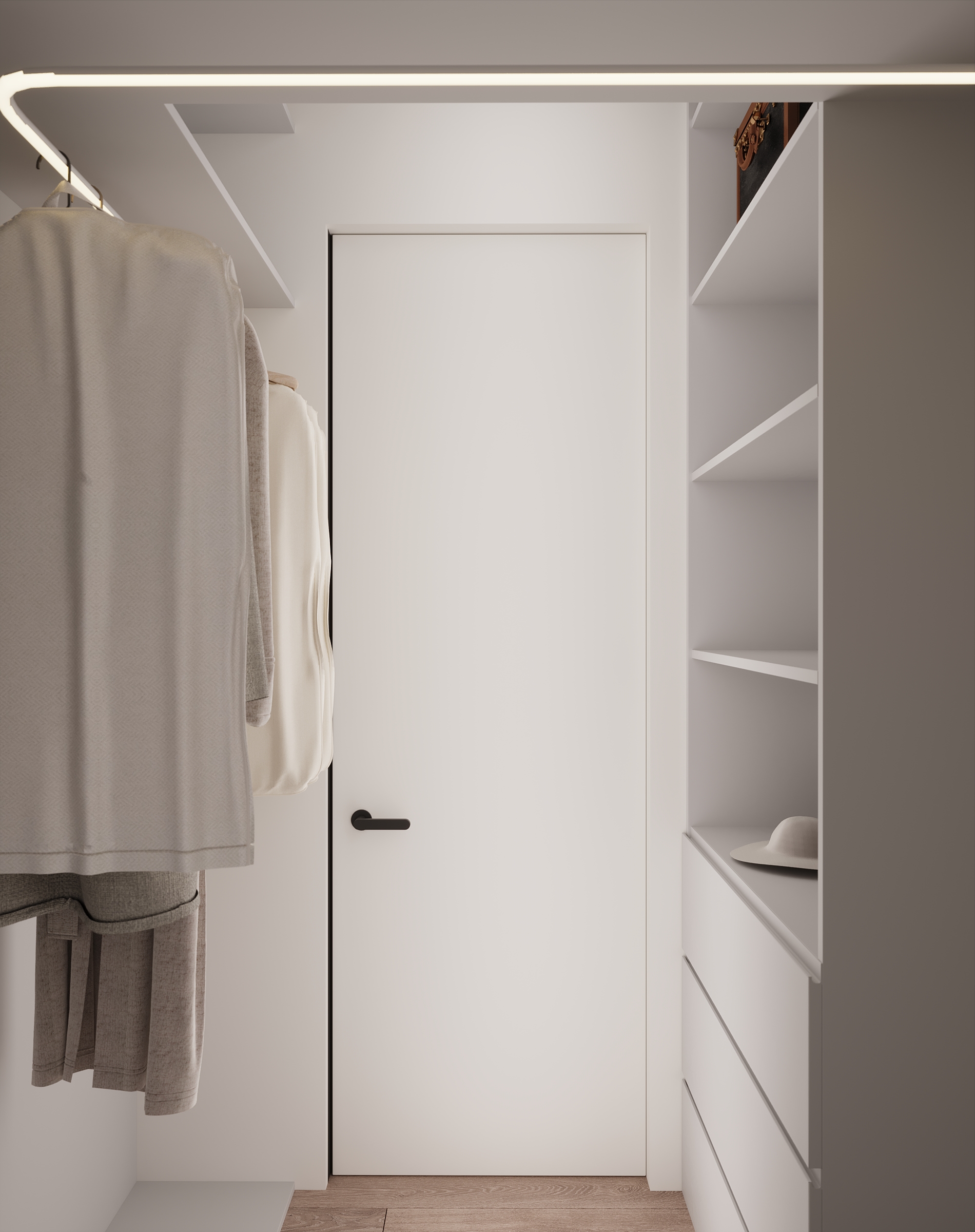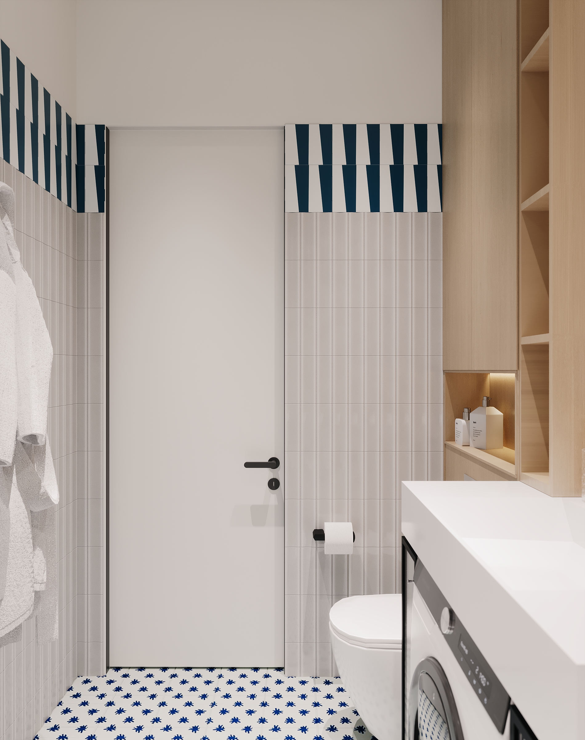 Пространство в современном стиле, сочетает в себе различные текстуры плитки и дерева. Освещение позволяет создавать различные сценарии как для комфортной работы, так и для интимной обстановки с приглушенным светом. В отделке сочетается матовая покраска, рифленые панели, накладные плинтуса, фурнитура под хром. Пол выложен кварц-виниловой плиткой с текстурой дерева.