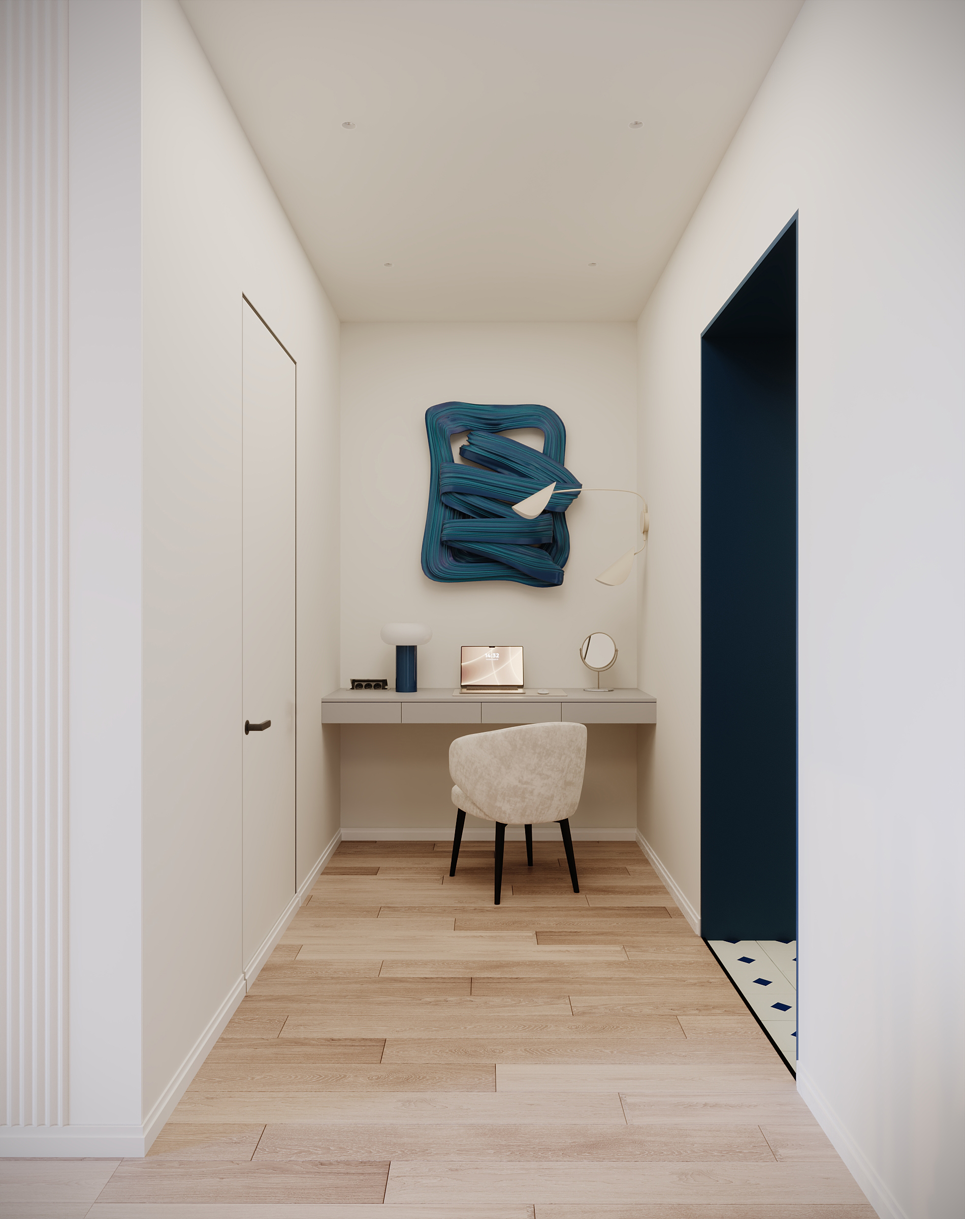 Рабочая зона выполнена в светлом оттенке, встречающемся в цветовой гамме всего интерьера. Ярким акцентом данной зоны, является арт-объект в голубом цвете над рабочем столом. Минималистичный рабочий стол, оснащен двумя выдвижными ящиками. Над столом так же расположилась бра, для обеспечения комфортными условиями для работы. Дополняет данную зону удобное кресло, в светлом велюре. Минуя рабочую зону, мы попадаем в зону кухни и отдыха.