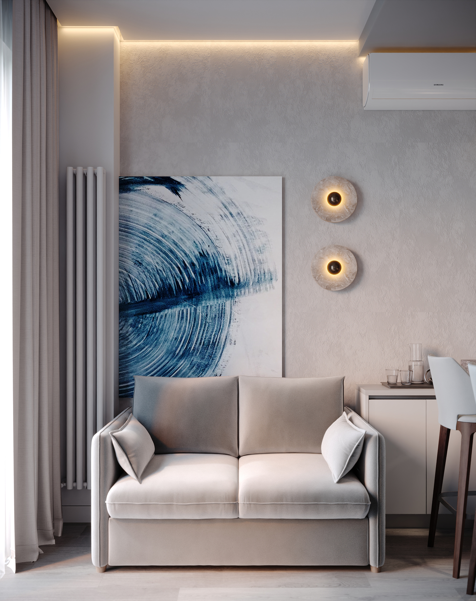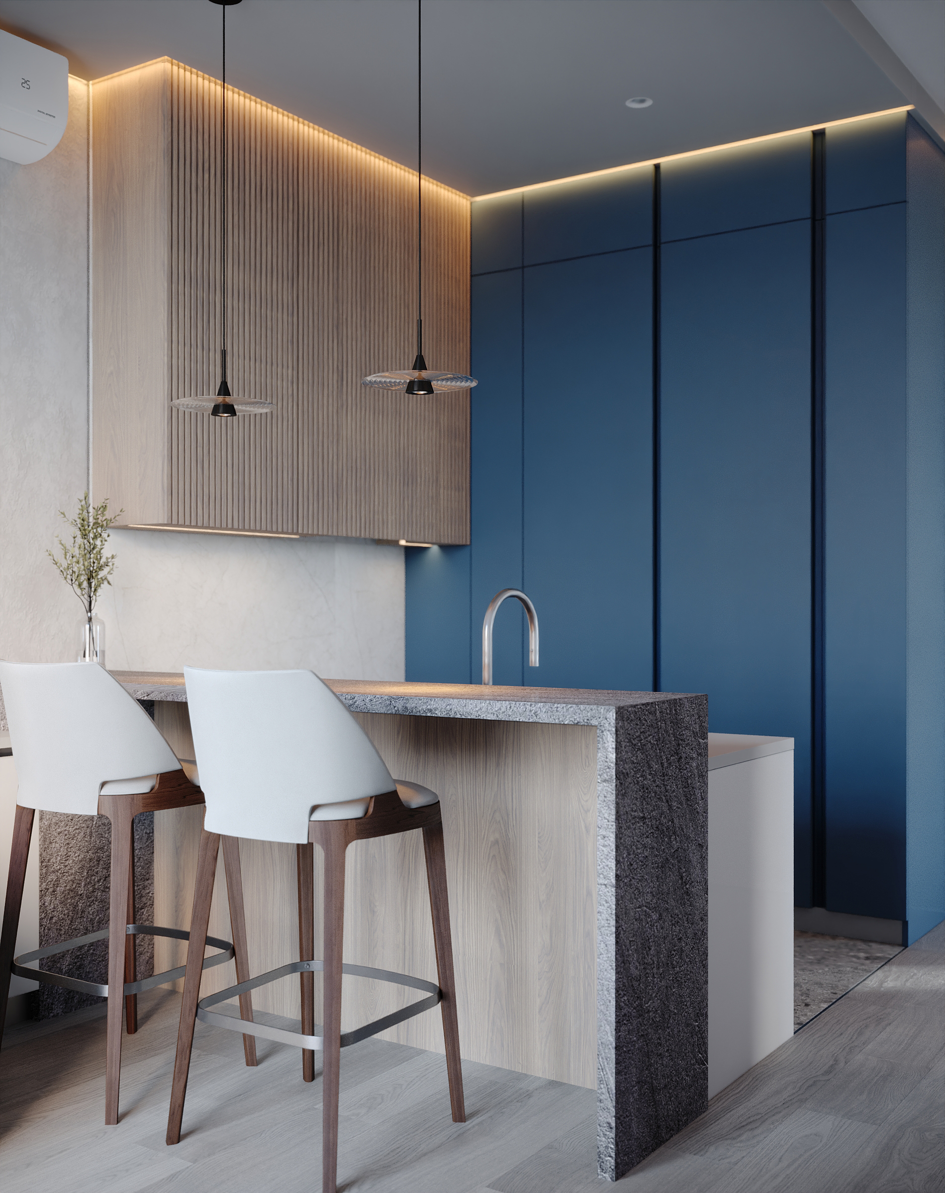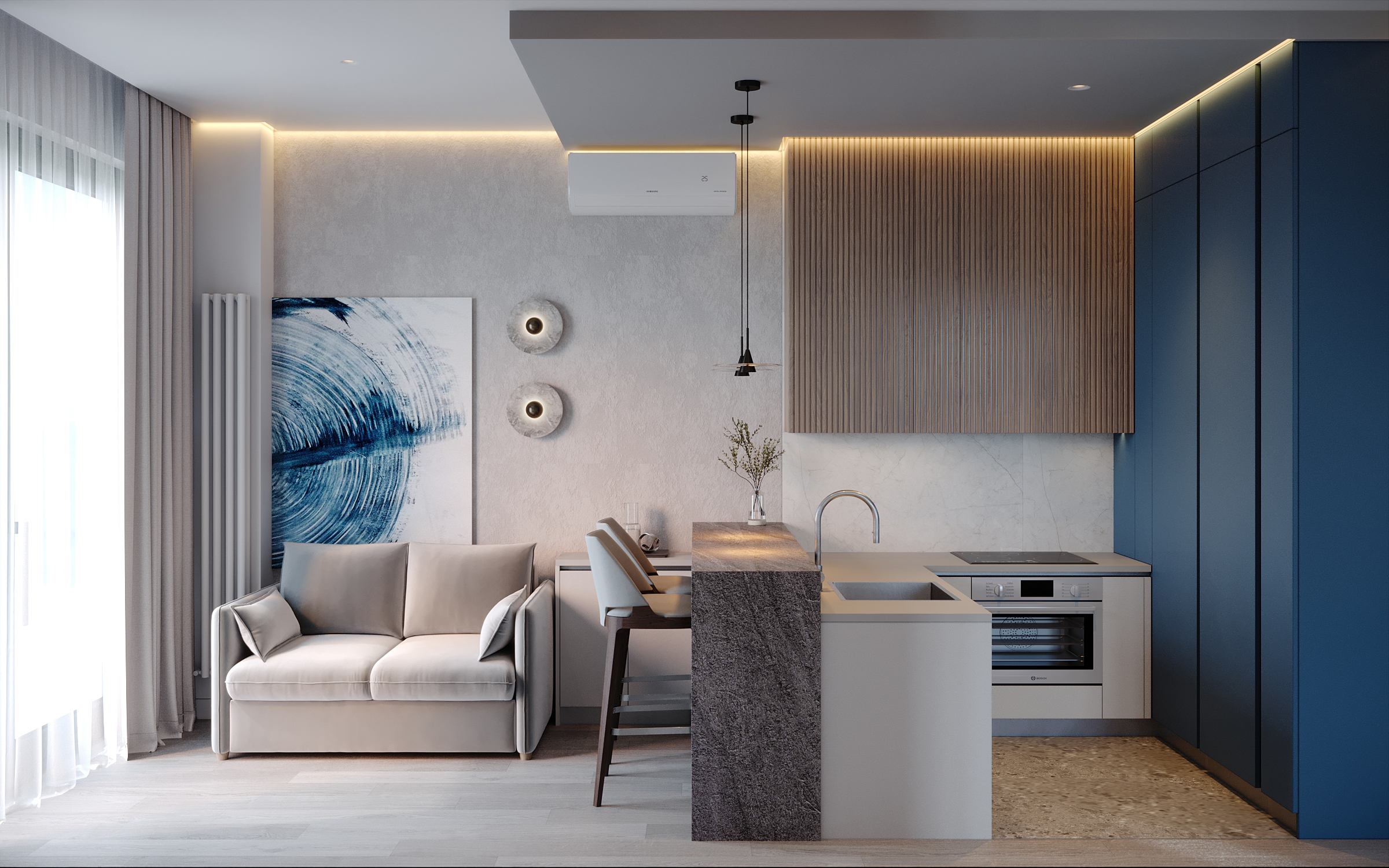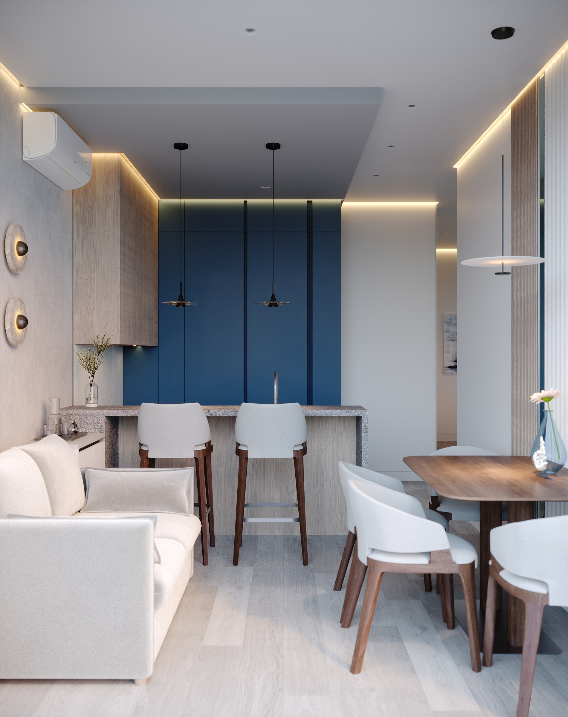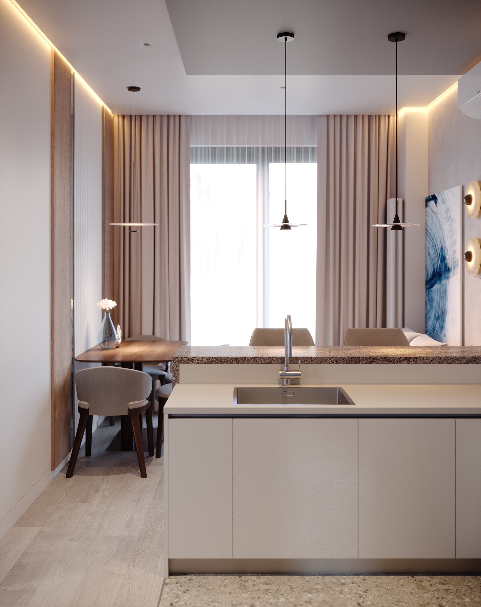 Современное, продуманное и функциональное кухонное пространство с открытой планировкой выполнено в стиле современного минимализма с нотками скандинавского влияния. Используются светлые тона и натуральные материалы: светлая мебель, каменная столешница, шпонированные фасады, легкая штукатурка на стенах. Цветовая гамма преимущественно нейтральная, с использованием оттенков светло-серого, бежевого и белого, дополненных вкраплениями глубокого синего. Освещение мягкое, с акцентами на стенах в виде круглых настенных бра с текстурированной поверхностью. Освещение, встроенное и скрытое, отбрасывает мягкий, равномерный свет на матовые поверхности, создавая спокойную атмосферу, идеально подходящую для приема пищи или отдыха. У окна располагается небольшой велюровый диван плавной и простой формы. Стена за диваном украшена абстрактной картиной с сине-белыми оттенками. Зона готовки выделяется из общего объема опуском потолка и плиткой под тераццо. Здесь сочетаются светло-серые, шпонированные рифленые и тёмно-синие шкафы от пола до потолка, создающие стильный контраст и чёткие визуальные линии. Обеденная зона — это точка сдержанной элегантности. Обеденный стол из дерева теплых оттенков окружают стулья с плавно изогнутыми спинками и тонкими ножками из темного дерева. Аналогичные барные стулья располагаются у кухонного острова. Вертикальные деревянные панели, насыщенные по цвету и излучающие природное тепло, обрамляют стол, что создает визуальный ритм между органической текстурой дерева, зеркальными поверхностями и чистыми светлыми линиями. Над столом располагается минималистичный плоский подвесной светильник.
