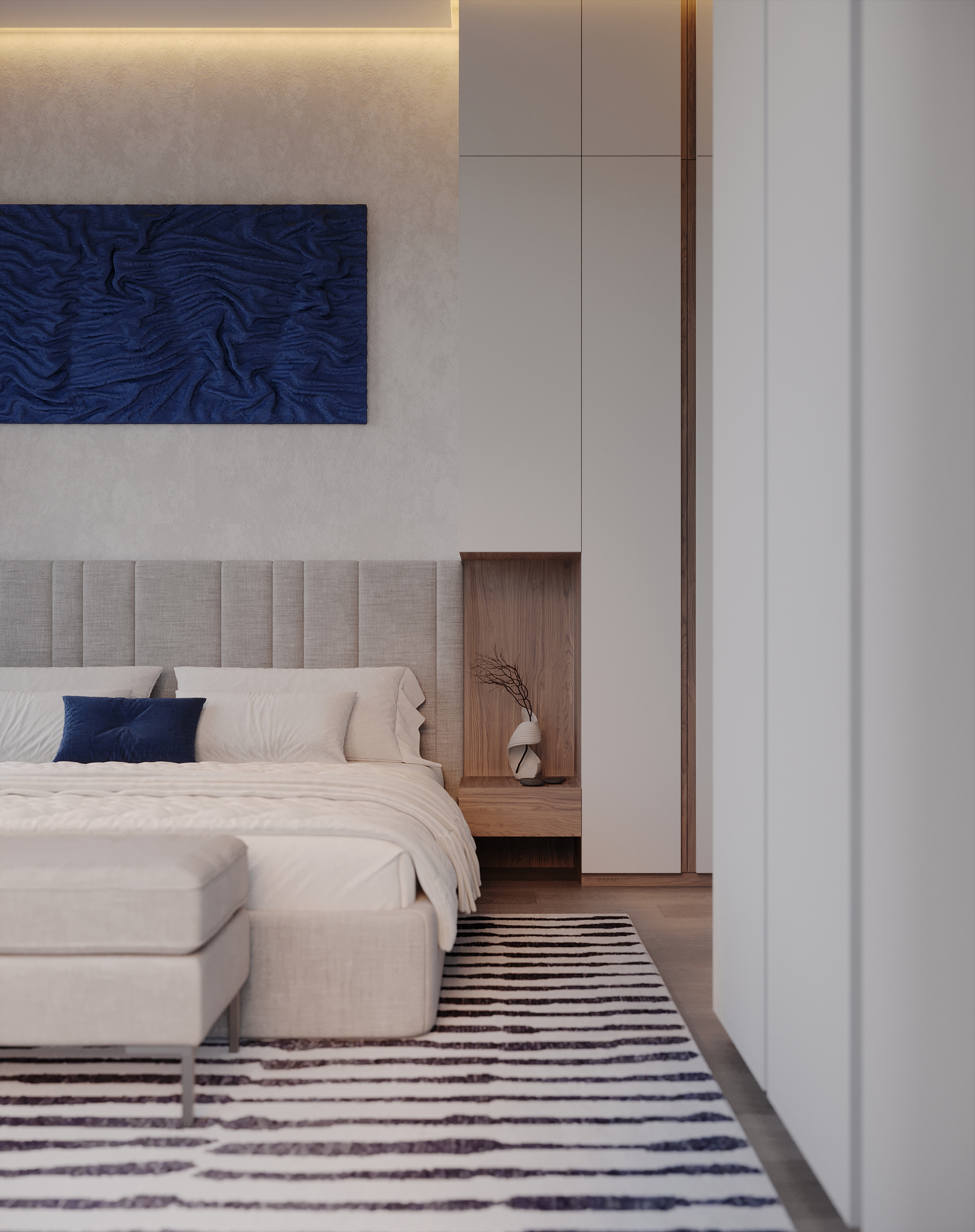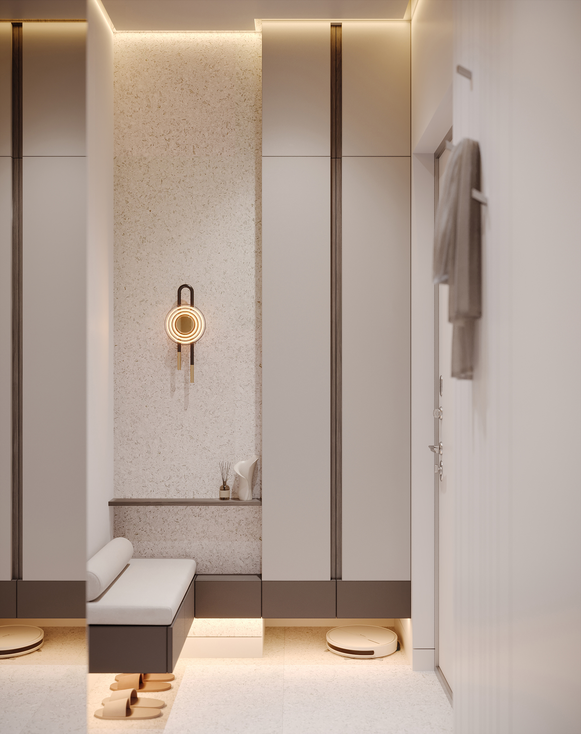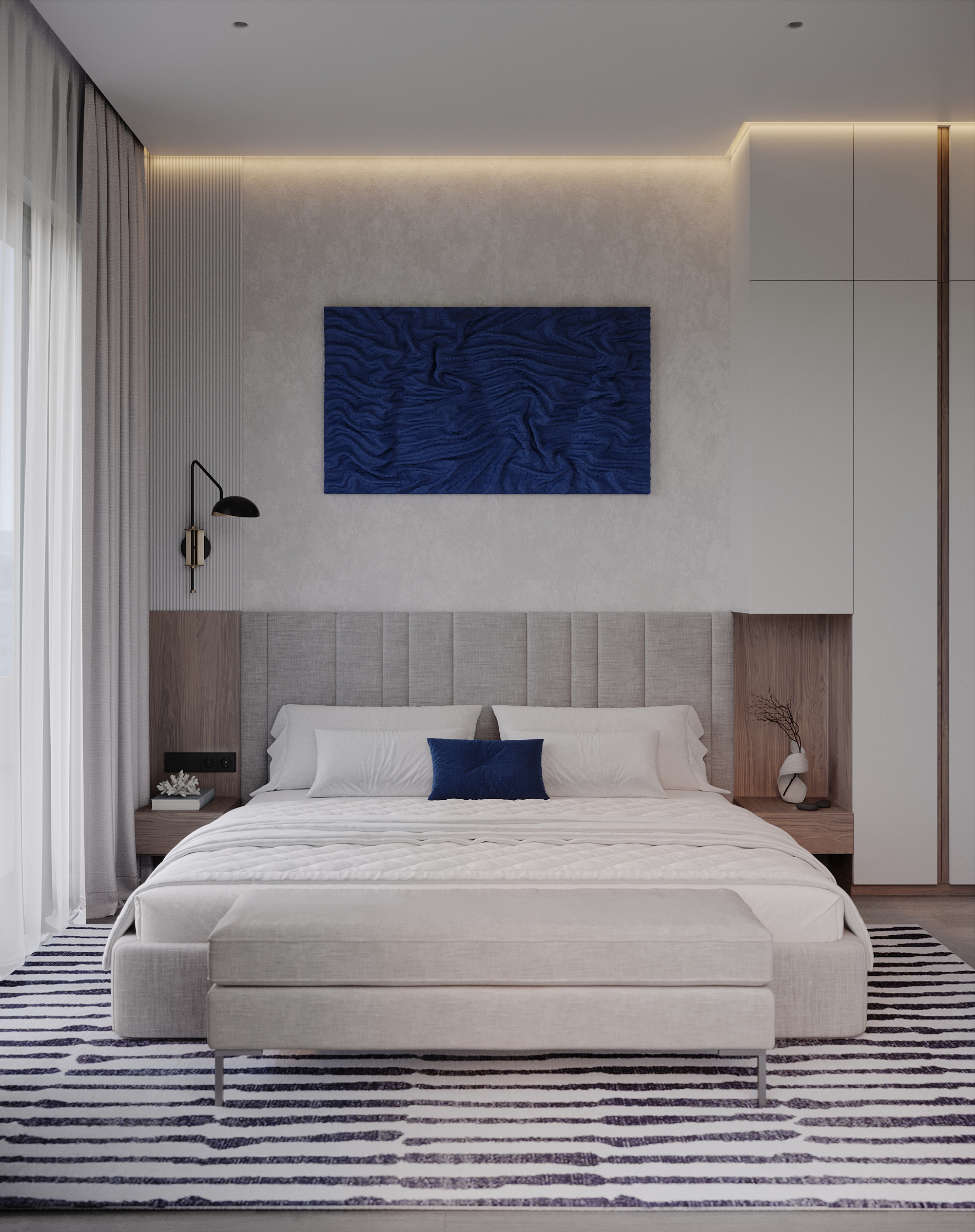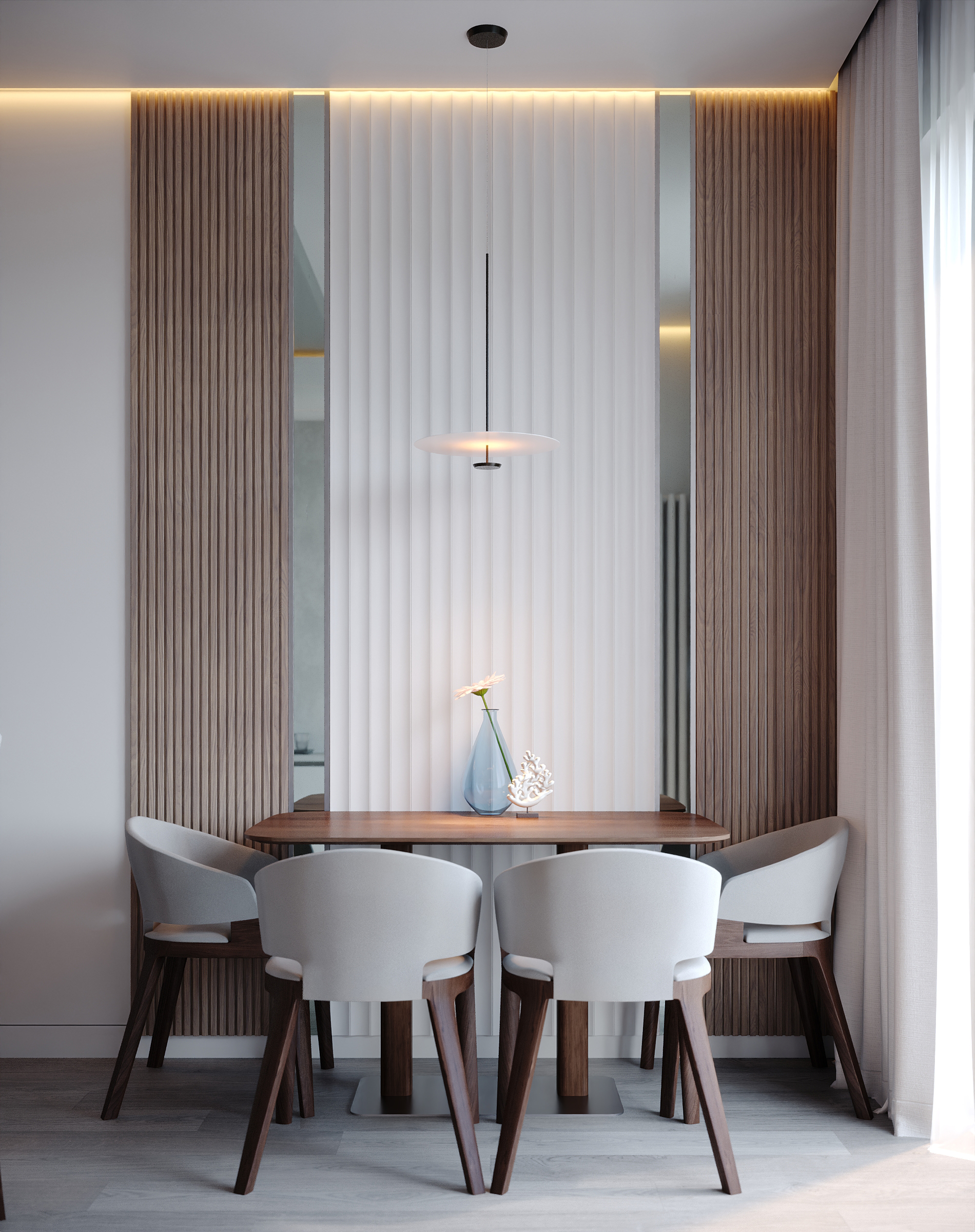Современное, продуманное и функциональное кухонное пространство с открытой планировкой выполнено в стиле современного минимализма с нотками скандинавского влияния. Используются светлые тона и натуральные материалы: светлая мебель, каменная столешница, шпонированные фасады, легкая штукатурка на стенах. Цветовая гамма преимущественно нейтральная, с использованием оттенков светло-серого, бежевого и белого, дополненных вкраплениями глубокого синего. Освещение мягкое, с акцентами на стенах в виде круглых настенных бра с текстурированной поверхностью. Освещение, встроенное и скрытое, отбрасывает мягкий, равномерный свет на матовые поверхности, создавая спокойную атмосферу, идеально подходящую для приема пищи или отдыха. У окна располагается небольшой велюровый диван плавной и простой формы. Стена за диваном украшена абстрактной картиной с сине-белыми оттенками. Зона готовки выделяется из общего объема опуском потолка и плиткой под тераццо. Здесь сочетаются светло-серые, шпонированные рифленые и тёмно-синие шкафы от пола до потолка, создающие стильный контраст и чёткие визуальные линии. Обеденная зона — это точка сдержанной элегантности. Обеденный стол из дерева теплых оттенков окружают стулья с плавно изогнутыми спинками и тонкими ножками из темного дерева. Аналогичные барные стулья располагаются у кухонного острова. Вертикальные деревянные панели, насыщенные по цвету и излучающие природное тепло, обрамляют стол, что создает визуальный ритм между органической текстурой дерева, зеркальными поверхностями и чистыми светлыми линиями. Над столом располагается минималистичный плоский подвесной светильник.