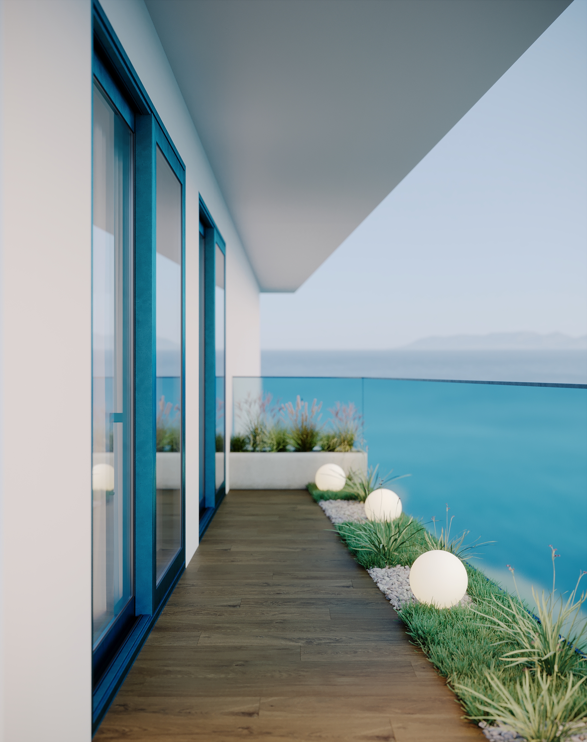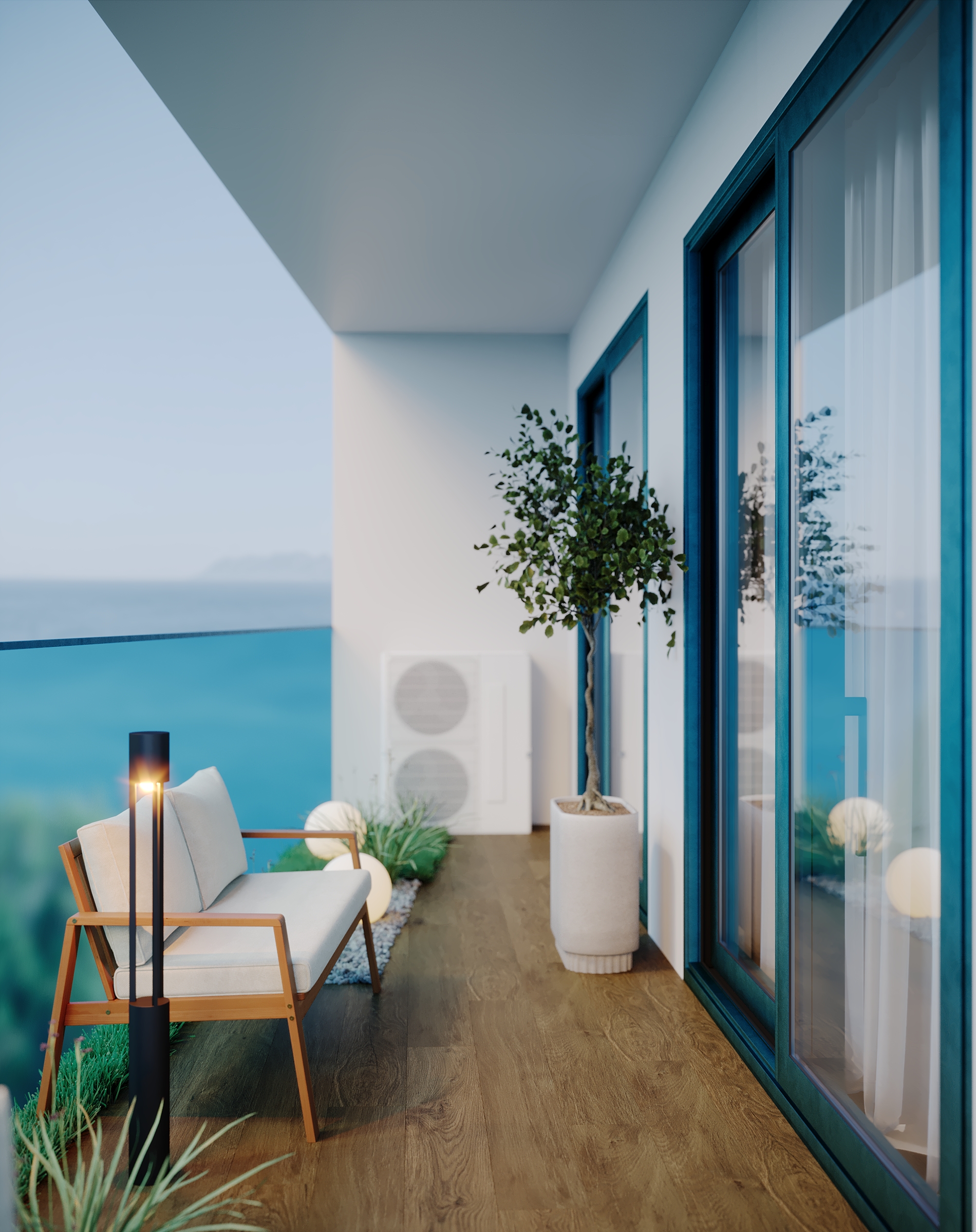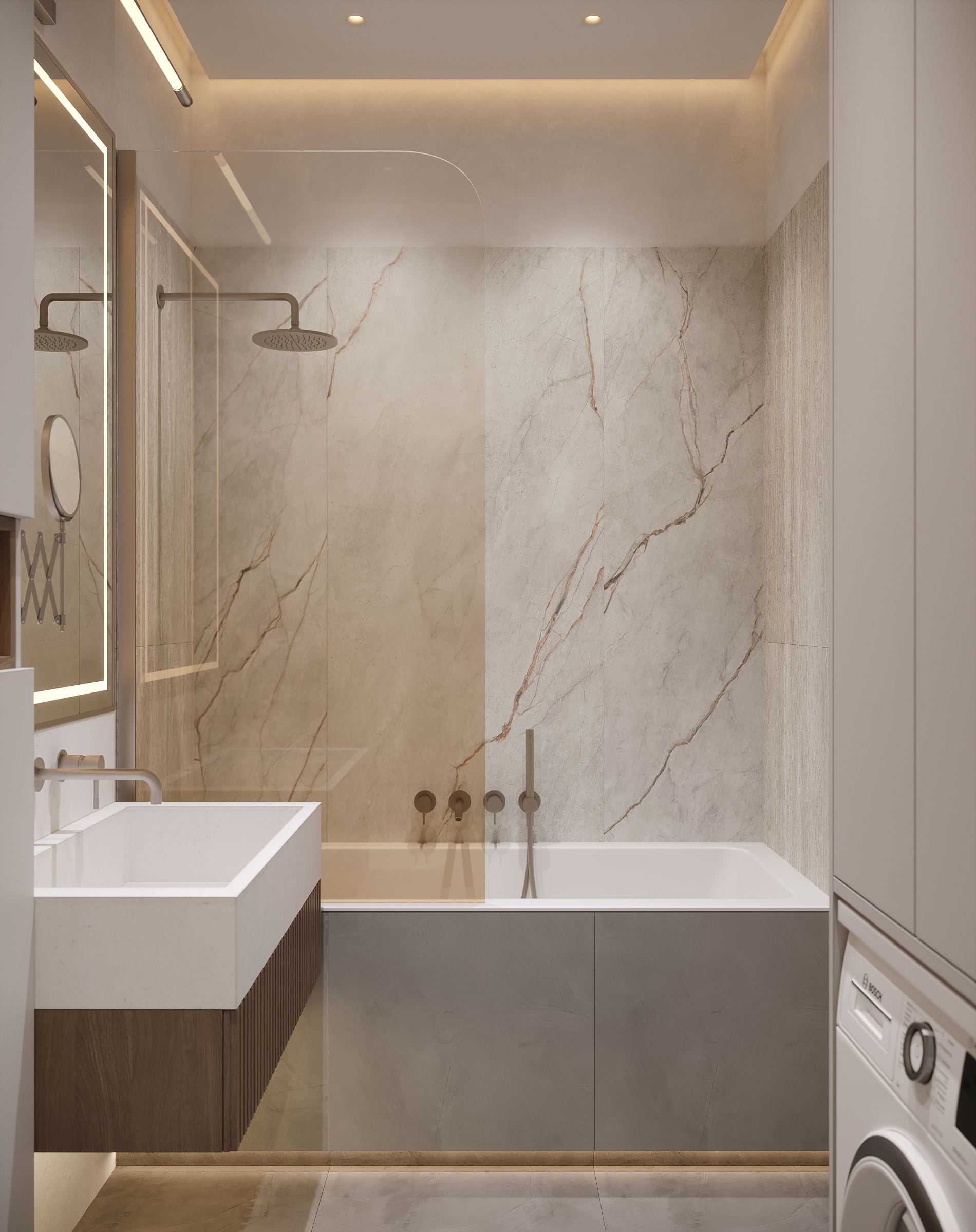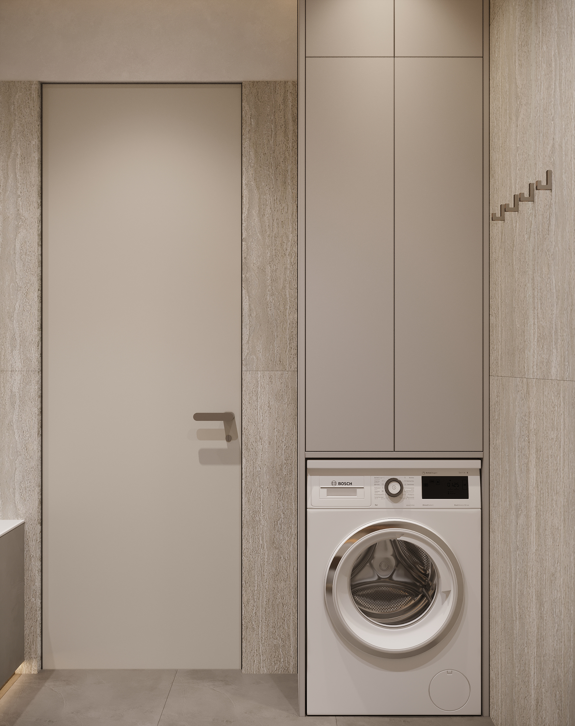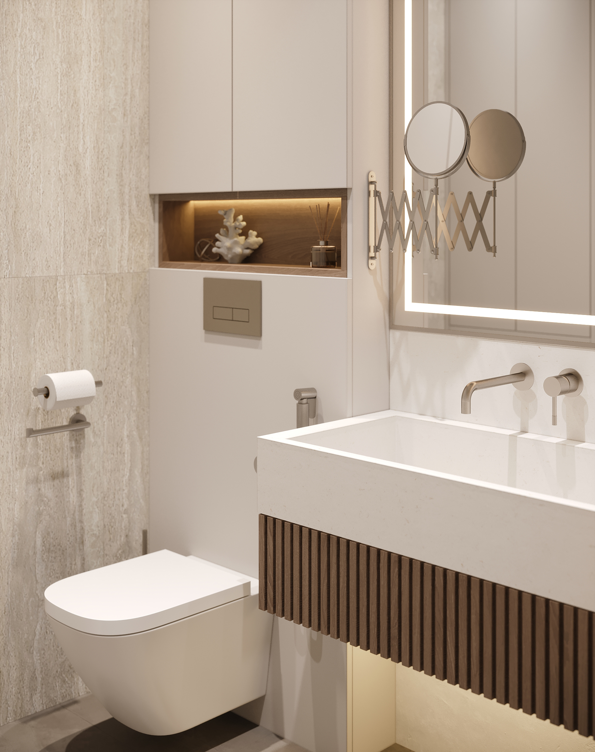 Современное, продуманное и функциональное кухонное пространство с открытой планировкой выполнено в стиле современного минимализма с нотками скандинавского влияния. Используются светлые тона и натуральные материалы: светлая мебель, каменная столешница, шпонированные фасады, легкая штукатурка на стенах. Цветовая гамма преимущественно нейтральная, с использованием оттенков светло-серого, бежевого и белого, дополненных вкраплениями глубокого синего. Освещение мягкое, с акцентами на стенах в виде круглых настенных бра с текстурированной поверхностью. Освещение, встроенное и скрытое, отбрасывает мягкий, равномерный свет на матовые поверхности, создавая спокойную атмосферу, идеально подходящую для приема пищи или отдыха. У окна располагается небольшой велюровый диван плавной и простой формы. Стена за диваном украшена абстрактной картиной с сине-белыми оттенками. Зона готовки выделяется из общего объема опуском потолка и плиткой под тераццо. Здесь сочетаются светло-серые, шпонированные рифленые и тёмно-синие шкафы от пола до потолка, создающие стильный контраст и чёткие визуальные линии. Обеденная зона — это точка сдержанной элегантности. Обеденный стол из дерева теплых оттенков окружают стулья с плавно изогнутыми спинками и тонкими ножками из темного дерева. Аналогичные барные стулья располагаются у кухонного острова. Вертикальные деревянные панели, насыщенные по цвету и излучающие природное тепло, обрамляют стол, что создает визуальный ритм между органической текстурой дерева, зеркальными поверхностями и чистыми светлыми линиями. Над столом располагается минималистичный плоский подвесной светильник.