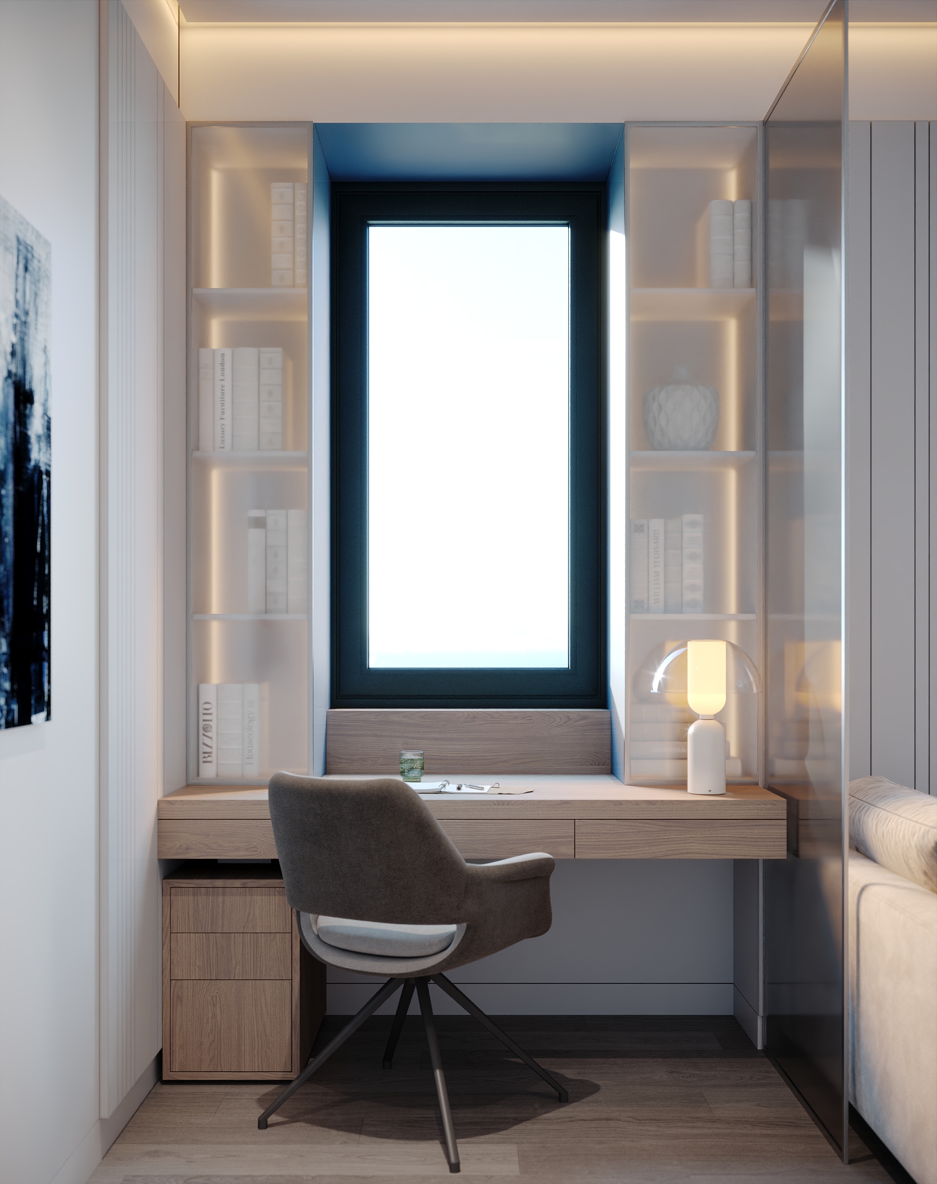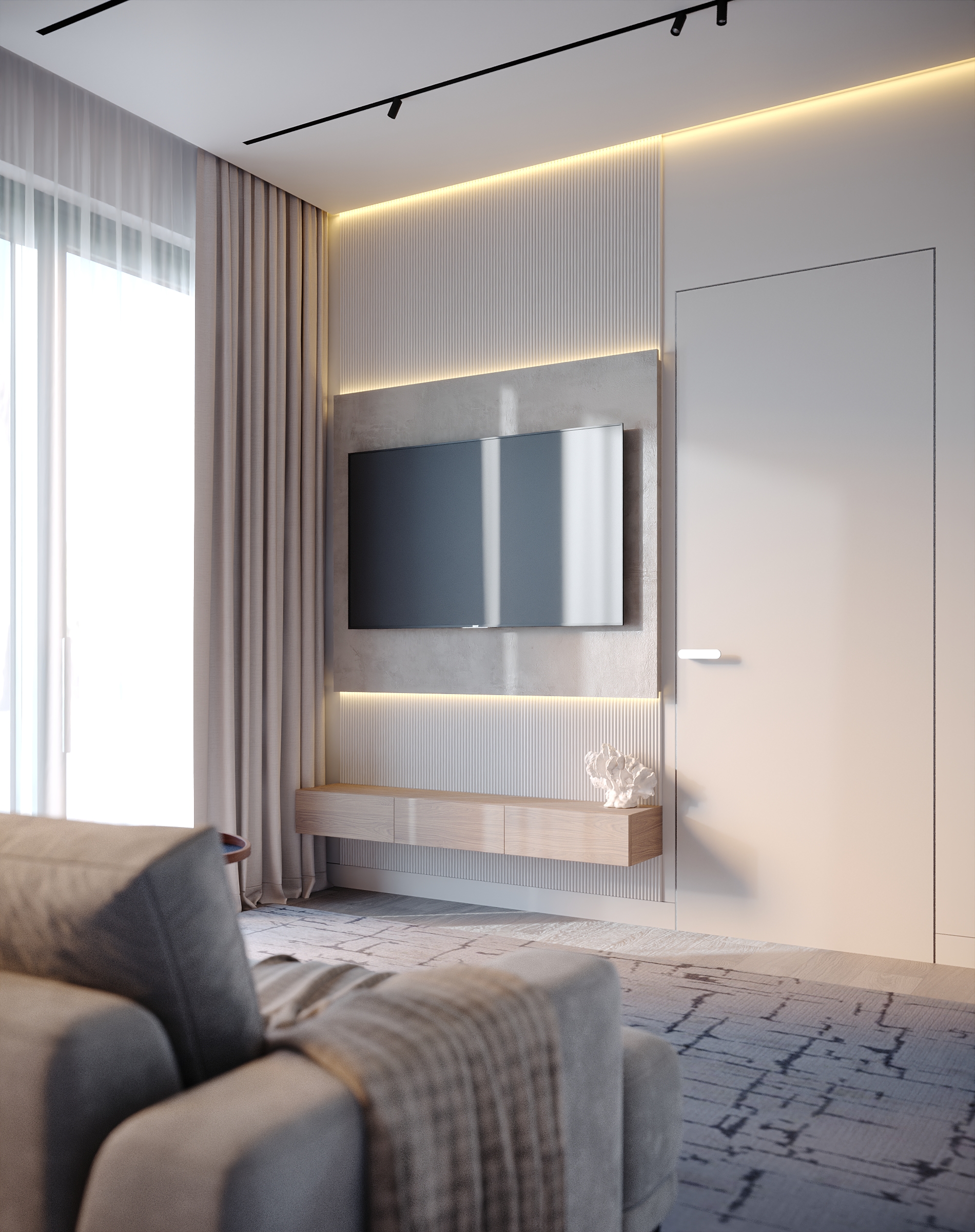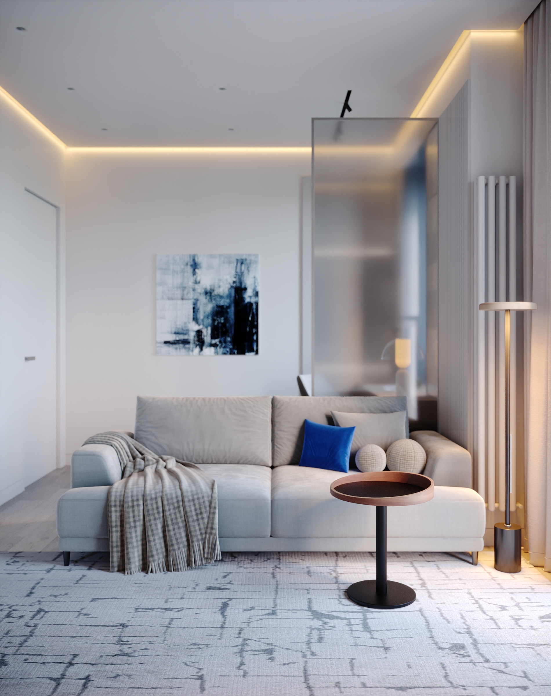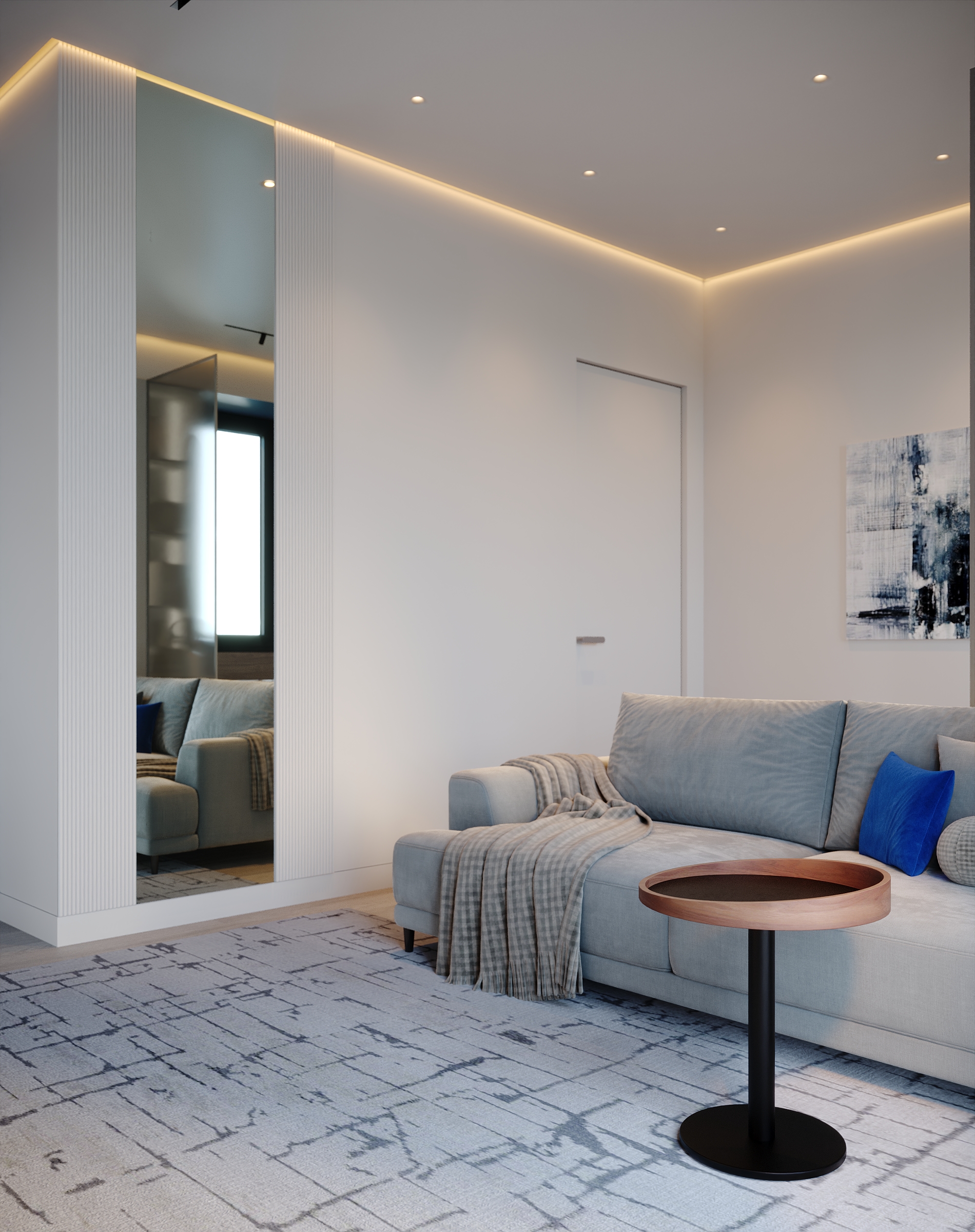 Интерьер зоны гостиной представляет собой современную минималистскую эстетику, характеризующуюся чистыми линиями, нейтральной цветовой палитрой и акцентом на натуральные материалы. Здесь царит ощущение комфорта, которое достигается благодаря мягкому освещению и текстурным элементам. Интерьер выглядит современным и в то же время гостеприимным, предлагая комфортное пространство для работы и отдыха. Помещение функционально и хорошо организовано и предназначено как для отдыха, так и для работы. Яркие оттенки представлены темно-синей декоративной подушкой и акцентной картиной на холсте с абстрактным рисунком. Сочетание естественного и искусственного освещения создает многослойный эффект. Искусственное освещение включает встроенные точки, функциональные трековые светильники и тонкое акцентное освещение. Освещение комбинированное и имеет несколько сценариев, возможность отдельно включать точки и направлять трековые светильники, наличие настольной лампы и торшера позволяет создать различные комбинации от яркого общего до интимного локализованного освещения. В комнате есть отдельные зоны. Слева к окну примыкает хорошо освещенный рабочий стол с удобным вращающимся креслом. В центре гостиной находится серый диван с подлокотниками, украшенный декоративными подушками и пледом. Рядом с диваном стоит небольшой журнальный столик. У окна над столом расположены встраиваемые полки со стеклянными дверцами для хранения книг. Стены вокруг рабочей зоны отделаны панелями в эмали, от дивана стол отделяется стеклянной матовой перегородкой, что позволяет выделить рабочую зону как отдельный элемент. Ковер с геометрическим рисунком создает ощущение структурированности пространства. На боковой стене располагаются ритмичные панели и зеркало во весь рост. Большие окна создают ощущение открытости, обеспечивают достаточное естественное освещение и открывают отличные виды на улицу.