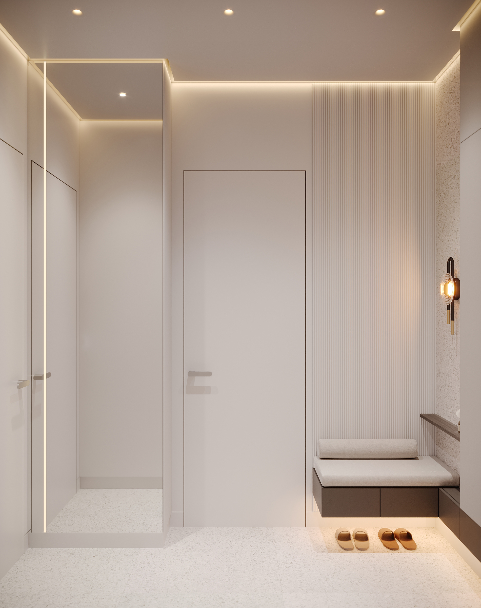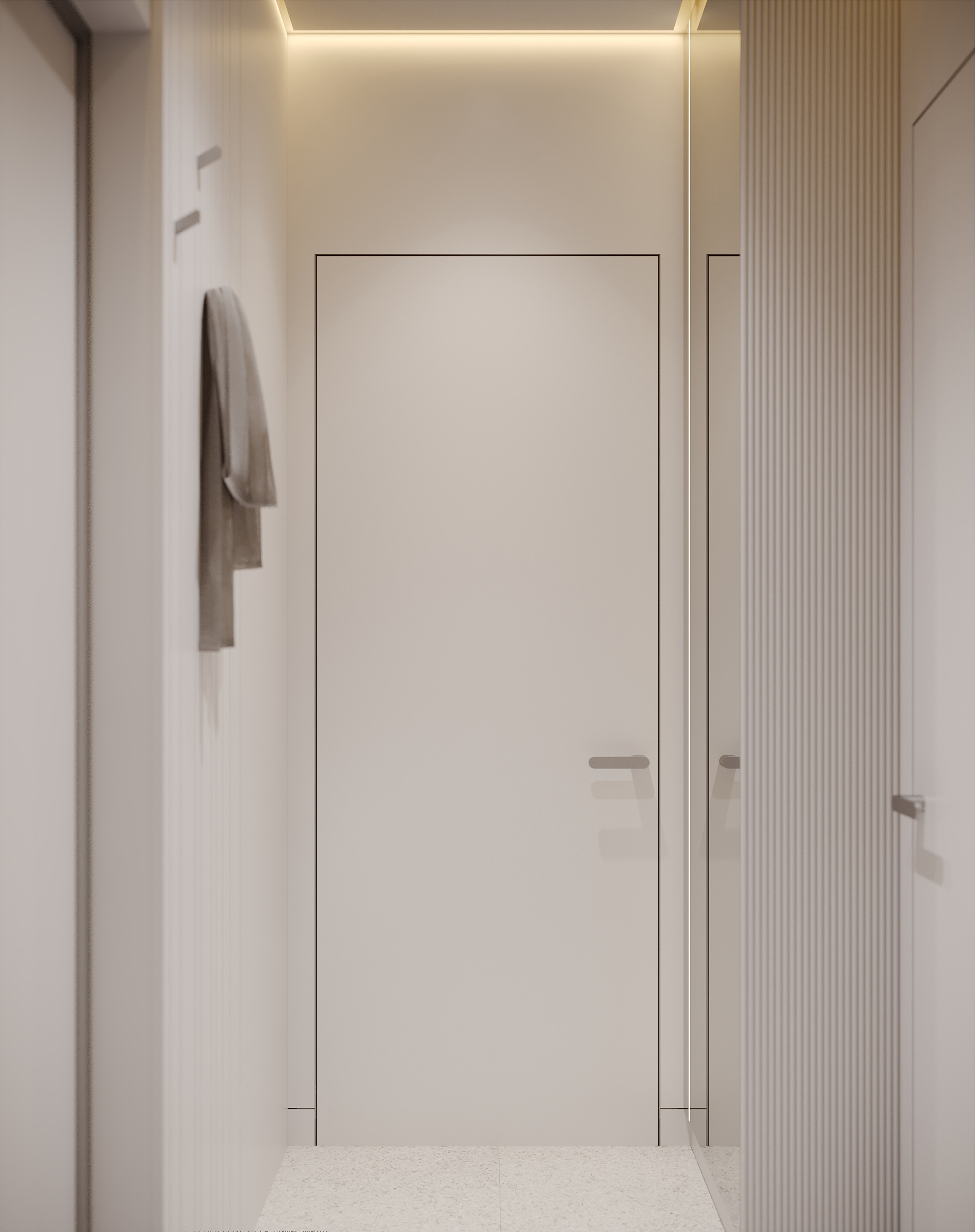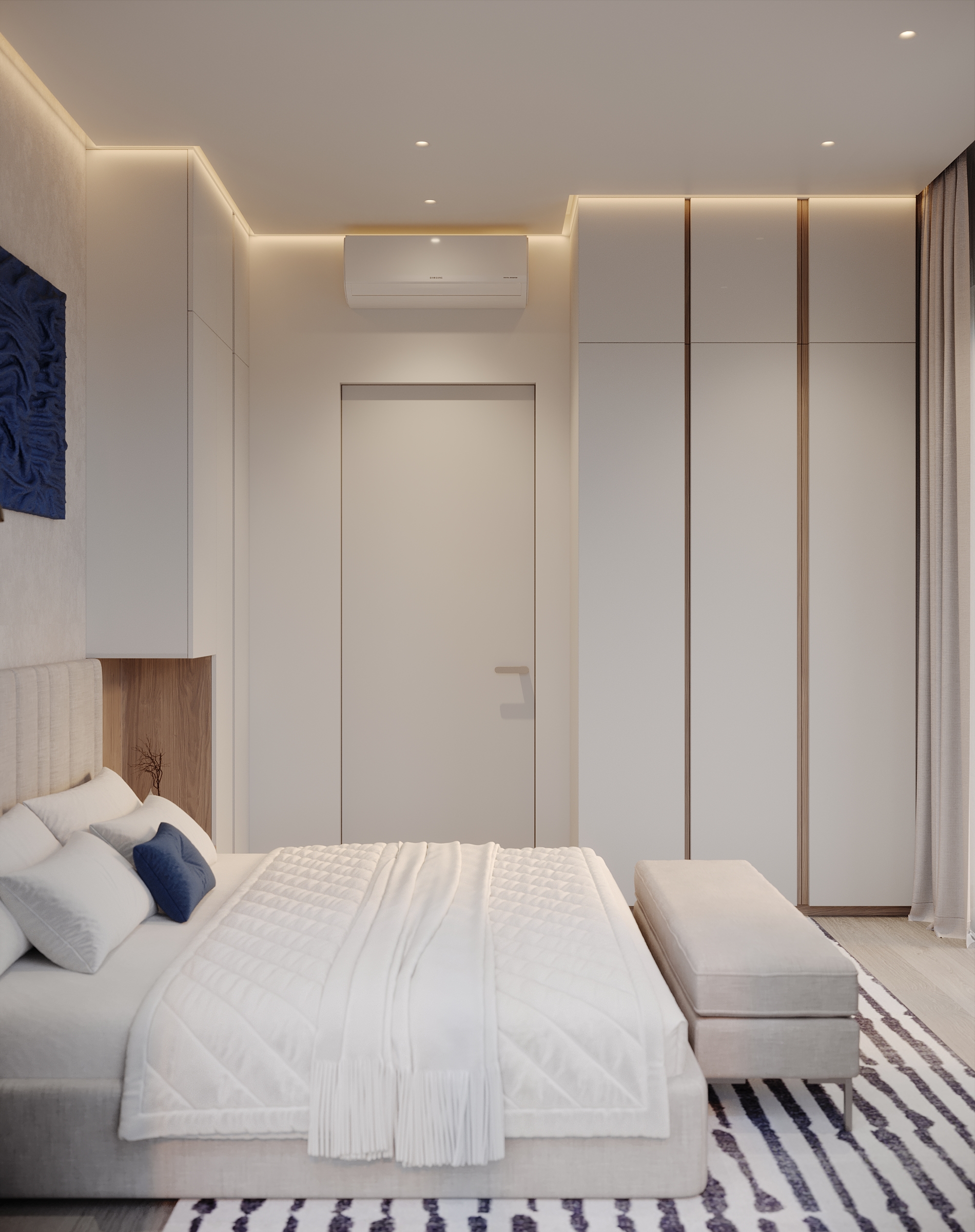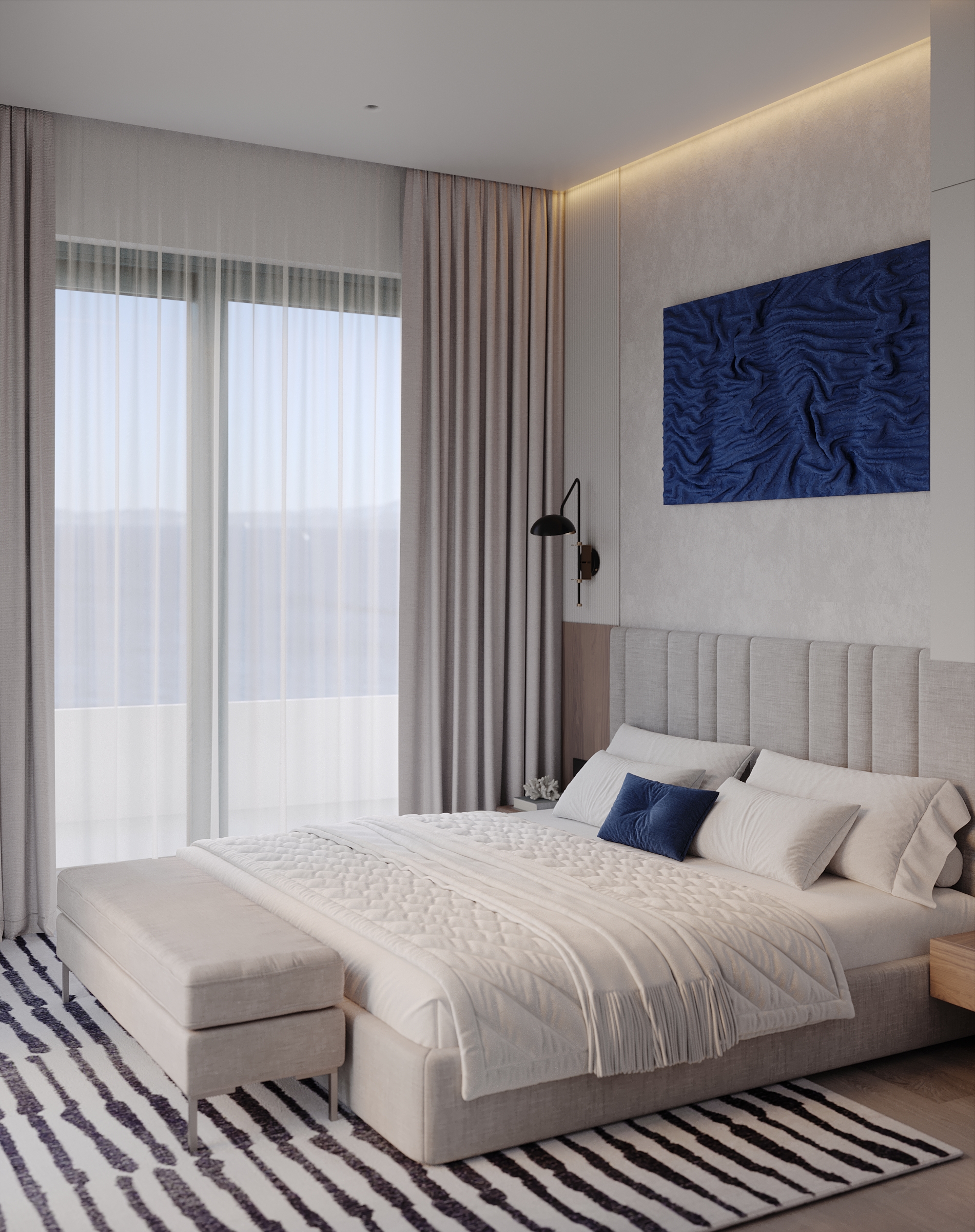 Интерьер зоны гостиной представляет собой современную минималистскую эстетику, характеризующуюся чистыми линиями, нейтральной цветовой палитрой и акцентом на натуральные материалы. Здесь царит ощущение комфорта, которое достигается благодаря мягкому освещению и текстурным элементам. Интерьер выглядит современным и в то же время гостеприимным, предлагая комфортное пространство для работы и отдыха. Помещение функционально и хорошо организовано и предназначено как для отдыха, так и для работы. Яркие оттенки представлены темно-синей декоративной подушкой и акцентной картиной на холсте с абстрактным рисунком. Сочетание естественного и искусственного освещения создает многослойный эффект. Искусственное освещение включает встроенные точки, функциональные трековые светильники и тонкое акцентное освещение. Освещение комбинированное и имеет несколько сценариев, возможность отдельно включать точки и направлять трековые светильники, наличие настольной лампы и торшера позволяет создать различные комбинации от яркого общего до интимного локализованного освещения. В комнате есть отдельные зоны. Слева к окну примыкает хорошо освещенный рабочий стол с удобным вращающимся креслом. В центре гостиной находится серый диван с подлокотниками, украшенный декоративными подушками и пледом. Рядом с диваном стоит небольшой журнальный столик. У окна над столом расположены встраиваемые полки со стеклянными дверцами для хранения книг. Стены вокруг рабочей зоны отделаны панелями в эмали, от дивана стол отделяется стеклянной матовой перегородкой, что позволяет выделить рабочую зону как отдельный элемент. Ковер с геометрическим рисунком создает ощущение структурированности пространства. На боковой стене располагаются ритмичные панели и зеркало во весь рост. Большие окна создают ощущение открытости, обеспечивают достаточное естественное освещение и открывают отличные виды на улицу.