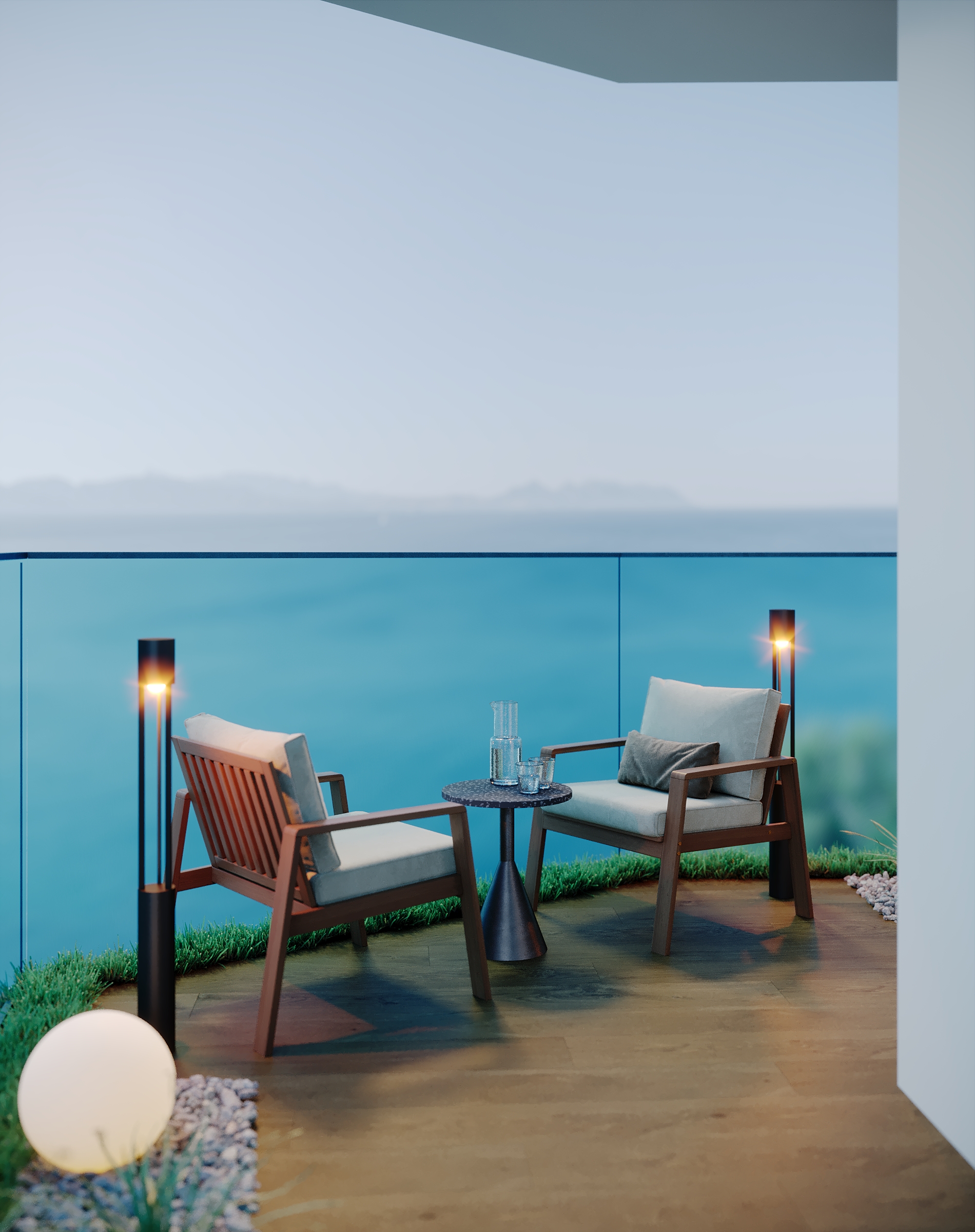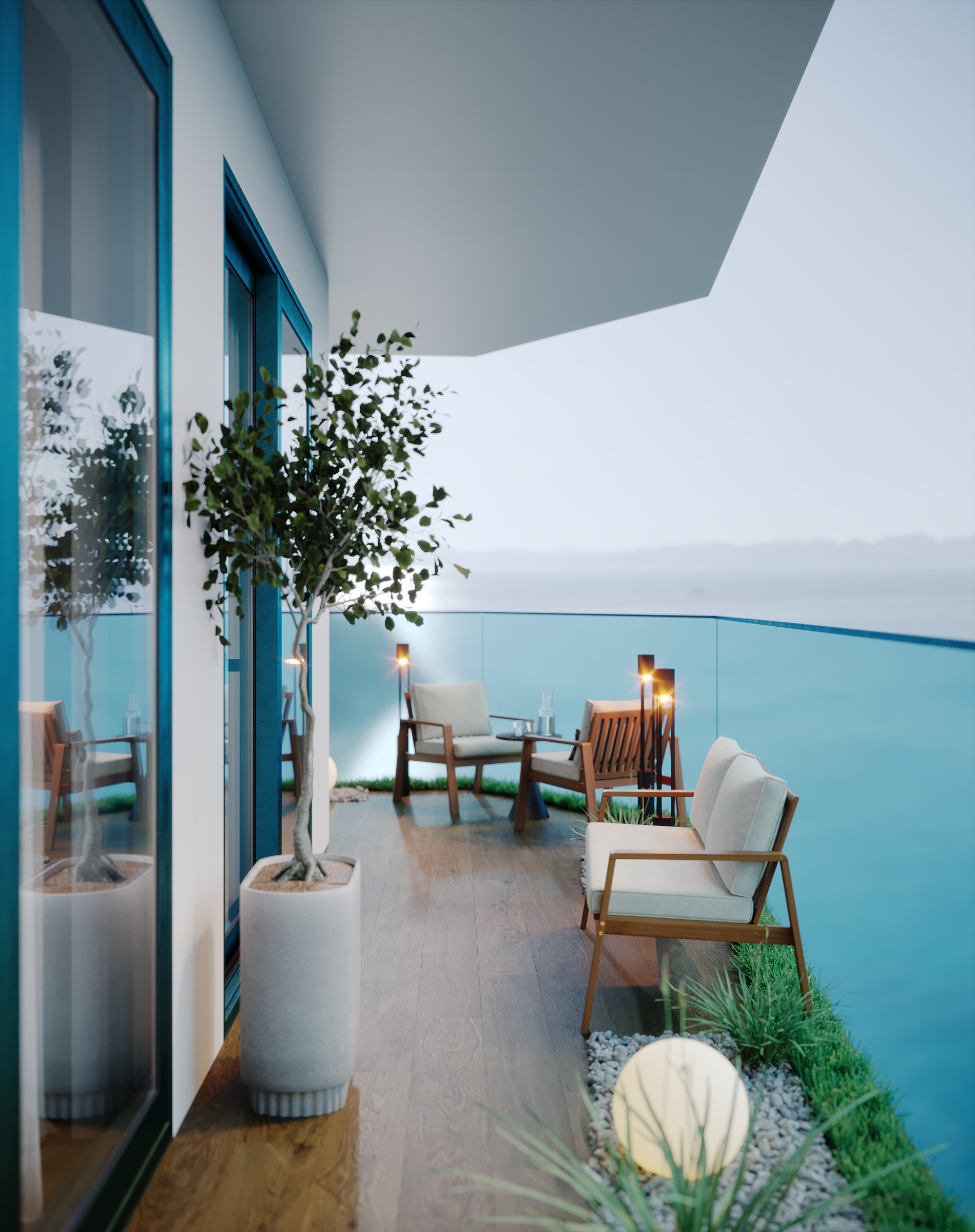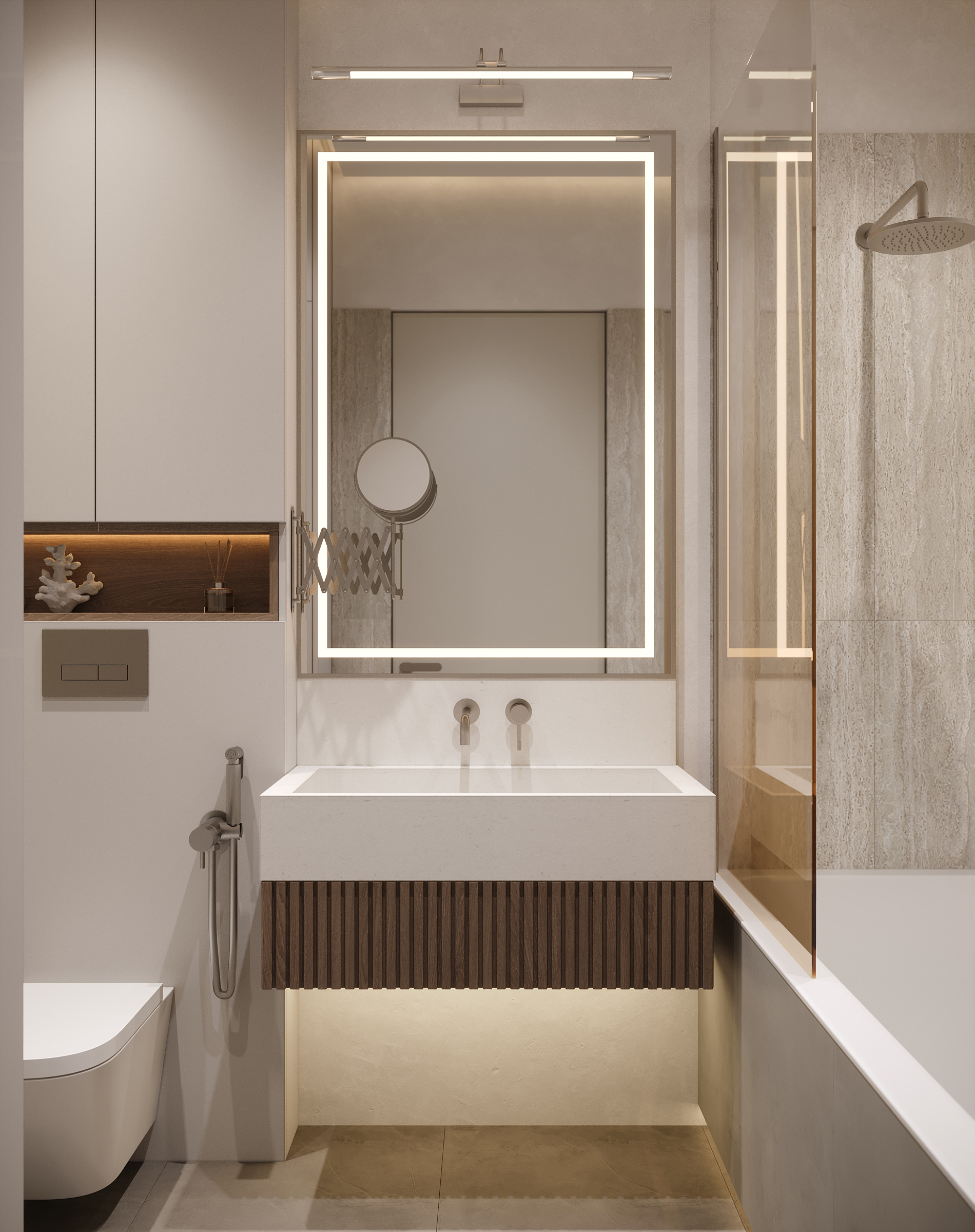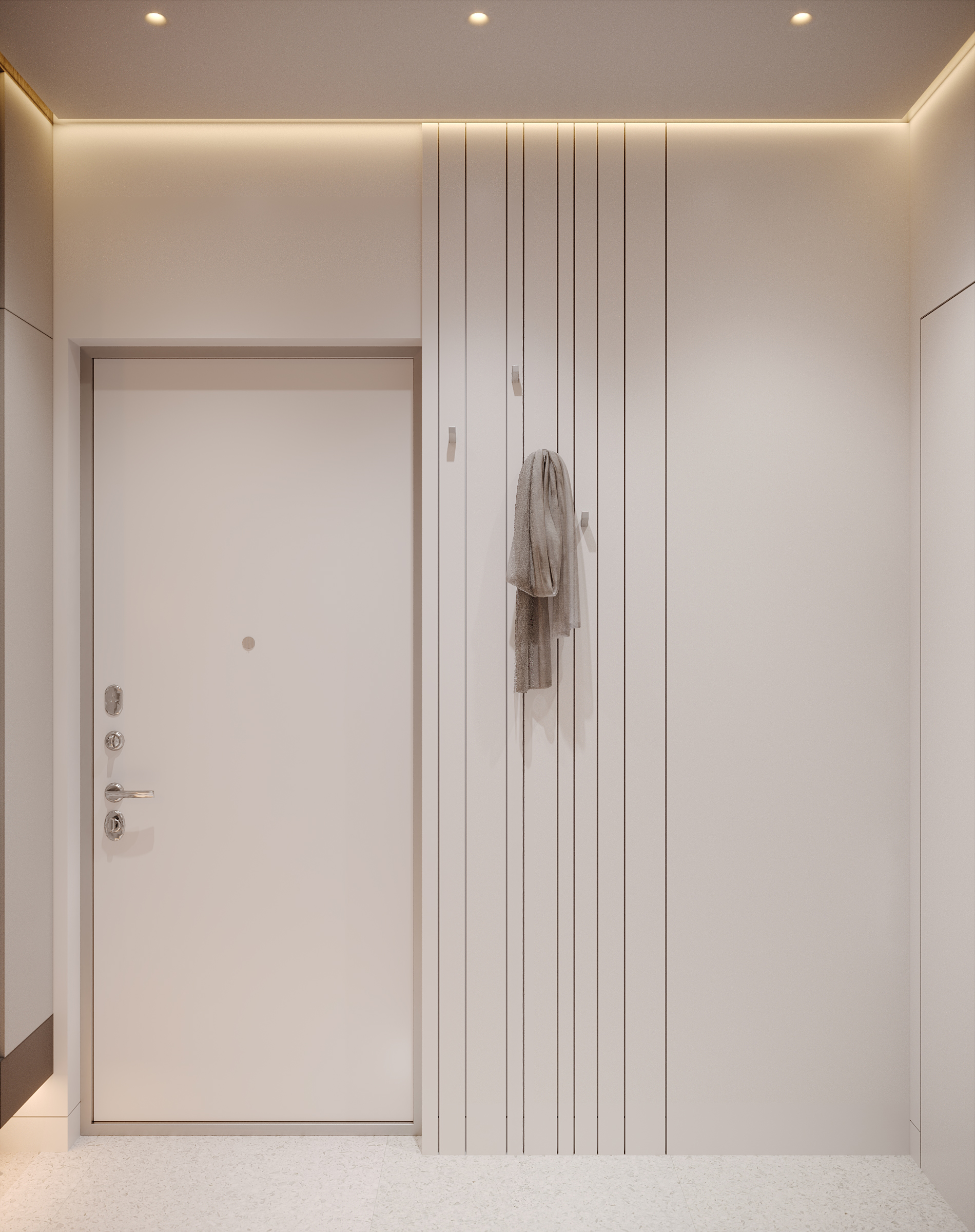 Интерьер зоны гостиной представляет собой современную минималистскую эстетику, характеризующуюся чистыми линиями, нейтральной цветовой палитрой и акцентом на натуральные материалы. Здесь царит ощущение комфорта, которое достигается благодаря мягкому освещению и текстурным элементам. Интерьер выглядит современным и в то же время гостеприимным, предлагая комфортное пространство для работы и отдыха. Помещение функционально и хорошо организовано и предназначено как для отдыха, так и для работы. Яркие оттенки представлены темно-синей декоративной подушкой и акцентной картиной на холсте с абстрактным рисунком. Сочетание естественного и искусственного освещения создает многослойный эффект. Искусственное освещение включает встроенные точки, функциональные трековые светильники и тонкое акцентное освещение. Освещение комбинированное и имеет несколько сценариев, возможность отдельно включать точки и направлять трековые светильники, наличие настольной лампы и торшера позволяет создать различные комбинации от яркого общего до интимного локализованного освещения. В комнате есть отдельные зоны. Слева к окну примыкает хорошо освещенный рабочий стол с удобным вращающимся креслом. В центре гостиной находится серый диван с подлокотниками, украшенный декоративными подушками и пледом. Рядом с диваном стоит небольшой журнальный столик. У окна над столом расположены встраиваемые полки со стеклянными дверцами для хранения книг. Стены вокруг рабочей зоны отделаны панелями в эмали, от дивана стол отделяется стеклянной матовой перегородкой, что позволяет выделить рабочую зону как отдельный элемент. Ковер с геометрическим рисунком создает ощущение структурированности пространства. На боковой стене располагаются ритмичные панели и зеркало во весь рост. Большие окна создают ощущение открытости, обеспечивают достаточное естественное освещение и открывают отличные виды на улицу.
