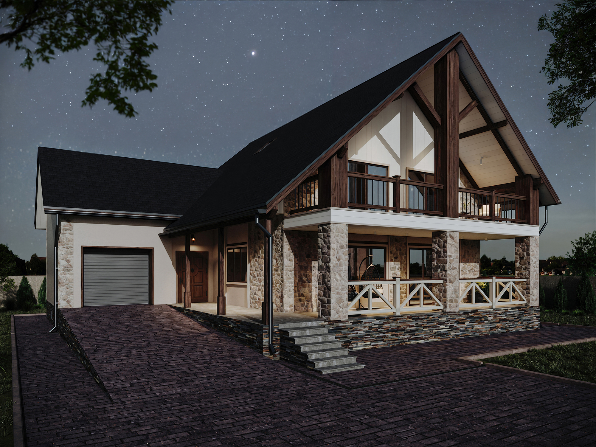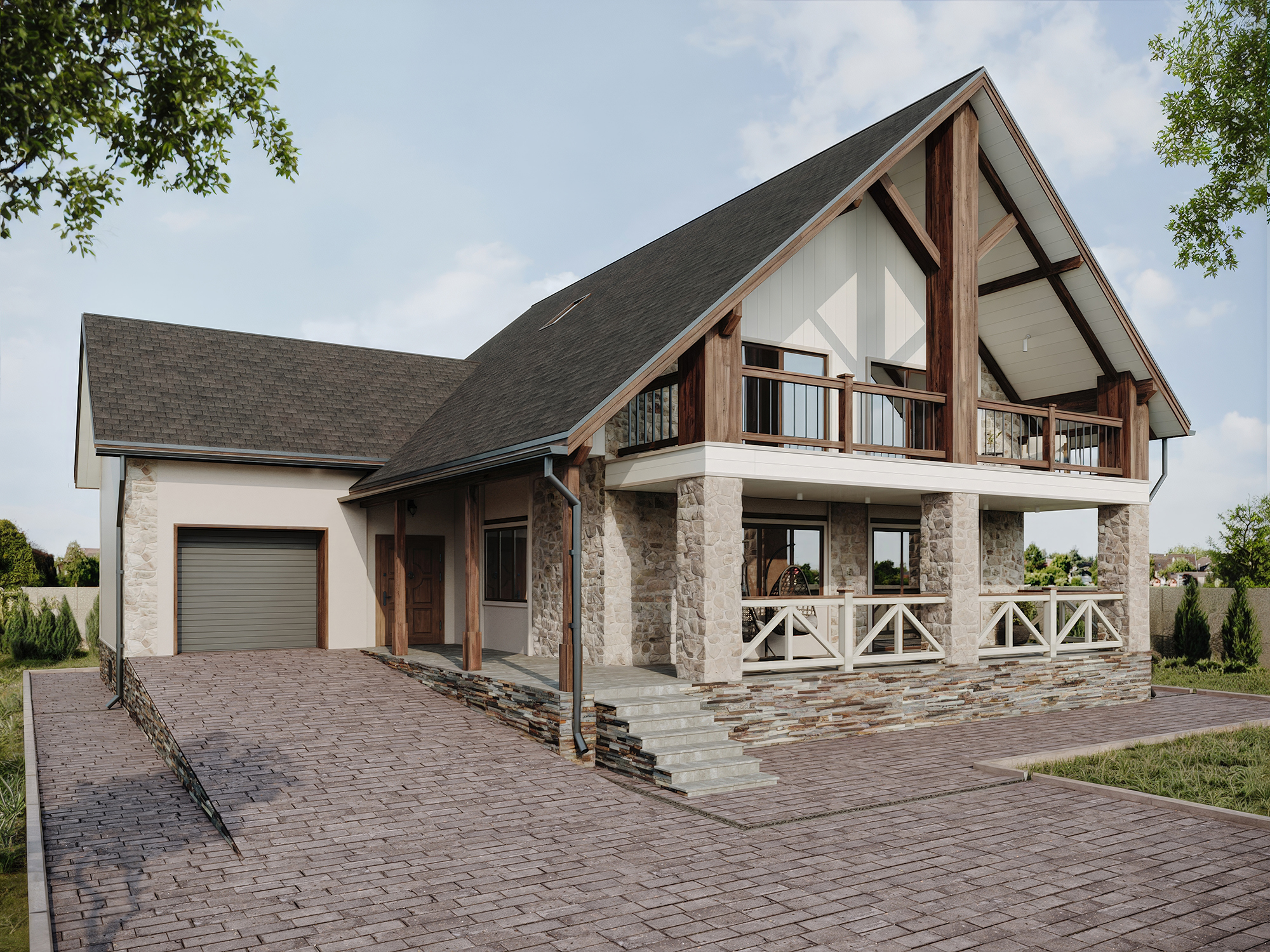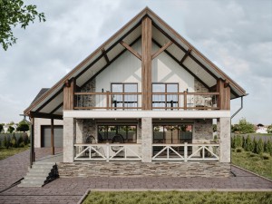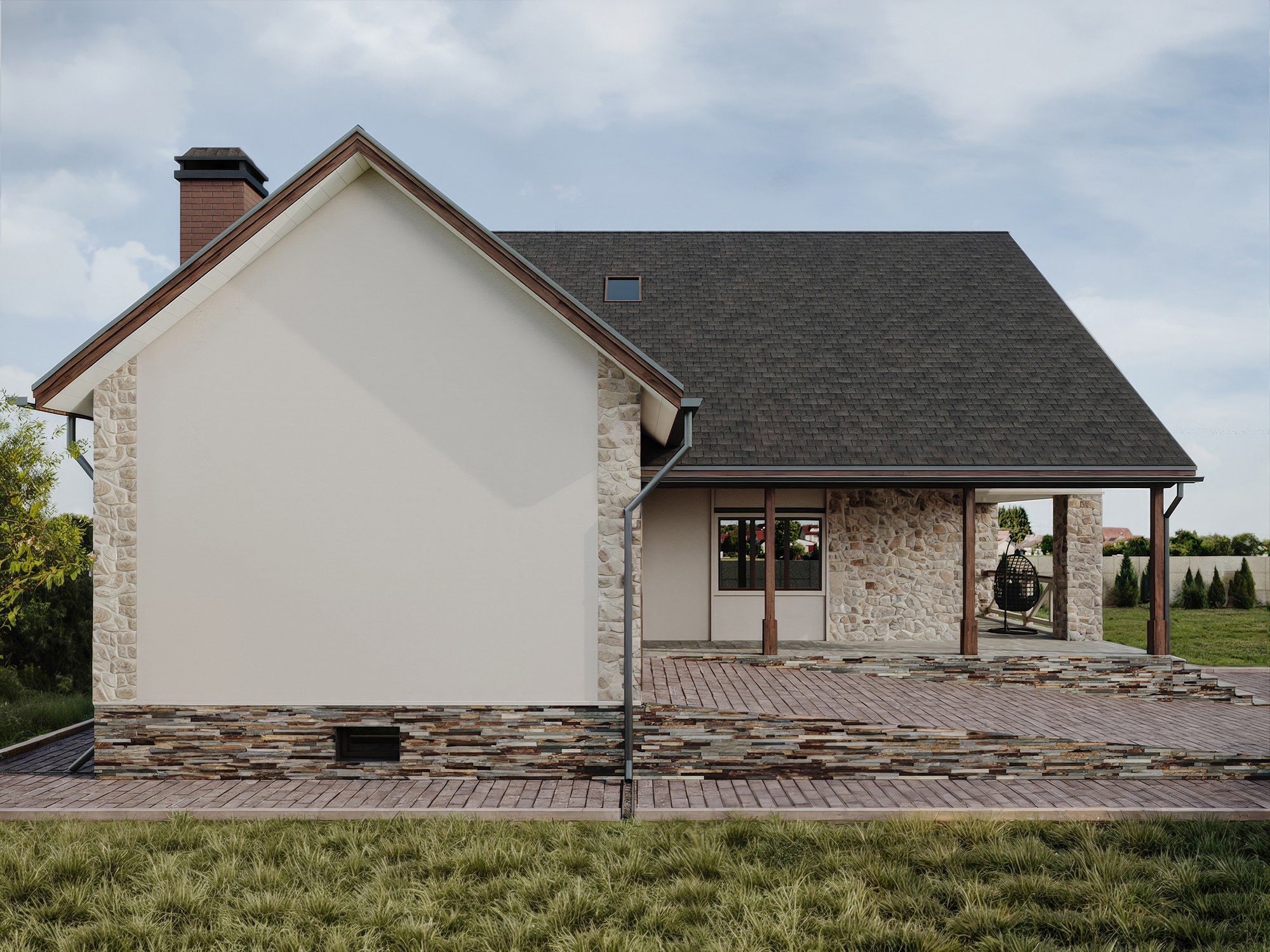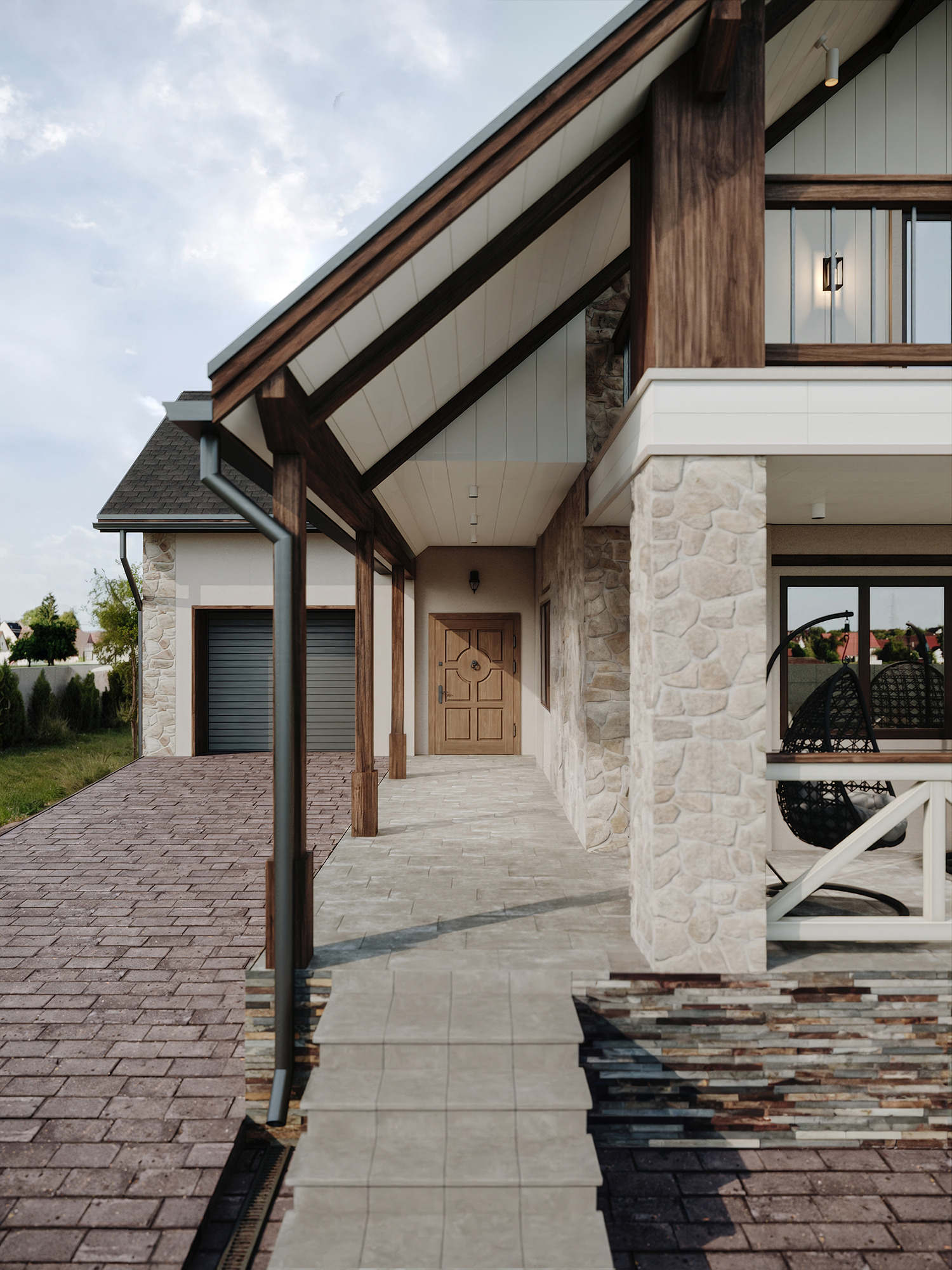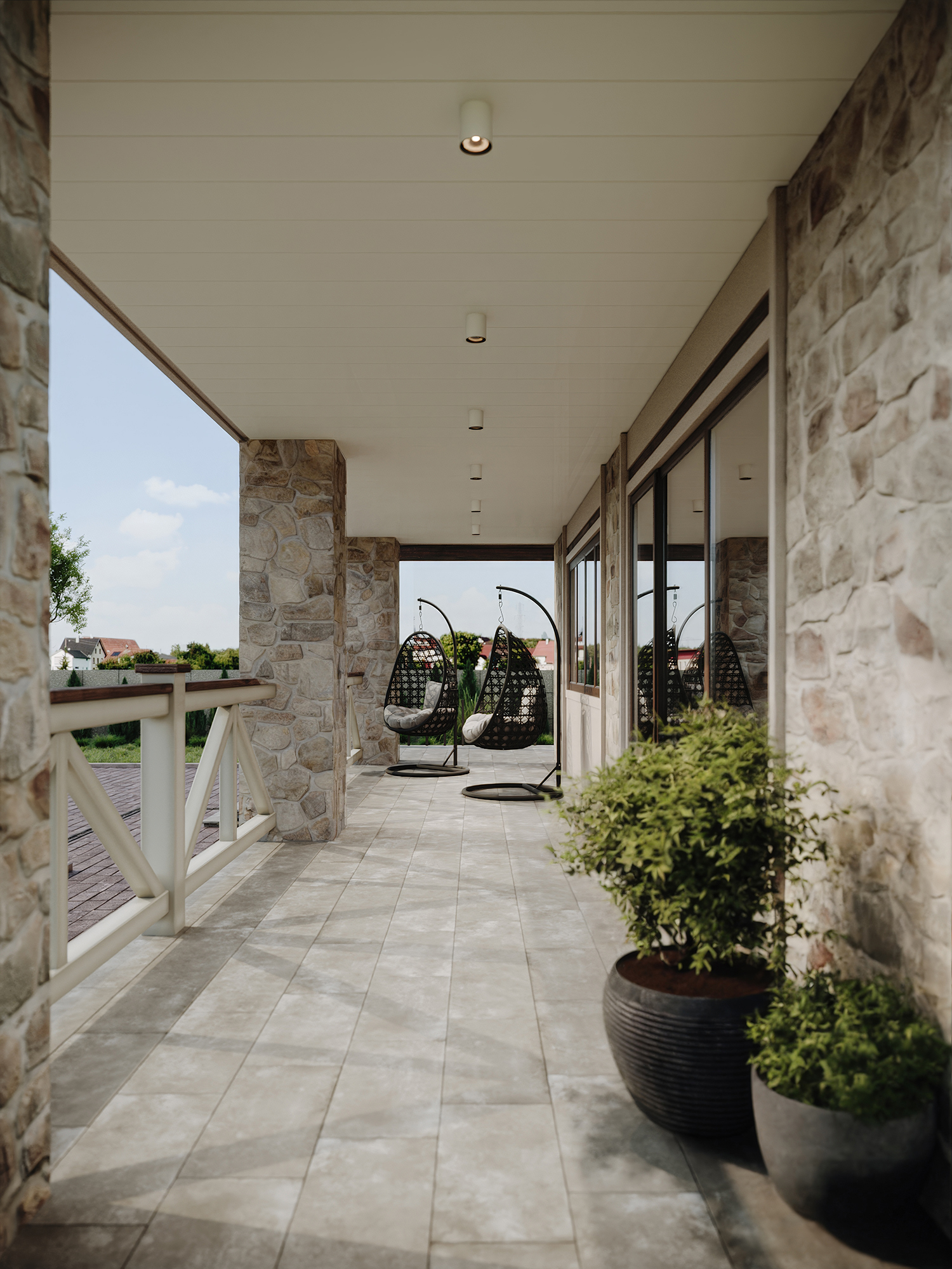 Отделка дома выполнена в стиле Farmhouse, сочетающем в себе простоту деревенской жизни и современную уютную эстетику. Внешняя отделка выполнена из фасадного планкена и штукатурки кремовых оттенков. Облицовка светлым камнем участков фасада и опорных колонн добавляет текстурности и служит визуальным акцентом.