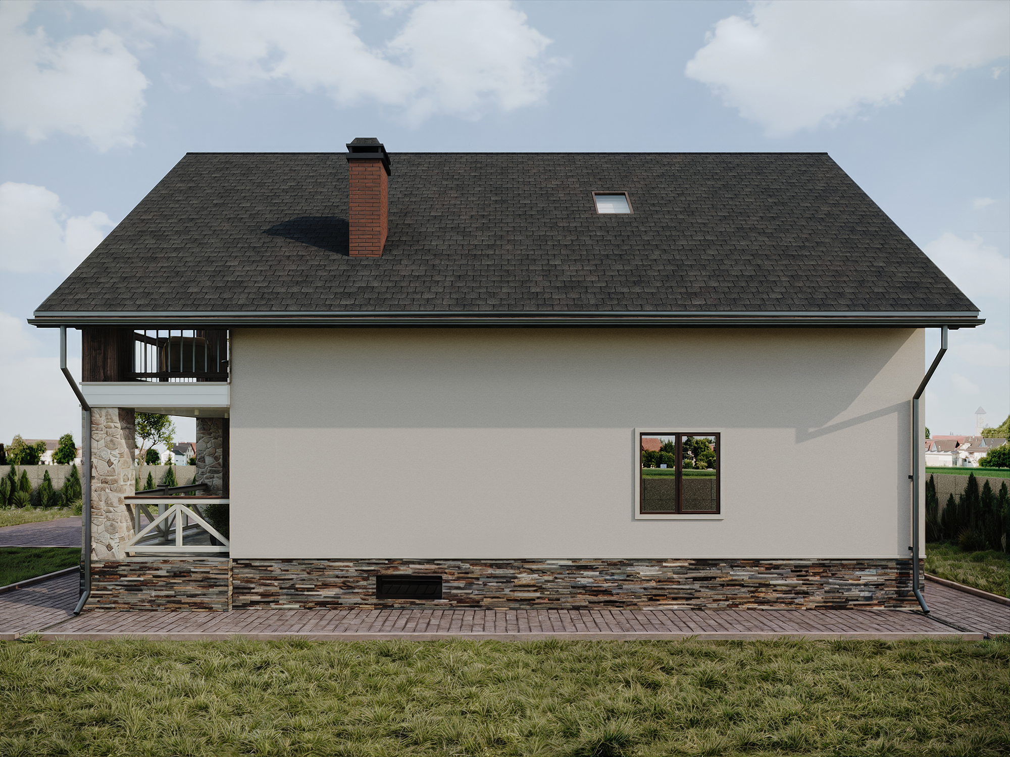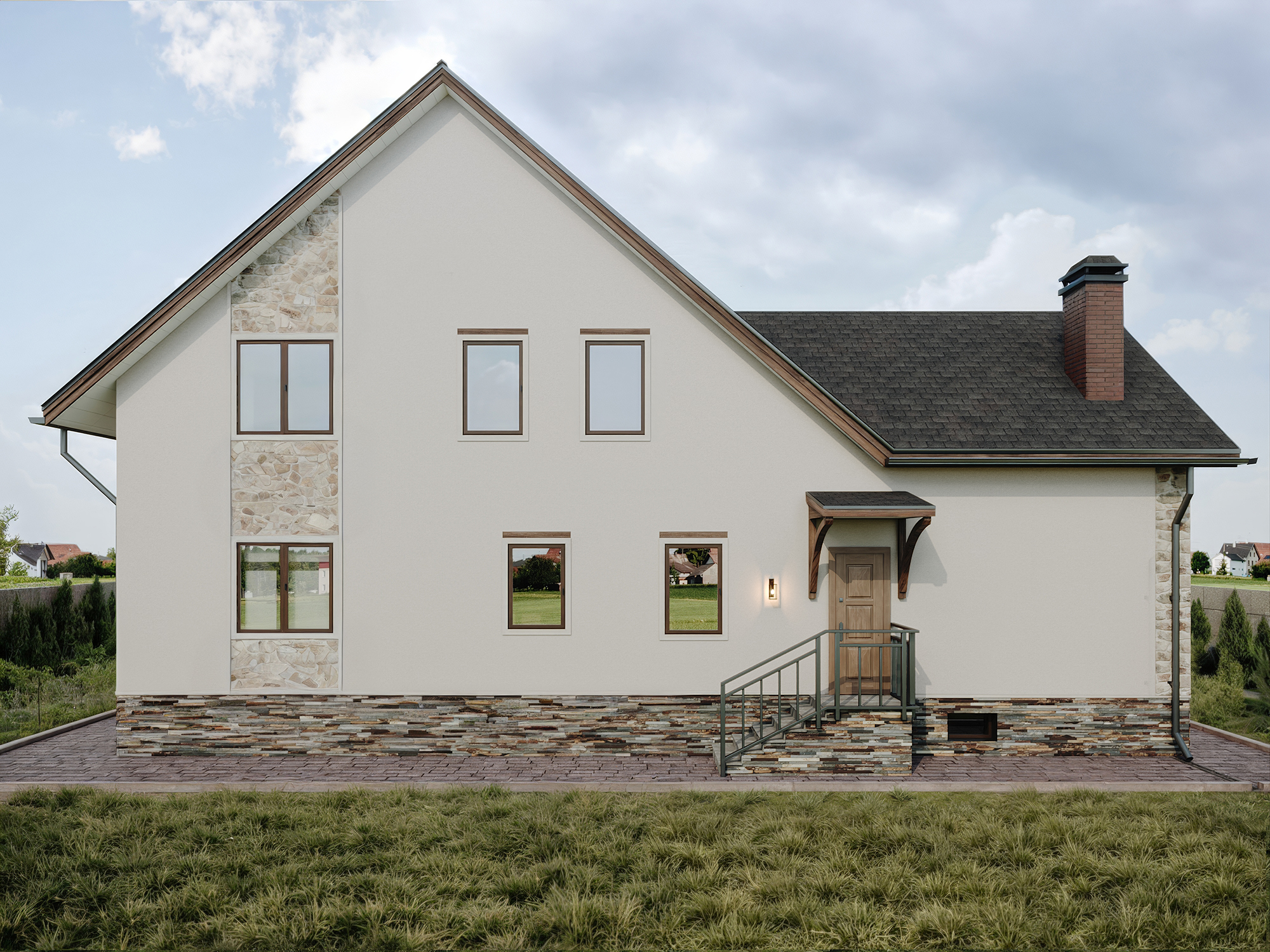 Крыша — двускатная, покрыта темной гибкой черепицей. Входная дверь оформлена деревянной накладкой с филенкой и подчеркивает общую композицию.