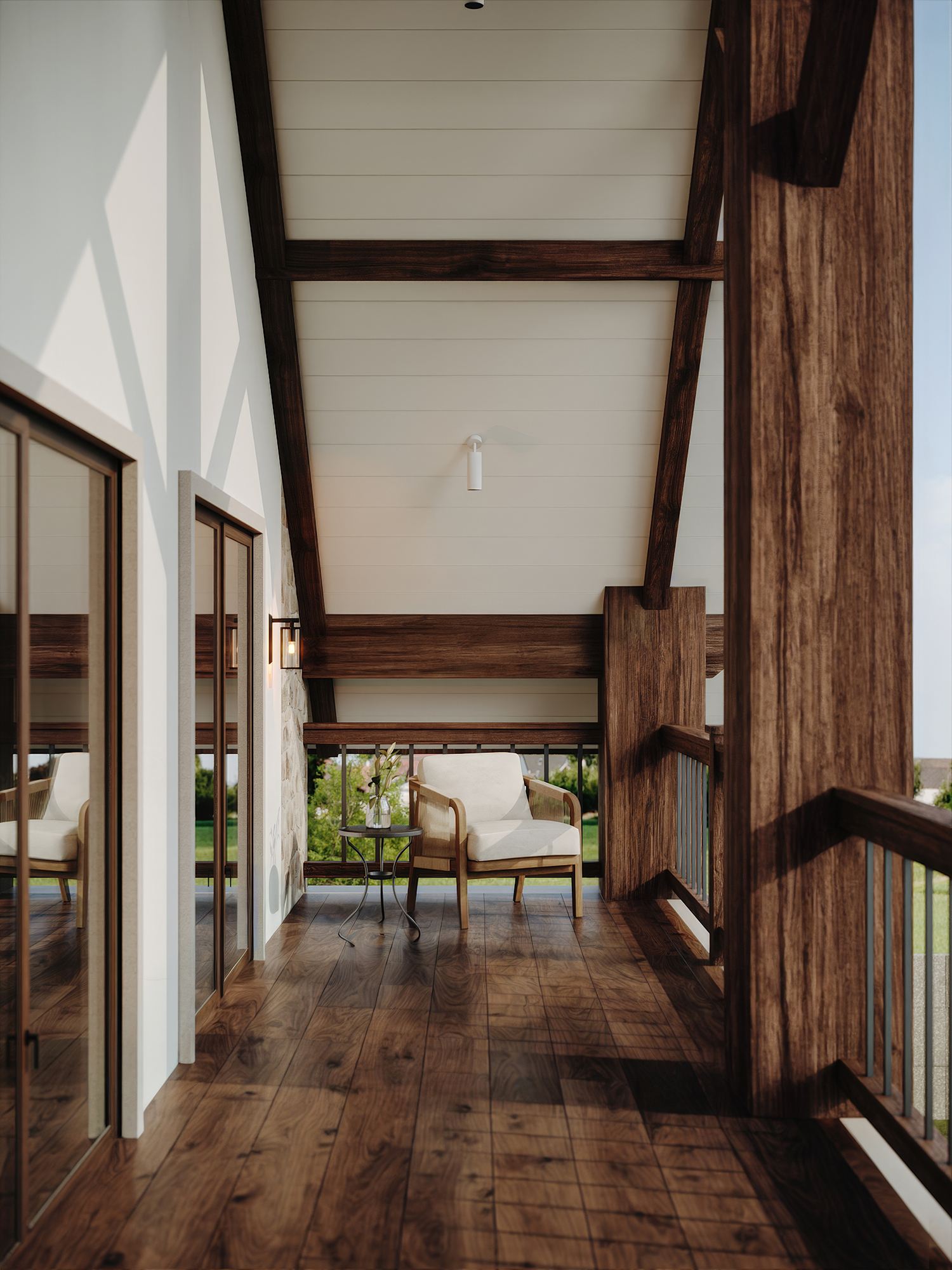 Деревянные балки и кронштейны служат не только опорой для навесов, но и декоративным элементом, создающим ощущение надежности и рустикальной аутентичности. Эти элементы подчеркивают простоту и естественность конструкции.
