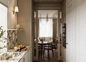 Зона гостиной поделена на три части – обеденная зона, зона отдыха и каминная группа. Мать заказчицы очень хотела сделать витрину буфета, поэтому мы сделали зону для хранения красивой посуды рядом с обеденным столом, чтобы можно было встретить гостей. Акцентный решением в рамках гостиной является люстра в современном стиле, напоминающая паука и дополняющая по стилю бра, необычной формы. Гостиная, как и вся квартира выполнена в стиле современная классика в светлых приглушенных тонах. Зона прилегающая к кухне, также, выделена другим цветом, как и со стороны кухни, она будет обыграна молдингами, и кухня с гостиной будут полностью разделяться выдвижными стеклянными дверцами в пенале.