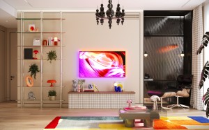 На белом фоне стен данного помещения располагается уютный диван в сиреневом оттенке. В рабочей зоне мы опустили потолок и обыграли подсветкой и забавными обоями. Подсветка над опуском придает ощущение парящего потолка. Место хранения для холстов и закрыли шторками. Полки стеллажей мы сделали прозрачными, пластиковыми