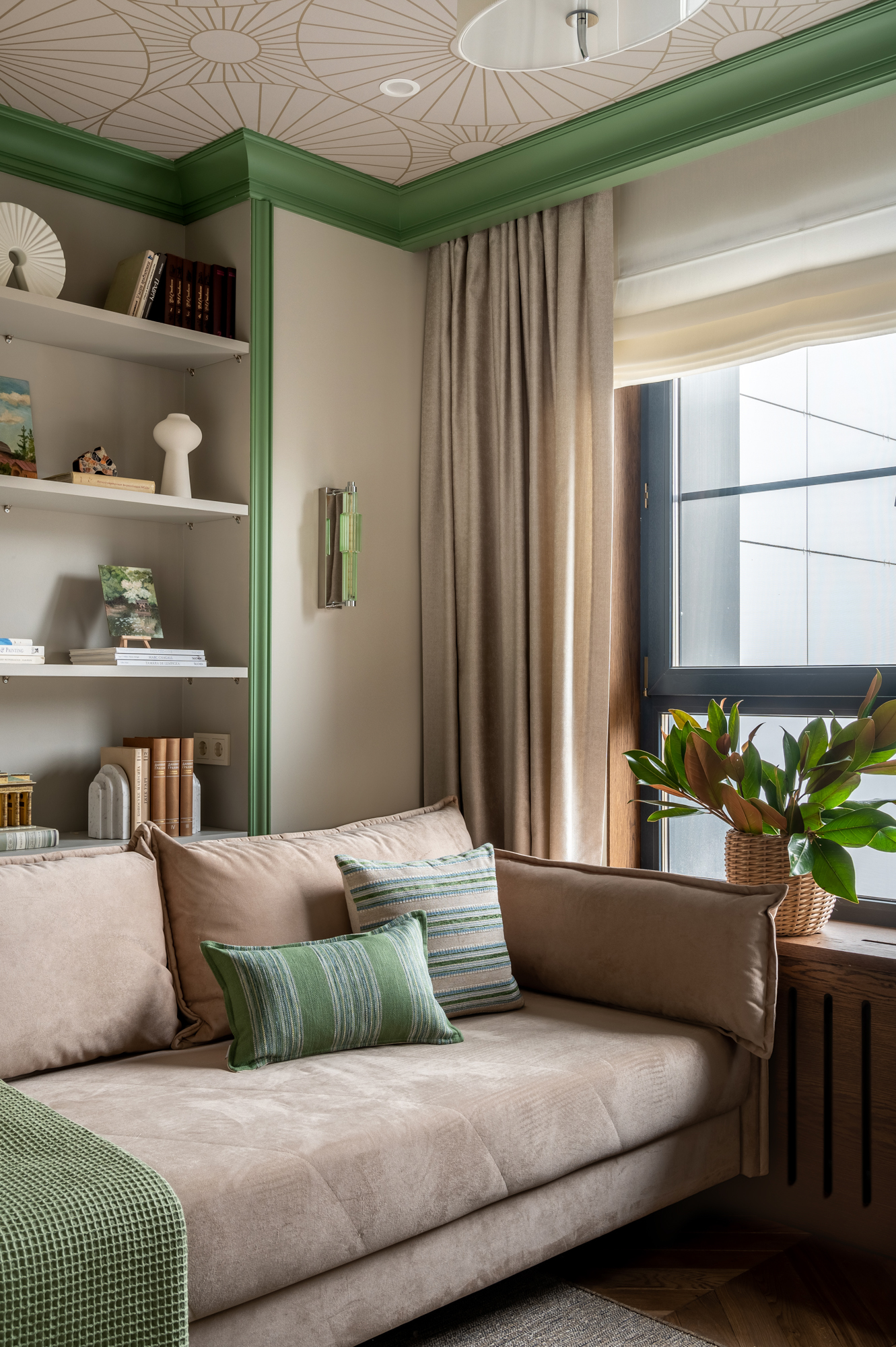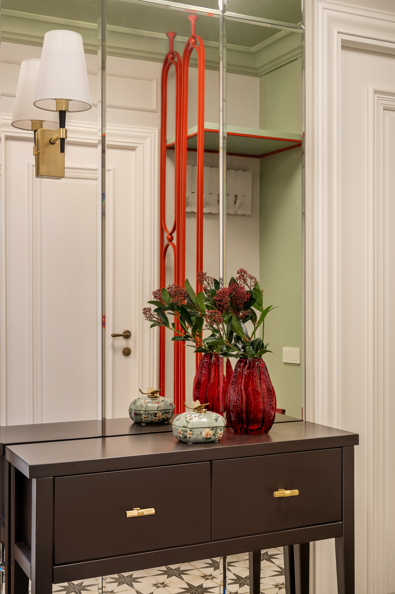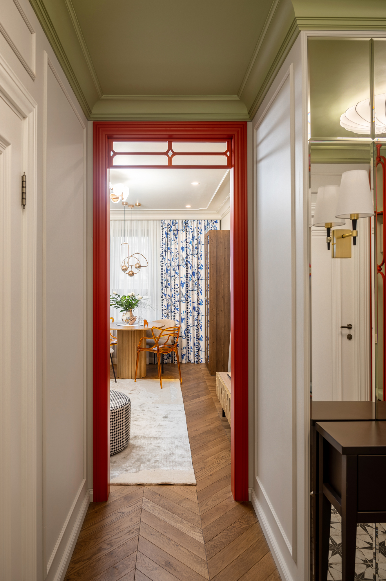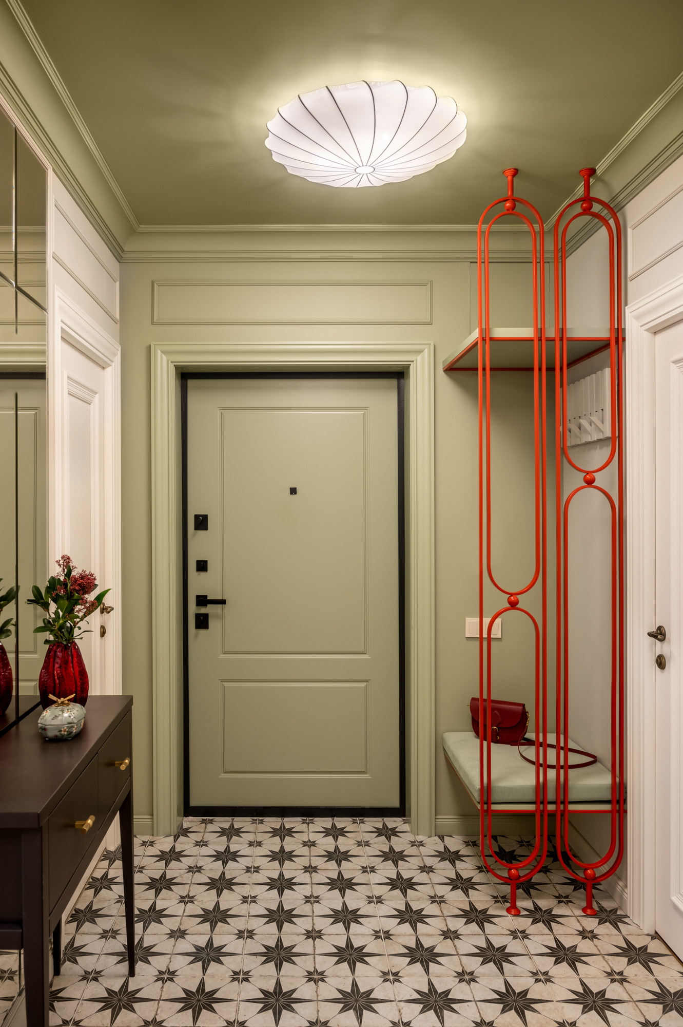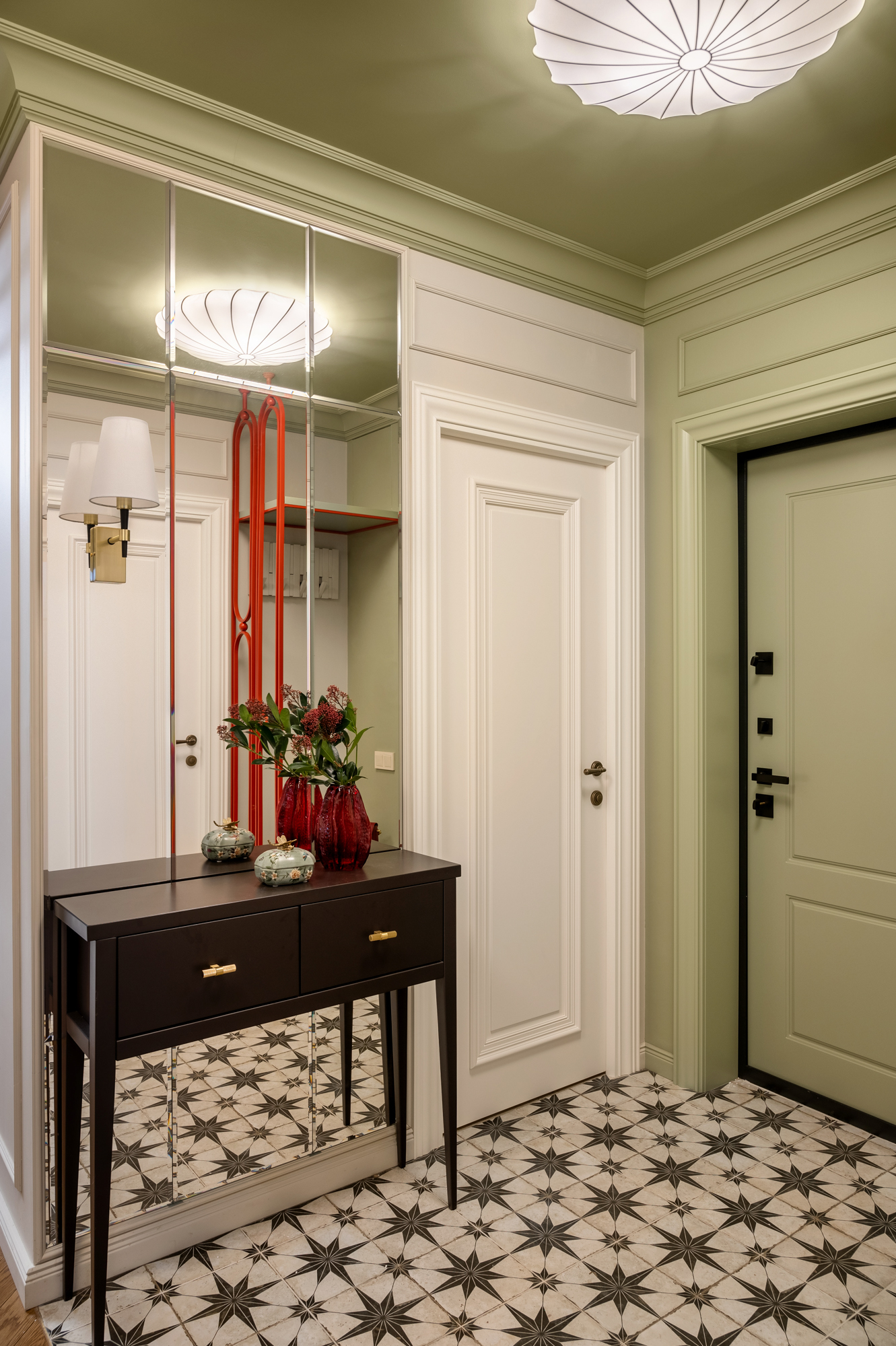 В разработке прихожей мы опирались на предпочтения заказчицы – ей нравятся работы художницы Анны Хопта, в которых часто используются оттенки зеленого. Именно поэтому тон всему помещению задает сложный болотный оттенок стен, который гармонично сочетается со светлыми тонами. Болотный также применен на потолке, что визуально делает помещение глубже. На контрасте с зеленым цветом используется металлическая перегородка органических форм в бордовых оттенках. Эклектичности пространству придают – тонкие молдинги, дверей с небольшой филёнкой, люстры, имитирующие кувшинки. Для контраста используется плитка с четким угловатым рисунком. Перегородка между прихожей и гостиной визуально вытягивает помещение и является смысловой связью между помещениями за счет своего цвета и декоративных элементов.