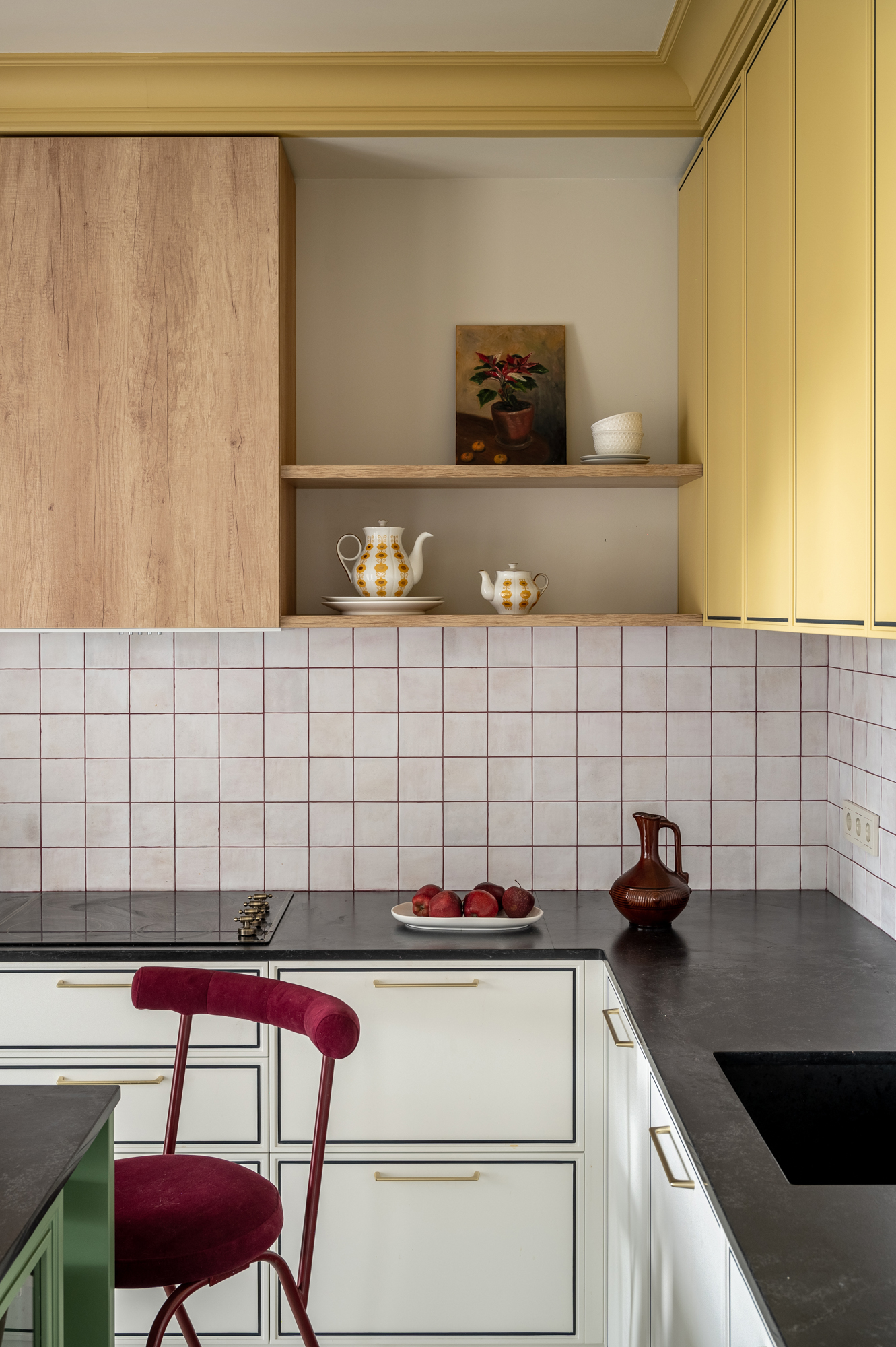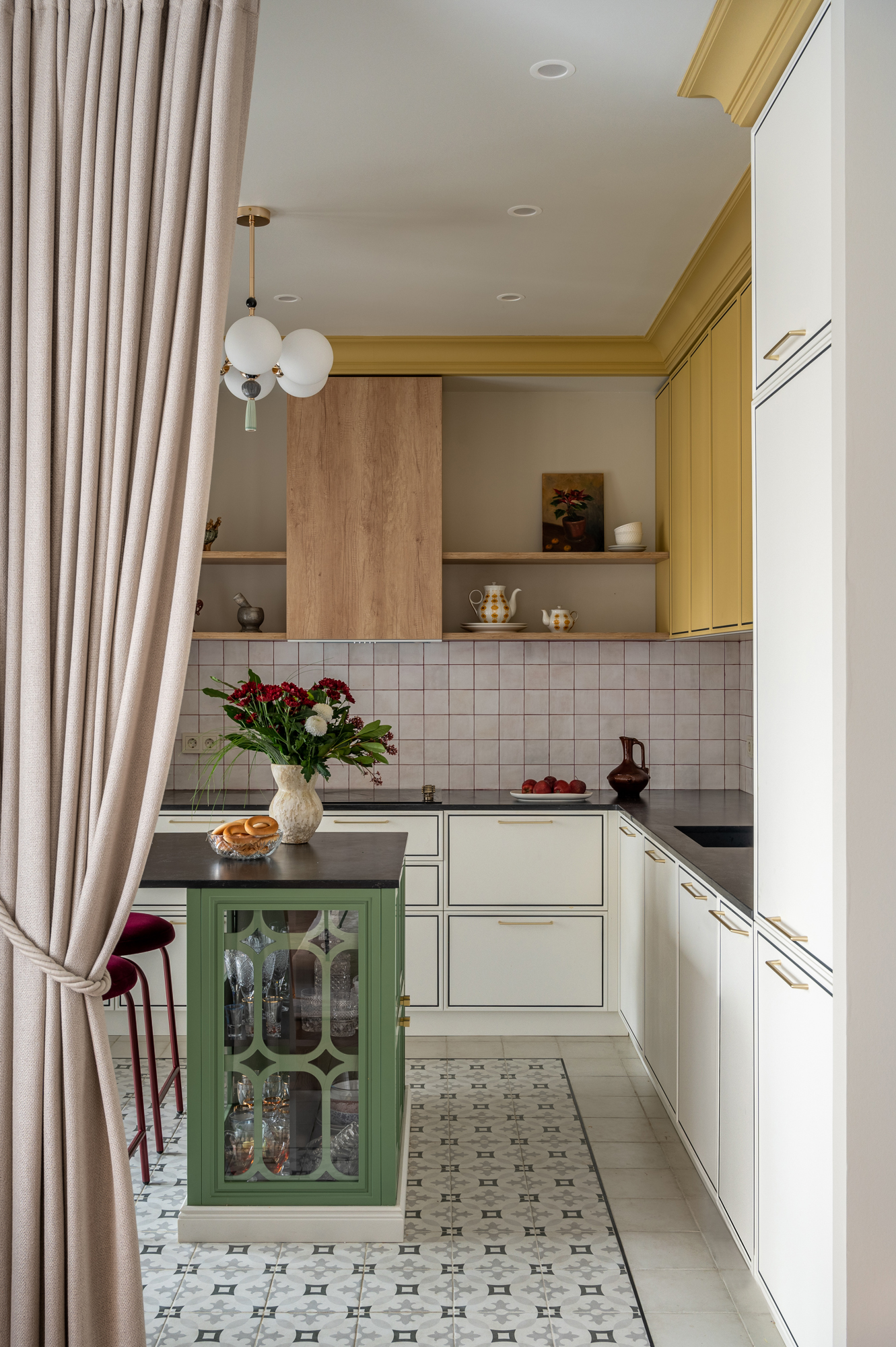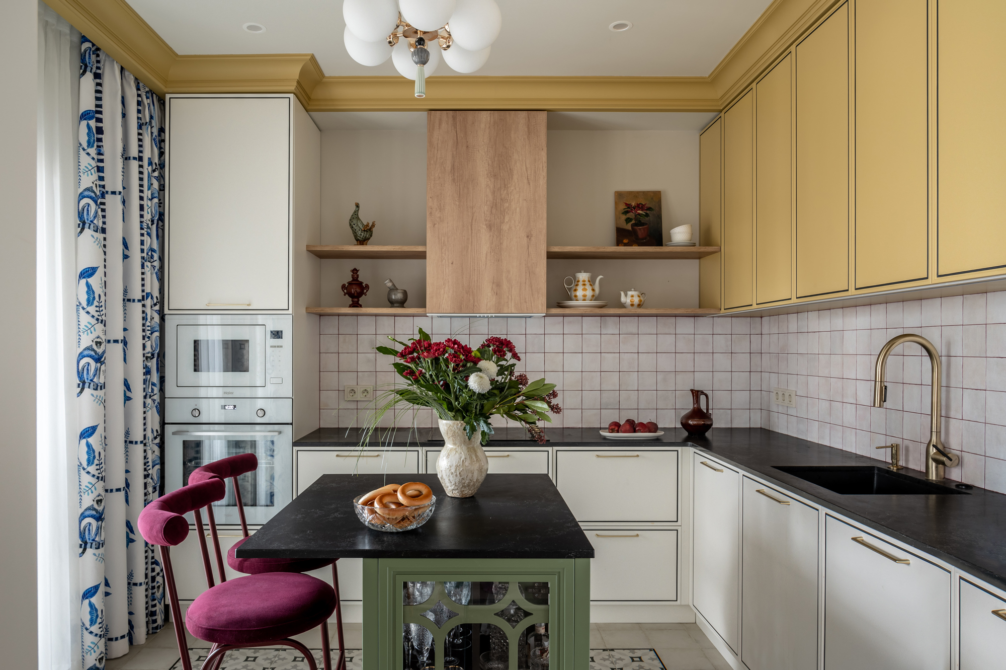 В центре кухни размещен остров, выполняющий роль буфета и бутылочницы. Чтобы визуально выделить его на фоне нейтральной светлой кухни, используем травянистый контрастный оттенок. В дополнении к нему выступают контрастные барные стулья в оттенке фуксия. Единство геометрии на полу, на кухонном фартуке и на боковом фасаде связывают помещение воедино. Так как кухню заказчица хотела видеть в классическом исполнении, мы применили пастельно-желтый цвет, который используется на зеркале в гостиной, применяется и на верхних фасадах. Подвесная люстра вобрала в себя все оттенки, которые используются на кухне.