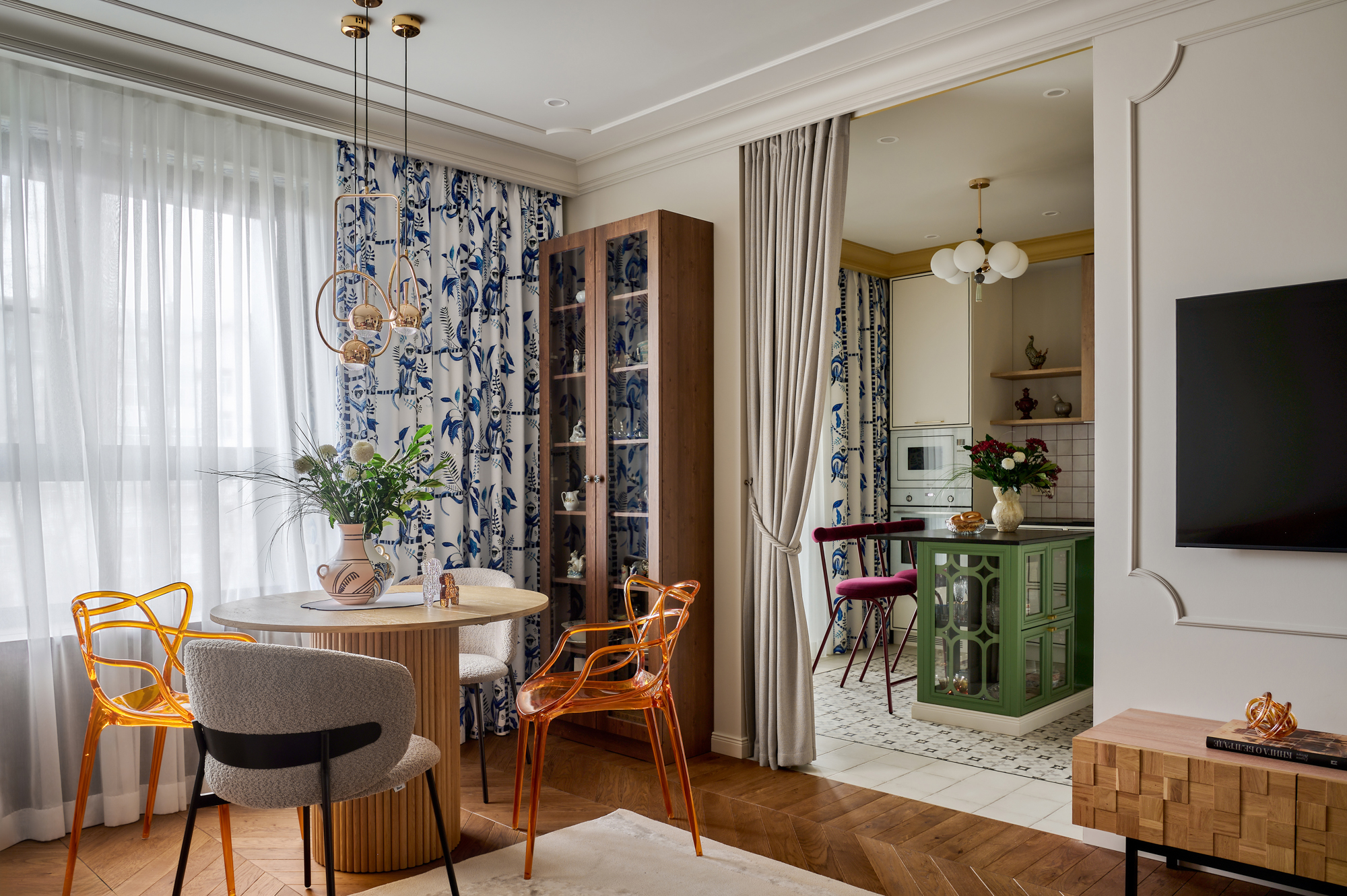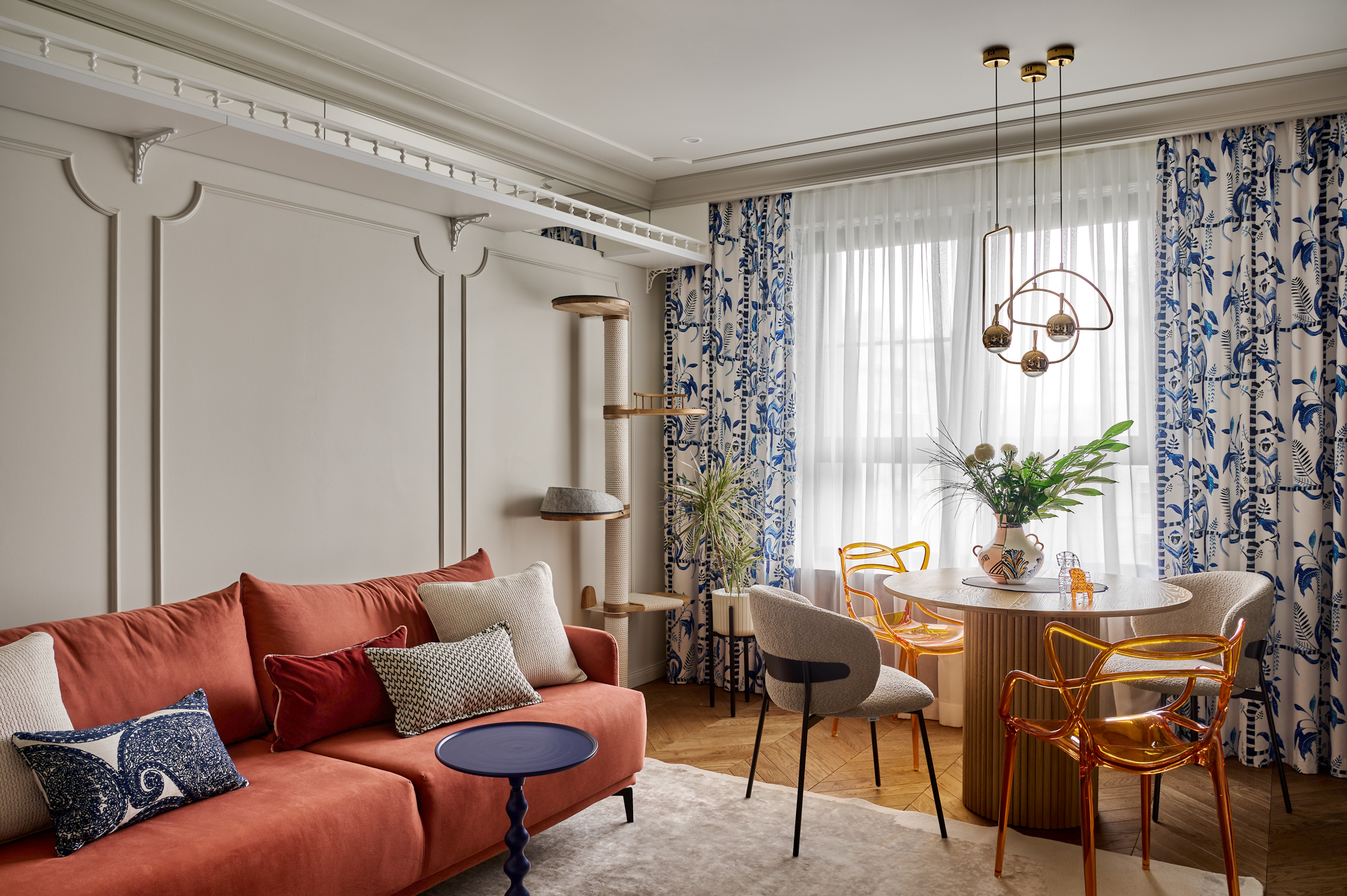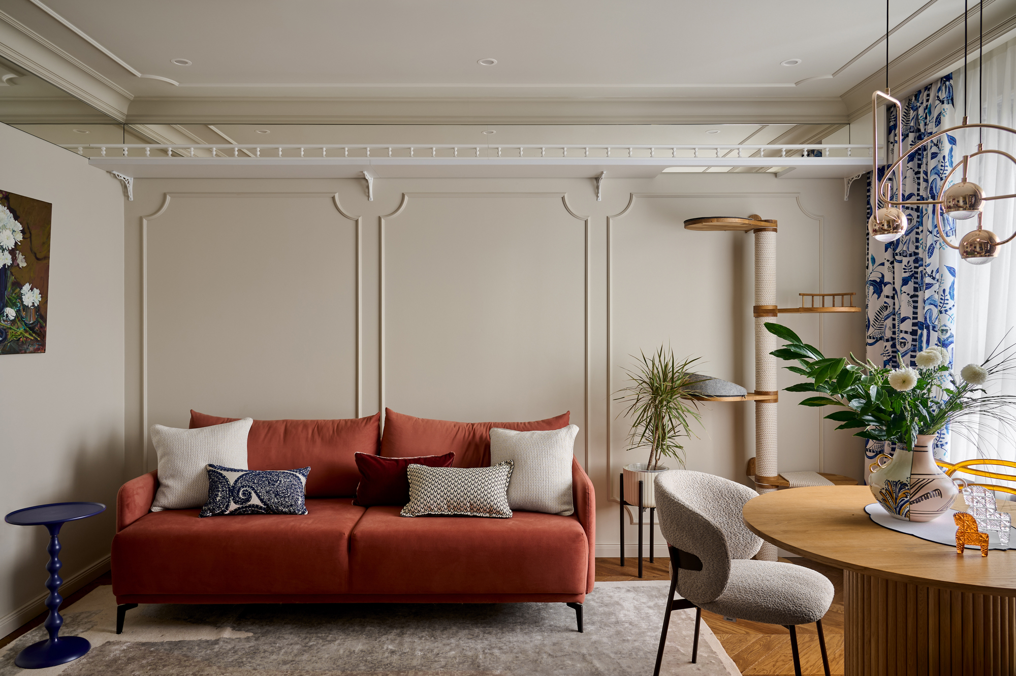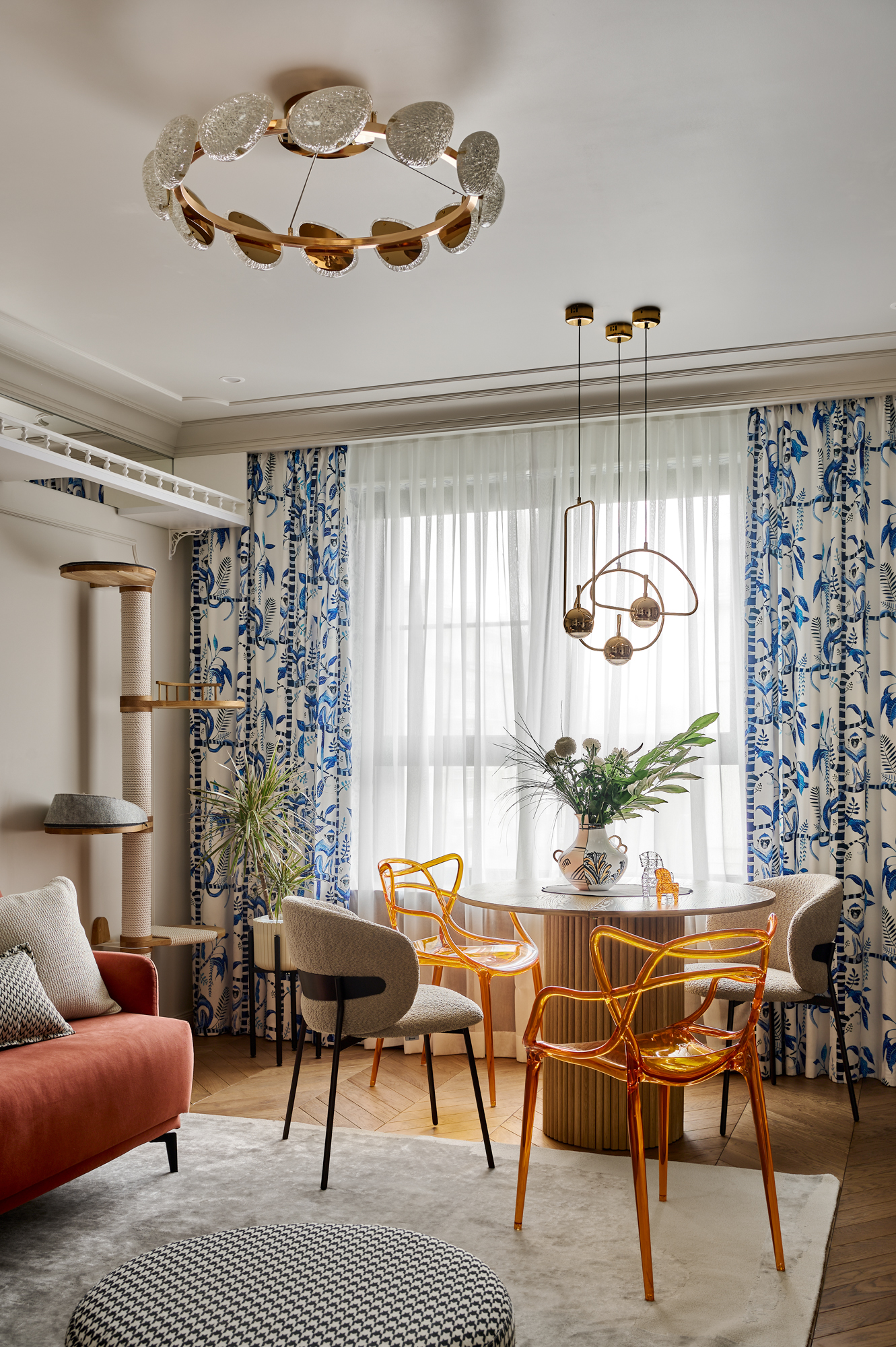 Гостиная будет выполнена, как и вся квартира в эклектичном стиле в светлых пастельных оттенках. Отсылкой к неоклассике здесь являются молдинги и балкончик для кошки маленькими балясинами, они же идут в сочетании с балясинами, примененными на кухне на открытых полках. Тонированное зеркало по периметру стены создаёт иллюзию ломанной стены. В помещении мы видим контрастные сочетания - деревянный стол классических форм применен вместе с эклектичными пластиковыми стульями, строгая форма торшера перекликается с запутанной формой большой люстры, но при всех различиях пространство получается гармоничное за счет использования теплых карамельных оттенков разной тональности. Акцентом в помещении служат шторы и плитка на оконном проеме с анималистическим рисунком.