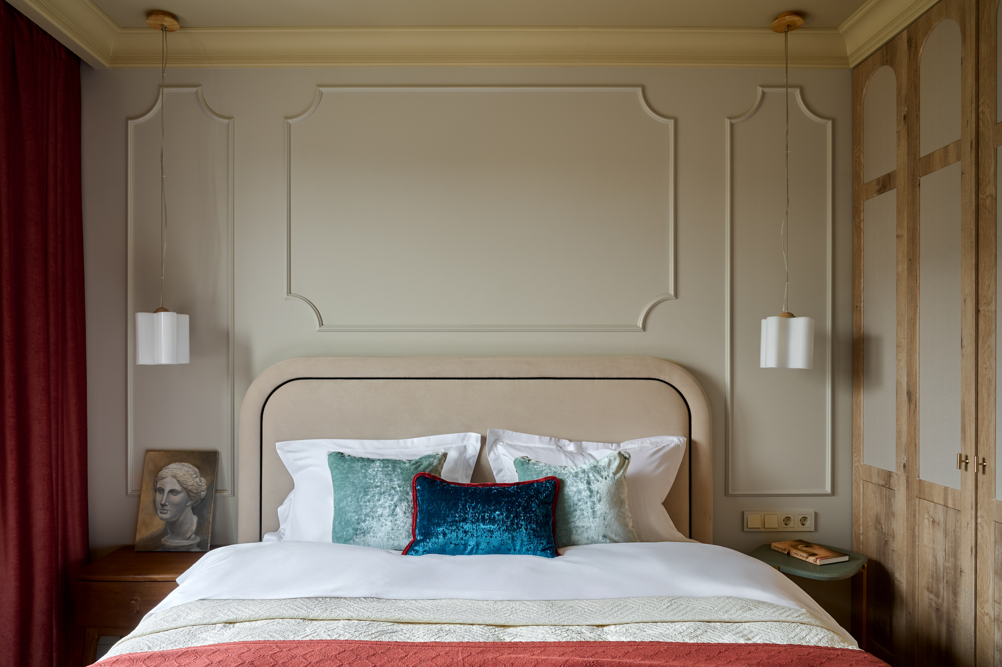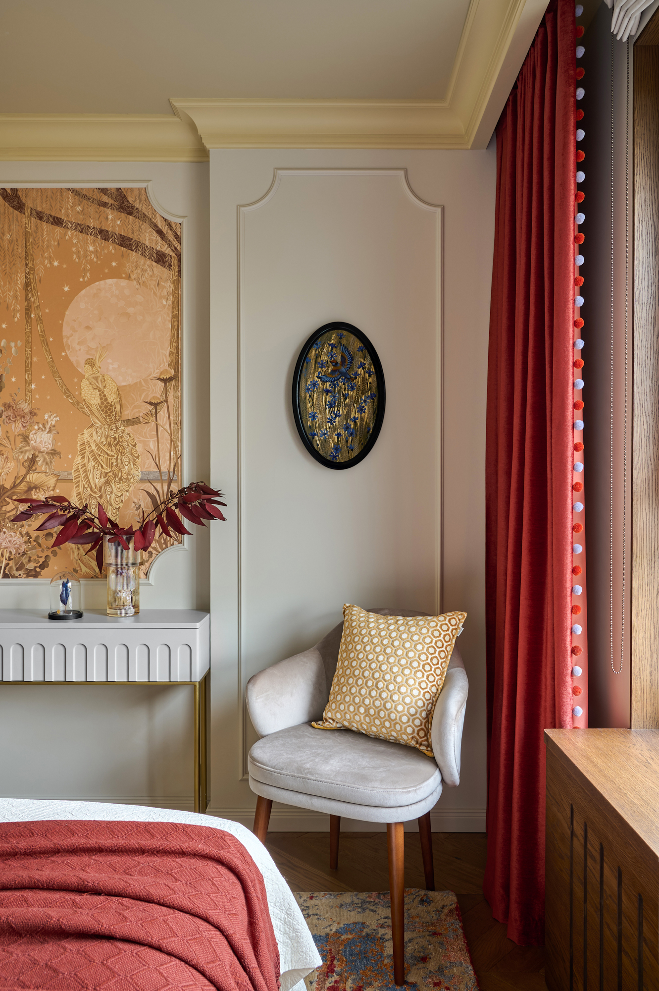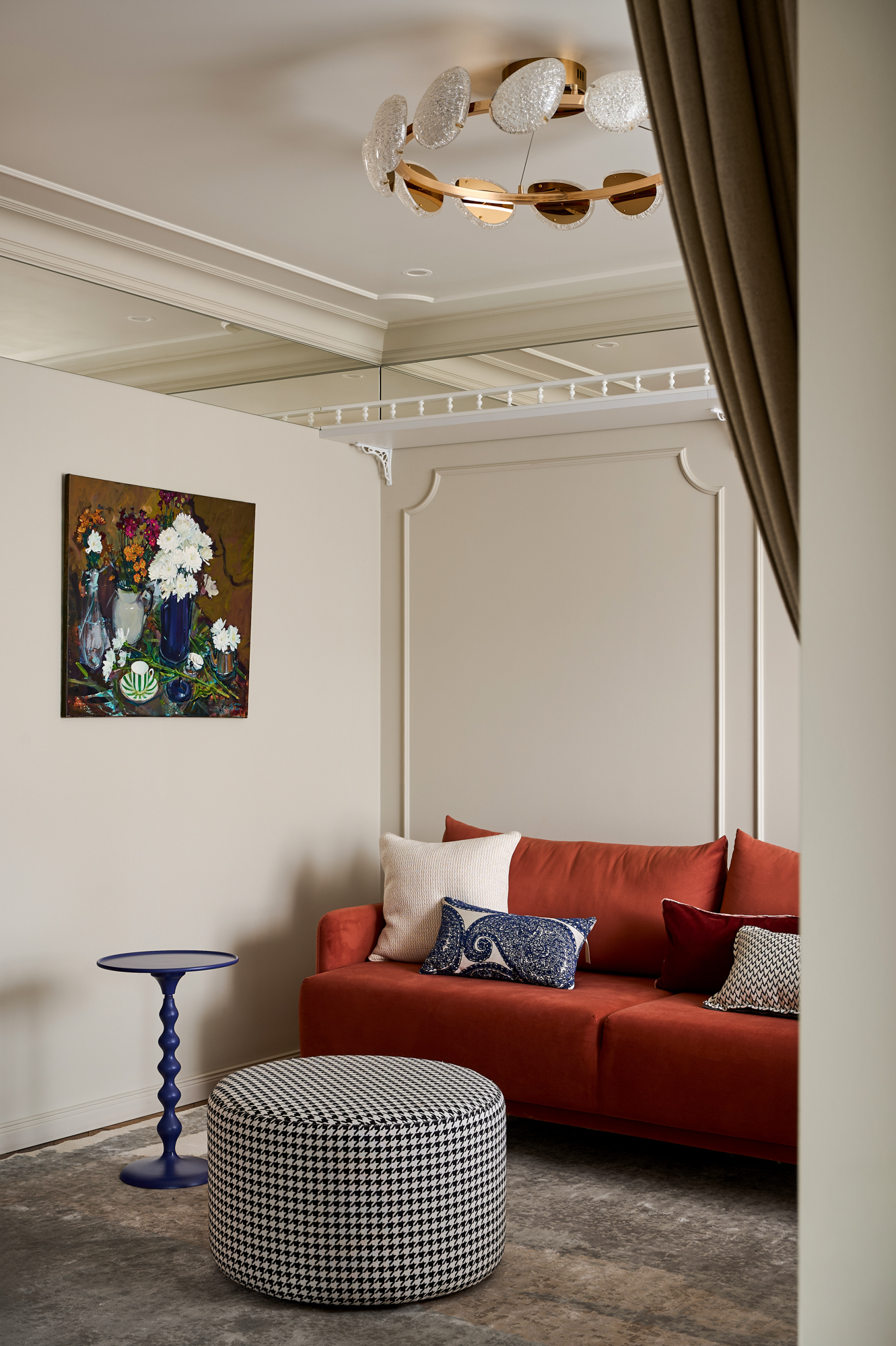В дизайне мы сделали сочетание светлых пастельных неоклассических оттенков с яркими акцентными предметами, что будет придавать пространству контрастность форм, цветов и фактур.