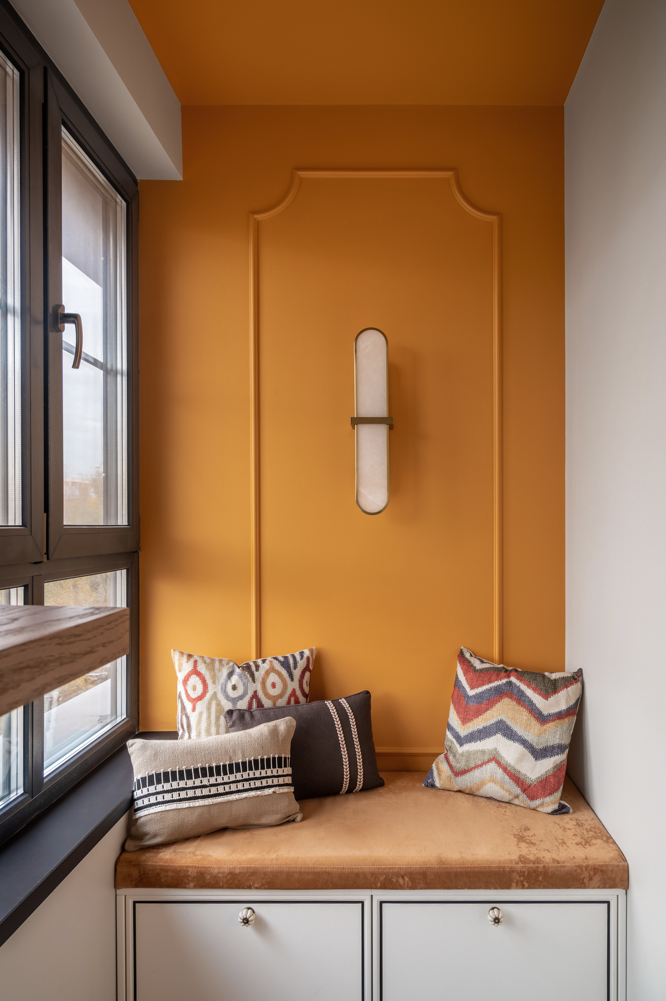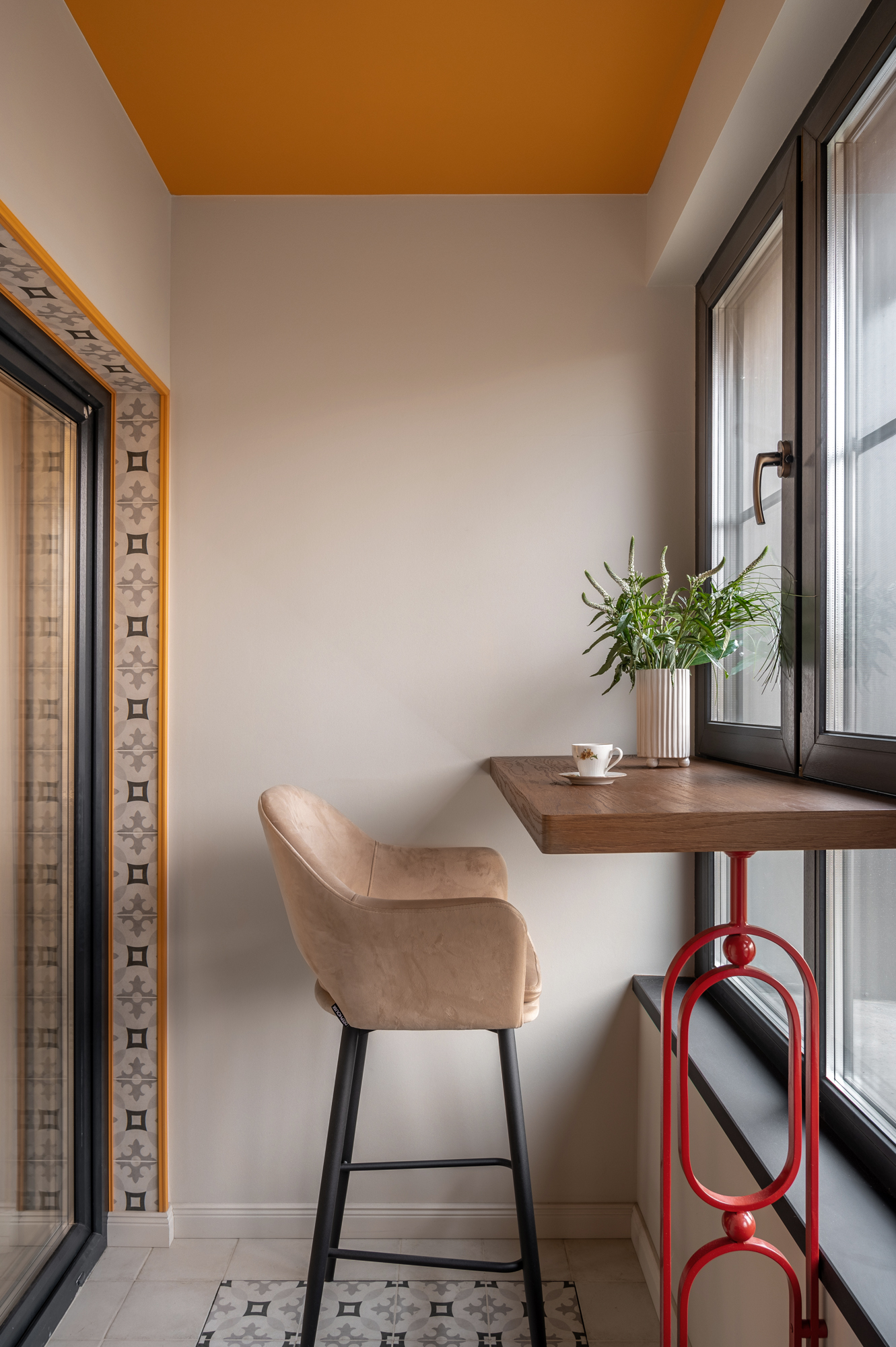 Лоджия получилась ярким, но при этом лаконичным помещением с дополнительным местом для отдыха.