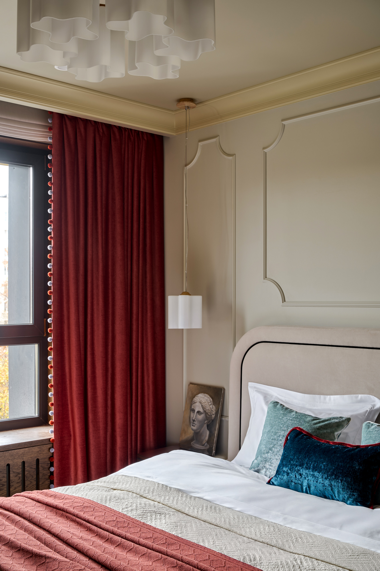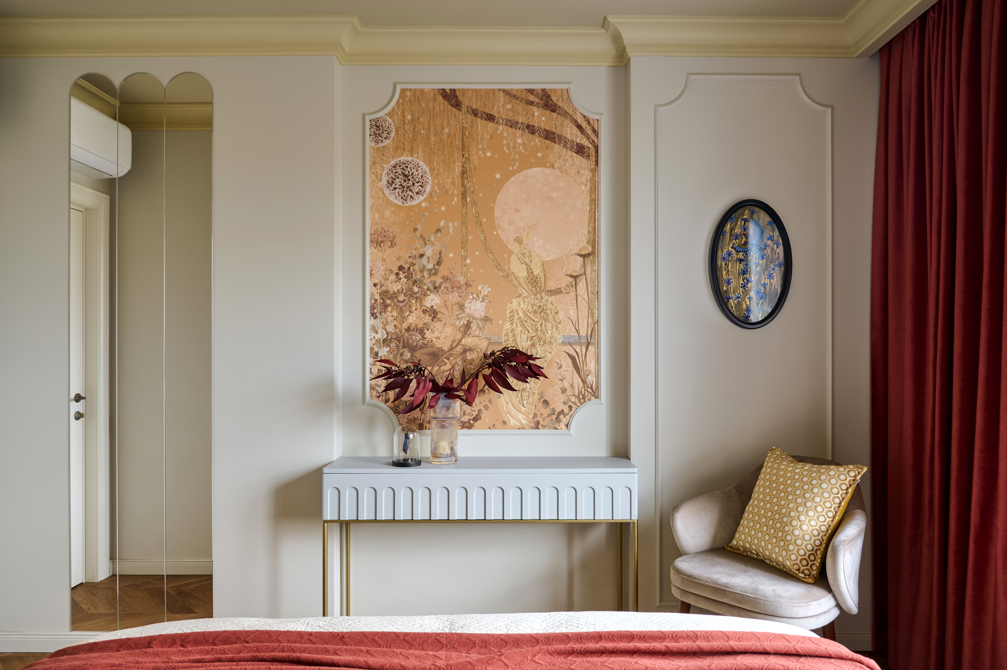 В спальне мы видим сочетание эклектики и скандинавского стиля. Основным цветом здесь является пастельный лимонный оттенок, придающий уют пространству. Так как в спальне задумывались элементы этники, то мы применяем арочные элементы на фасадах шкафа, консоли и зеркале. Декоративное панно в молдинге, является акцентным элементом всего помещения. Растительный мотив, который проходит через всю спальню, выражается в сюжете панно, потолочной люстре, текстуре постельного белья.