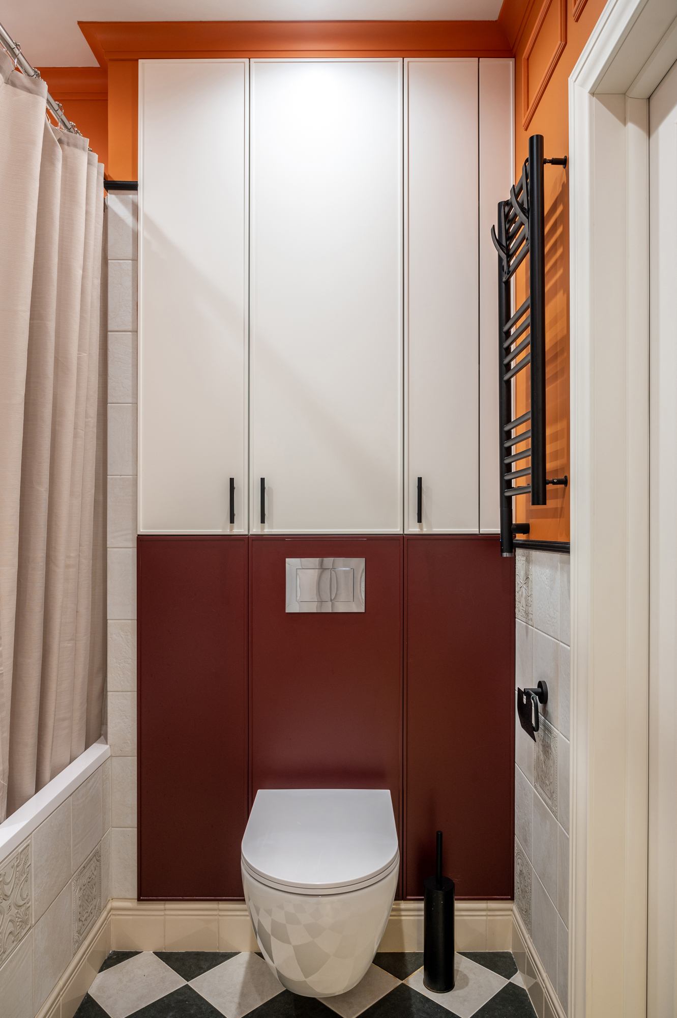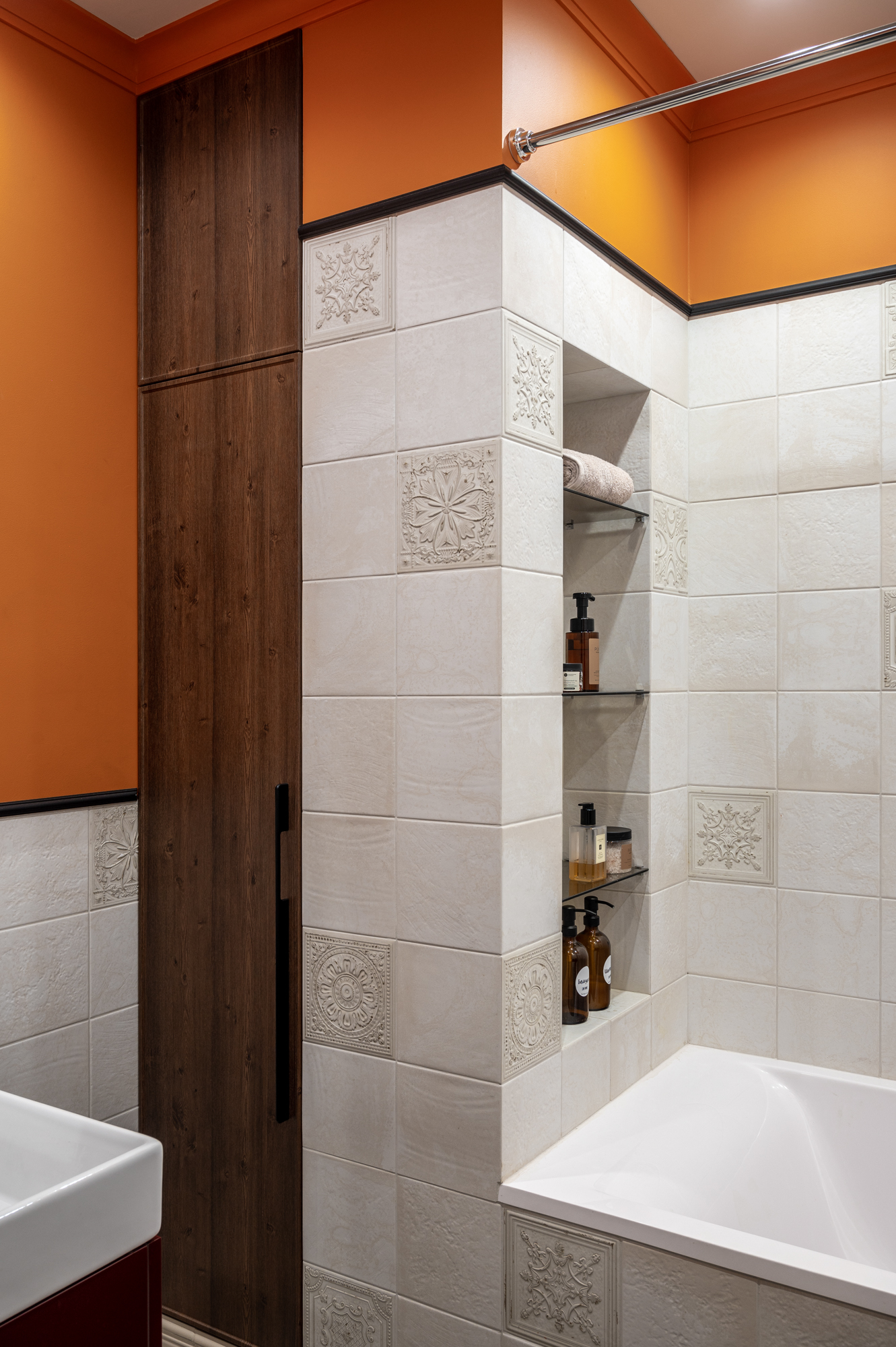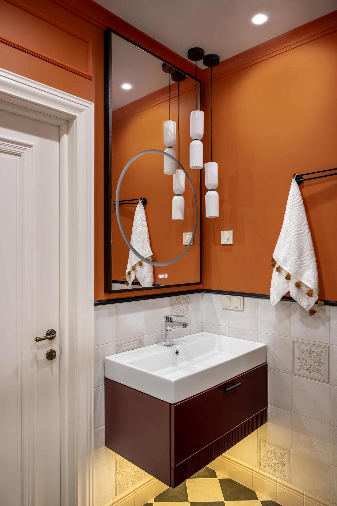 Ванная получилась яркой. Квадратная плитка с разной фактурой и цветом создает динамику помещения. Мягкий, оранжевый оттенок создаёт в помещении камерную обстановку. Поскольку помещение небольшое, то, чтобы не перегружать его лишним цветом, мы используем цвет на тумбе и инсталляции той же насыщенности и температуры что и стены, но другого оттенка. Полки в нише сделаны из тонированного стекла в том же оттенке, что и стены. Также мы разбавляем лаконичную геометрию на стенах используя плитку с рельефным рисунком.