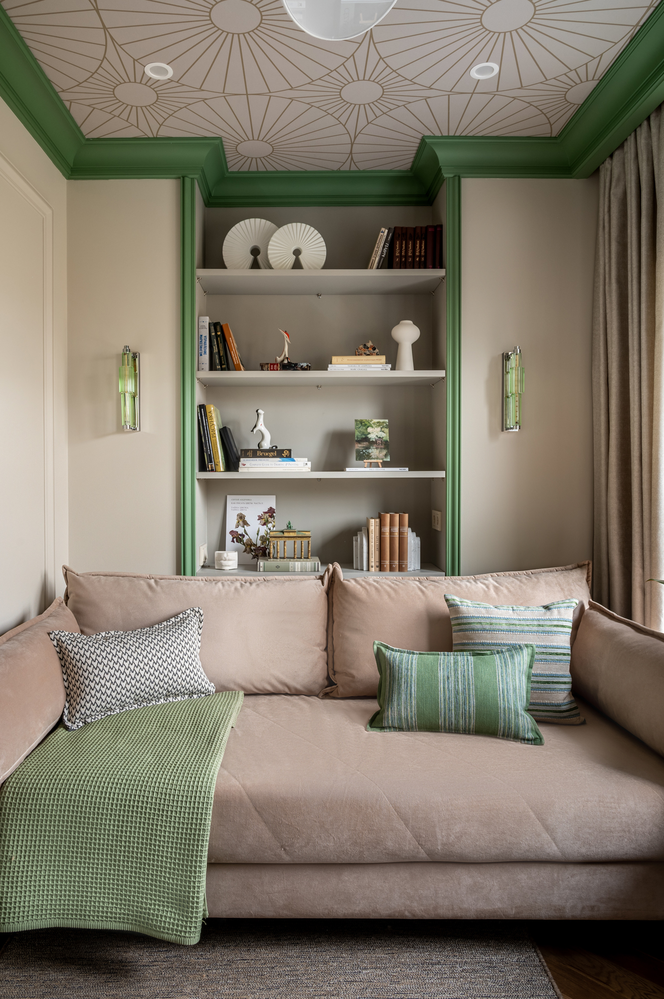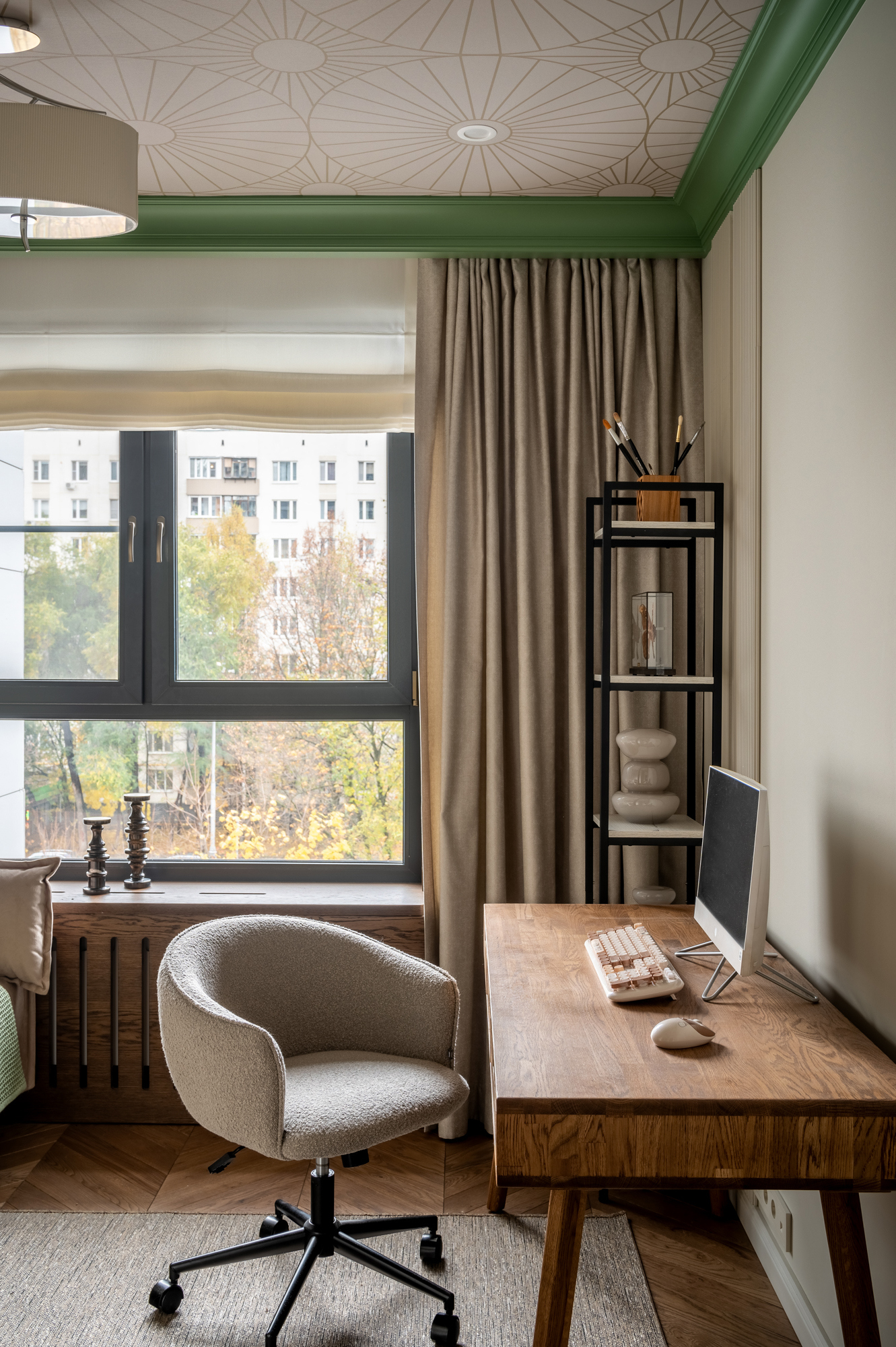 Кабинет – это нейтральное пространство с интересными декоративными приемами. Здесь заказчица будет работать и рисовать, поэтому важно было создать помещение, которое не отвлекало от процесса, но и не навевало скуку. Для этого мы применяем на потолке готический орнамент, и визуально вытягиваем помещение за счет большой двери с рельефным стеклом. В поддержку к ней применяются 3д панели со схожей геометрией. Картины с стиле «постимпрессионизм» гармонично дополняют помещение по цвету.