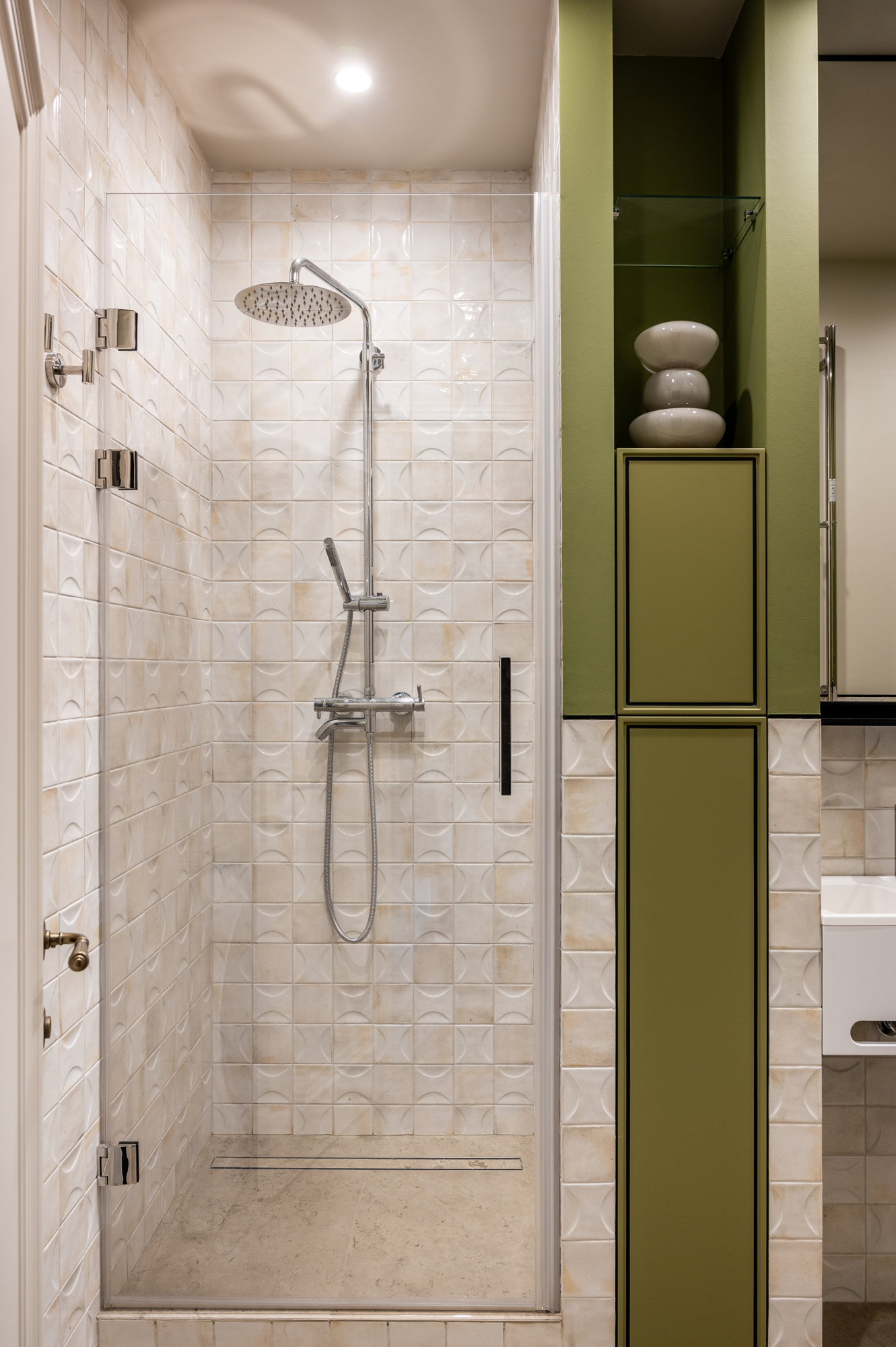 По цветовой гамме помещение спокойнее, чем все остальные. В качестве цветового решения выступают только два оттенка - зеленый и светло- бежевый. Чтобы помещение не выглядело скучным, мы используем плитку интересной формы в восточном стиле. Напольная плитка успокаивает активную геометрию стен.