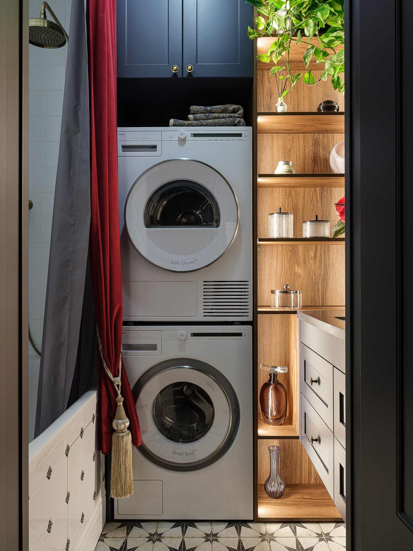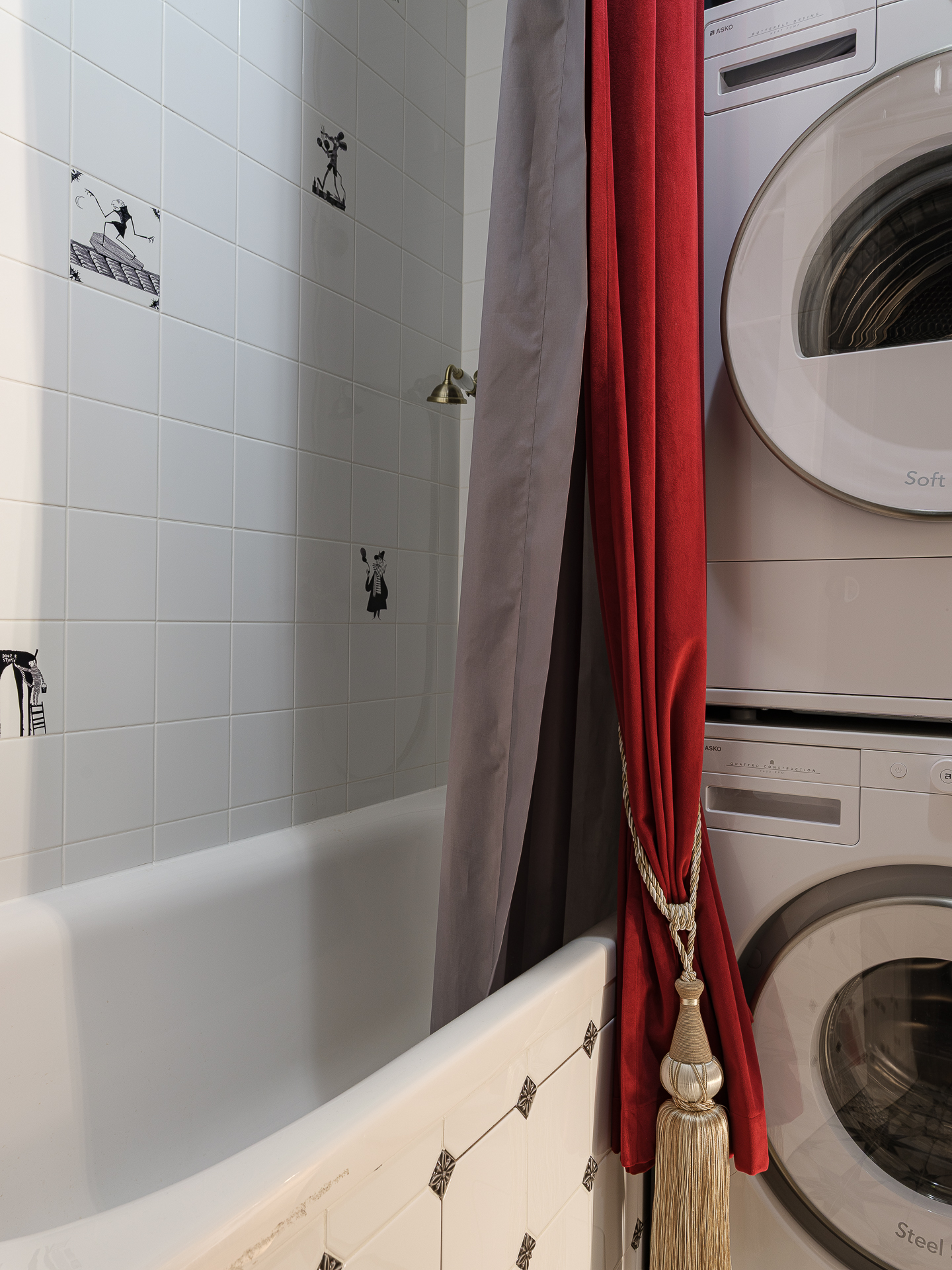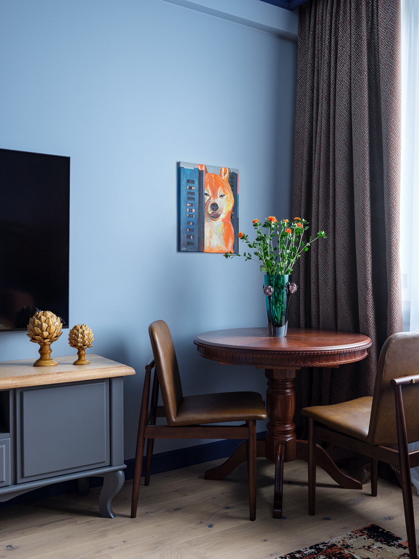 Консервативность помещения разбавлена небольшими мультяшными акцентами над обеденным столом, что подчеркивает общий эклектичный мотив квартиры. Окно оформлены римской шторой с ненавязчивым орнаментом, чтобы придать пространству уют.