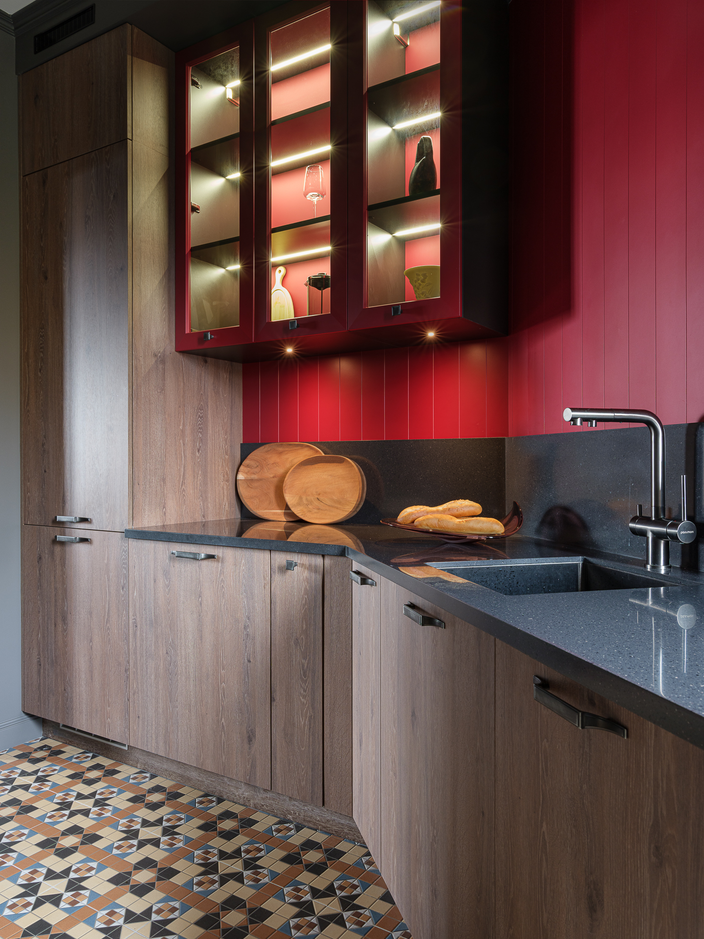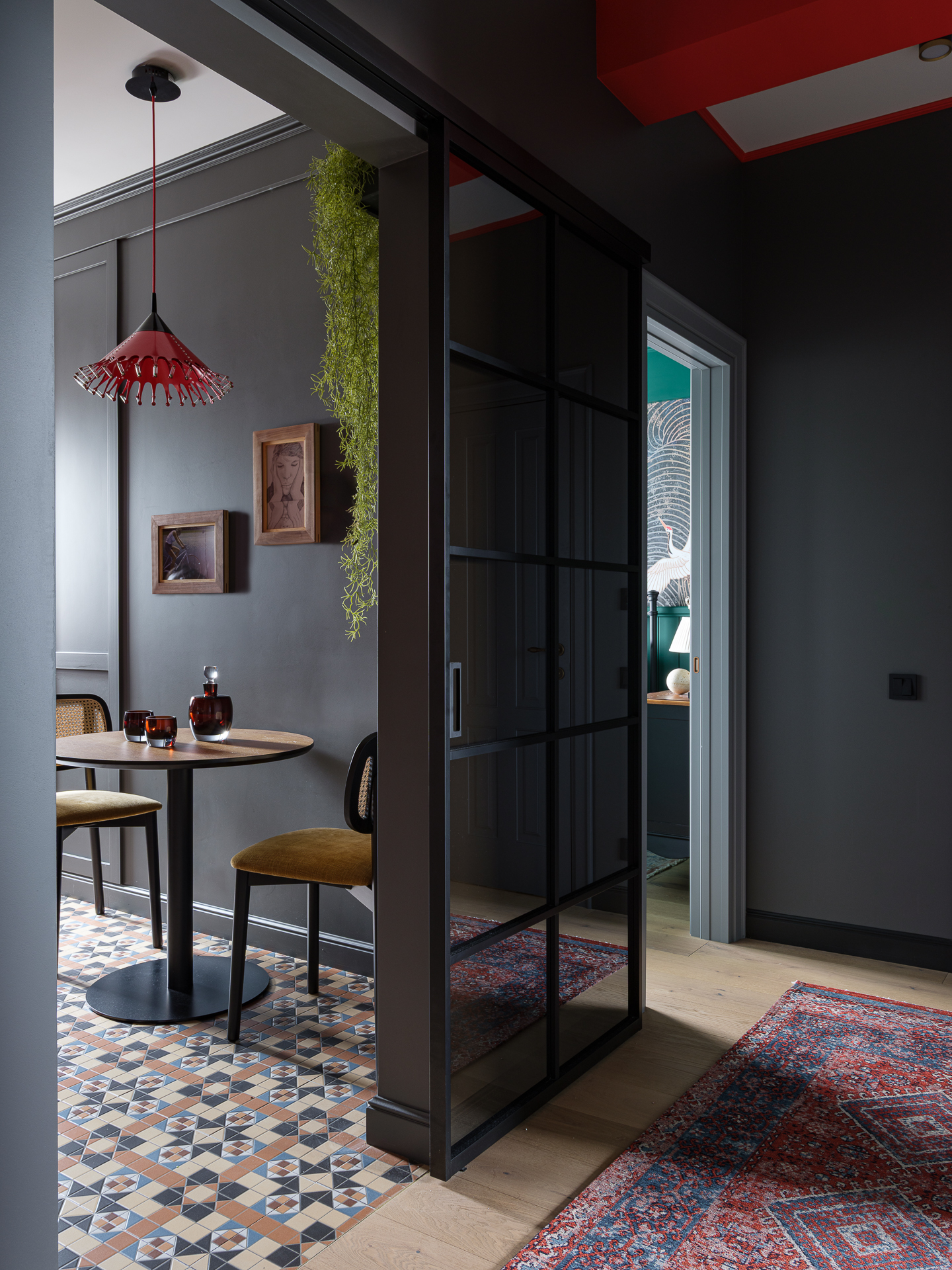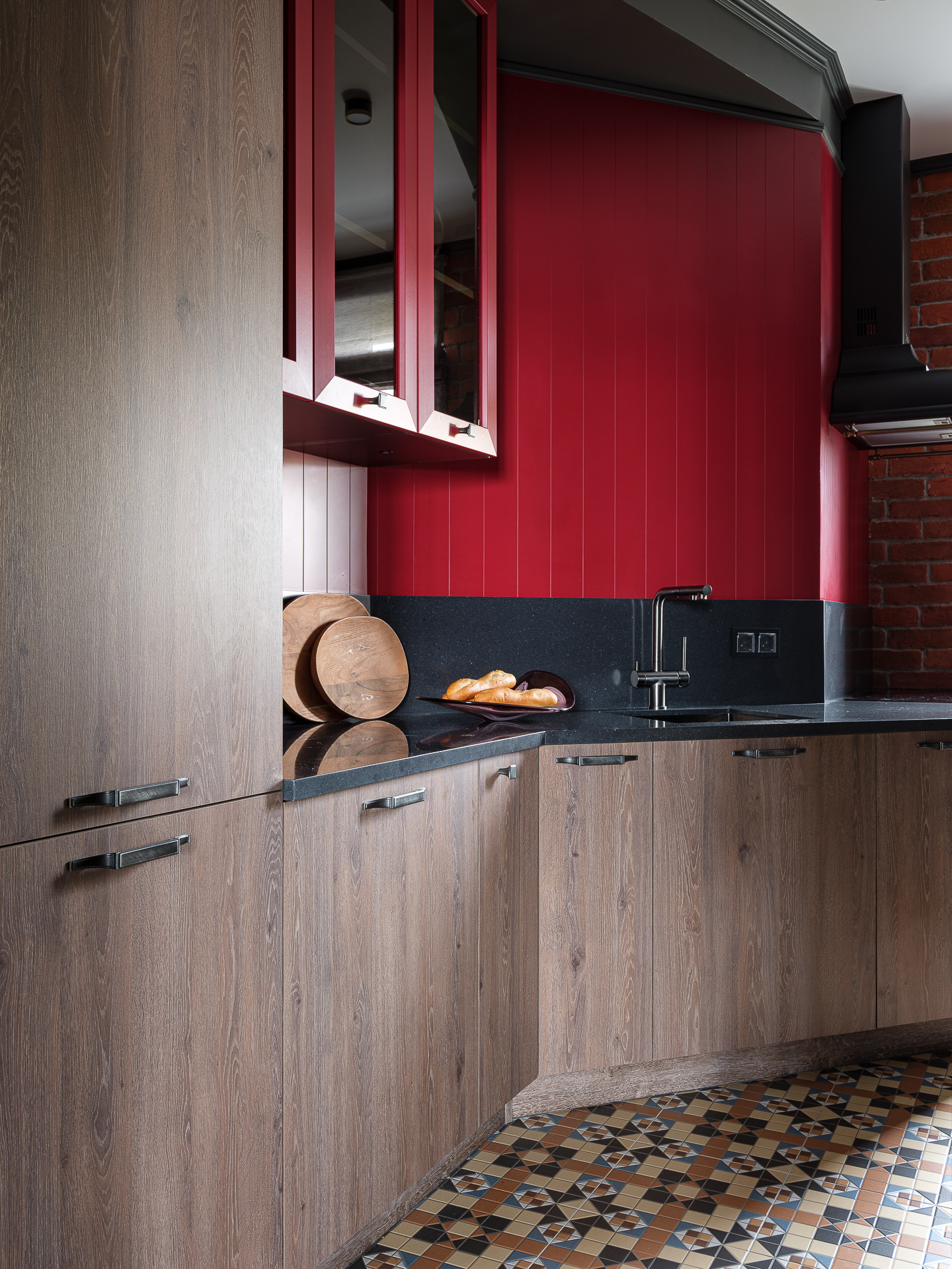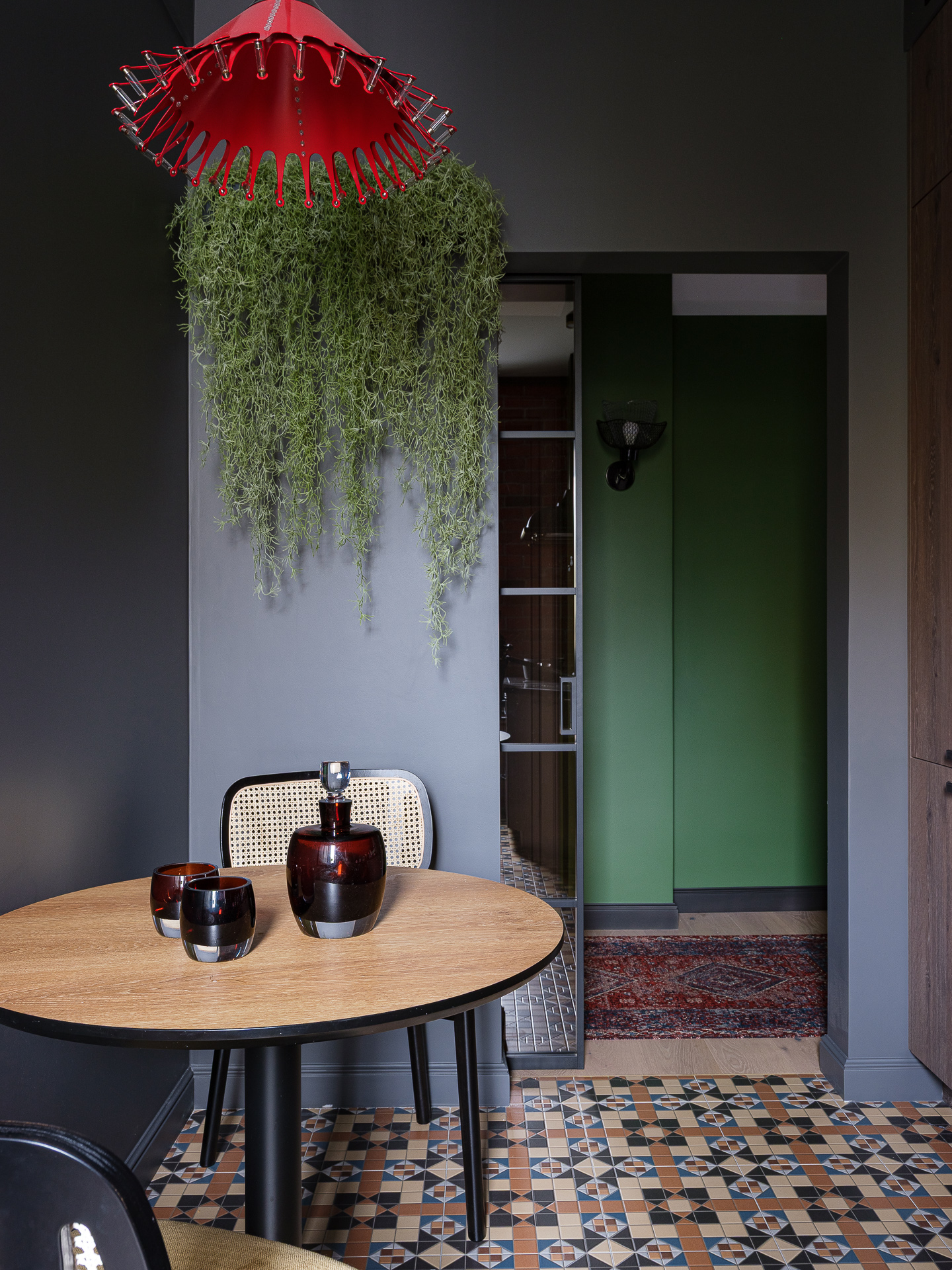 Кухня выполнена в графите, его мы видим на столешнице, на стене, на потолочном коробке. Потолочный карниз и каркас кресел выкрашен в чёрный цвет, так же черный мы применили в элементах точеченого освещения и на подвесном светильнике. Черный цвет переплетается с винным красным, который мы видим в исполнении верхних шкафов, на стене, в виде красных плашек и светильник, также выполнен в красном оттенке. На кухне много площадей больших глухих поверхностей, и всю эту «глухость» мы разбавили «рассыпной» плиткой с мелким геометрическим рисунком и оживили за счёт свисающего в обеденной зоне кустика.