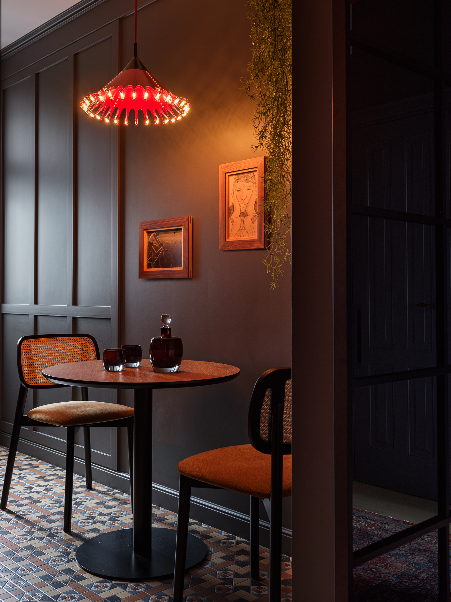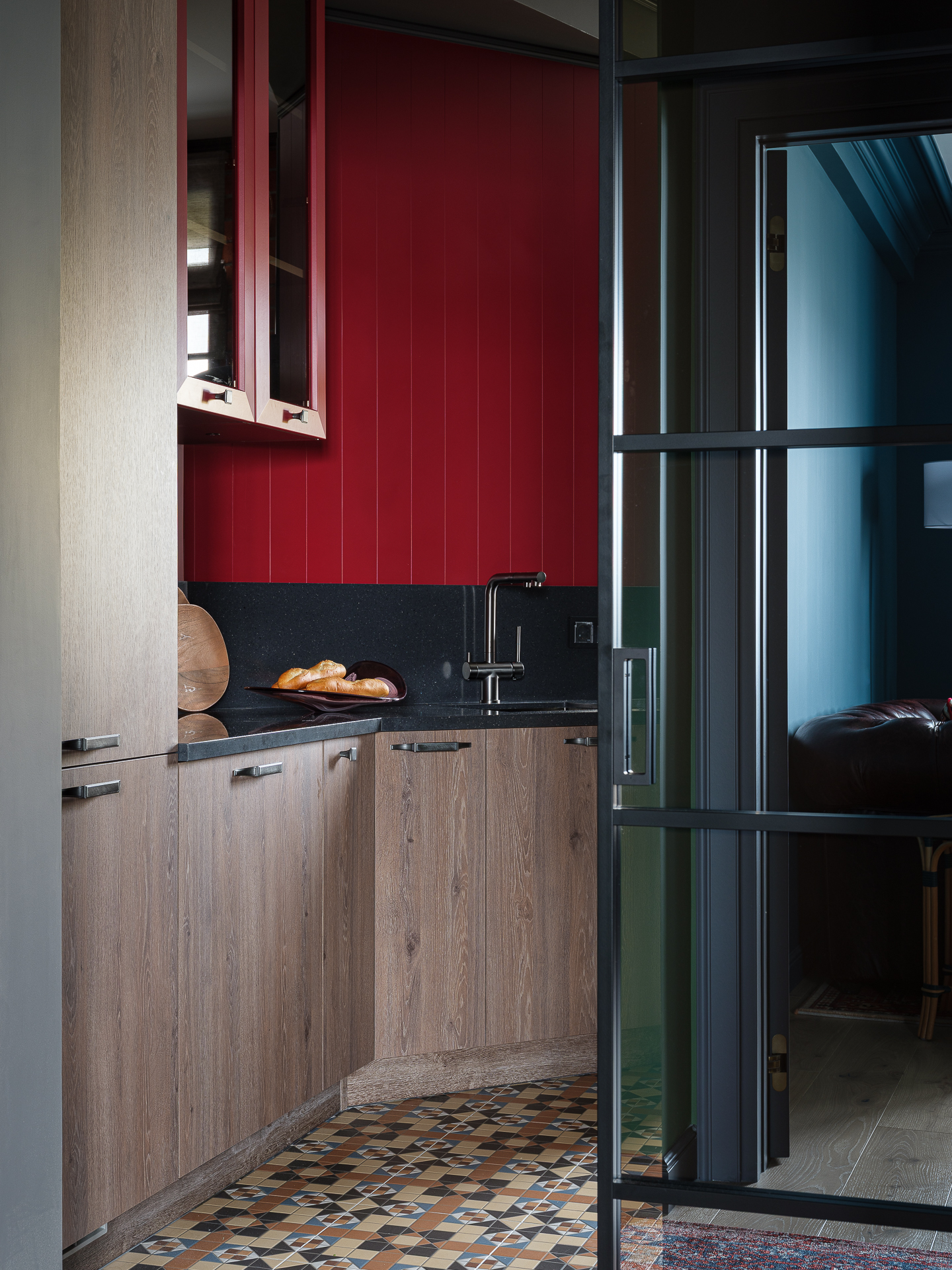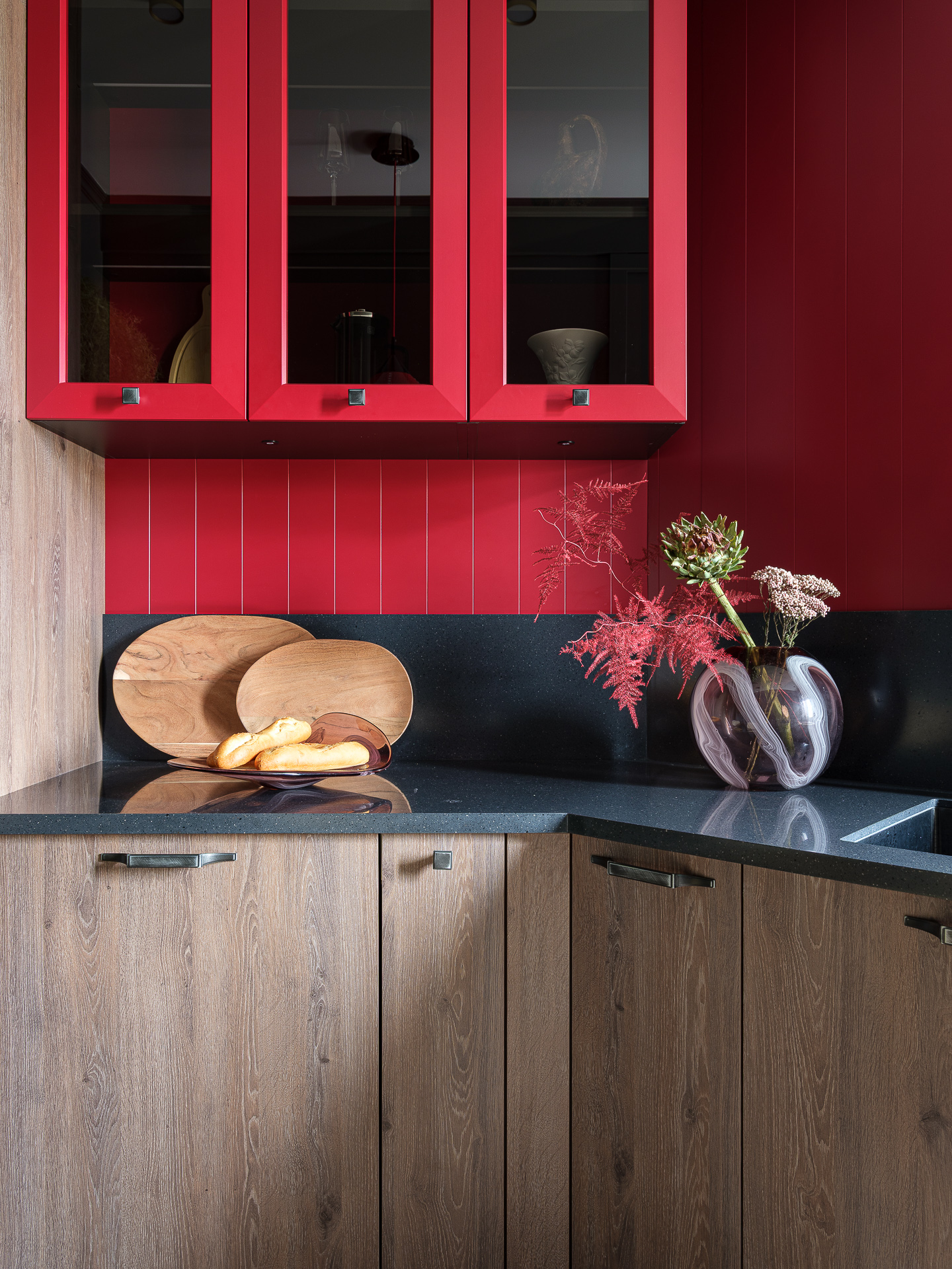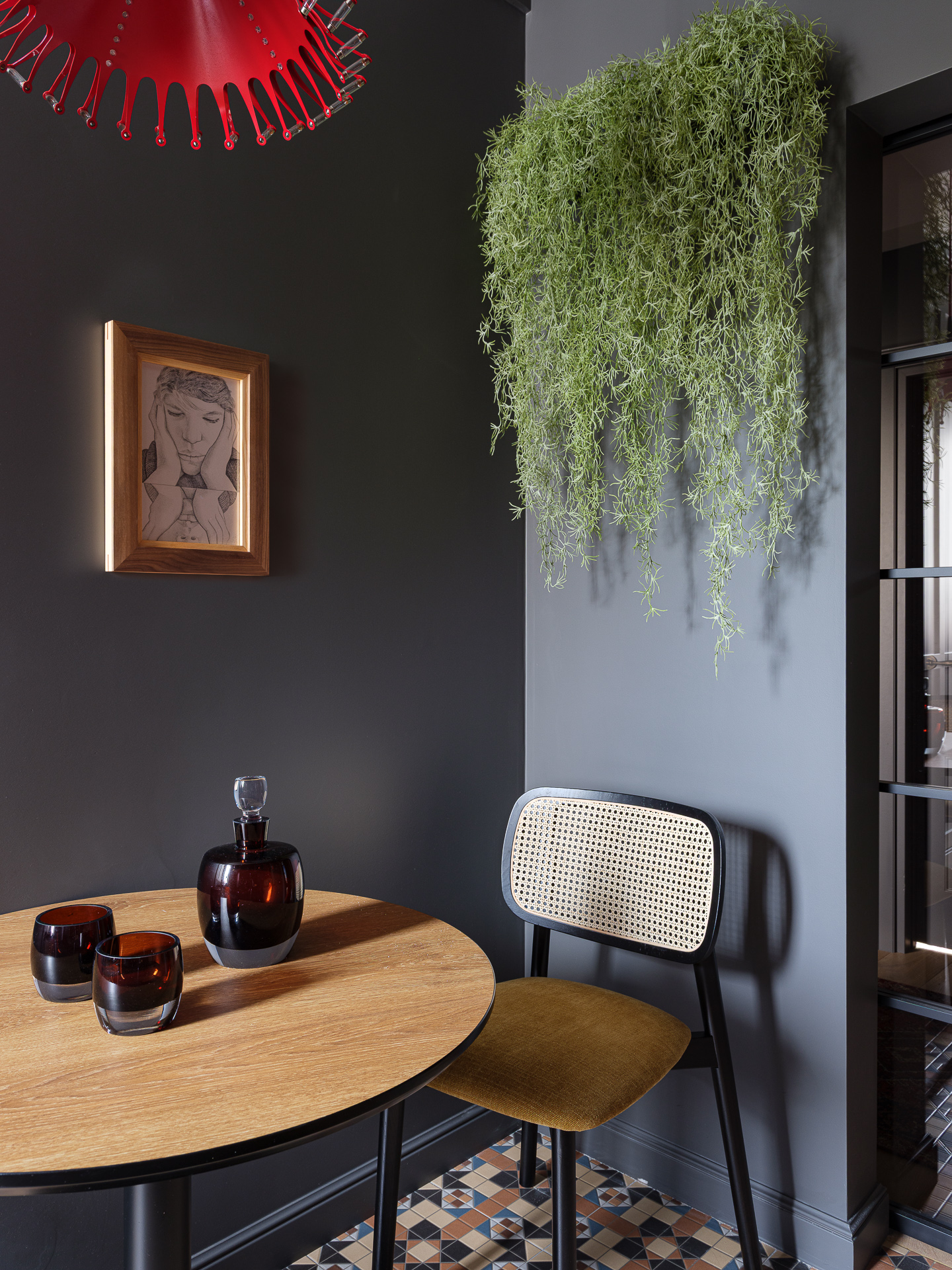 Кухня выполнена в графите, его мы видим на столешнице, на стене, на потолочном коробке. Потолочный карниз и каркас кресел выкрашен в чёрный цвет, так же черный мы применили в элементах точеченого освещения и на подвесном светильнике. Черный цвет переплетается с винным красным, который мы видим в исполнении верхних шкафов, на стене, в виде красных плашек и светильник, также выполнен в красном оттенке. На кухне много площадей больших глухих поверхностей, и всю эту «глухость» мы разбавили «рассыпной» плиткой с мелким геометрическим рисунком и оживили за счёт свисающего в обеденной зоне кустика.