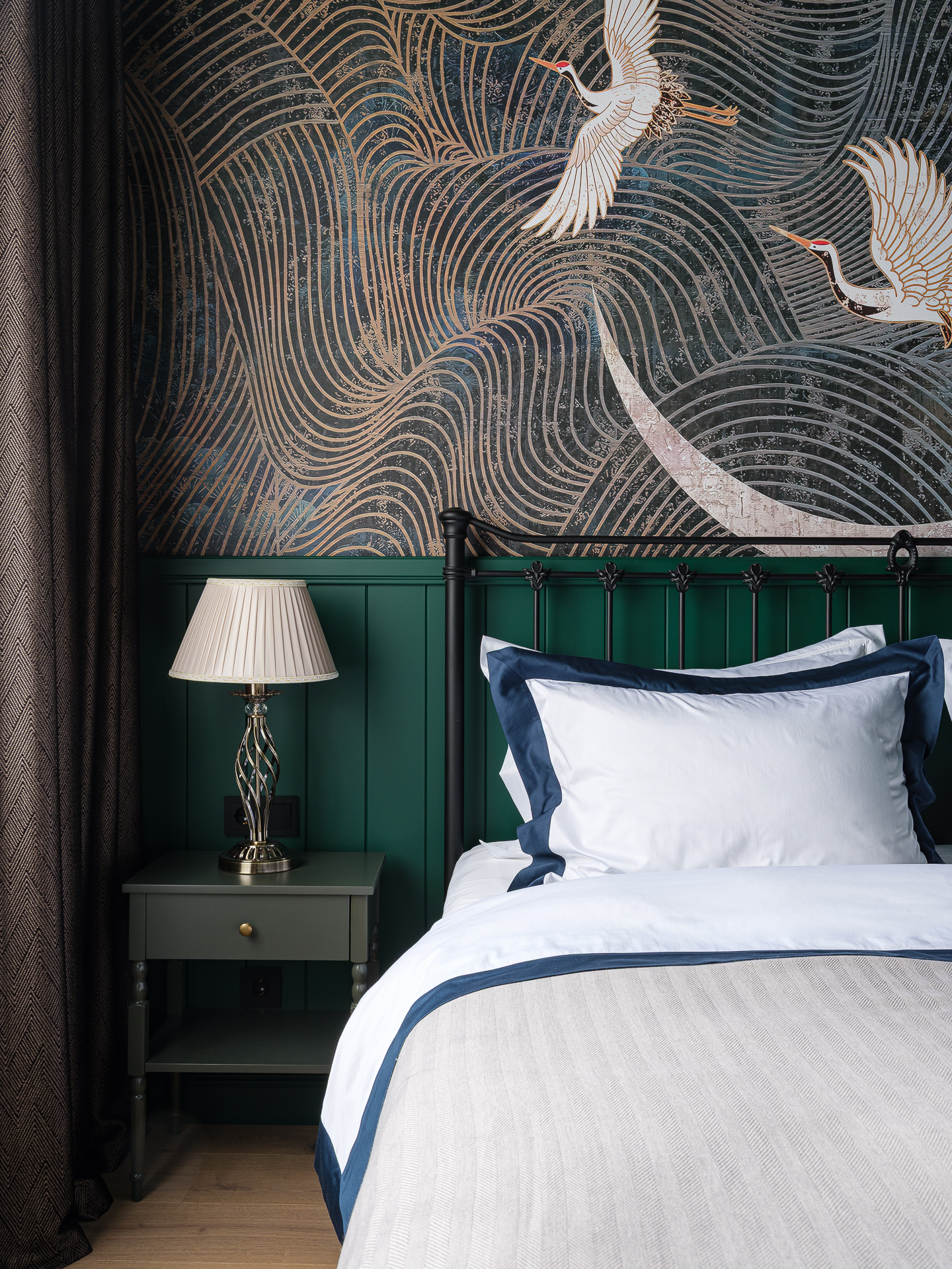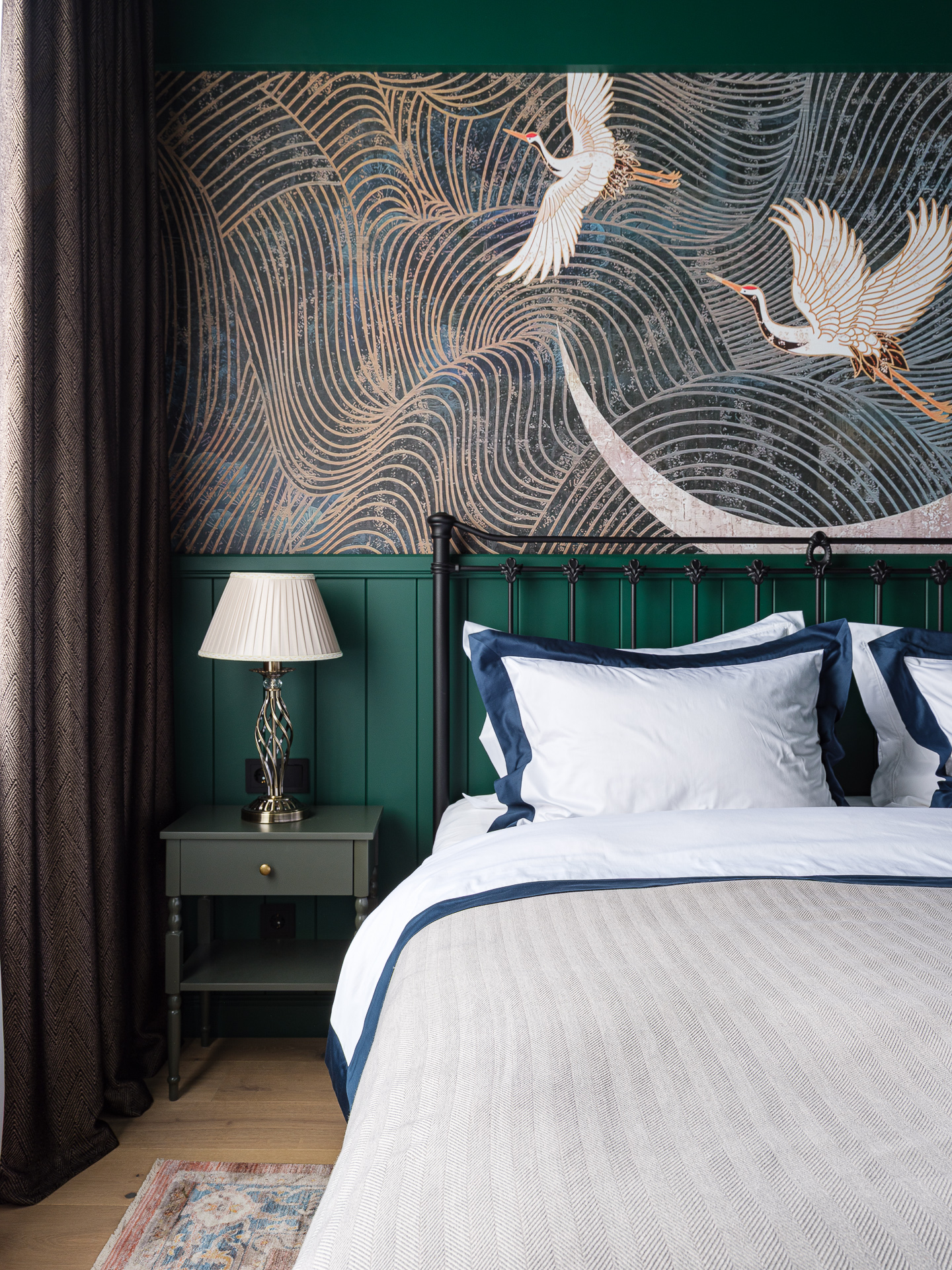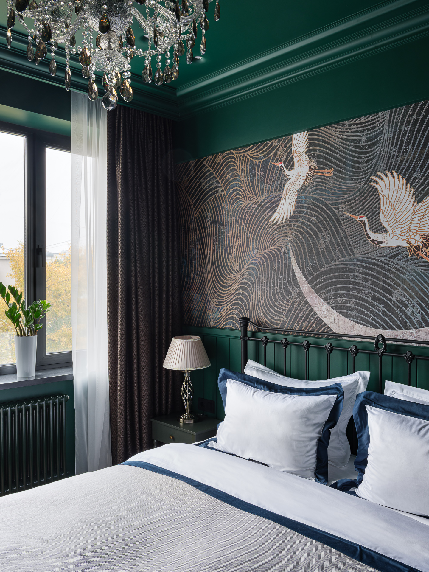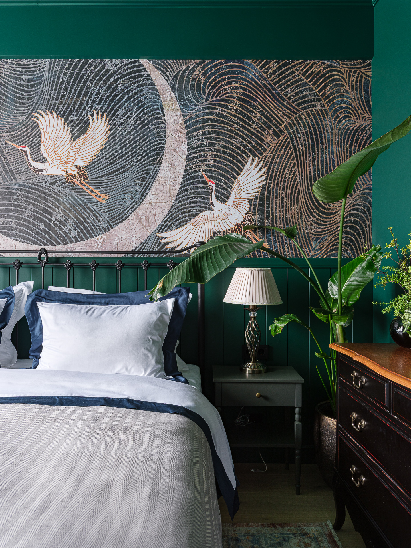 Основной цветовой мотив спальни - изумруд. Стены выкрашены в благородный плотный зелёный цвет, этим же цветом выкрашены деревянные панели на стене с акцентными обоями, сюжетом которых являются журавли и полумесяц, которые подчеркивают эклектичность пространства.