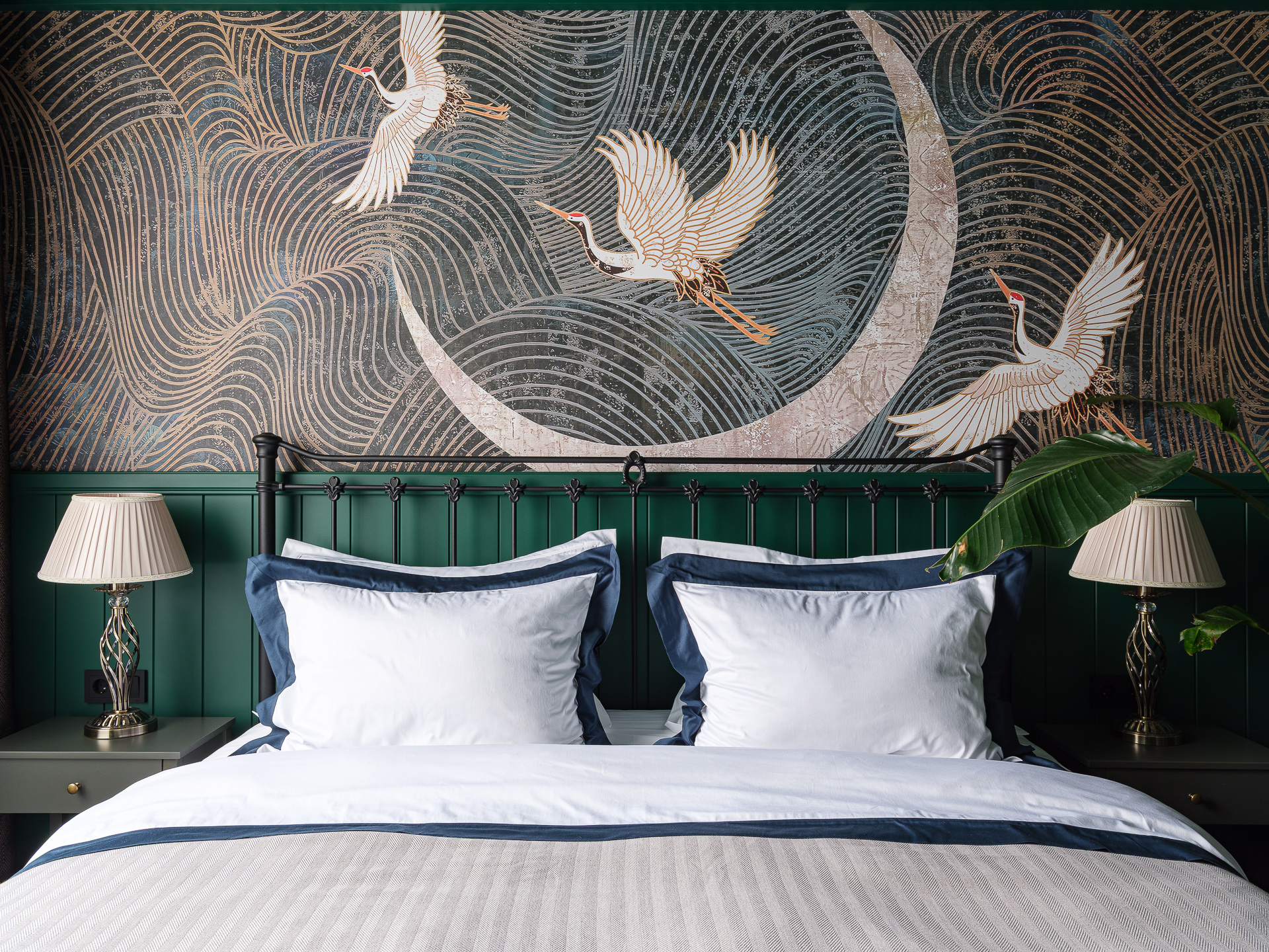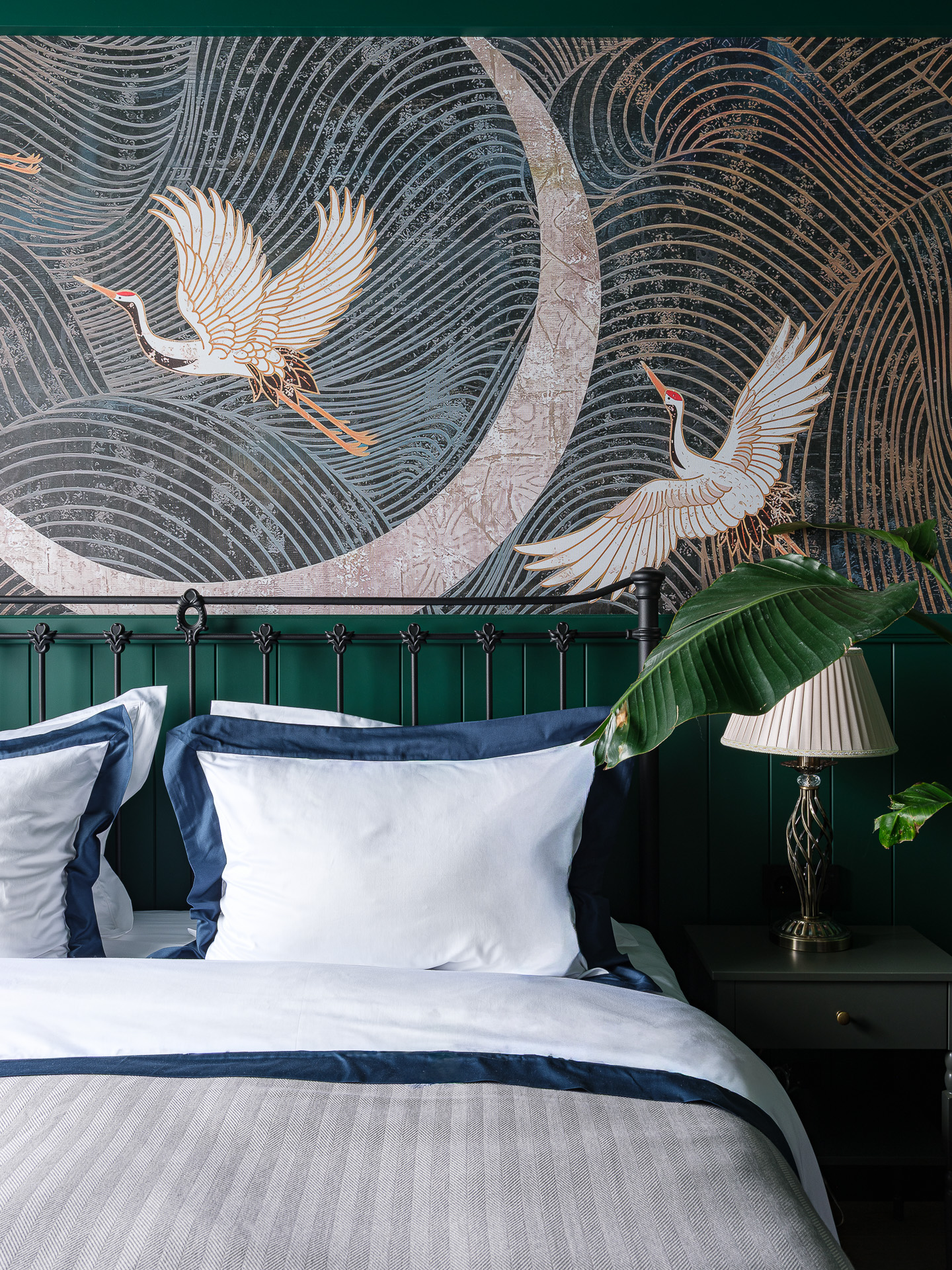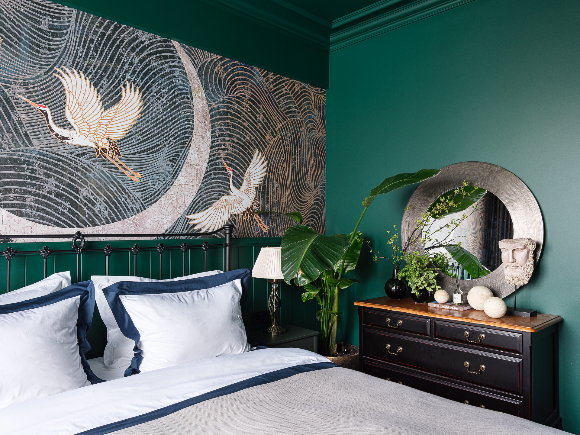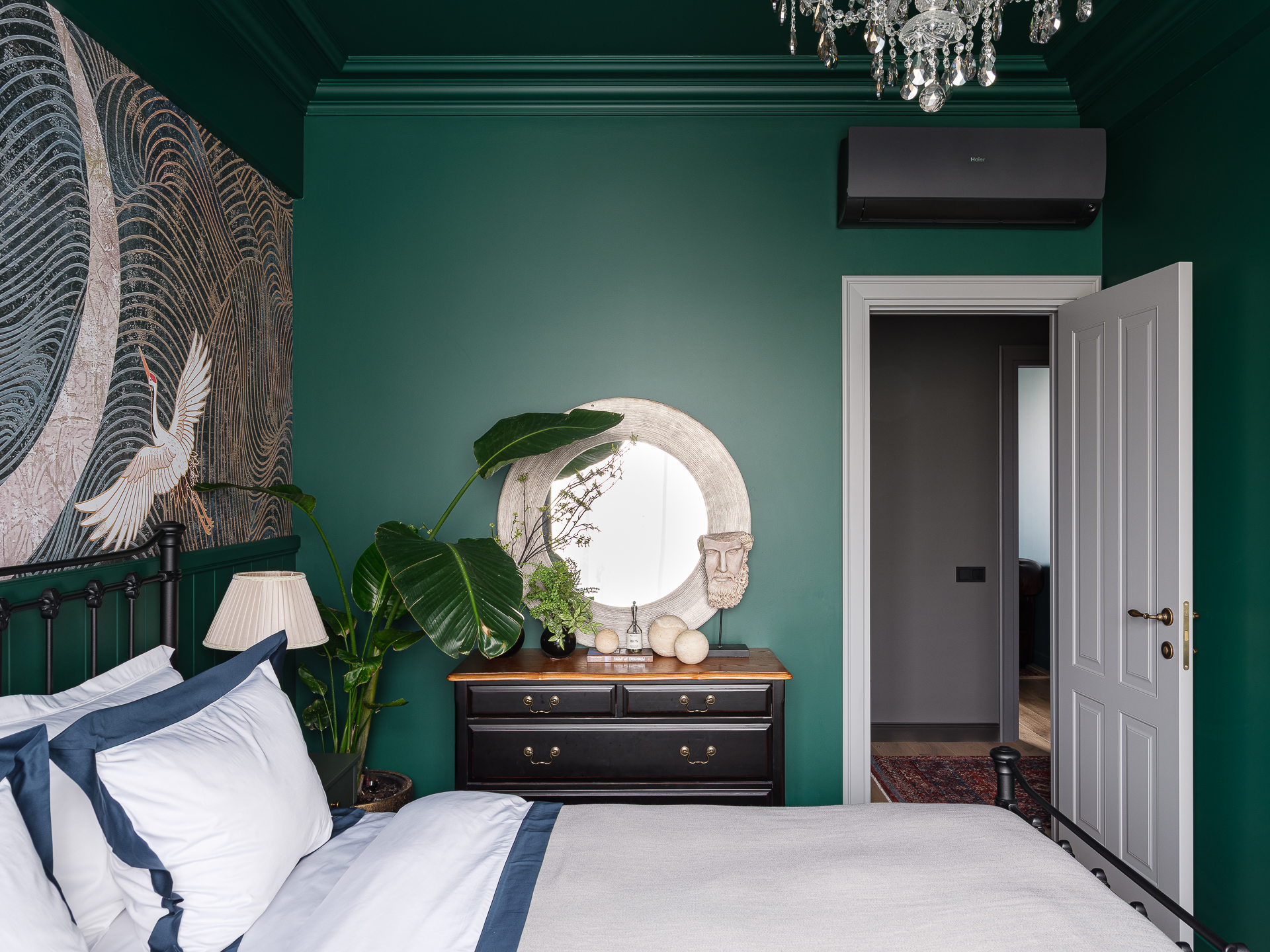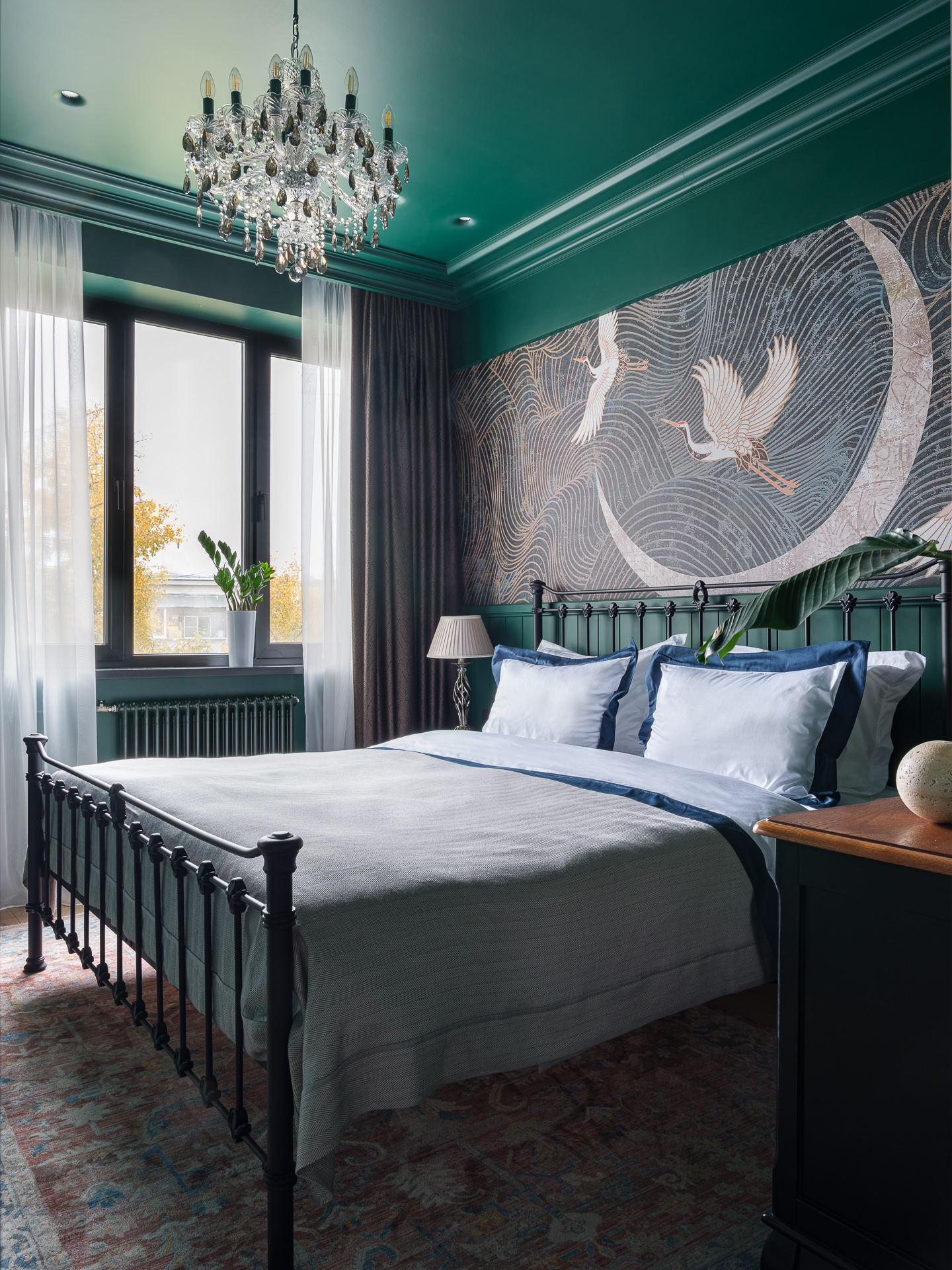 Основной цветовой мотив спальни - изумруд. Стены выкрашены в благородный плотный зелёный цвет, этим же цветом выкрашены деревянные панели на стене с акцентными обоями, сюжетом которых являются журавли и полумесяц, которые подчеркивают эклектичность пространства.