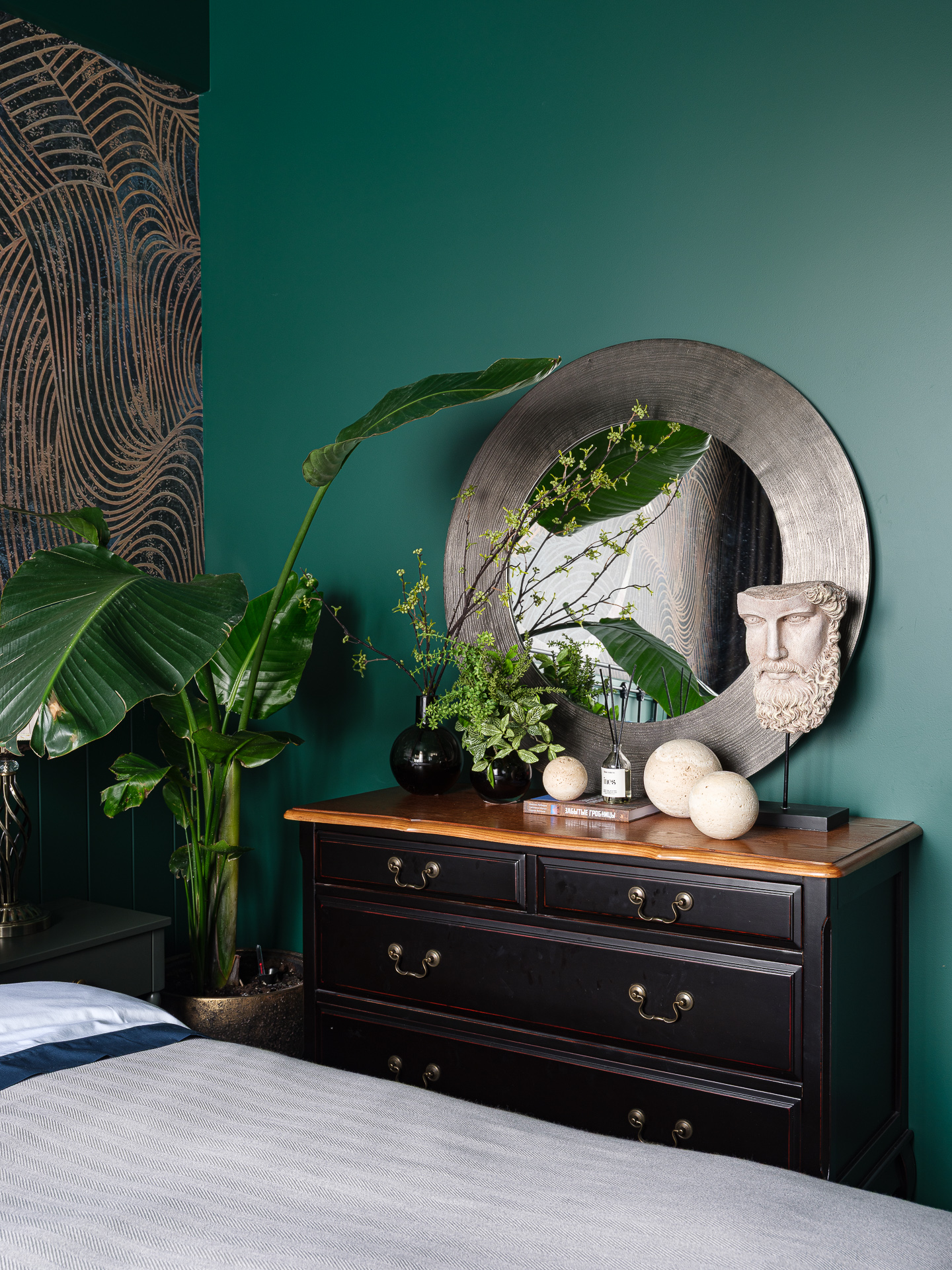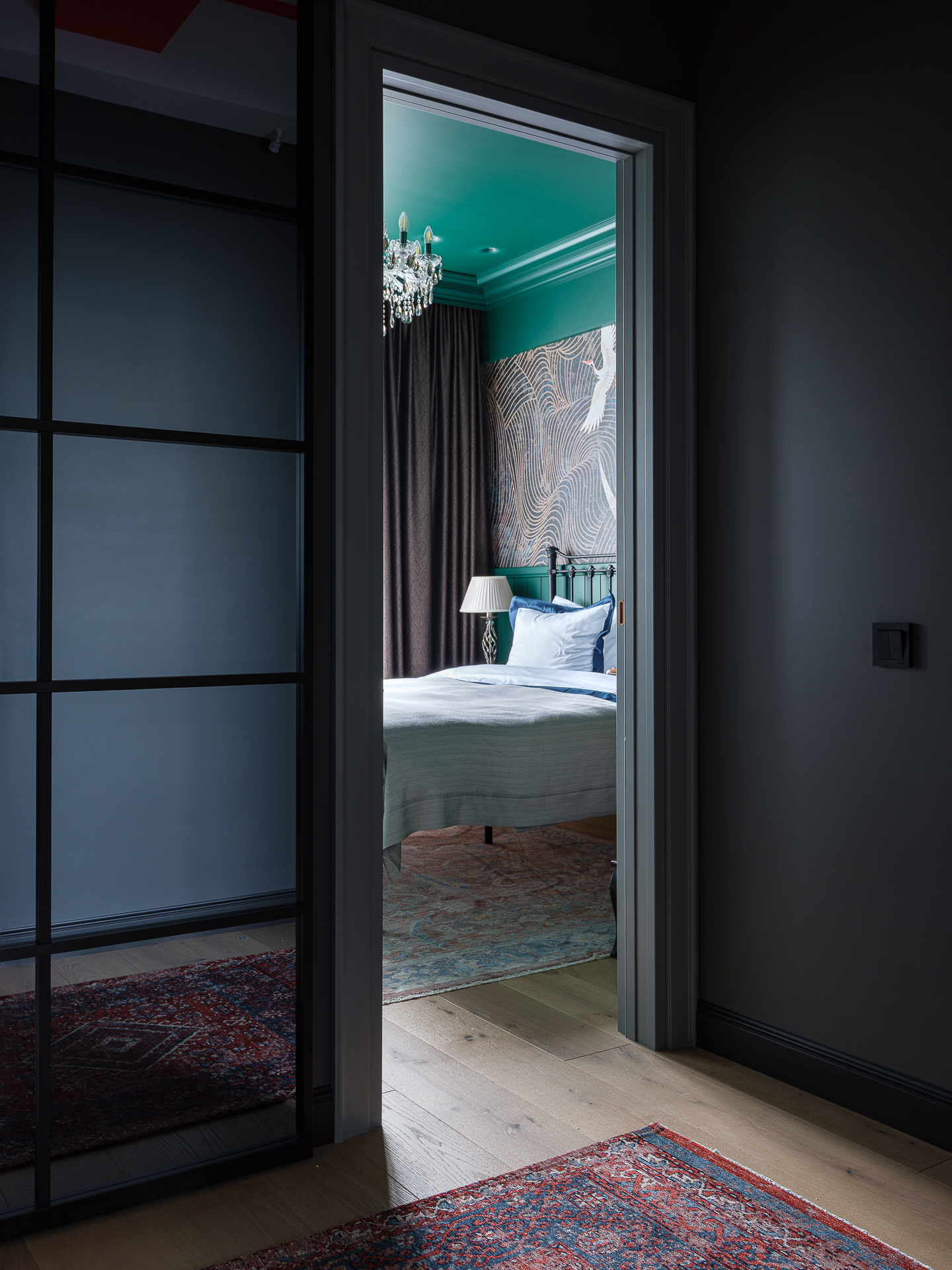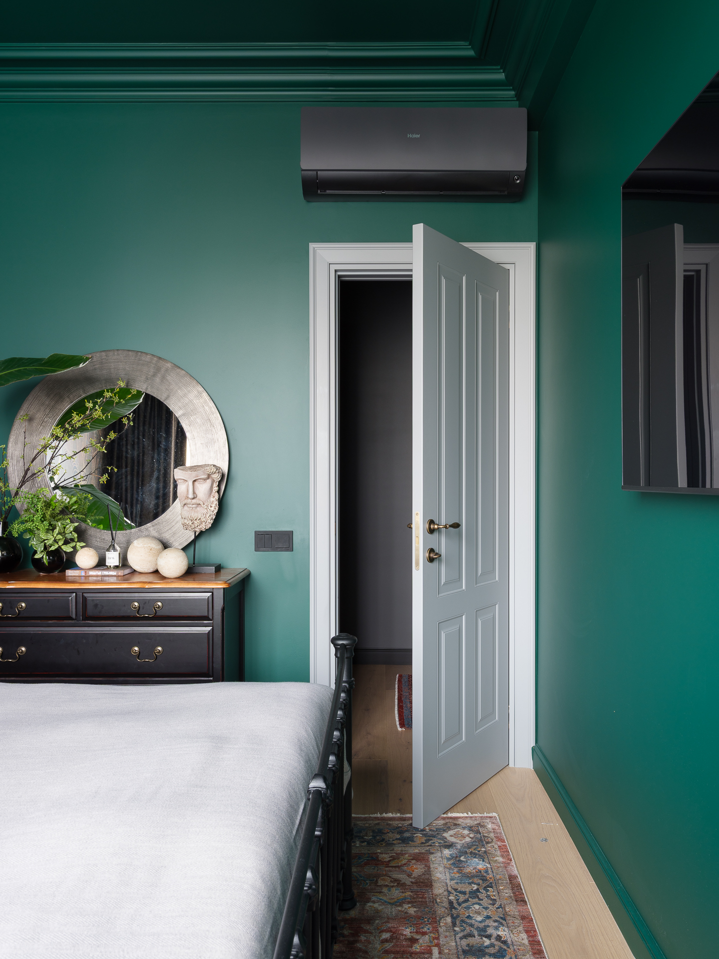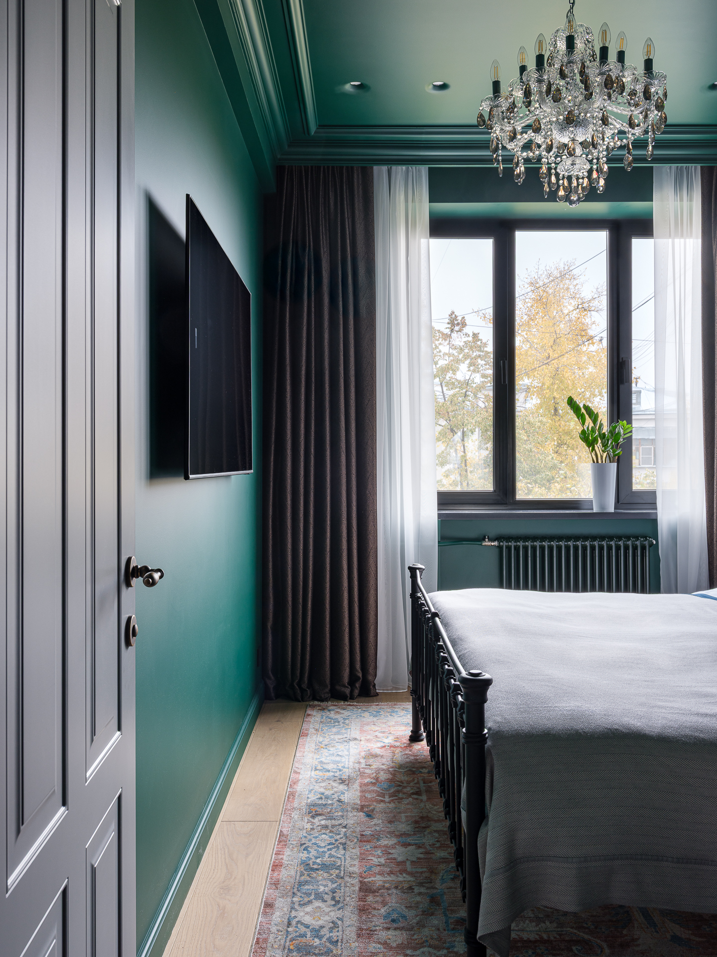Основной цветовой мотив спальни - изумруд. Стены выкрашены в благородный плотный зелёный цвет, этим же цветом выкрашены деревянные панели на стене с акцентными обоями, сюжетом которых являются журавли и полумесяц, которые подчеркивают эклектичность пространства.